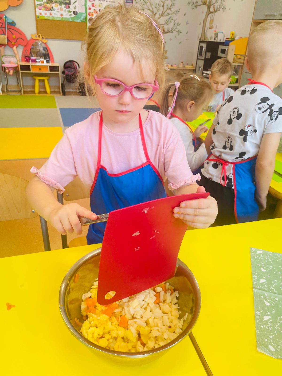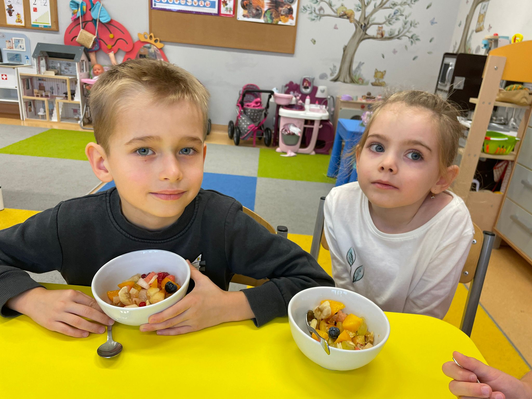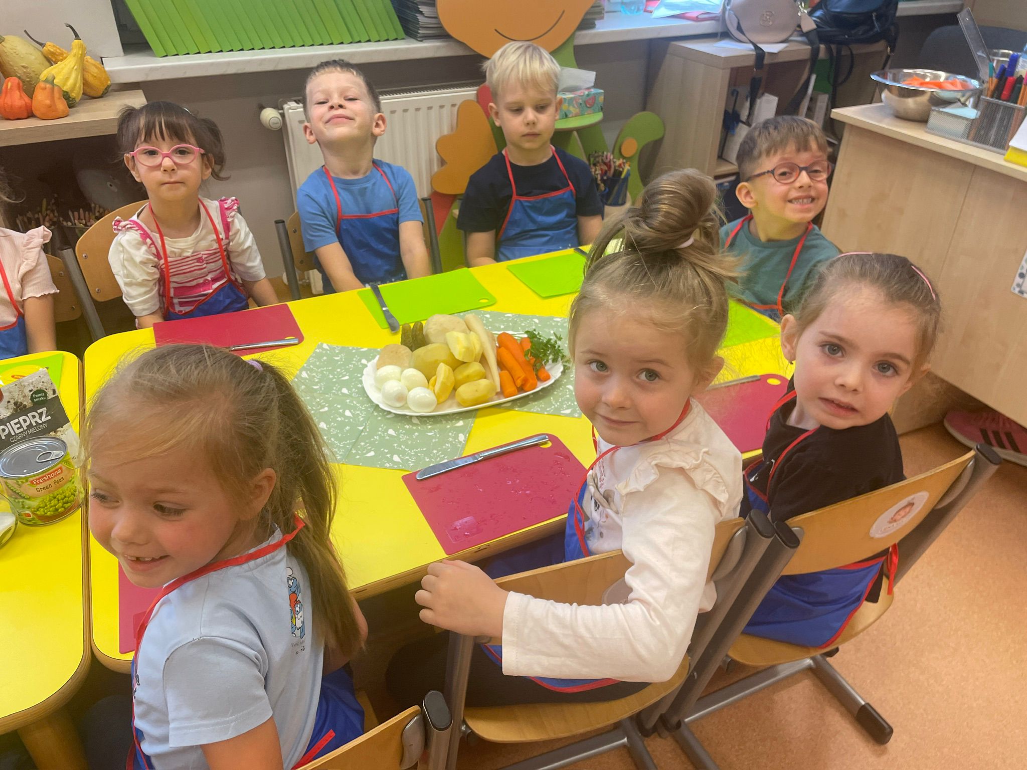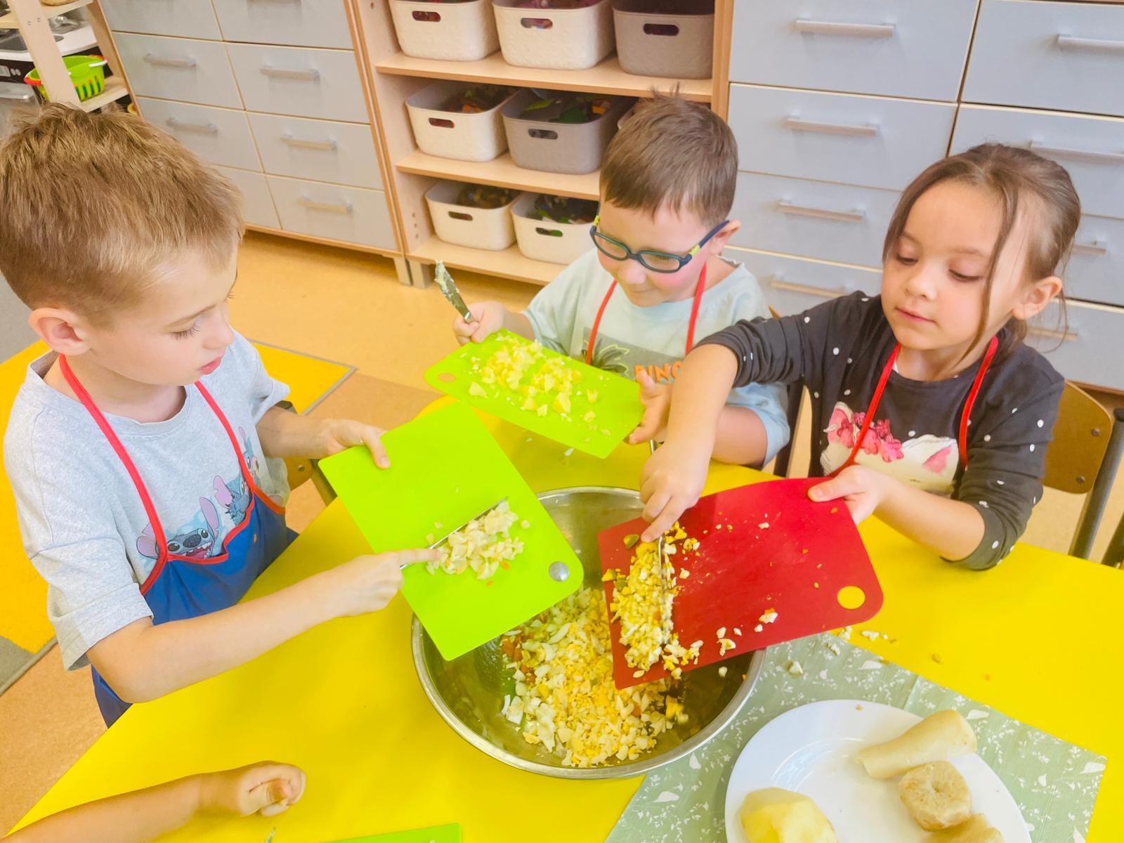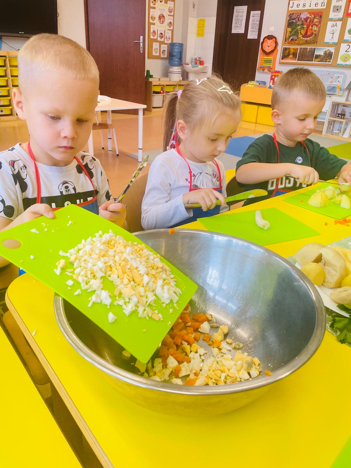 Jesień wielu kojarzy się z deszczową pogodą i szarugą. Ale w naszym przedszkolu udowodniliśmy już wiele razy, że ta pora roku potrafi być również niezwykle kolorowa. A co, jeśli kolory miałyby również smak i zapach? Realizując projekt edukacyjny „Smaki jesieni” , podczas jesiennych atrakcji kulinarnych w gr. XI przedszkolaki sprawdziły, że kolorowe warzywa i owoce, również te sezonowe, smakują i pachną wyśmienicie. Szczególnie jeśli się je ze sobą połączy. Wszyscy podkreślaliśmy walory zdrowotne owoców i warzyw. W ten oto sposób powstały zdrowe sałatki pełne pięknych barw, które przedszkolaki mogły samodzielnie spałaszować.