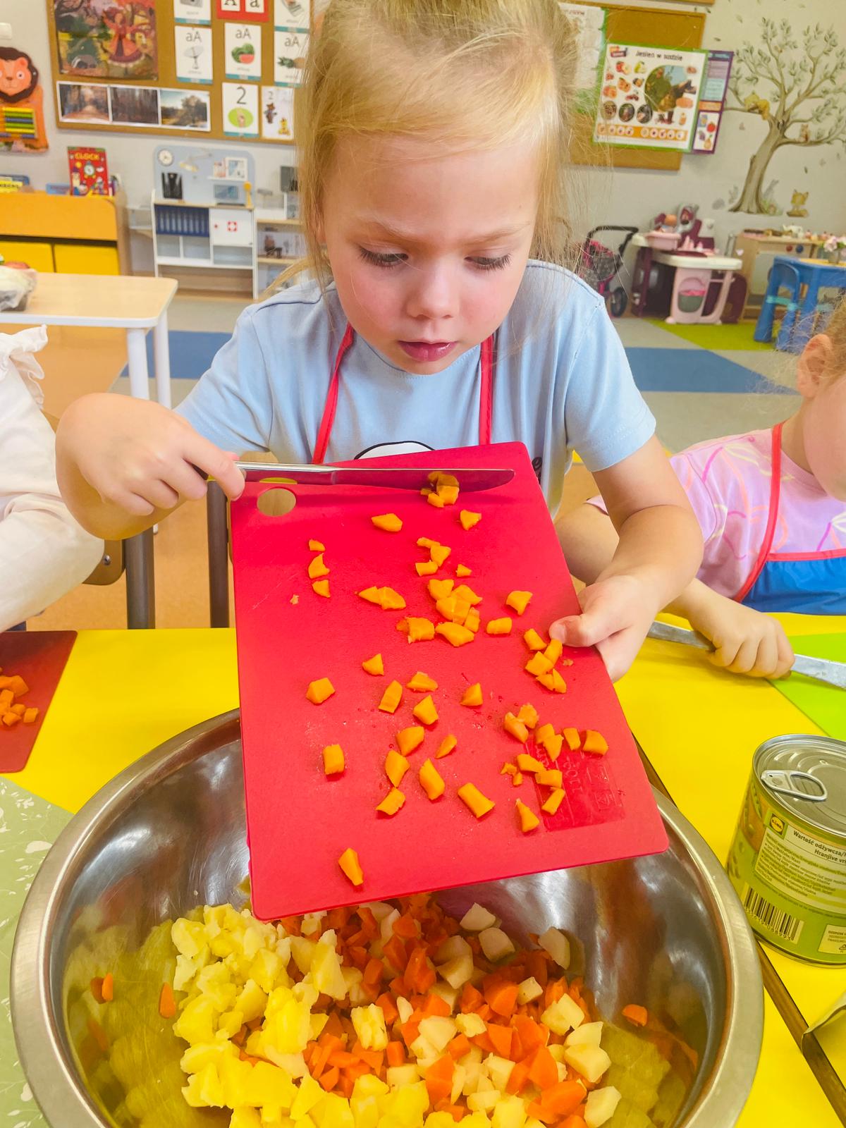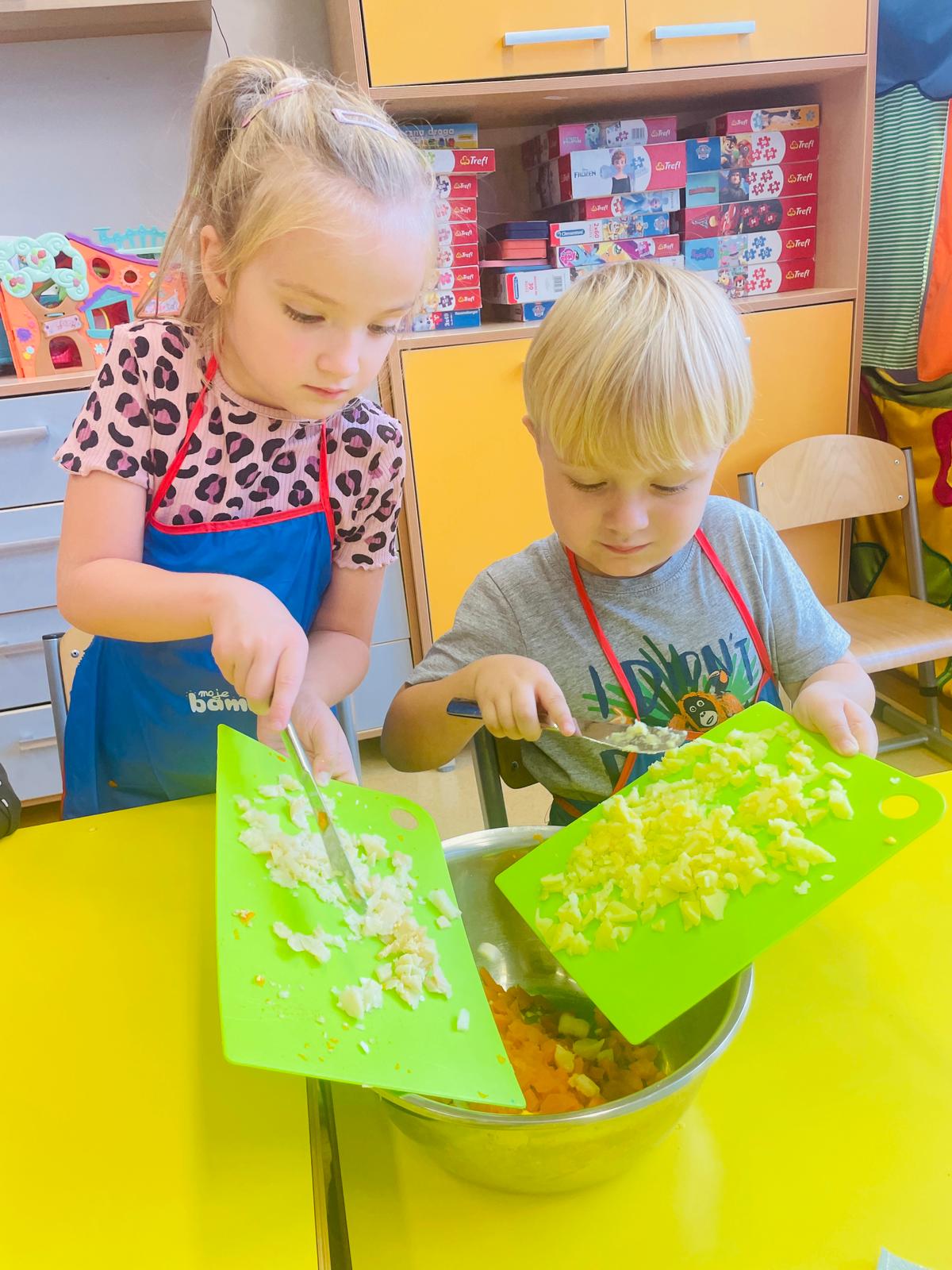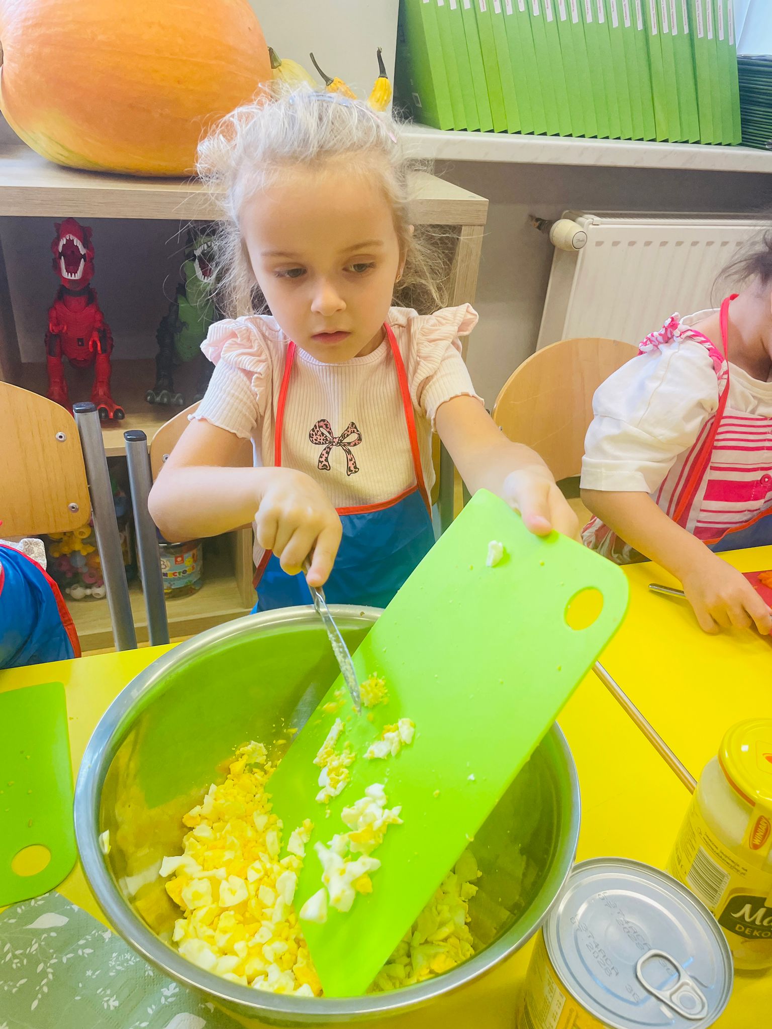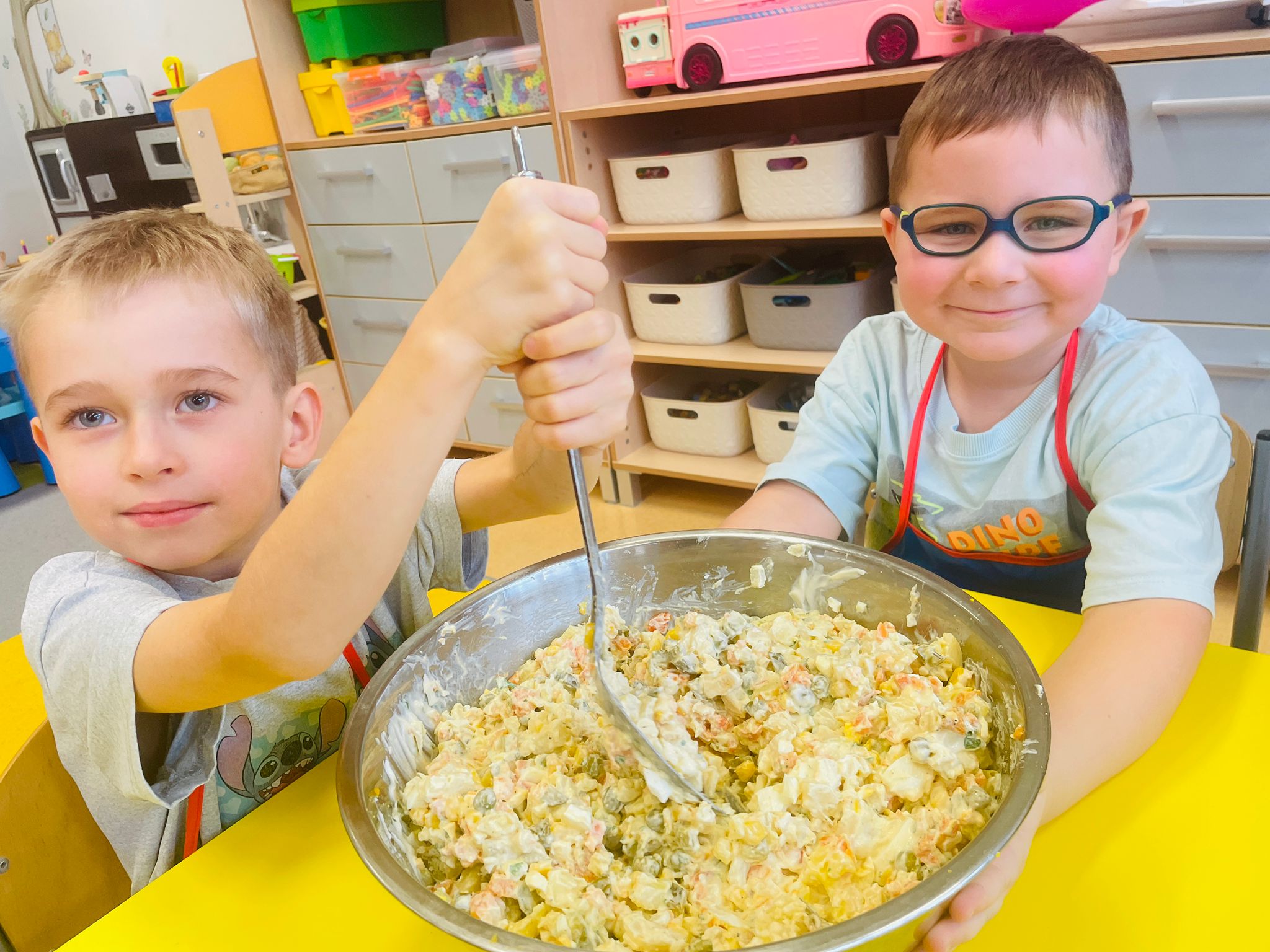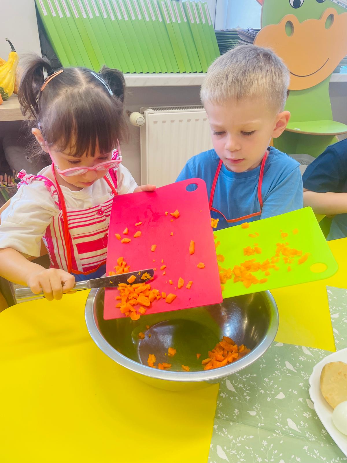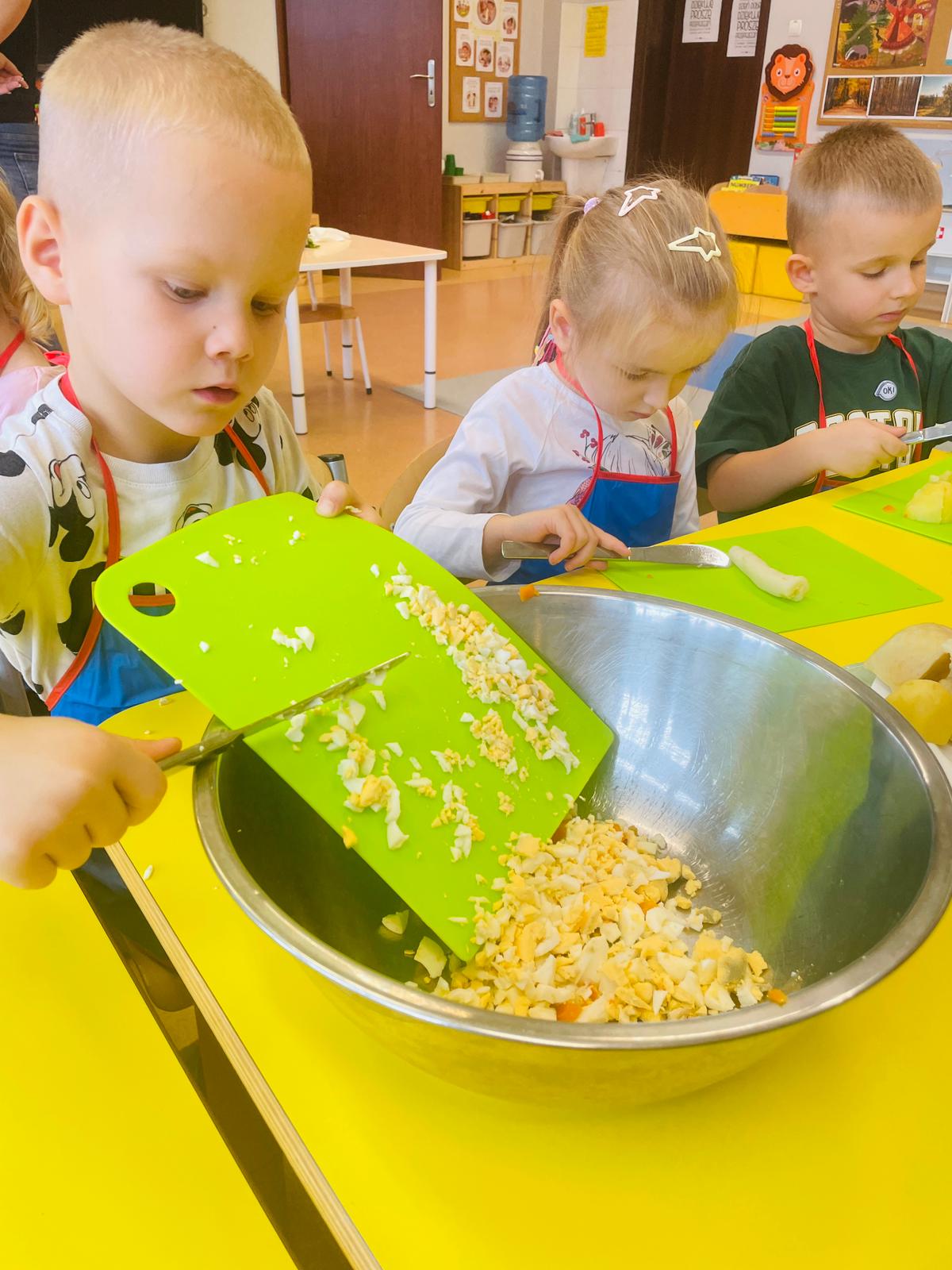 Jesień wielu kojarzy się z deszczową pogodą i szarugą. Ale w naszym przedszkolu udowodniliśmy już wiele razy, że ta pora roku potrafi być również niezwykle kolorowa. A co, jeśli kolory miałyby również smak i zapach? Realizując projekt edukacyjny „Smaki jesieni” , podczas jesiennych atrakcji kulinarnych w gr. XI przedszkolaki sprawdziły, że kolorowe warzywa i owoce, również te sezonowe, smakują i pachną wyśmienicie. Szczególnie jeśli się je ze sobą połączy. Wszyscy podkreślaliśmy walory zdrowotne owoców i warzyw. W ten oto sposób powstały zdrowe sałatki pełne pięknych barw, które przedszkolaki mogły samodzielnie spałaszować.