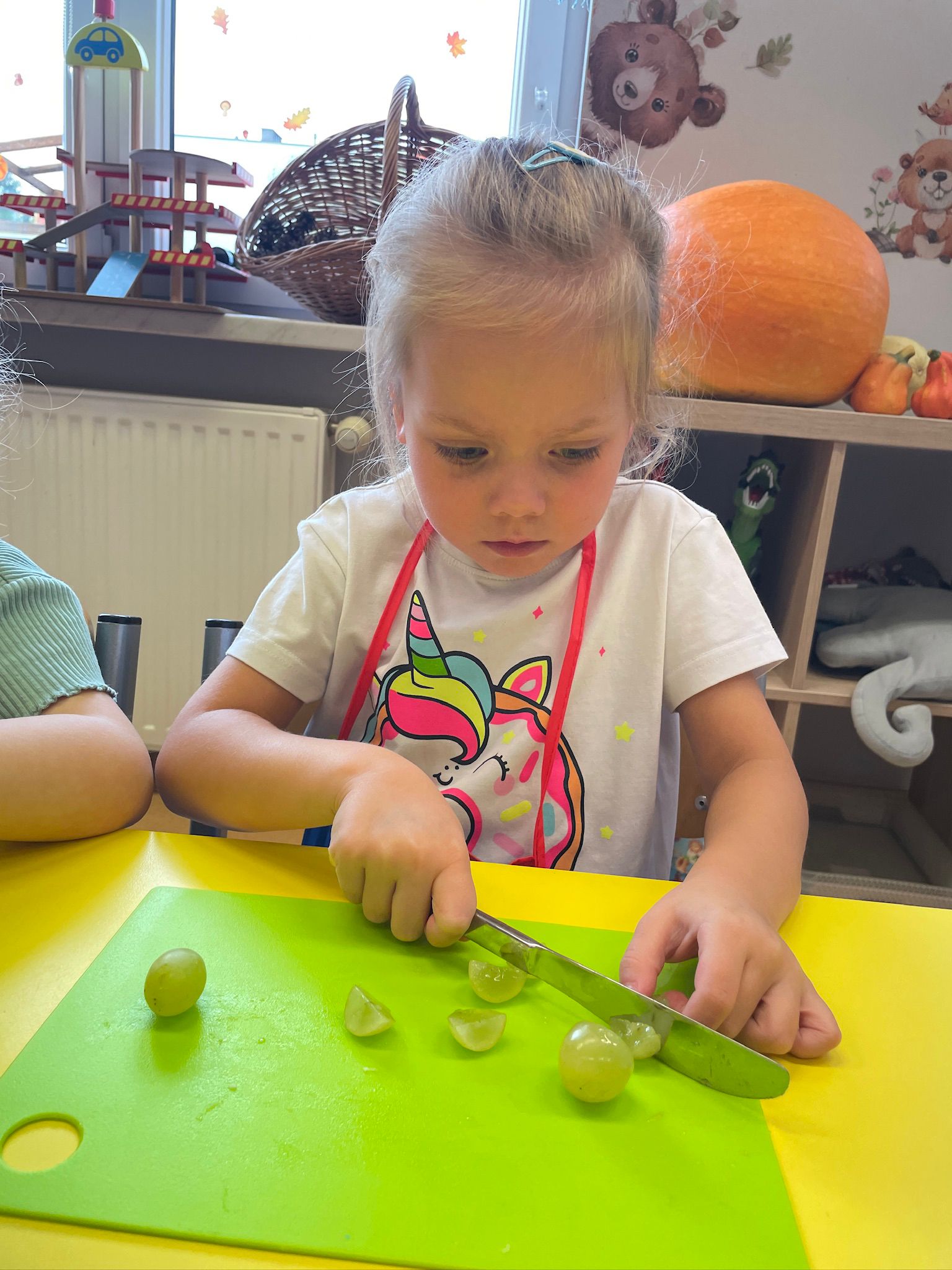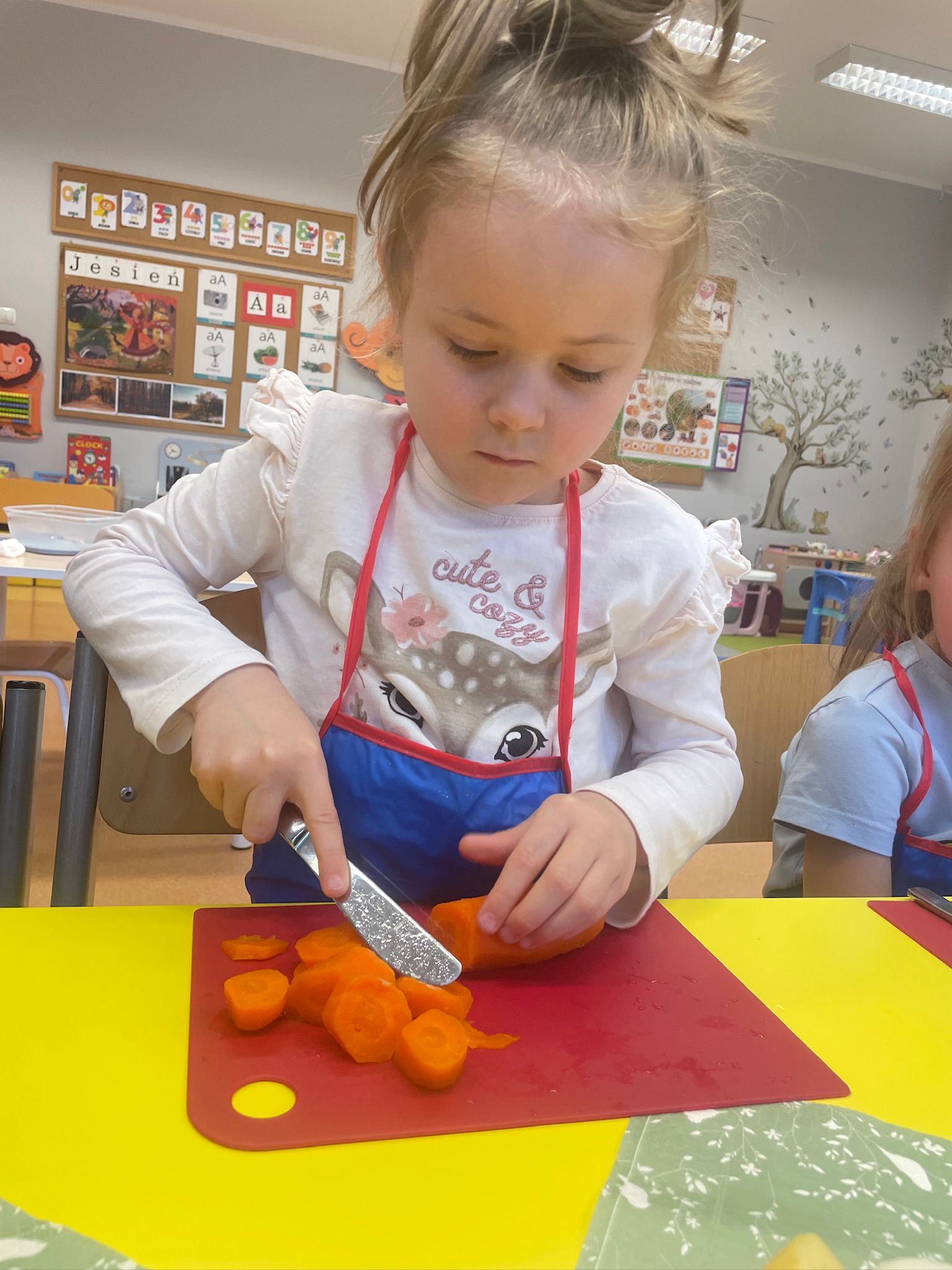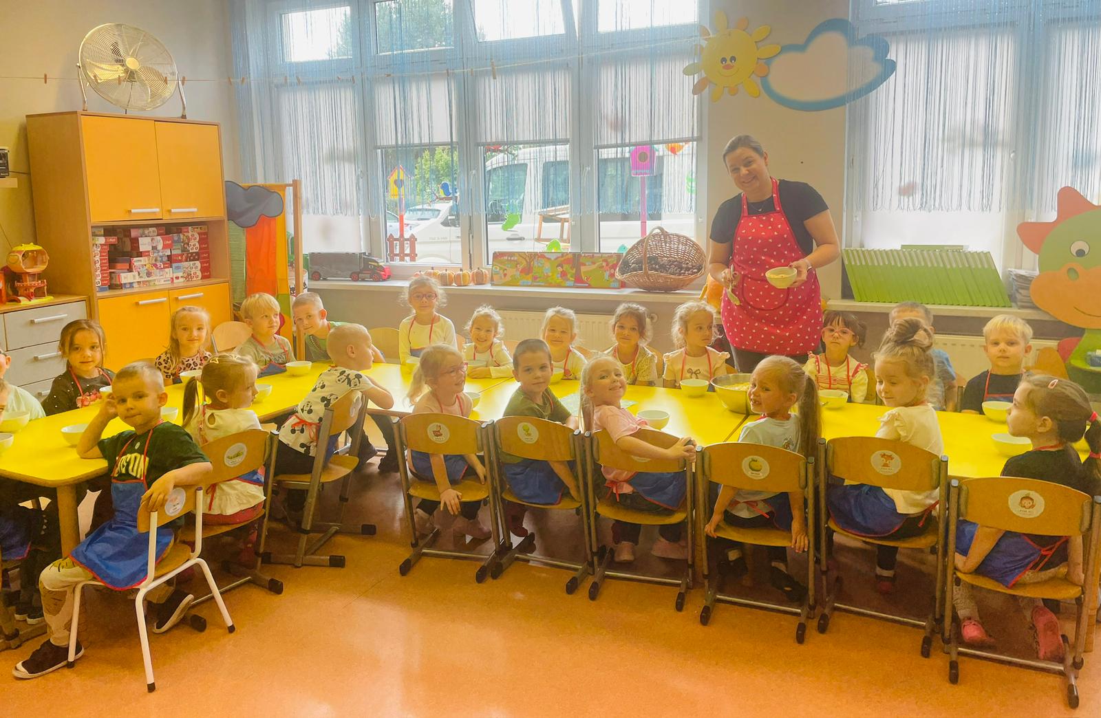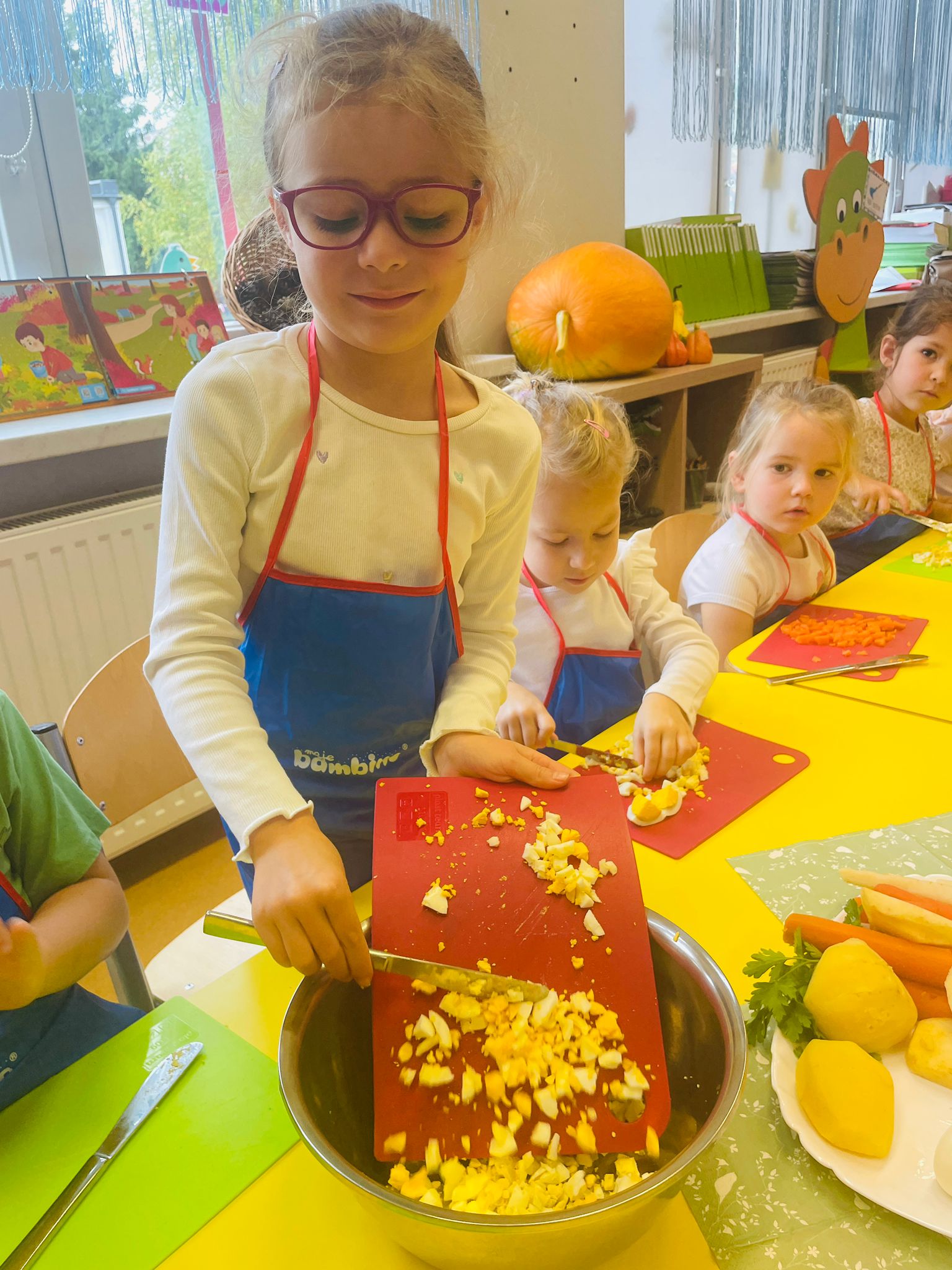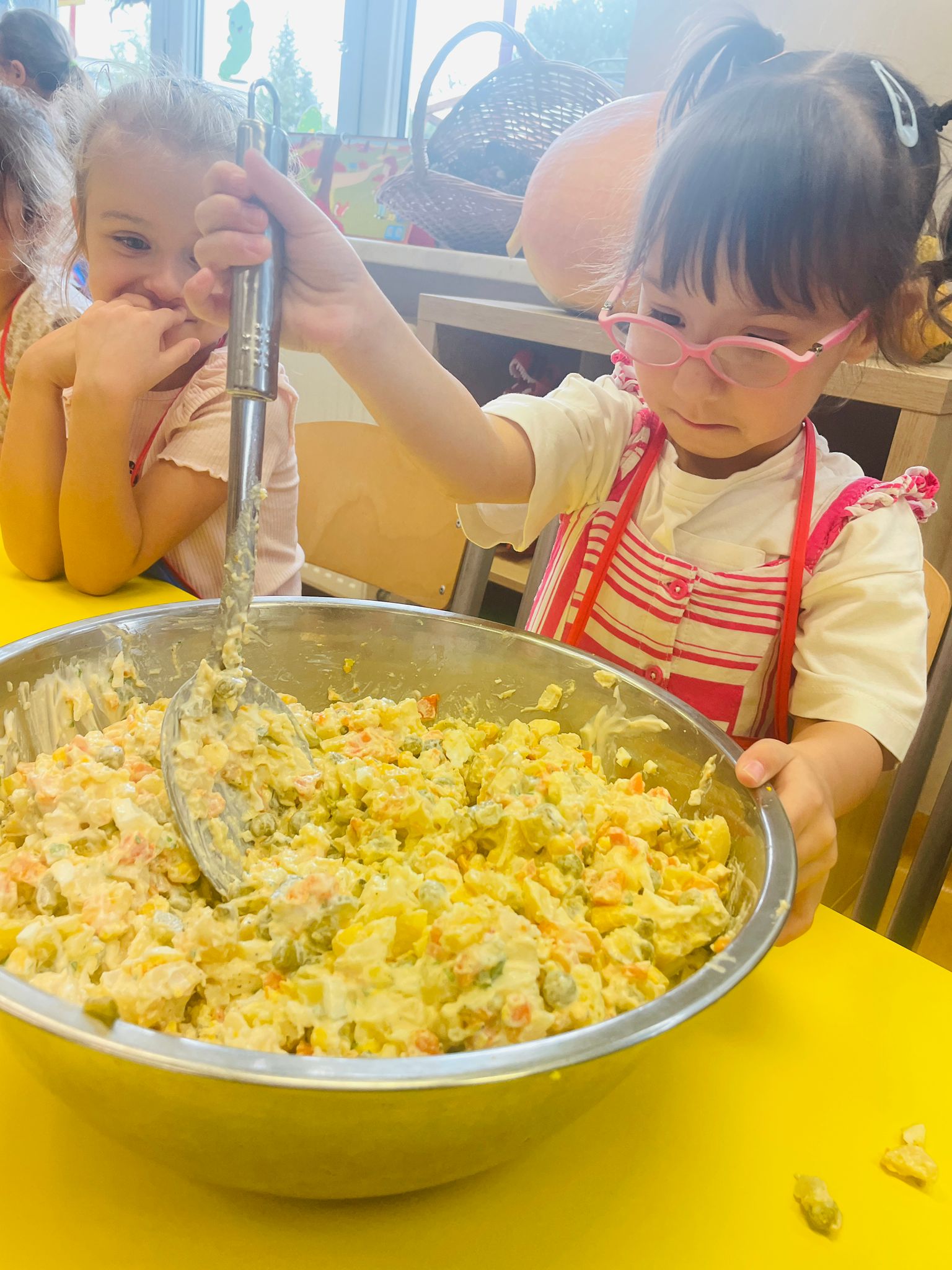 Jesień wielu kojarzy się z deszczową pogodą i szarugą. Ale w naszym przedszkolu udowodniliśmy już wiele razy, że ta pora roku potrafi być również niezwykle kolorowa. A co, jeśli kolory miałyby również smak i zapach? Realizując projekt edukacyjny „Smaki jesieni” , podczas jesiennych atrakcji kulinarnych w gr. XI przedszkolaki sprawdziły, że kolorowe warzywa i owoce, również te sezonowe, smakują i pachną wyśmienicie. Szczególnie jeśli się je ze sobą połączy. Wszyscy podkreślaliśmy walory zdrowotne owoców i warzyw. W ten oto sposób powstały zdrowe sałatki pełne pięknych barw, które przedszkolaki mogły samodzielnie spałaszować.