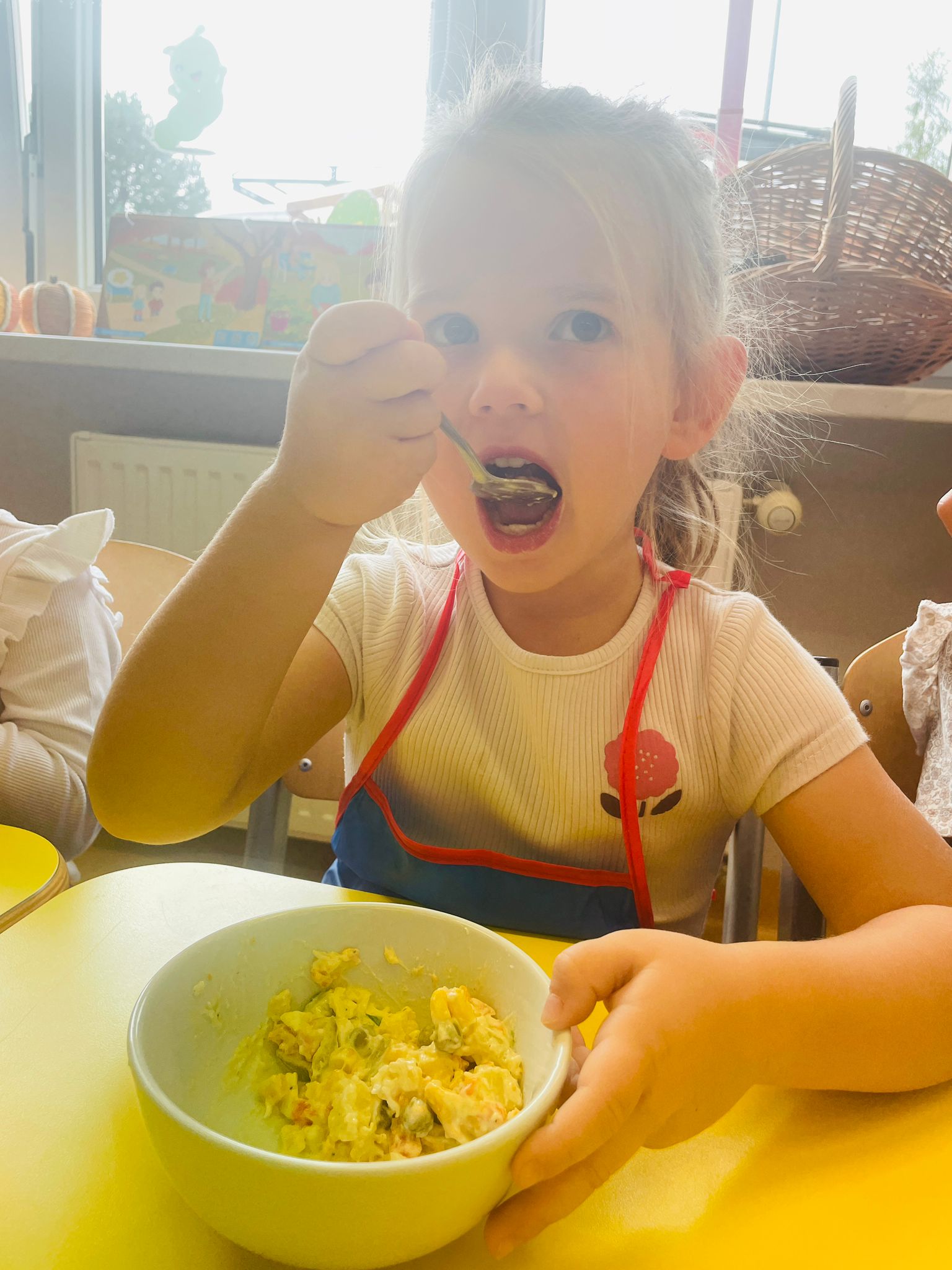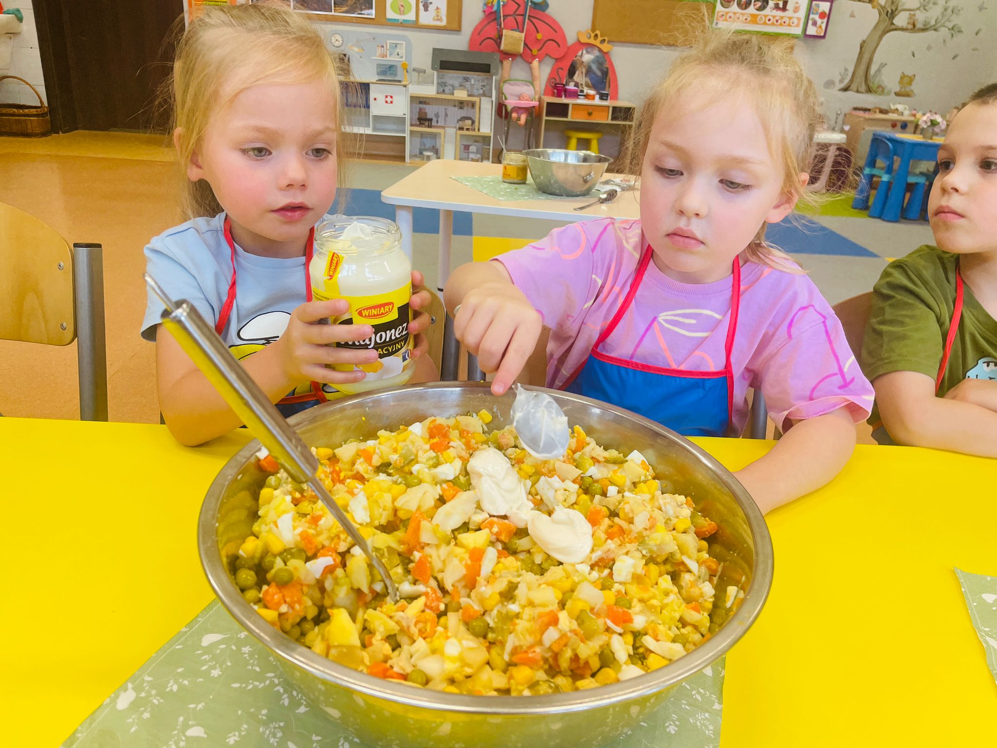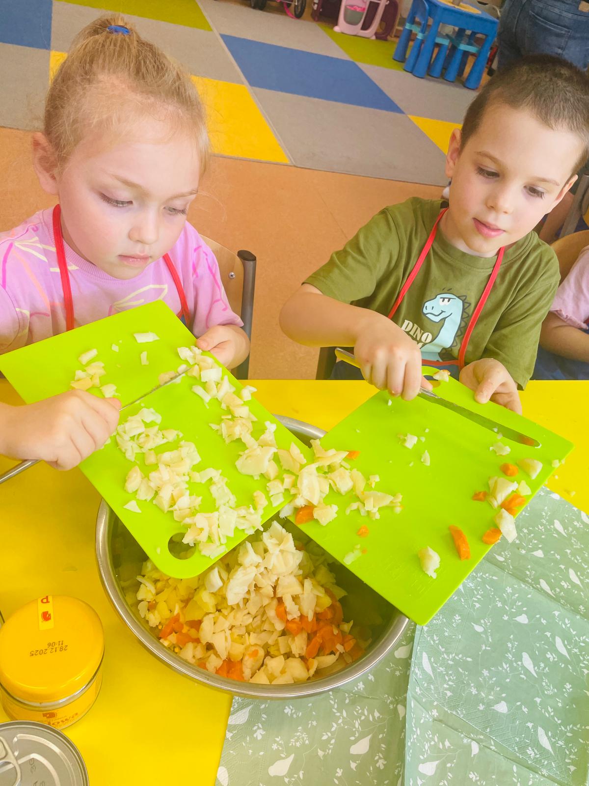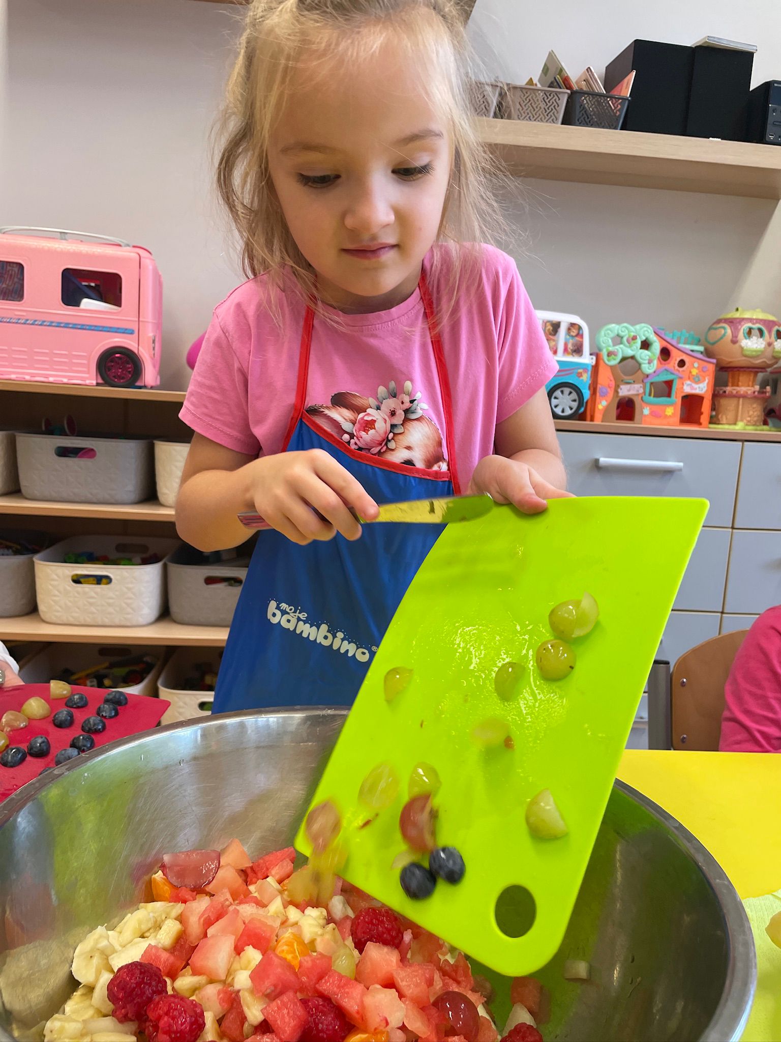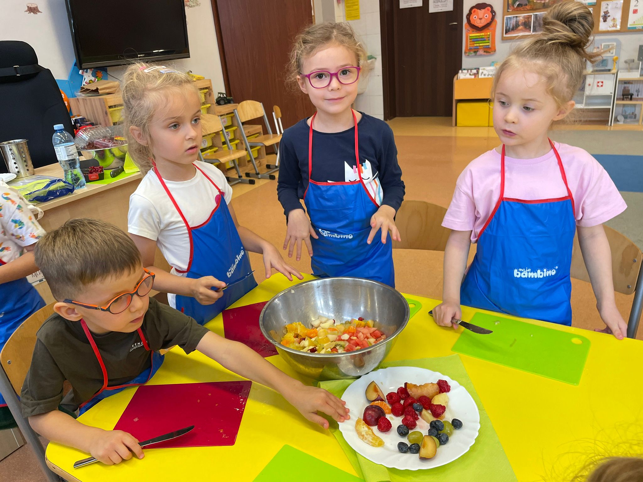 Jesień wielu kojarzy się z deszczową pogodą i szarugą. Ale w naszym przedszkolu udowodniliśmy już wiele razy, że ta pora roku potrafi być również niezwykle kolorowa. A co, jeśli kolory miałyby również smak i zapach? Realizując projekt edukacyjny „Smaki jesieni” , podczas jesiennych atrakcji kulinarnych w gr. XI przedszkolaki sprawdziły, że kolorowe warzywa i owoce, również te sezonowe, smakują i pachną wyśmienicie. Szczególnie jeśli się je ze sobą połączy. Wszyscy podkreślaliśmy walory zdrowotne owoców i warzyw. W ten oto sposób powstały zdrowe sałatki pełne pięknych barw, które przedszkolaki mogły samodzielnie spałaszować.