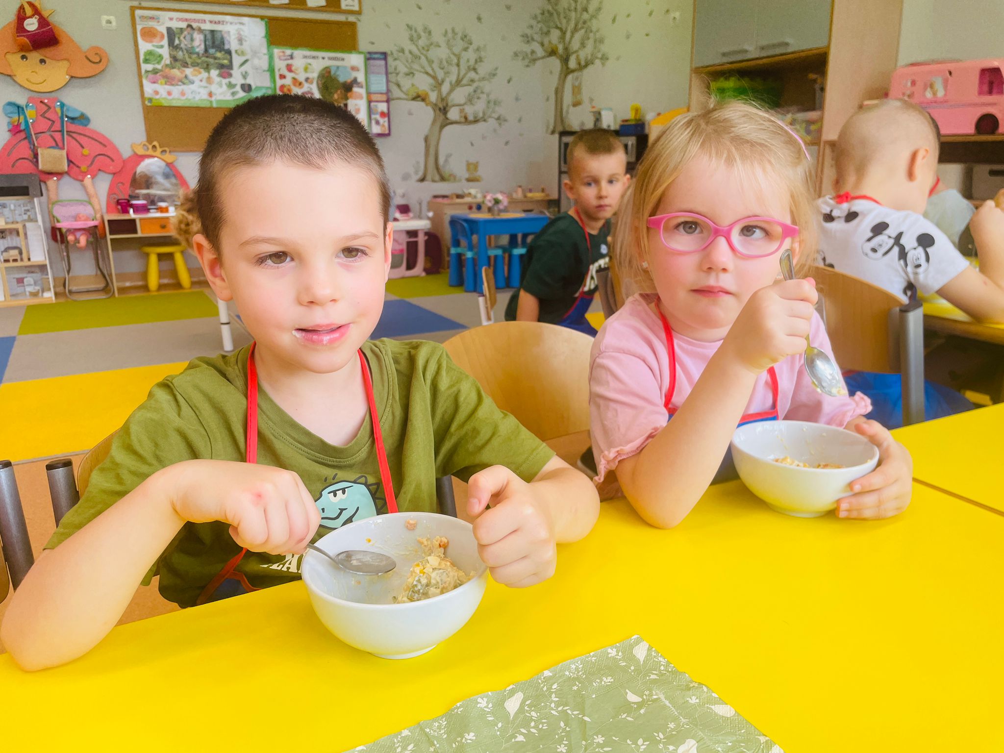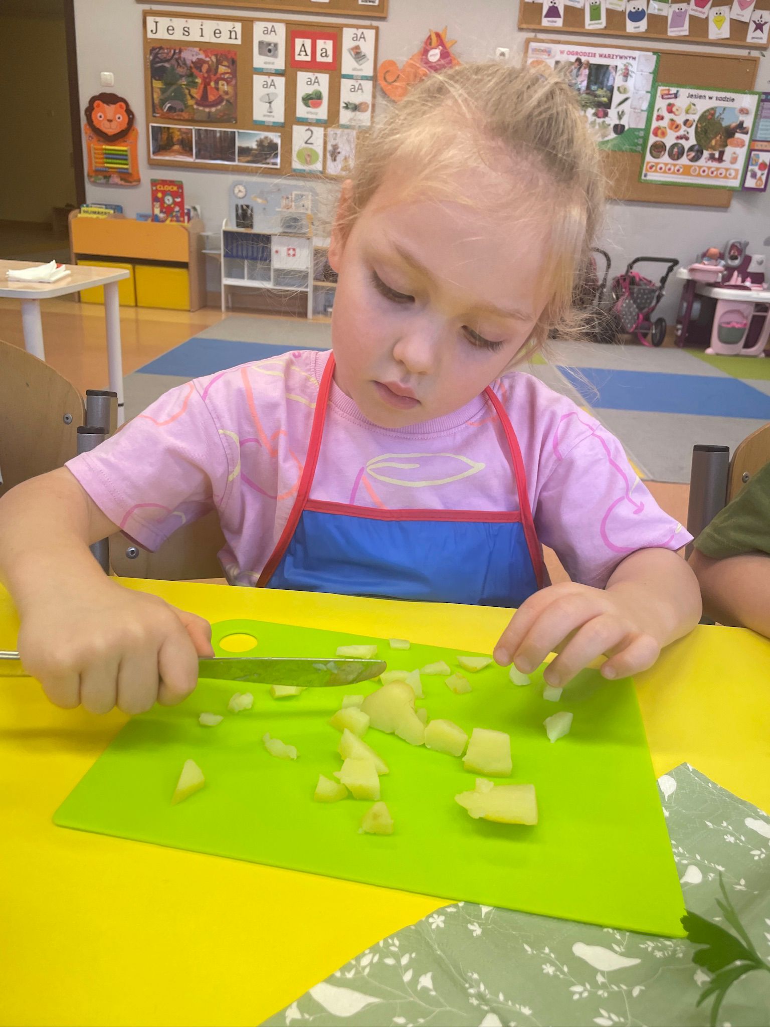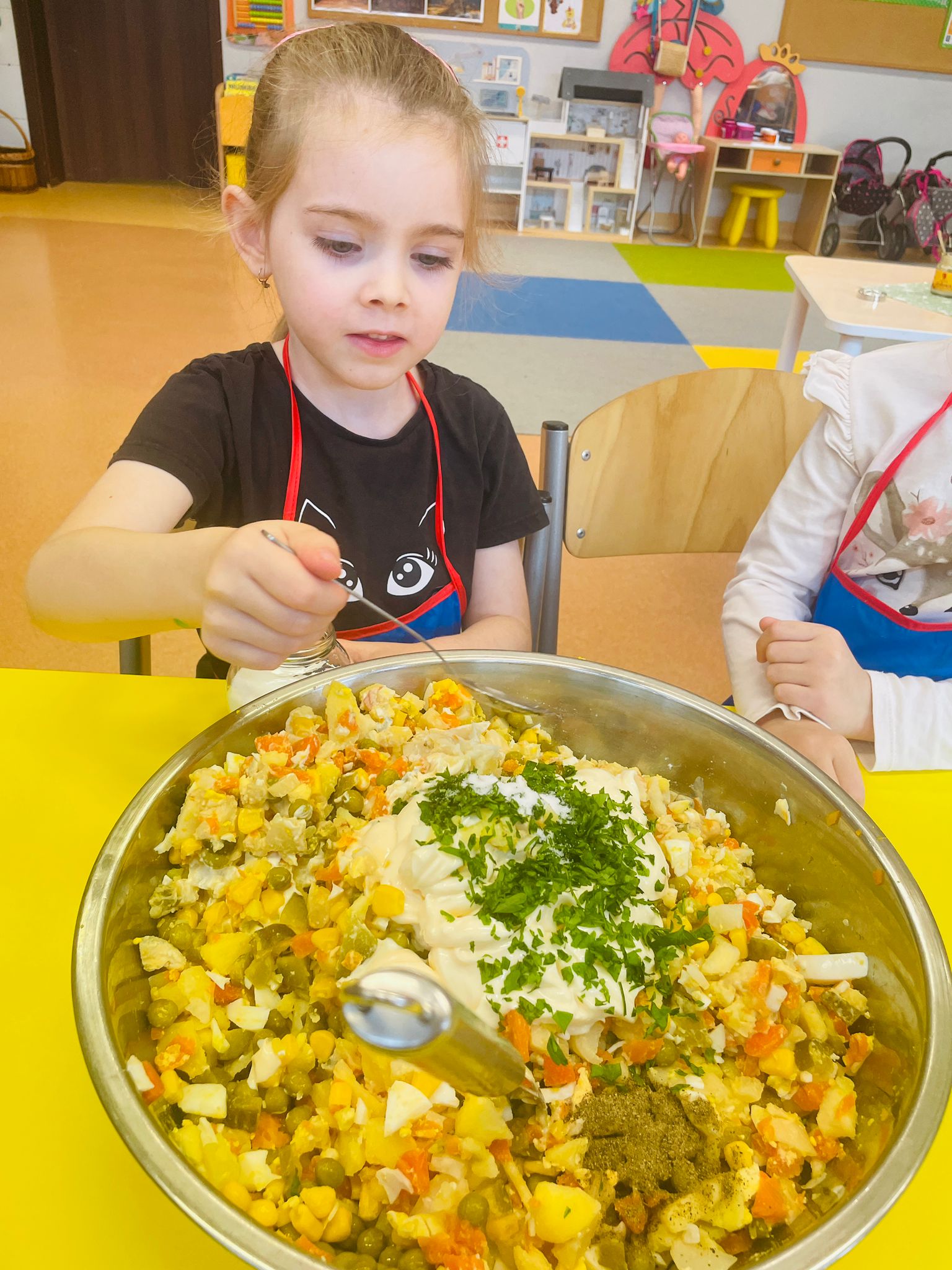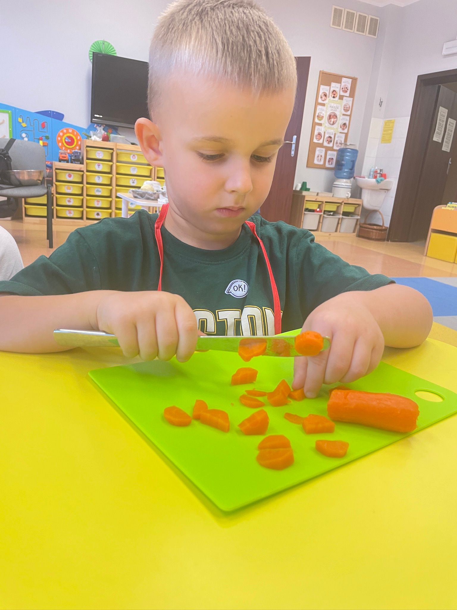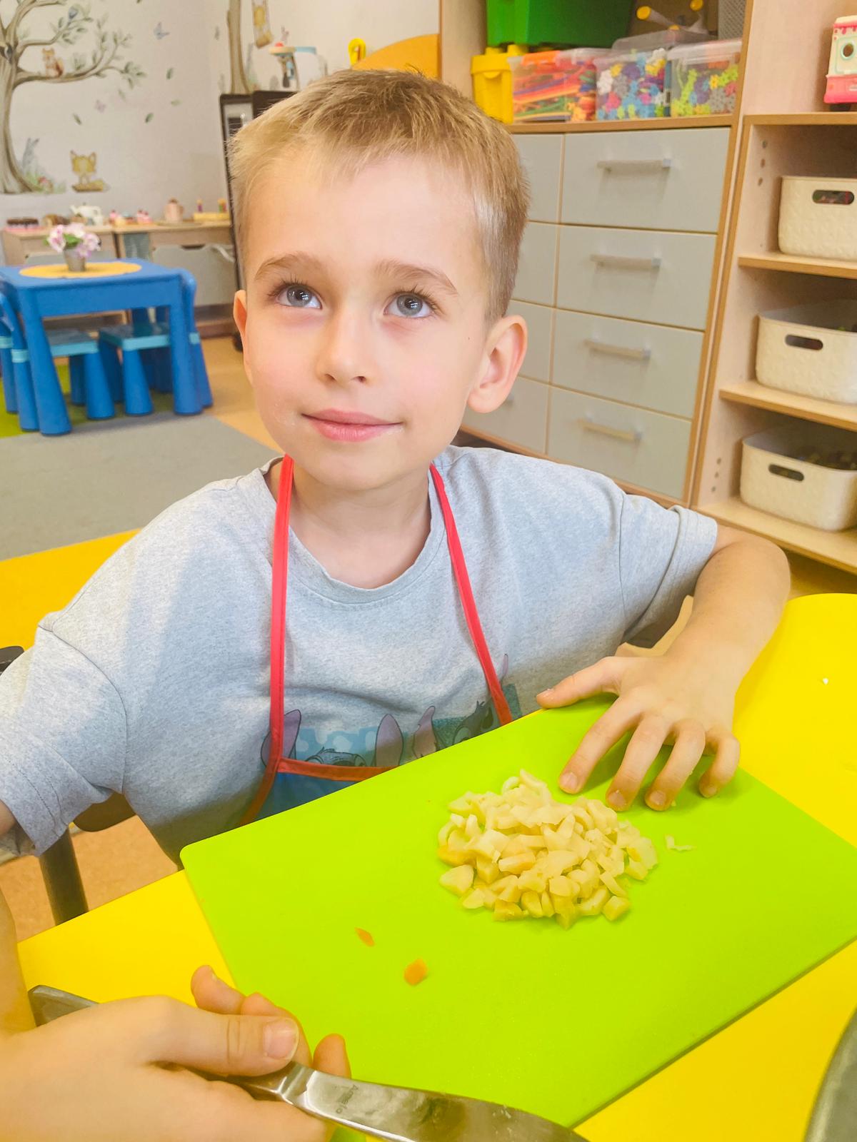 Jesień wielu kojarzy się z deszczową pogodą i szarugą. Ale w naszym przedszkolu udowodniliśmy już wiele razy, że ta pora roku potrafi być również niezwykle kolorowa. A co, jeśli kolory miałyby również smak i zapach? Realizując projekt edukacyjny „Smaki jesieni” , podczas jesiennych atrakcji kulinarnych w gr. XI przedszkolaki sprawdziły, że kolorowe warzywa i owoce, również te sezonowe, smakują i pachną wyśmienicie. Szczególnie jeśli się je ze sobą połączy. Wszyscy podkreślaliśmy walory zdrowotne owoców i warzyw. W ten oto sposób powstały zdrowe sałatki pełne pięknych barw, które przedszkolaki mogły samodzielnie spałaszować.
