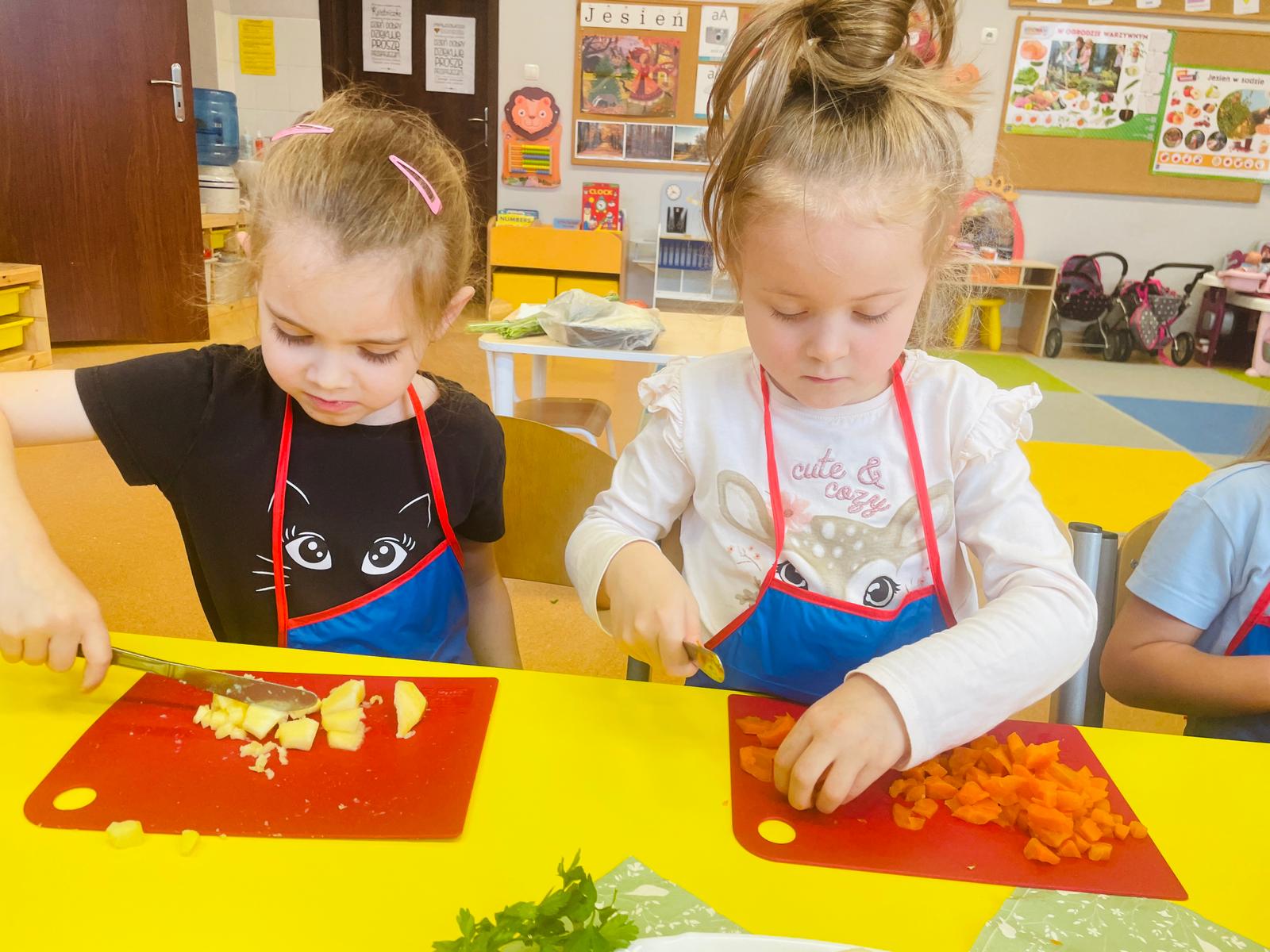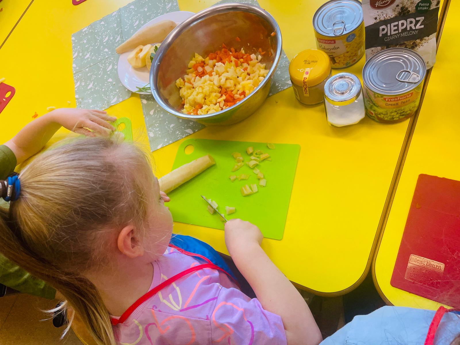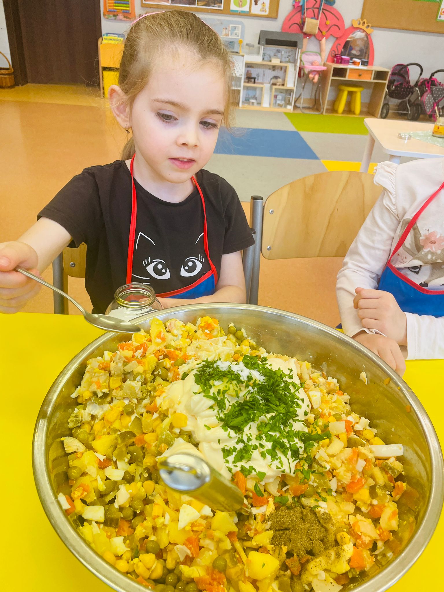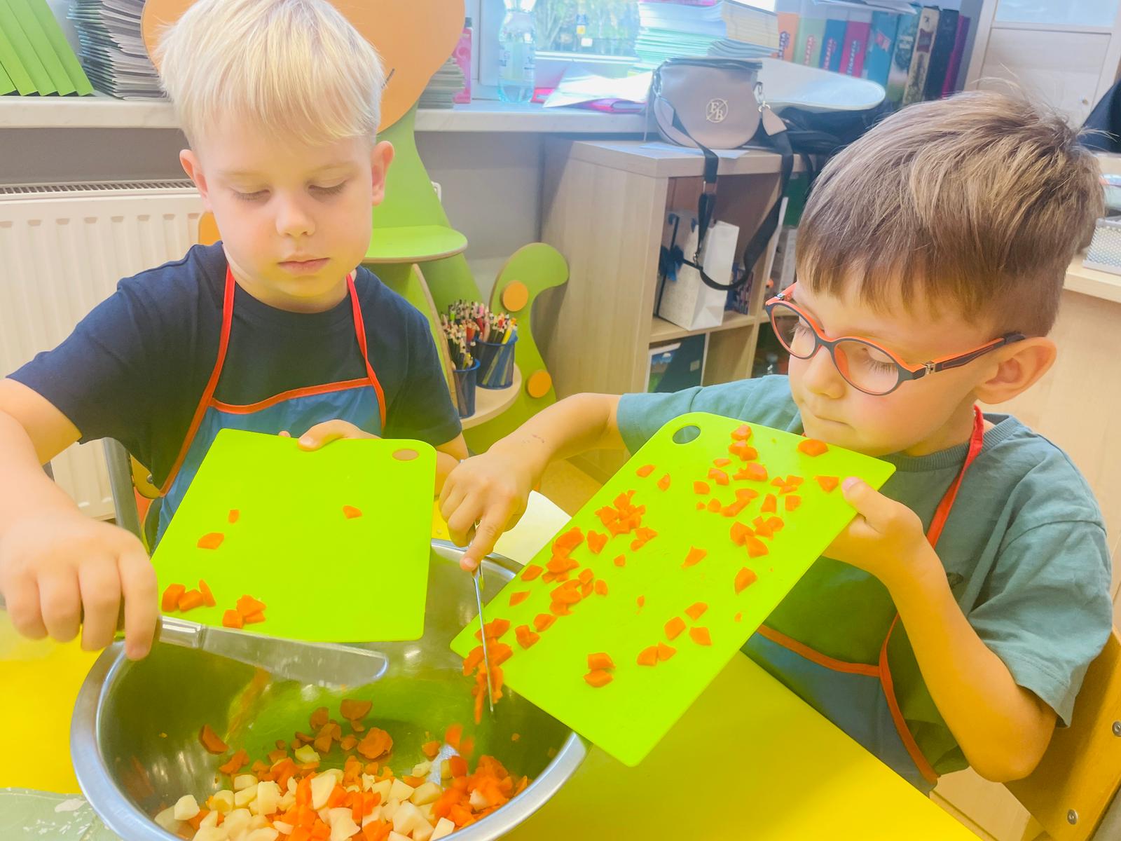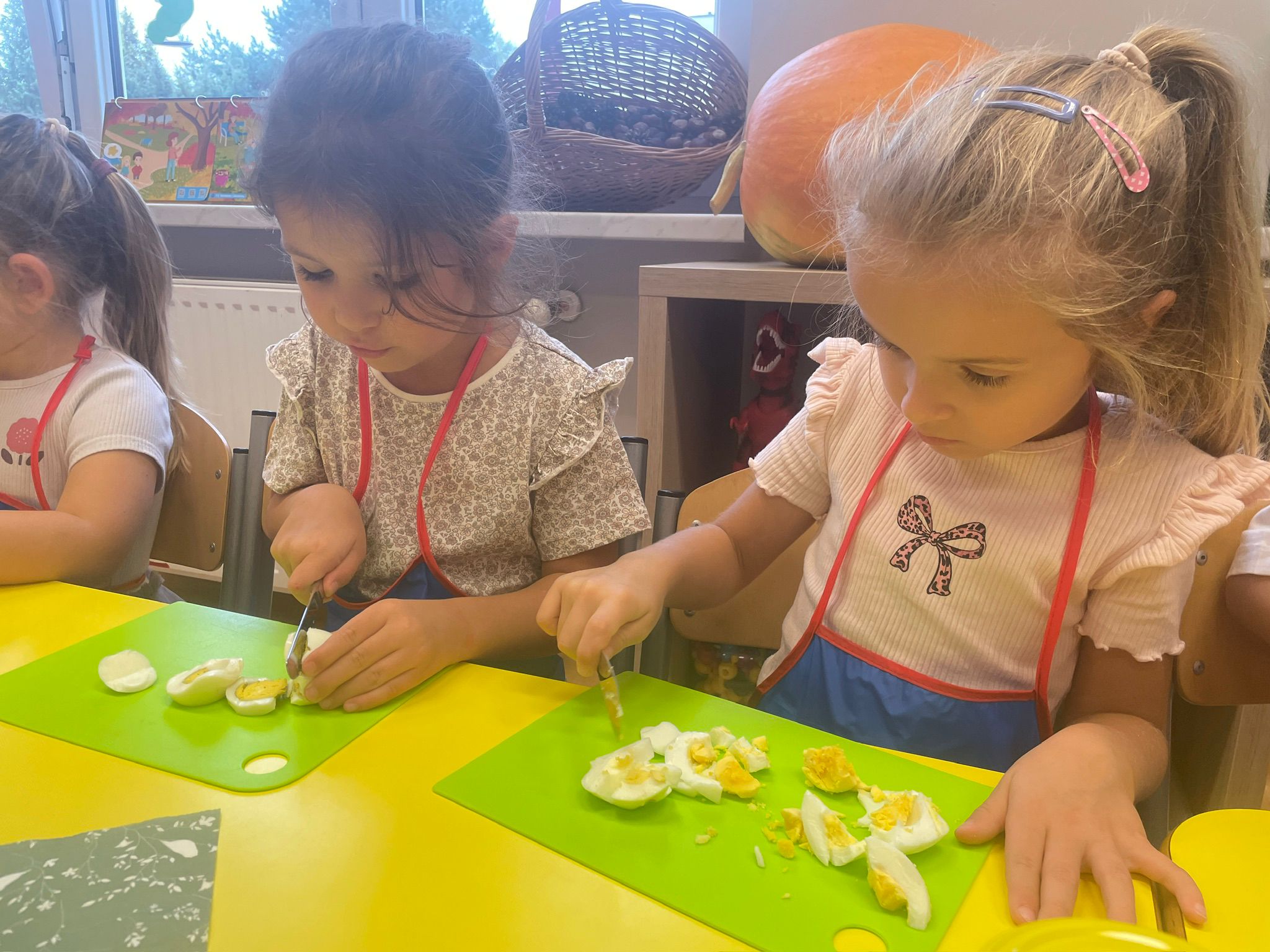 Jesień wielu kojarzy się z deszczową pogodą i szarugą. Ale w naszym przedszkolu udowodniliśmy już wiele razy, że ta pora roku potrafi być również niezwykle kolorowa. A co, jeśli kolory miałyby również smak i zapach? Realizując projekt edukacyjny „Smaki jesieni” , podczas jesiennych atrakcji kulinarnych w gr. XI przedszkolaki sprawdziły, że kolorowe warzywa i owoce, również te sezonowe, smakują i pachną wyśmienicie. Szczególnie jeśli się je ze sobą połączy. Wszyscy podkreślaliśmy walory zdrowotne owoców i warzyw. W ten oto sposób powstały zdrowe sałatki pełne pięknych barw, które przedszkolaki mogły samodzielnie spałaszować.