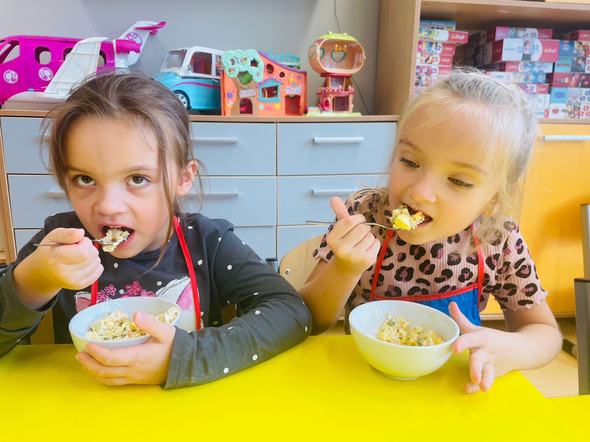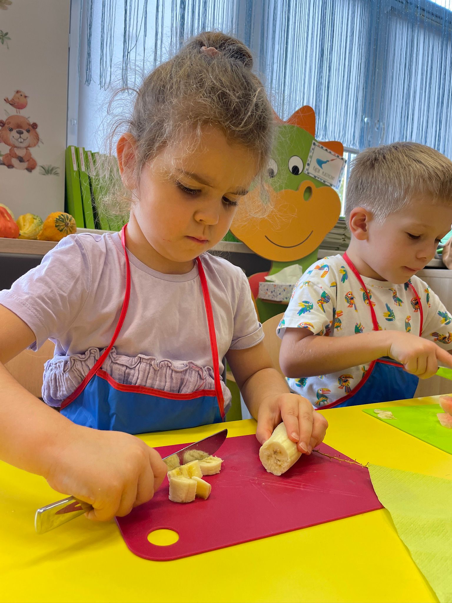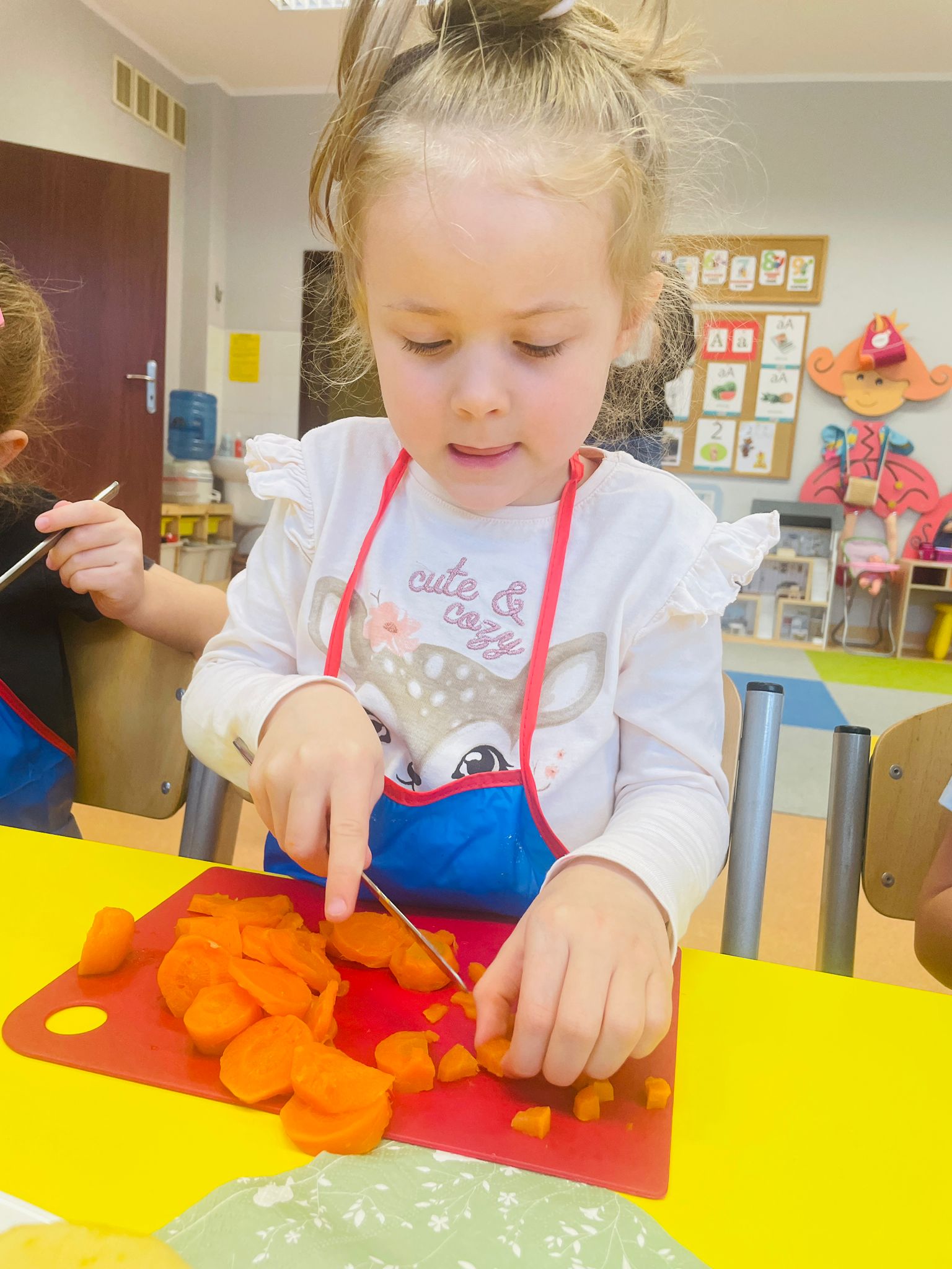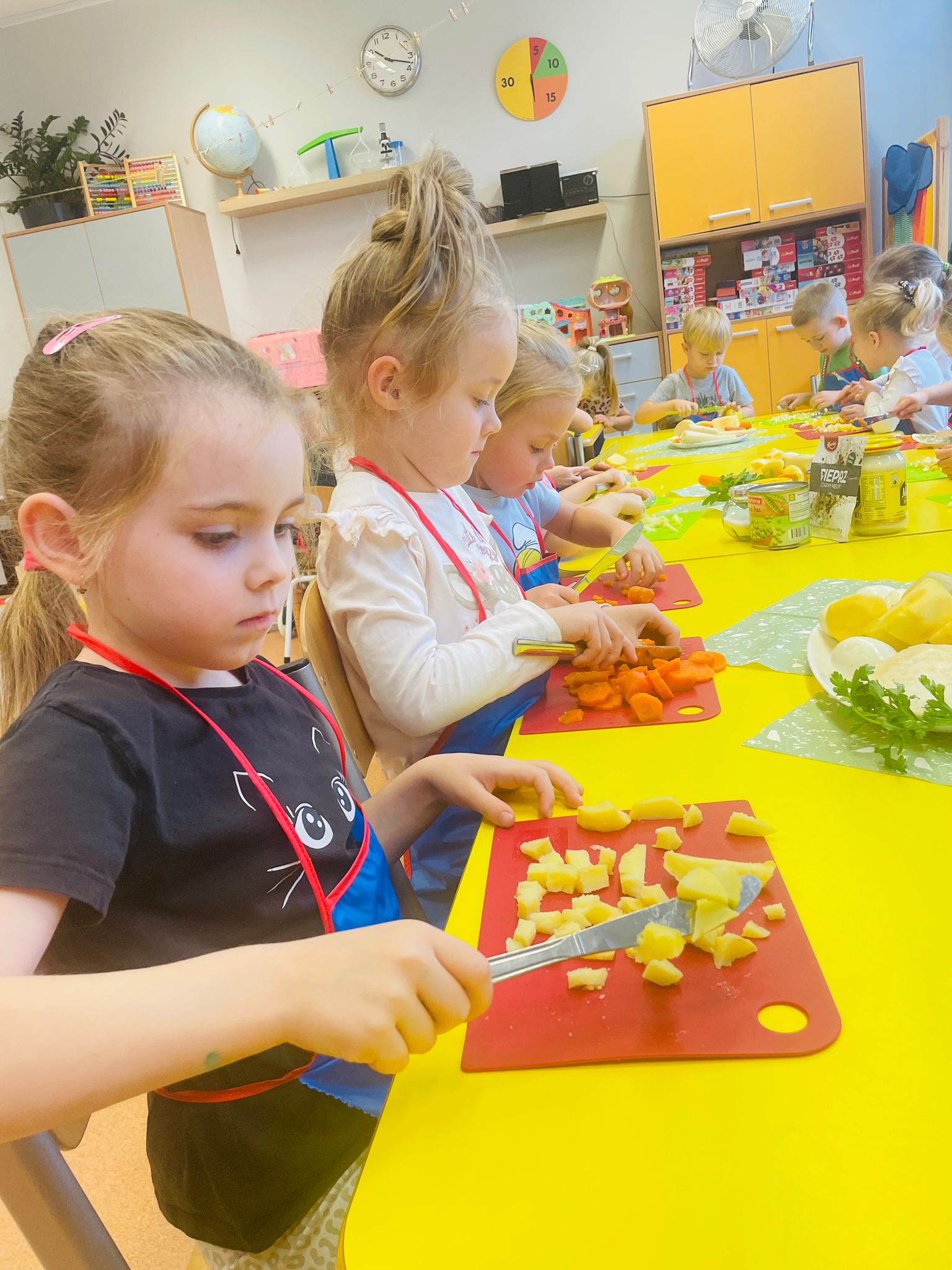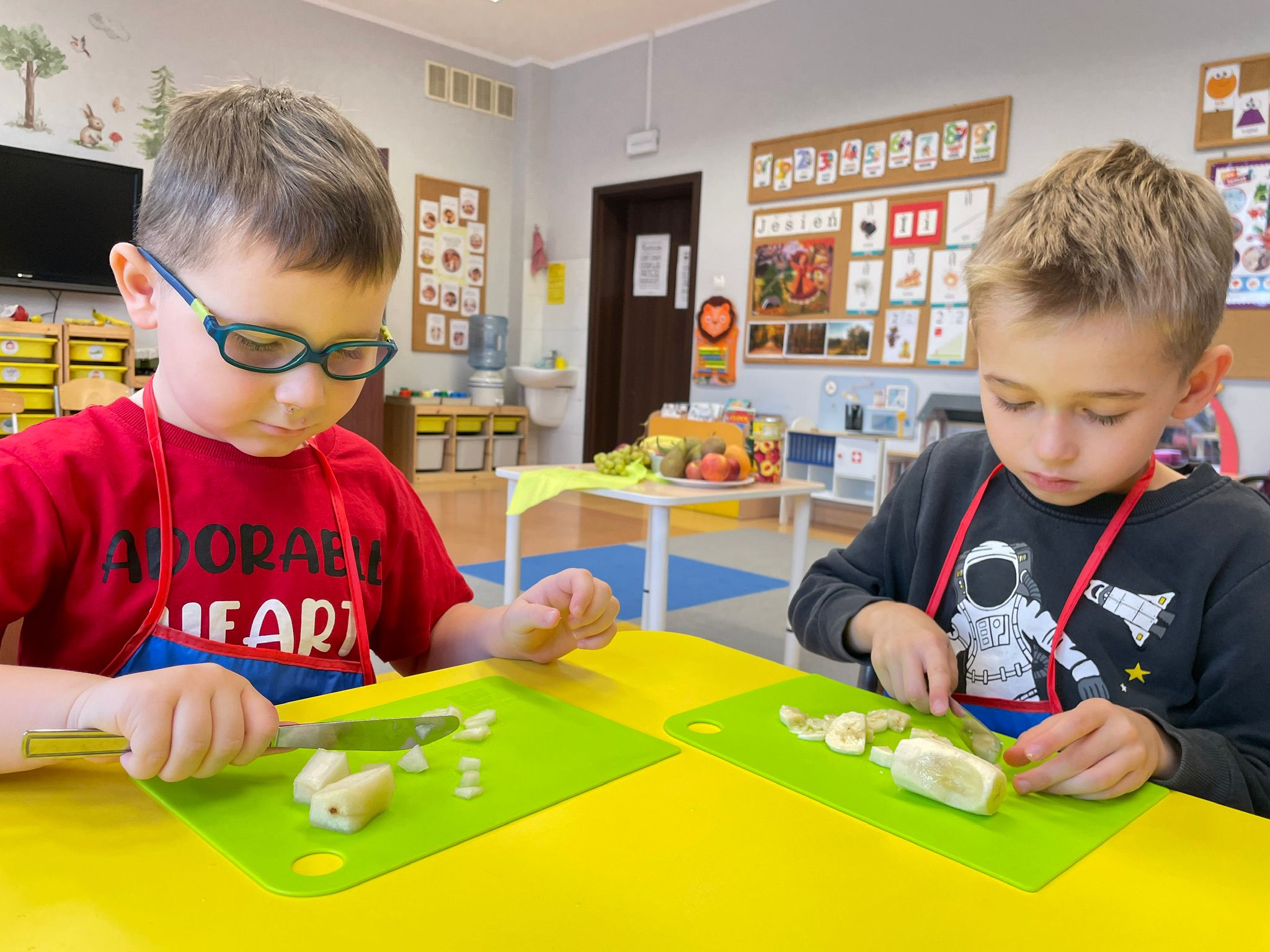 Jesień wielu kojarzy się z deszczową pogodą i szarugą. Ale w naszym przedszkolu udowodniliśmy już wiele razy, że ta pora roku potrafi być również niezwykle kolorowa. A co, jeśli kolory miałyby również smak i zapach? Realizując projekt edukacyjny „Smaki jesieni” , podczas jesiennych atrakcji kulinarnych w gr. XI przedszkolaki sprawdziły, że kolorowe warzywa i owoce, również te sezonowe, smakują i pachną wyśmienicie. Szczególnie jeśli się je ze sobą połączy. Wszyscy podkreślaliśmy walory zdrowotne owoców i warzyw. W ten oto sposób powstały zdrowe sałatki pełne pięknych barw, które przedszkolaki mogły samodzielnie spałaszować.