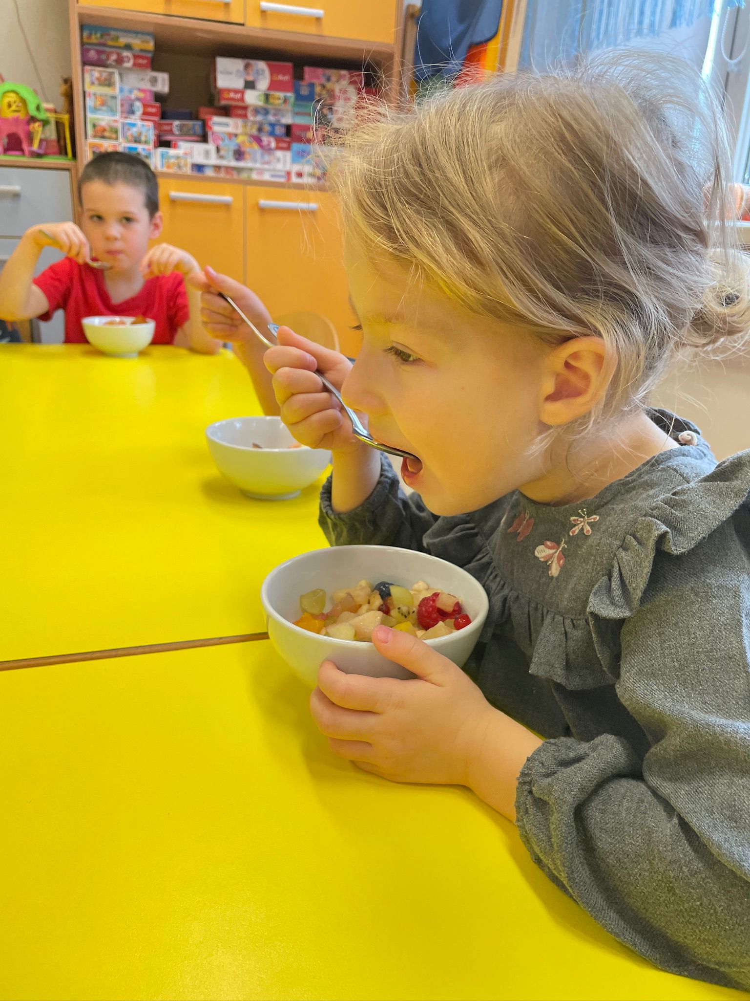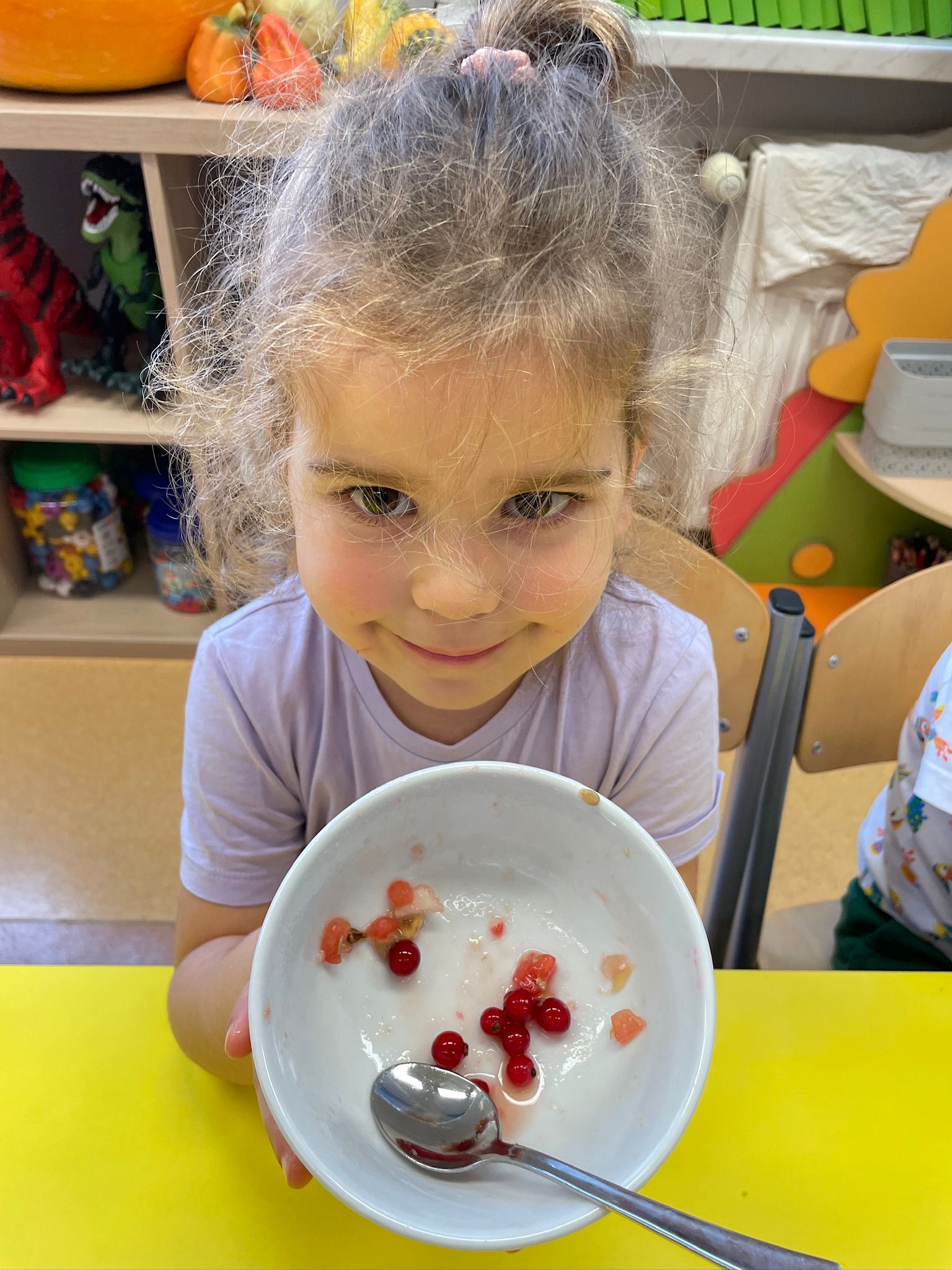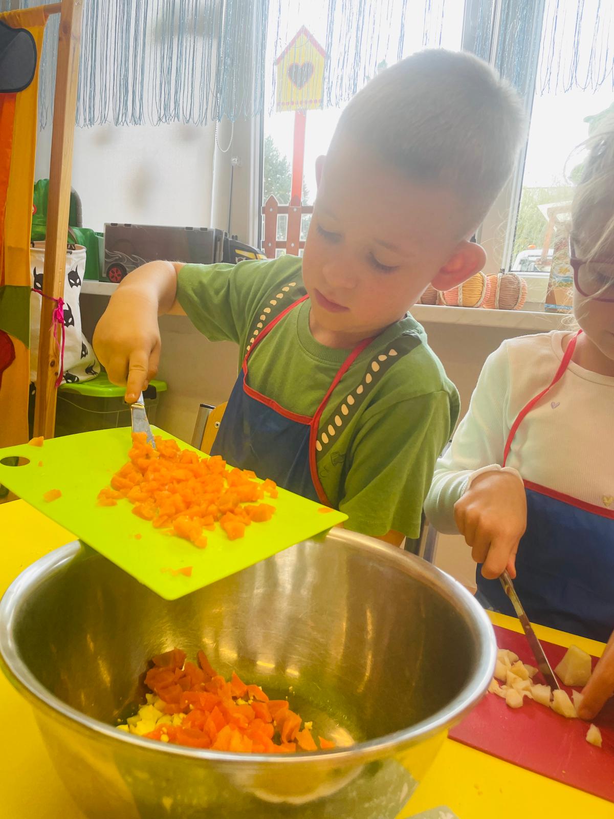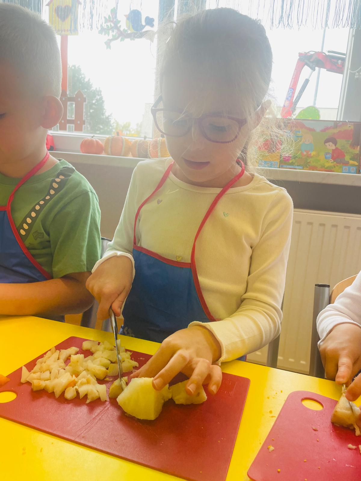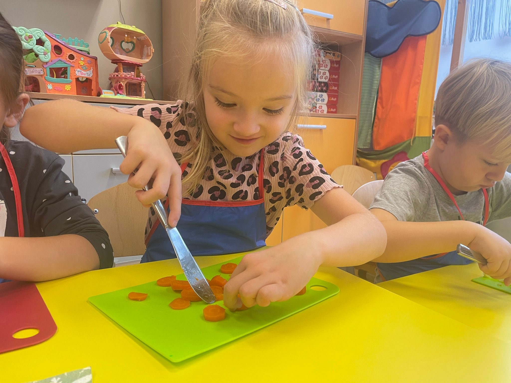 Jesień wielu kojarzy się z deszczową pogodą i szarugą. Ale w naszym przedszkolu udowodniliśmy już wiele razy, że ta pora roku potrafi być również niezwykle kolorowa. A co, jeśli kolory miałyby również smak i zapach? Realizując projekt edukacyjny „Smaki jesieni” , podczas jesiennych atrakcji kulinarnych w gr. XI przedszkolaki sprawdziły, że kolorowe warzywa i owoce, również te sezonowe, smakują i pachną wyśmienicie. Szczególnie jeśli się je ze sobą połączy. Wszyscy podkreślaliśmy walory zdrowotne owoców i warzyw. W ten oto sposób powstały zdrowe sałatki pełne pięknych barw, które przedszkolaki mogły samodzielnie spałaszować.