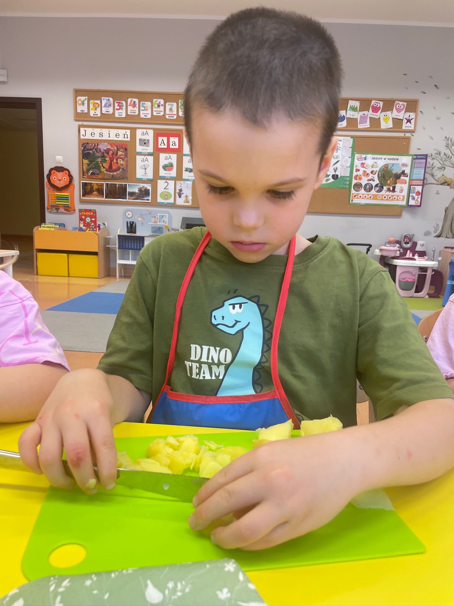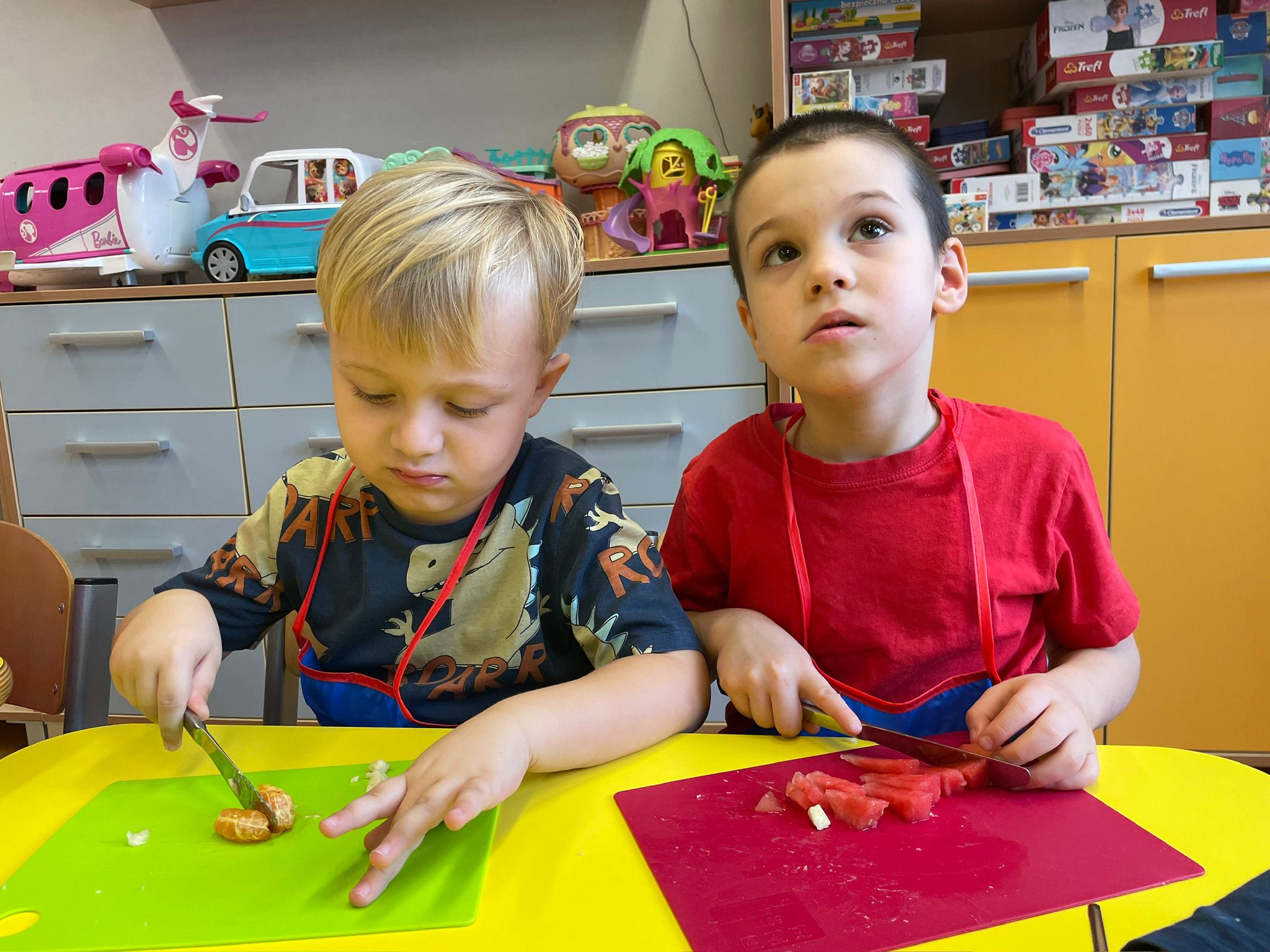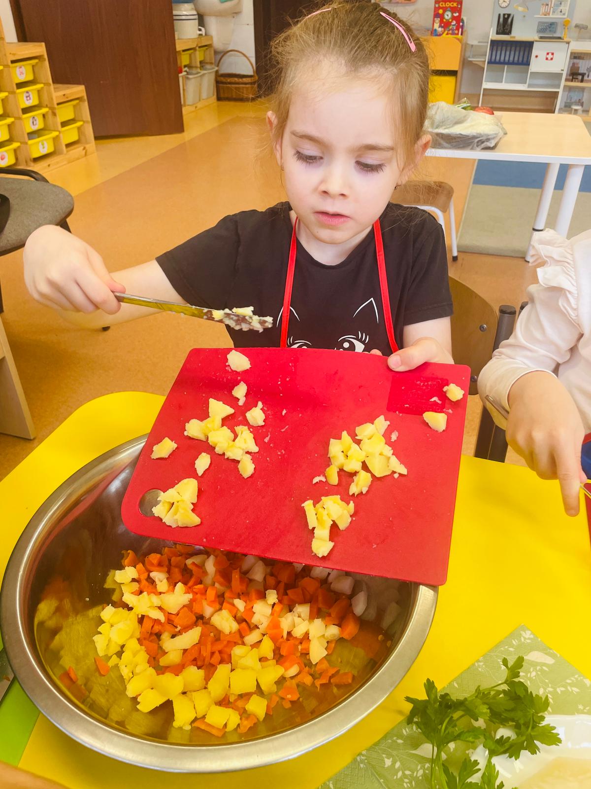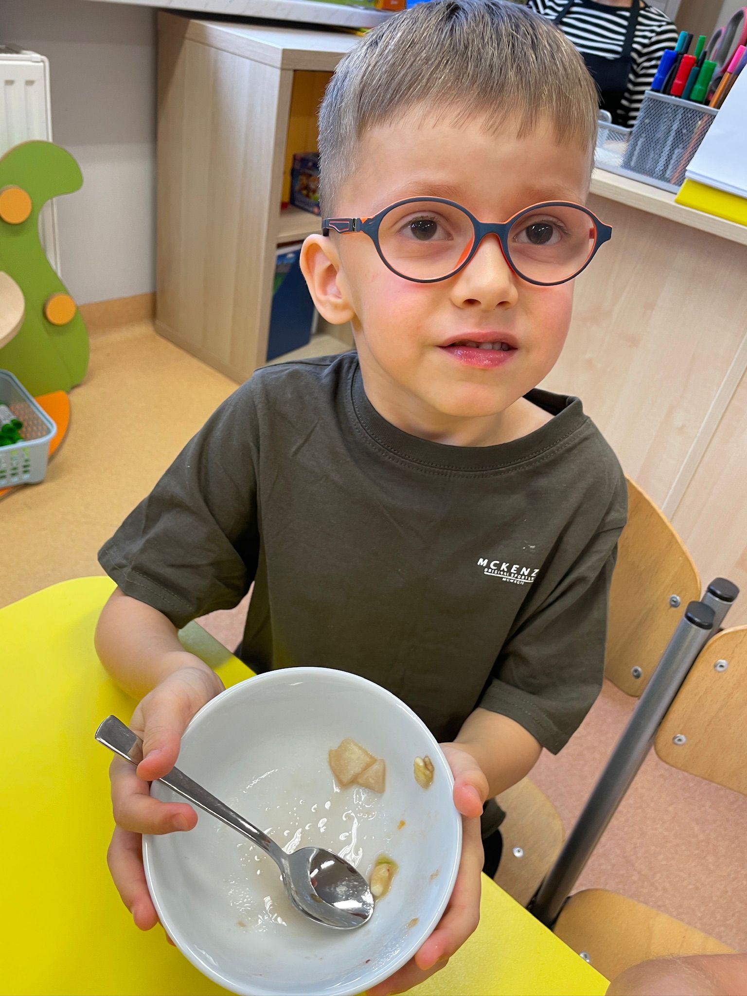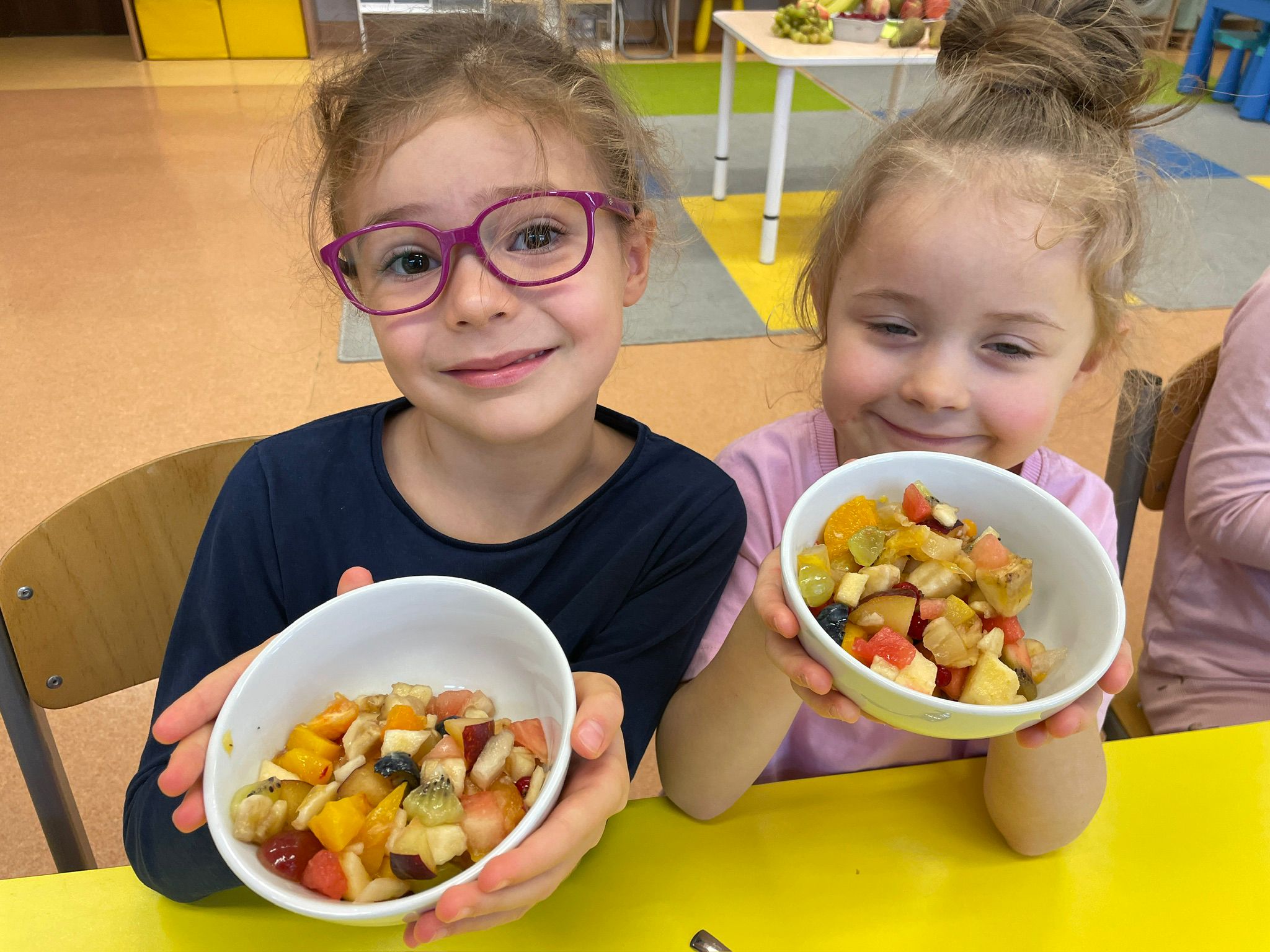 Jesień wielu kojarzy się z deszczową pogodą i szarugą. Ale w naszym przedszkolu udowodniliśmy już wiele razy, że ta pora roku potrafi być również niezwykle kolorowa. A co, jeśli kolory miałyby również smak i zapach? Realizując projekt edukacyjny „Smaki jesieni” , podczas jesiennych atrakcji kulinarnych w gr. XI przedszkolaki sprawdziły, że kolorowe warzywa i owoce, również te sezonowe, smakują i pachną wyśmienicie. Szczególnie jeśli się je ze sobą połączy. Wszyscy podkreślaliśmy walory zdrowotne owoców i warzyw. W ten oto sposób powstały zdrowe sałatki pełne pięknych barw, które przedszkolaki mogły samodzielnie spałaszować.