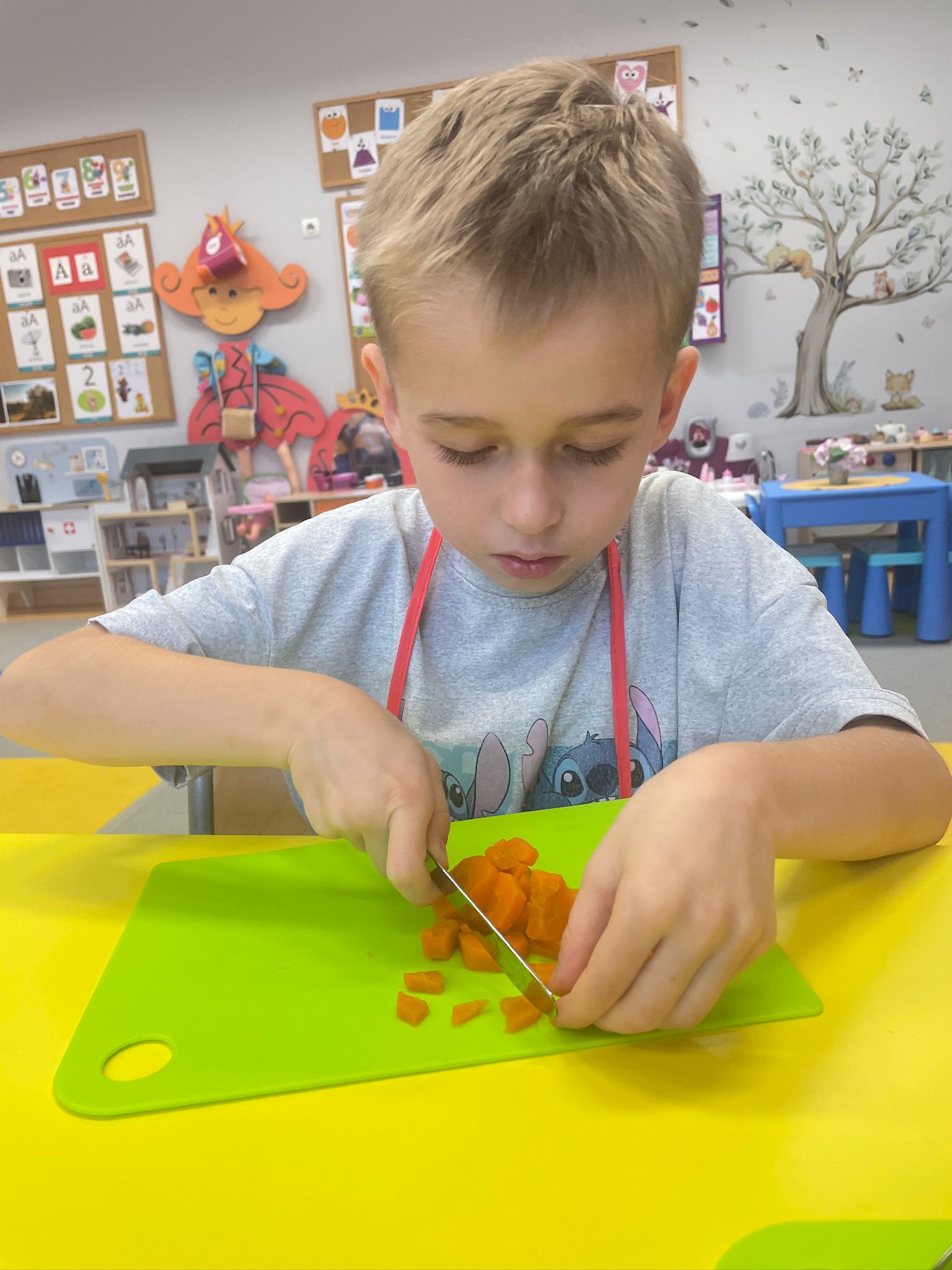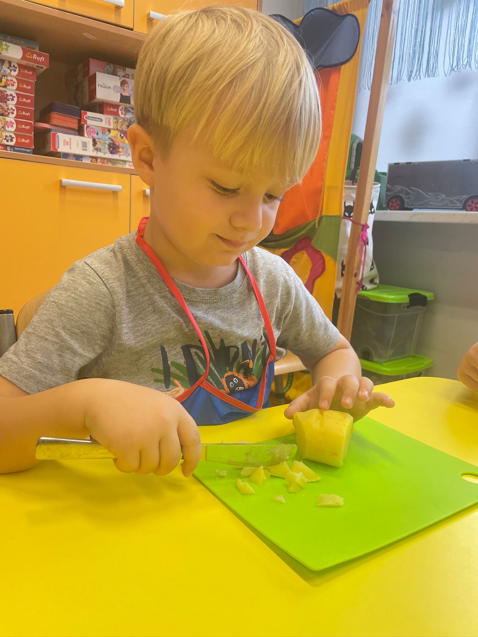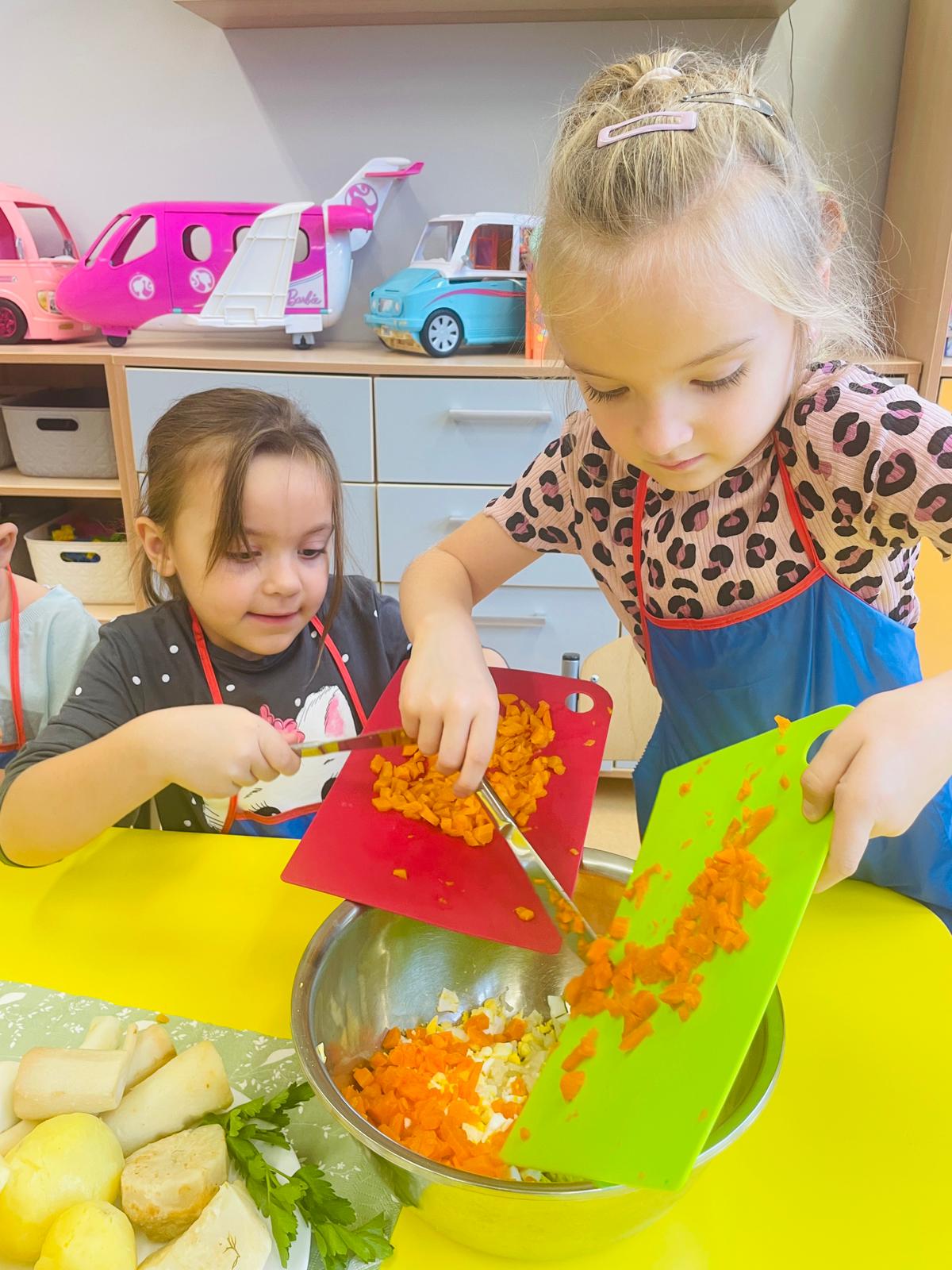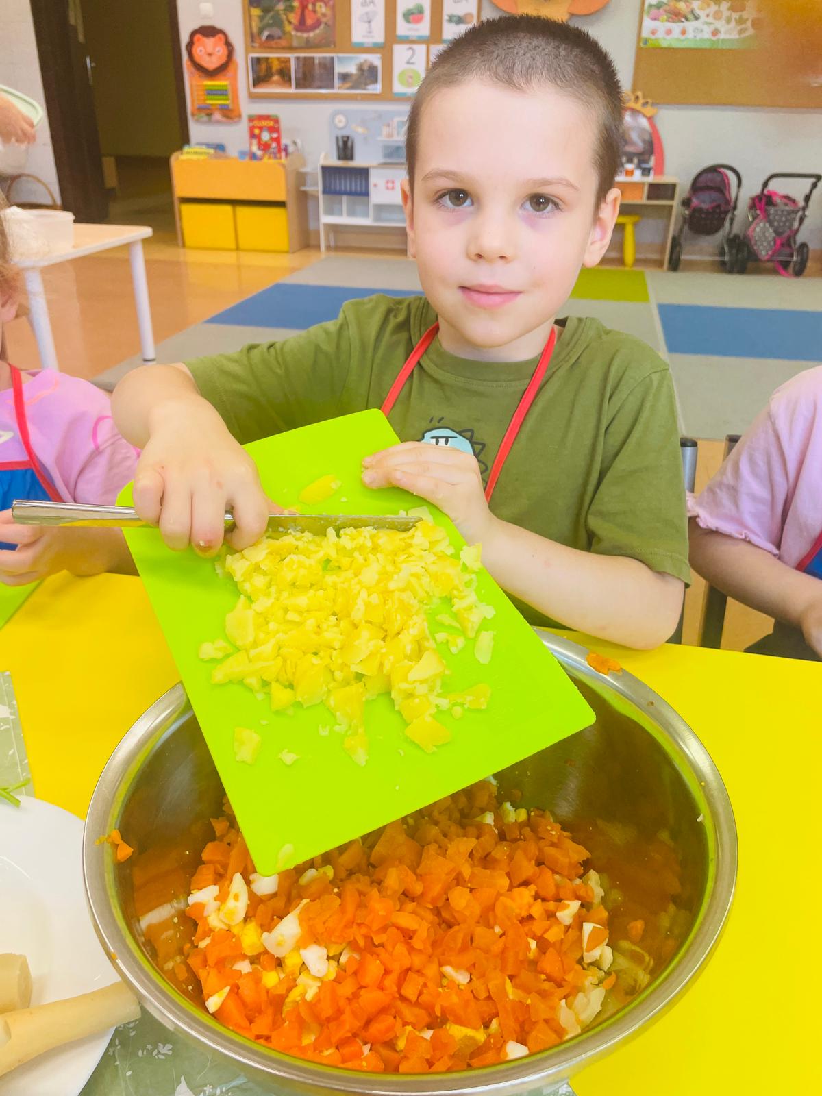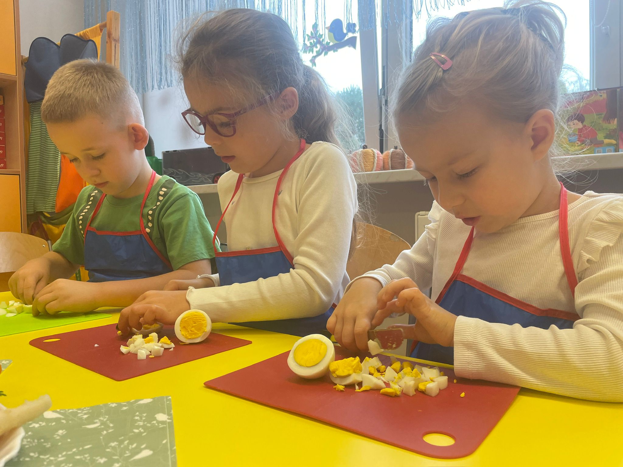 Jesień wielu kojarzy się z deszczową pogodą i szarugą. Ale w naszym przedszkolu udowodniliśmy już wiele razy, że ta pora roku potrafi być również niezwykle kolorowa. A co, jeśli kolory miałyby również smak i zapach? Realizując projekt edukacyjny „Smaki jesieni” , podczas jesiennych atrakcji kulinarnych w gr. XI przedszkolaki sprawdziły, że kolorowe warzywa i owoce, również te sezonowe, smakują i pachną wyśmienicie. Szczególnie jeśli się je ze sobą połączy. Wszyscy podkreślaliśmy walory zdrowotne owoców i warzyw. W ten oto sposób powstały zdrowe sałatki pełne pięknych barw, które przedszkolaki mogły samodzielnie spałaszować.