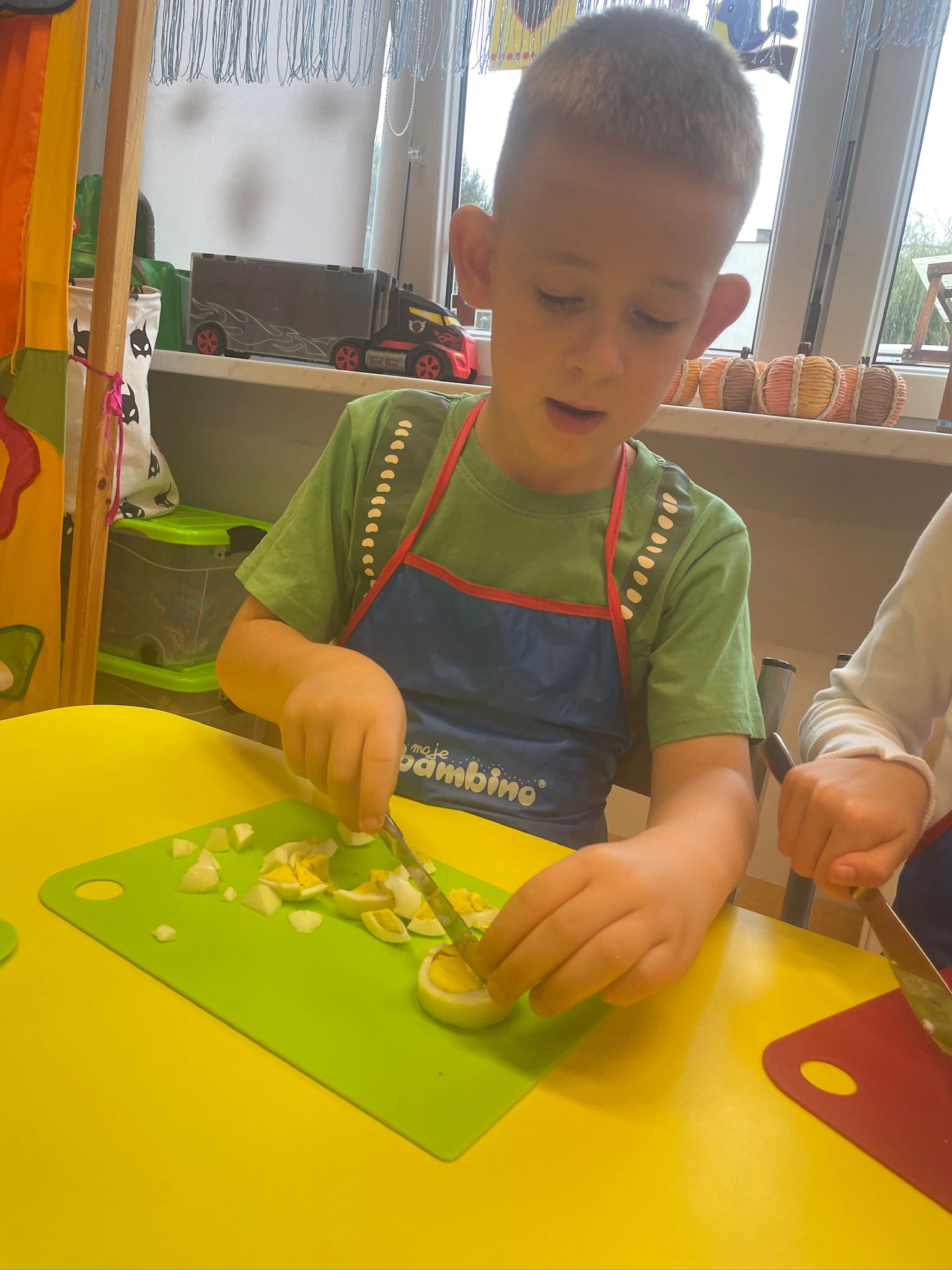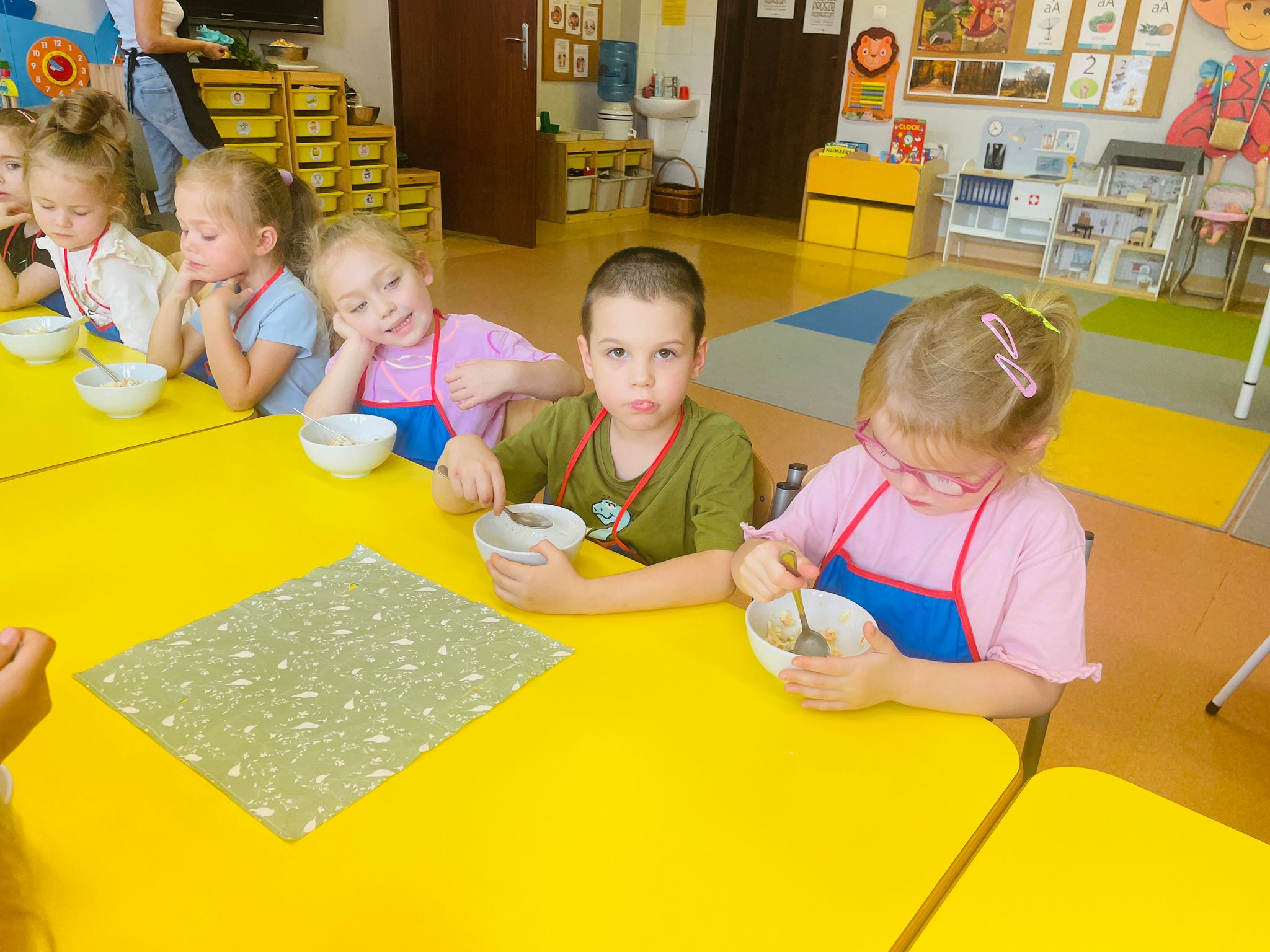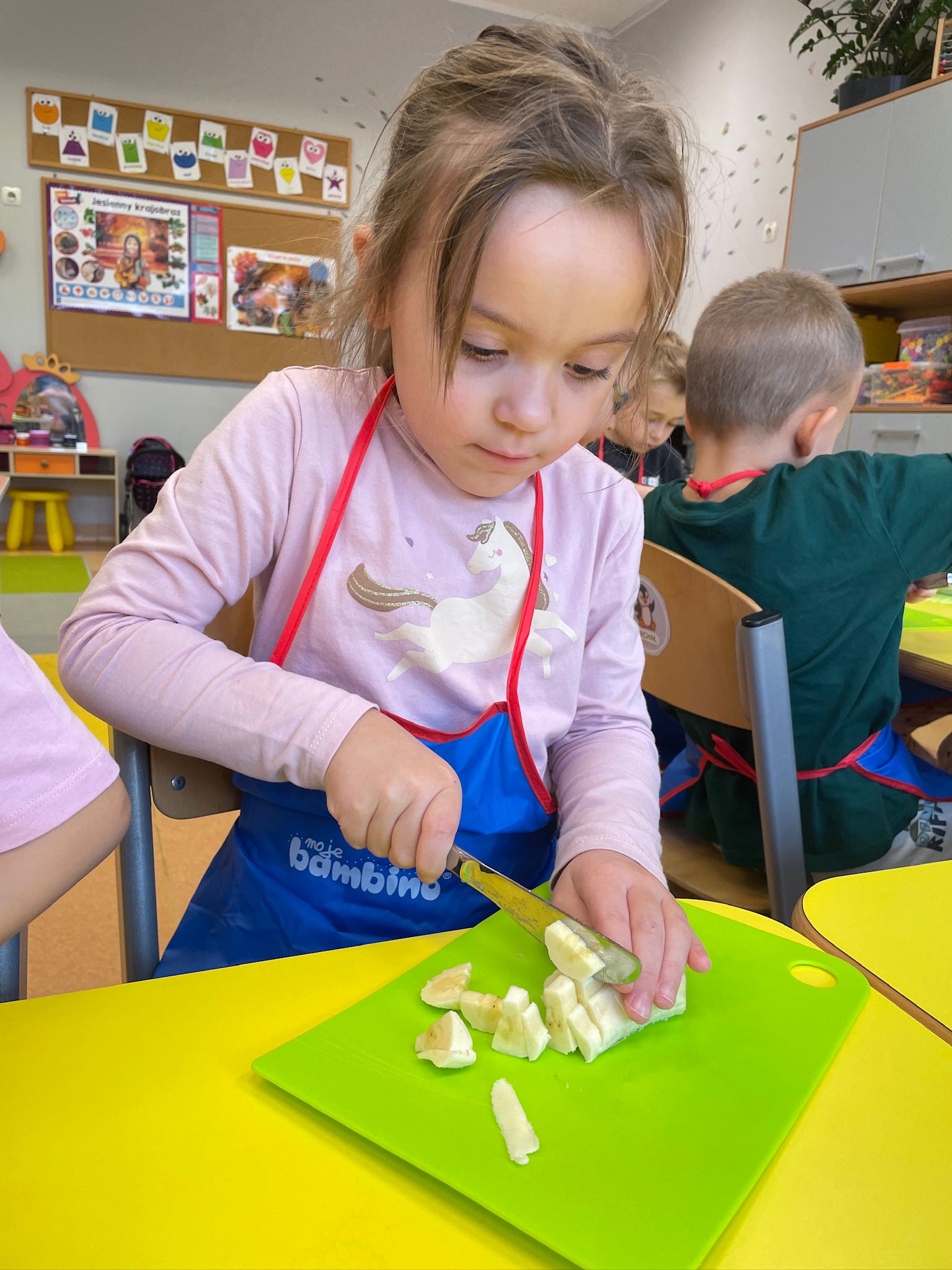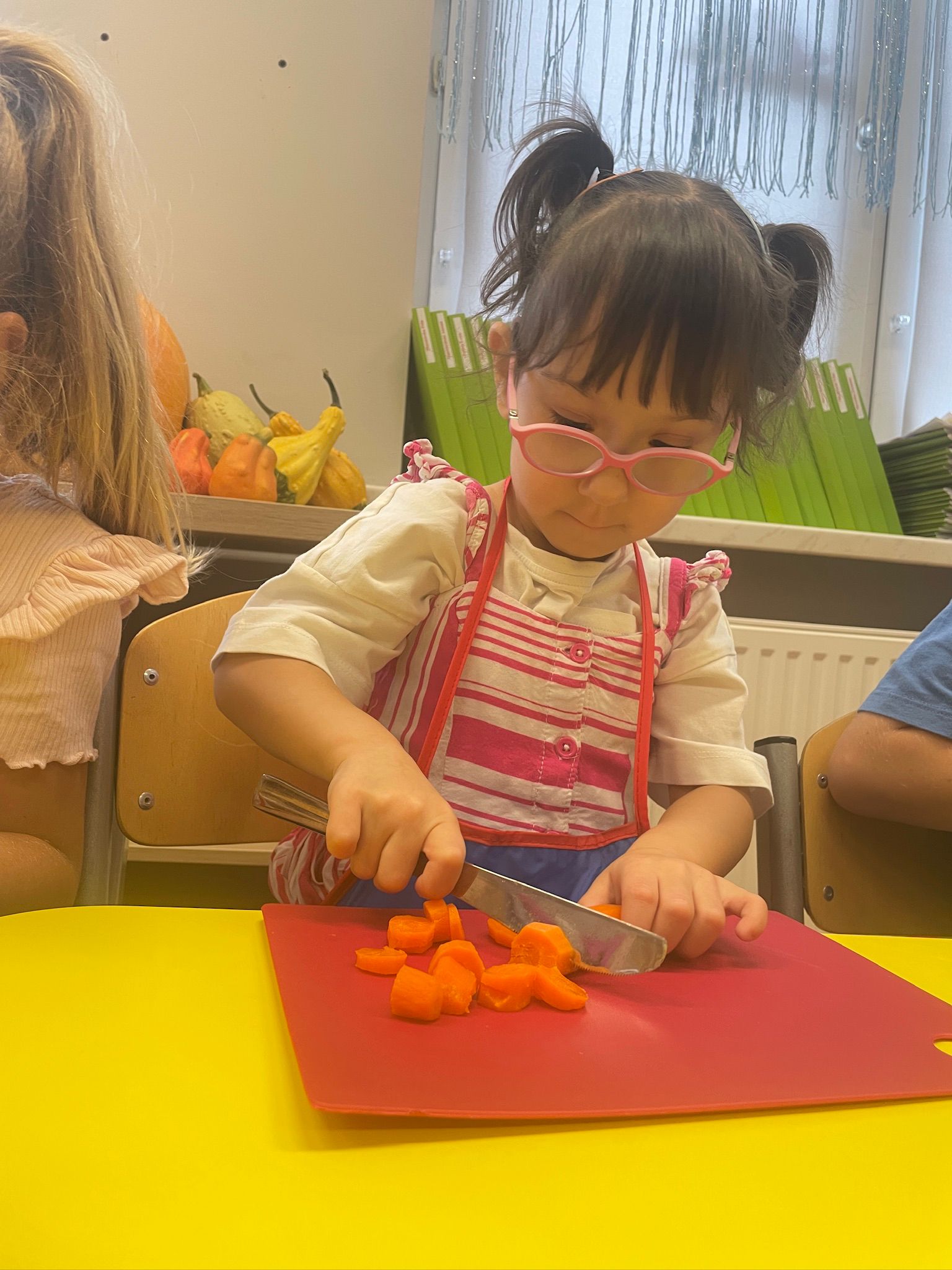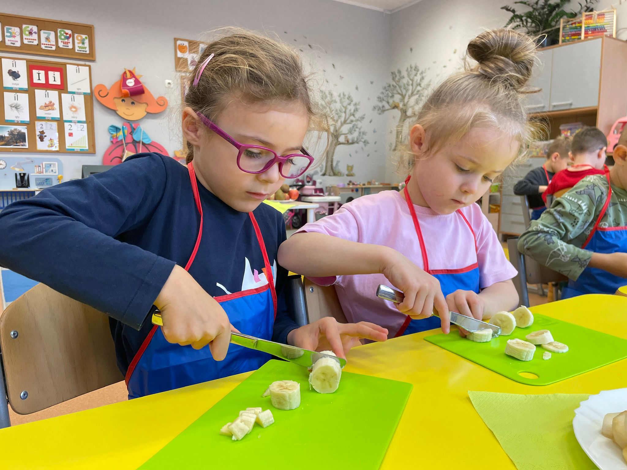 Jesień wielu kojarzy się z deszczową pogodą i szarugą. Ale w naszym przedszkolu udowodniliśmy już wiele razy, że ta pora roku potrafi być również niezwykle kolorowa. A co, jeśli kolory miałyby również smak i zapach? Realizując projekt edukacyjny „Smaki jesieni” , podczas jesiennych atrakcji kulinarnych w gr. XI przedszkolaki sprawdziły, że kolorowe warzywa i owoce, również te sezonowe, smakują i pachną wyśmienicie. Szczególnie jeśli się je ze sobą połączy. Wszyscy podkreślaliśmy walory zdrowotne owoców i warzyw. W ten oto sposób powstały zdrowe sałatki pełne pięknych barw, które przedszkolaki mogły samodzielnie spałaszować.
