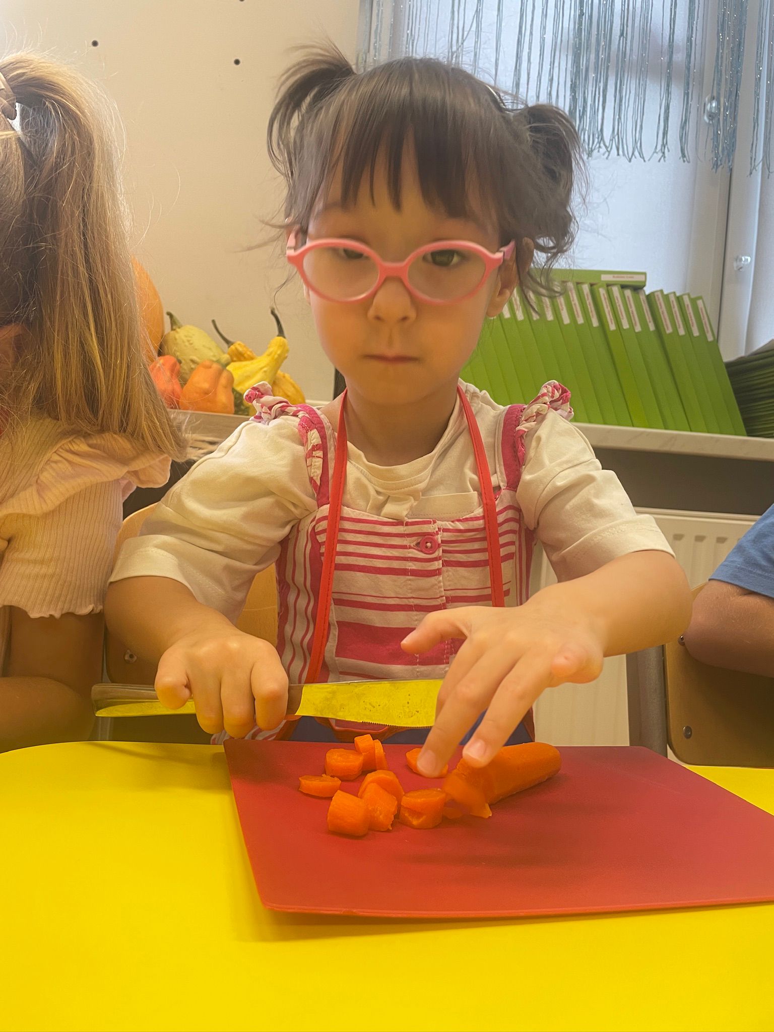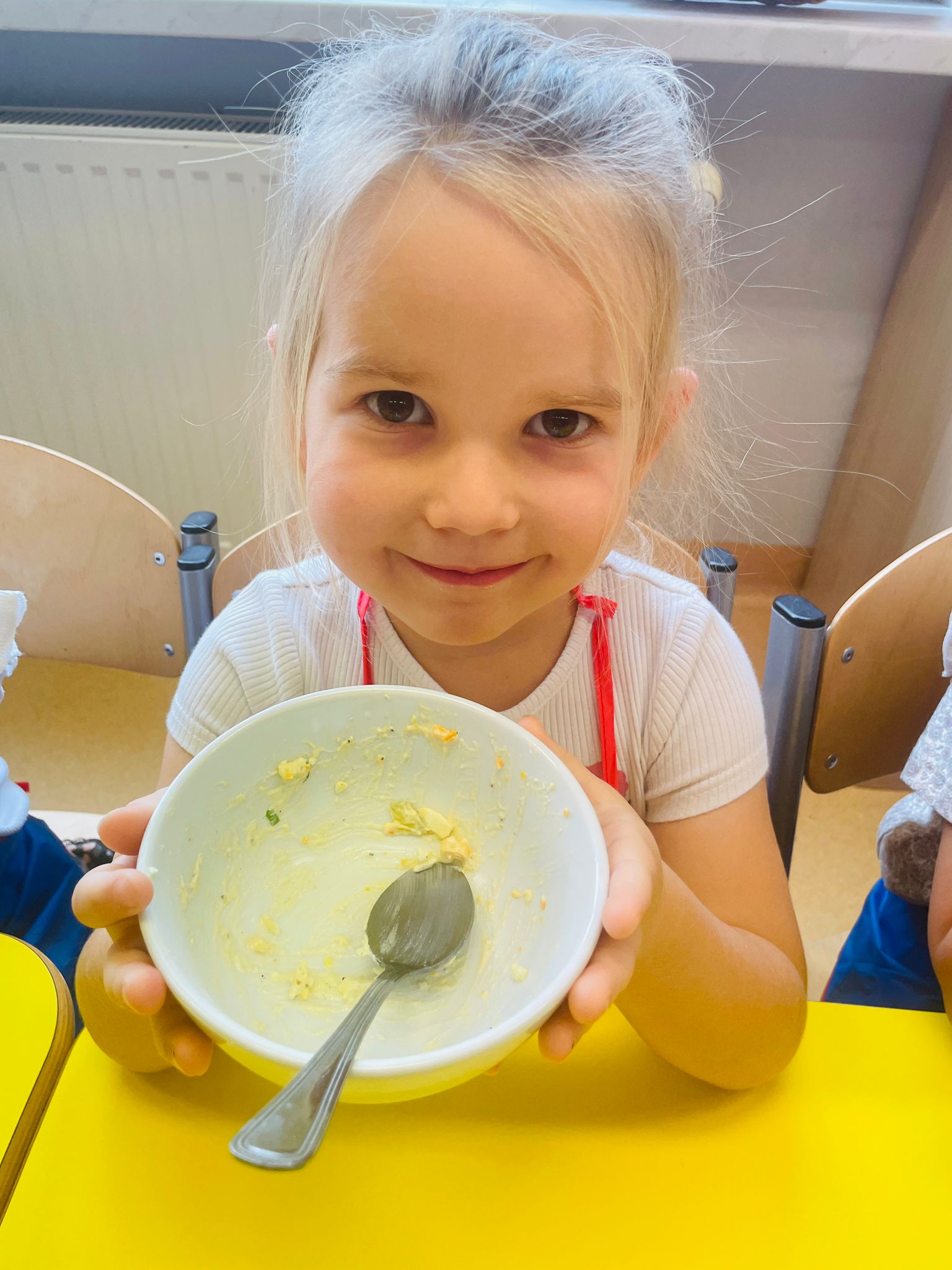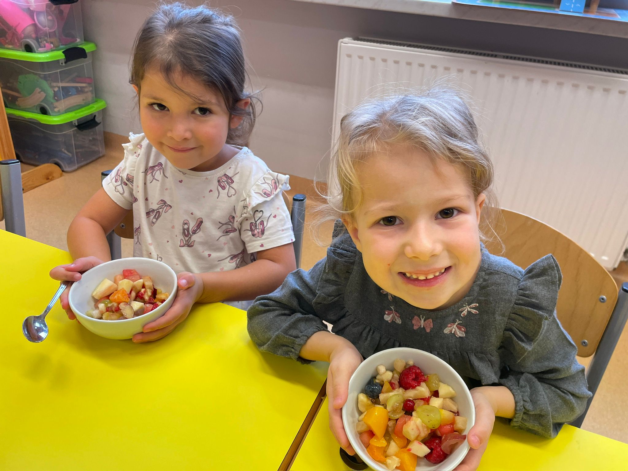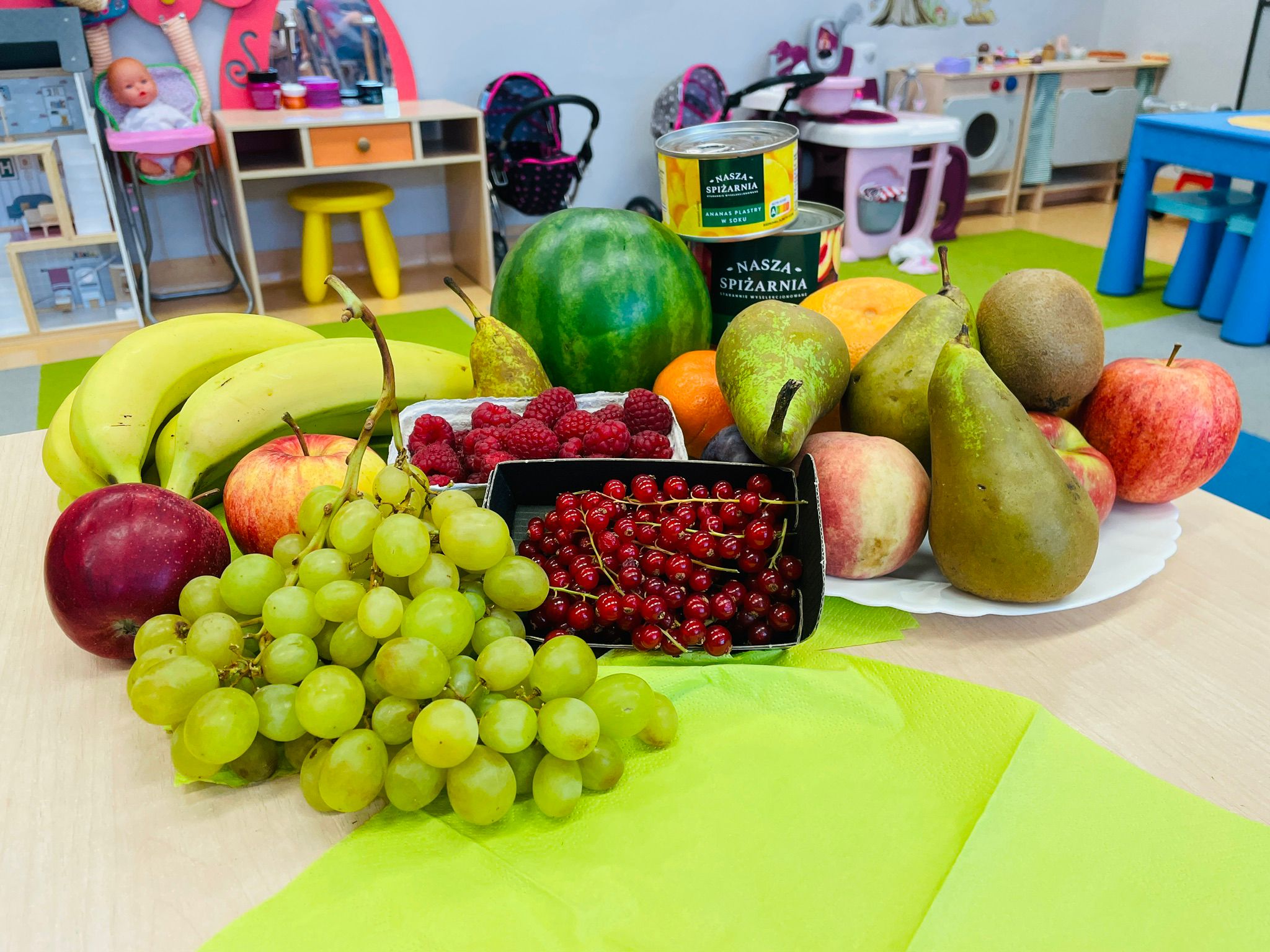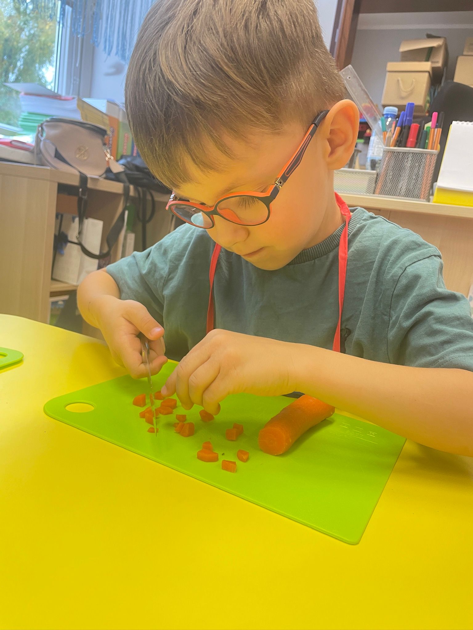 Jesień wielu kojarzy się z deszczową pogodą i szarugą. Ale w naszym przedszkolu udowodniliśmy już wiele razy, że ta pora roku potrafi być również niezwykle kolorowa. A co, jeśli kolory miałyby również smak i zapach? Realizując projekt edukacyjny „Smaki jesieni” , podczas jesiennych atrakcji kulinarnych w gr. XI przedszkolaki sprawdziły, że kolorowe warzywa i owoce, również te sezonowe, smakują i pachną wyśmienicie. Szczególnie jeśli się je ze sobą połączy. Wszyscy podkreślaliśmy walory zdrowotne owoców i warzyw. W ten oto sposób powstały zdrowe sałatki pełne pięknych barw, które przedszkolaki mogły samodzielnie spałaszować.