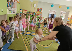 W czerwcu grupa I i II spotkały się na niezwykłych sportowych zmaganiach. Sojusz metod pomysłem na aktywność fizyczną wśród przedszkolaków- pod takim hasłem dzieci z grup młodszych integrowały się podczas zajęć sportowych z wykorzystaniem wielu metod. Główną bazą pierwszych zajęć sportowych była Metoda Ruchu Rozwijającego Weroniki Sherborne oraz relaksacja wg Marty Bogdanowicz, natomiast na kolejnych zajęciach prym wiodła metoda opowieści ruchowej Józefa Gotfryda Thulina wraz z elementami metody Paula Dennisona, i treningu relaksacyjnego Jacobsona. Poprzez doskonałą zabawę zajęcia miały na celu poprawę koordynacji ruchowej u dzieci, polepszenie czucia własnego ciała i zmysłu propioceptywnego a także lepszą orientację w schemacie własnego ciała. Nieoczywiste połączenie tak wielu metod pracy powoduje ciekawe urozmaicenie zajęć, a dodatkowa atrakcja w postaci połączenia grup potęguje zainteresowanie i chęć uczestnictwa w proponowanej aktywności. Jest to wyzwanie dla nauczycieli i dzieci, ale z chęcią czekamy na ciąg dalszy w nowym roku szkolnym.