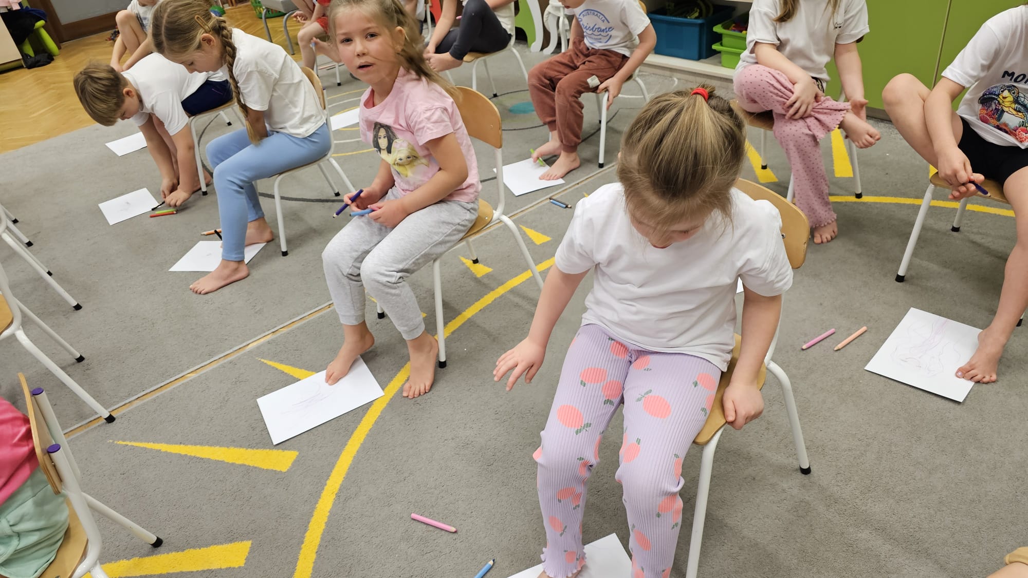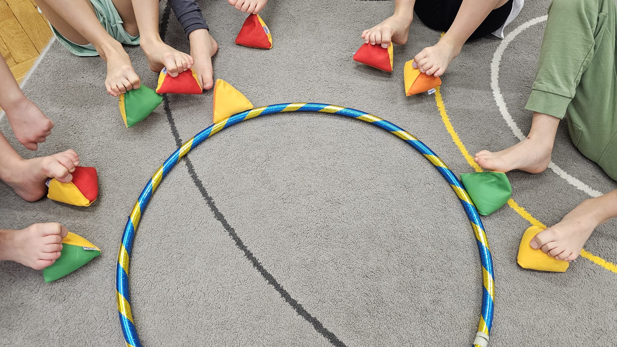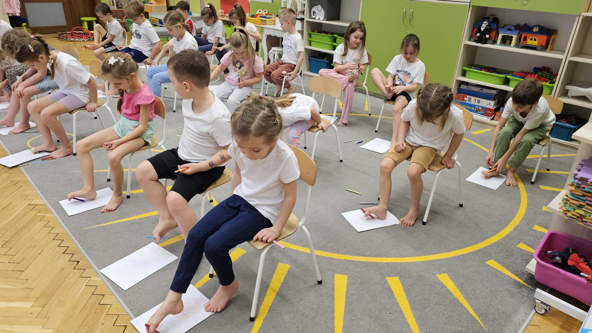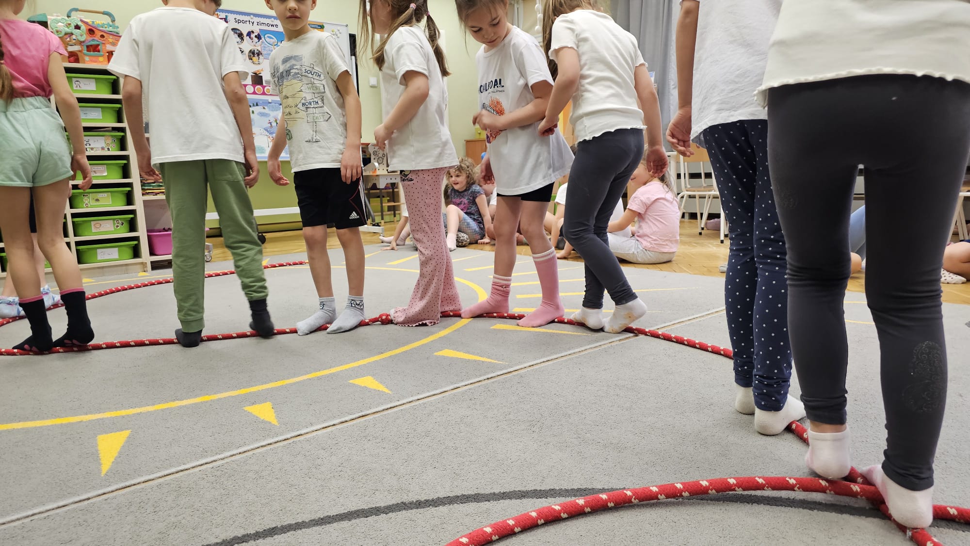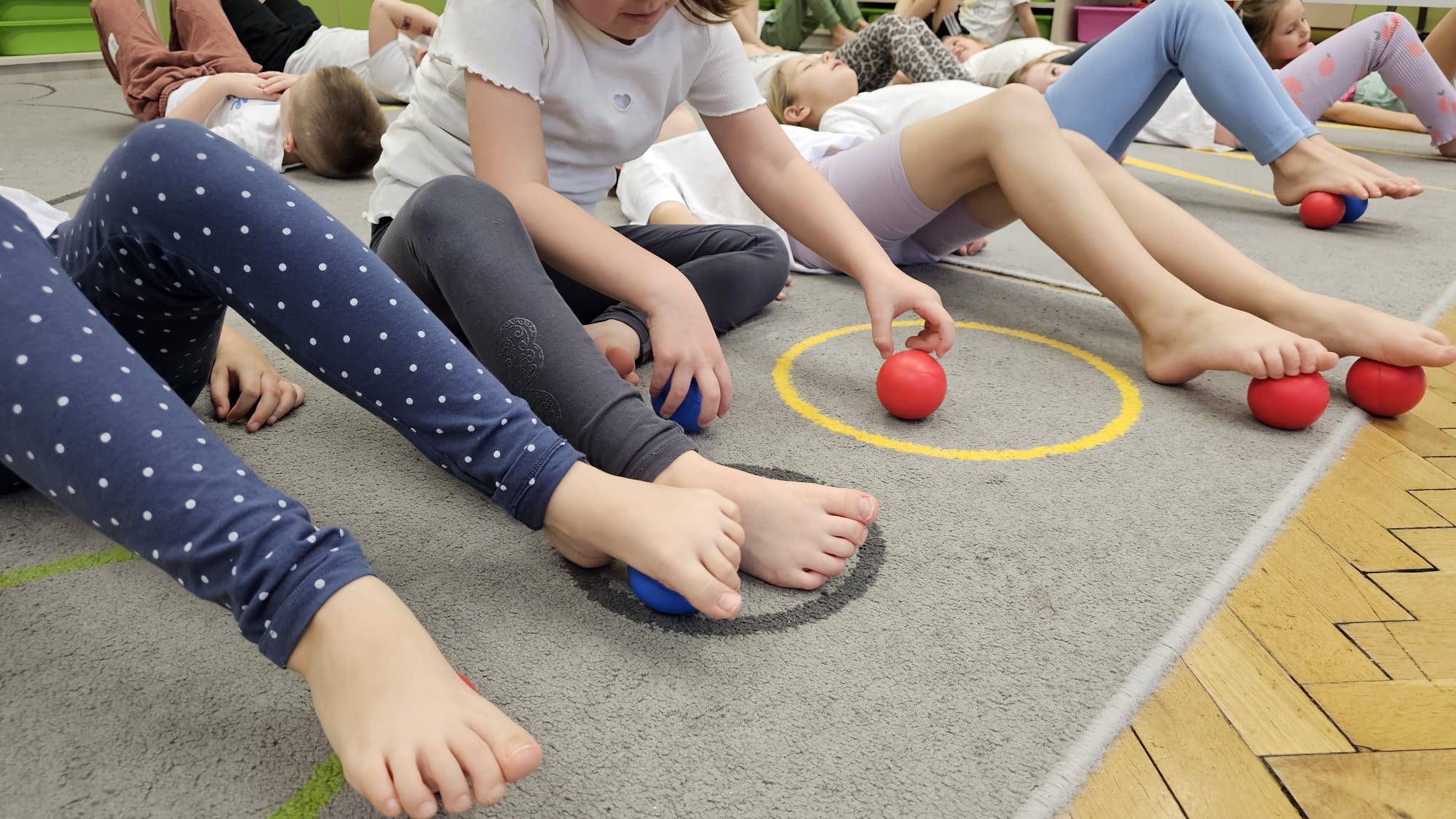 W oczekiwaniu na bardziej sprzyjającą aurę, by bezpiecznie uprawiać Nordic Walking w terenie, grupa IV starszaków nie próżnuje, ale ćwiczy i wzmacnia poszczególne grupy mięśniowe. Tym razem jest to stopa – bardzo ważna część, bo to przecież podstawa całego ciała. To ona jako pierwsza styka się z podłożem i przenosi ciężar na wyższe partie układu ruchu. Prawidłowo wykształcone mięśnie i sklepienia stopy zapewniają amortyzację, stabilność oraz właściwe ustawienie nóg, miednicy i kręgosłupa. Regularne ćwiczenia stóp mają bardzo duże znaczenie w przygotowaniu i prawidłowym uprawianiu Nordic Walkingu, ponieważ stopa stanowi podstawę całego łańcucha ruchu podczas marszu z kijkami. Wzmocnione mięśnie stóp zapewniają lepszą stabilizację i amortyzację, co pozwala na prawidłowe przetaczanie stopy od pięty do palców. Dzięki temu krok staje się dłuższy, bardziej sprężysty i ekonomiczny, a odbicie z palców skuteczniejsze, co bezpośrednio wpływa na tempo marszu i pracę kończyn górnych z kijkami. Dobra sprawność stóp poprawia równowagę i kontrolę postawy, szczególnie na nierównym podłożu, które często występuje podczas marszu w terenie. Zmniejsza to ryzyko przeciążeń stawów skokowych, kolan i kręgosłupa oraz zapobiega urazom. Prawidłowo funkcjonujące sklepienia stopy wspomagają stabilne ustawienie kończyn dolnych i miednicy, co umożliwia zachowanie wyprostowanej sylwetki, aktywnej pracy tułowia i efektywnej współpracy rąk z kijami. W efekcie Nordic Walking staje się bardziej płynny, bezpieczny i korzystny dla całego układu ruchu. Mając to wszystko na uwadze dzieci z ochotą i dużym zaangażowaniem wykonywały zaproponowane im ćwiczenia i zabawy czerpiąc radość oraz satysfakcję.