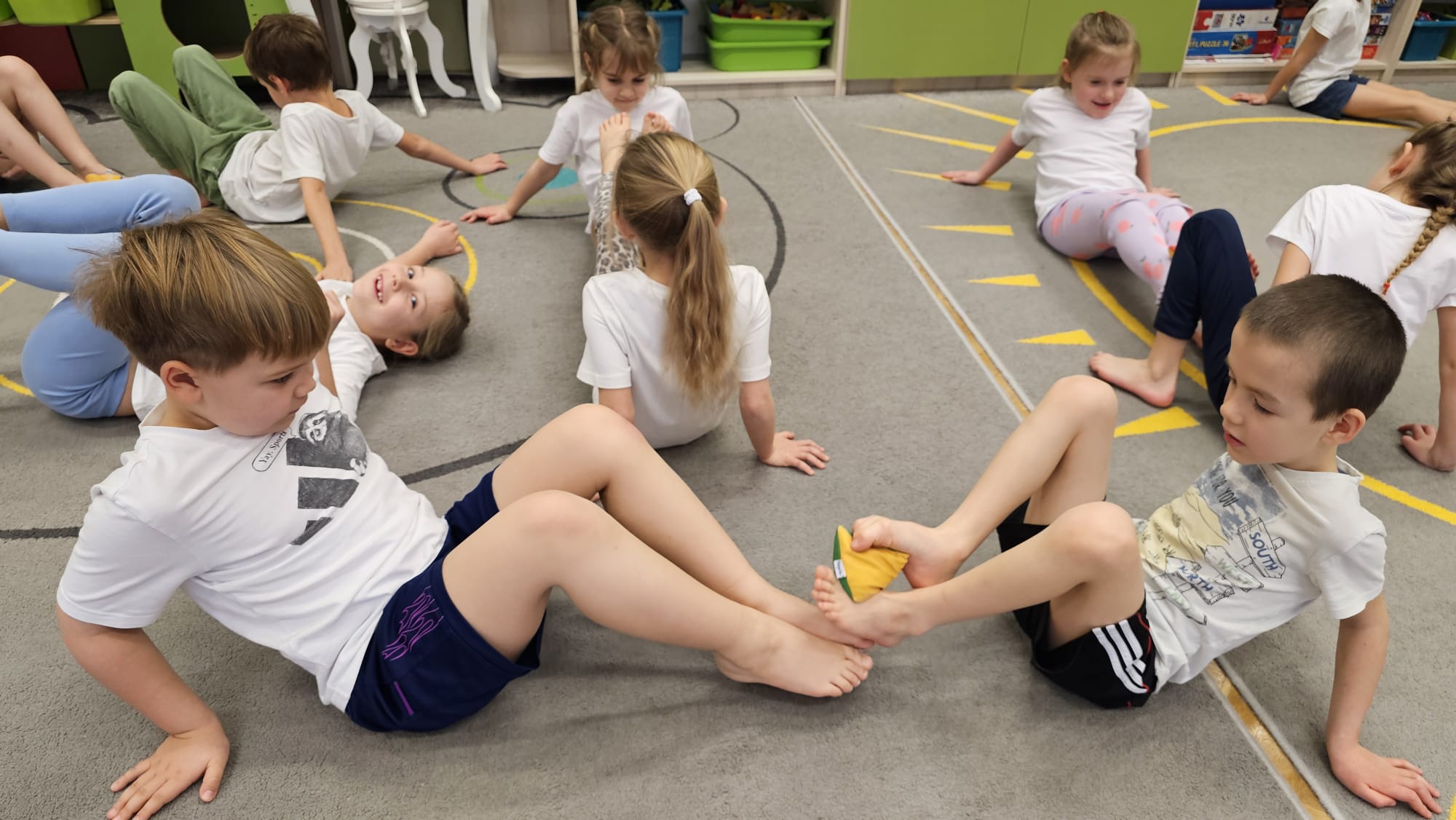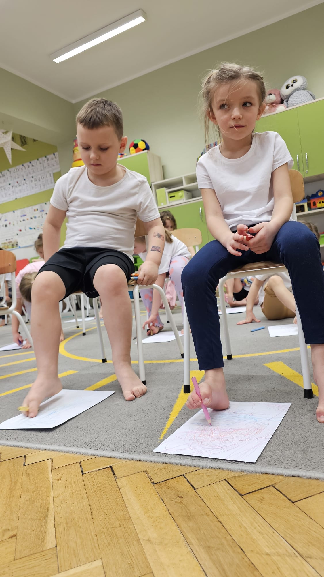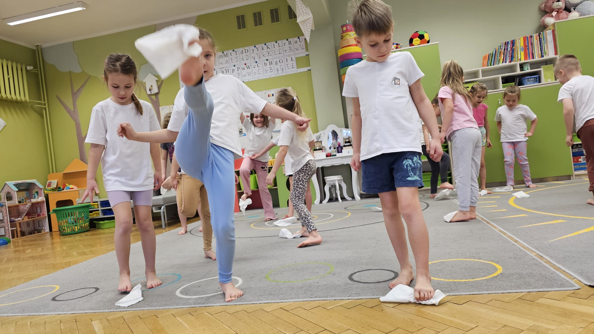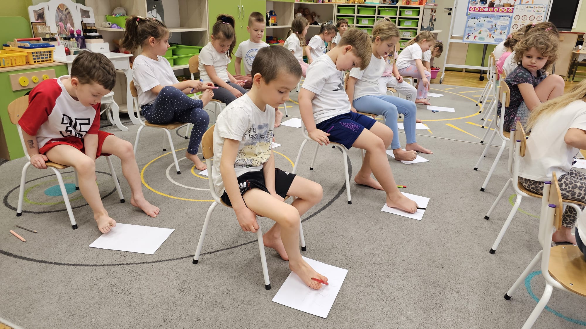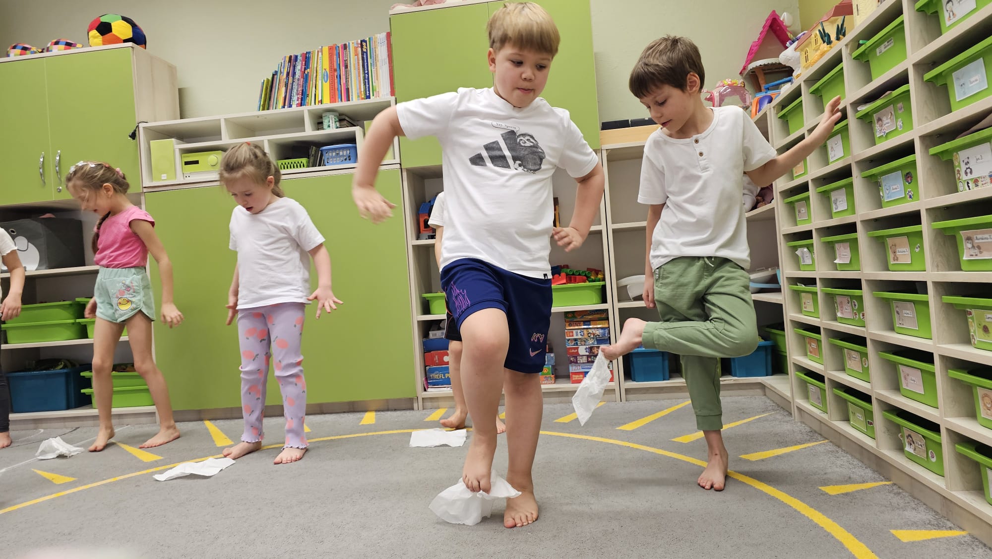 W oczekiwaniu na bardziej sprzyjającą aurę, by bezpiecznie uprawiać Nordic Walking w terenie, grupa IV starszaków nie próżnuje, ale ćwiczy i wzmacnia poszczególne grupy mięśniowe. Tym razem jest to stopa – bardzo ważna część, bo to przecież podstawa całego ciała. To ona jako pierwsza styka się z podłożem i przenosi ciężar na wyższe partie układu ruchu. Prawidłowo wykształcone mięśnie i sklepienia stopy zapewniają amortyzację, stabilność oraz właściwe ustawienie nóg, miednicy i kręgosłupa. Regularne ćwiczenia stóp mają bardzo duże znaczenie w przygotowaniu i prawidłowym uprawianiu Nordic Walkingu, ponieważ stopa stanowi podstawę całego łańcucha ruchu podczas marszu z kijkami. Wzmocnione mięśnie stóp zapewniają lepszą stabilizację i amortyzację, co pozwala na prawidłowe przetaczanie stopy od pięty do palców. Dzięki temu krok staje się dłuższy, bardziej sprężysty i ekonomiczny, a odbicie z palców skuteczniejsze, co bezpośrednio wpływa na tempo marszu i pracę kończyn górnych z kijkami. Dobra sprawność stóp poprawia równowagę i kontrolę postawy, szczególnie na nierównym podłożu, które często występuje podczas marszu w terenie. Zmniejsza to ryzyko przeciążeń stawów skokowych, kolan i kręgosłupa oraz zapobiega urazom. Prawidłowo funkcjonujące sklepienia stopy wspomagają stabilne ustawienie kończyn dolnych i miednicy, co umożliwia zachowanie wyprostowanej sylwetki, aktywnej pracy tułowia i efektywnej współpracy rąk z kijami. W efekcie Nordic Walking staje się bardziej płynny, bezpieczny i korzystny dla całego układu ruchu. Mając to wszystko na uwadze dzieci z ochotą i dużym zaangażowaniem wykonywały zaproponowane im ćwiczenia i zabawy czerpiąc radość oraz satysfakcję.