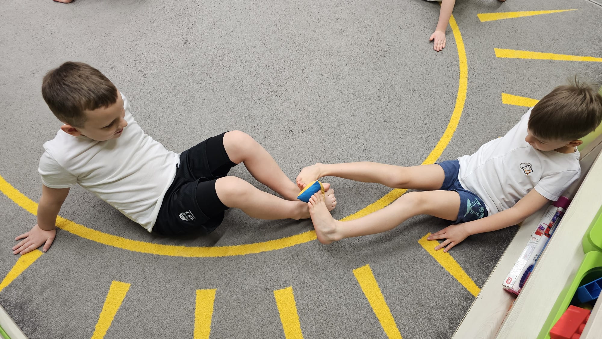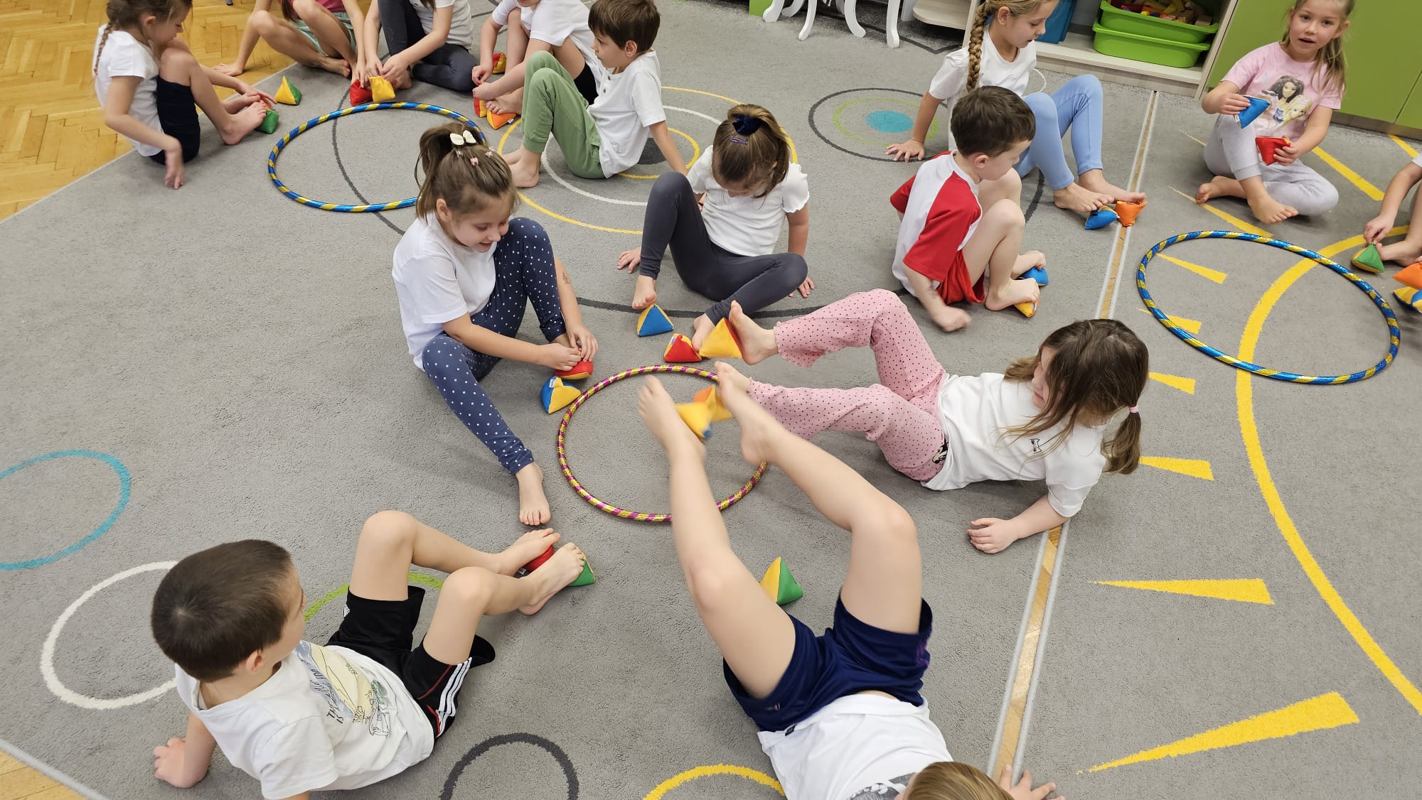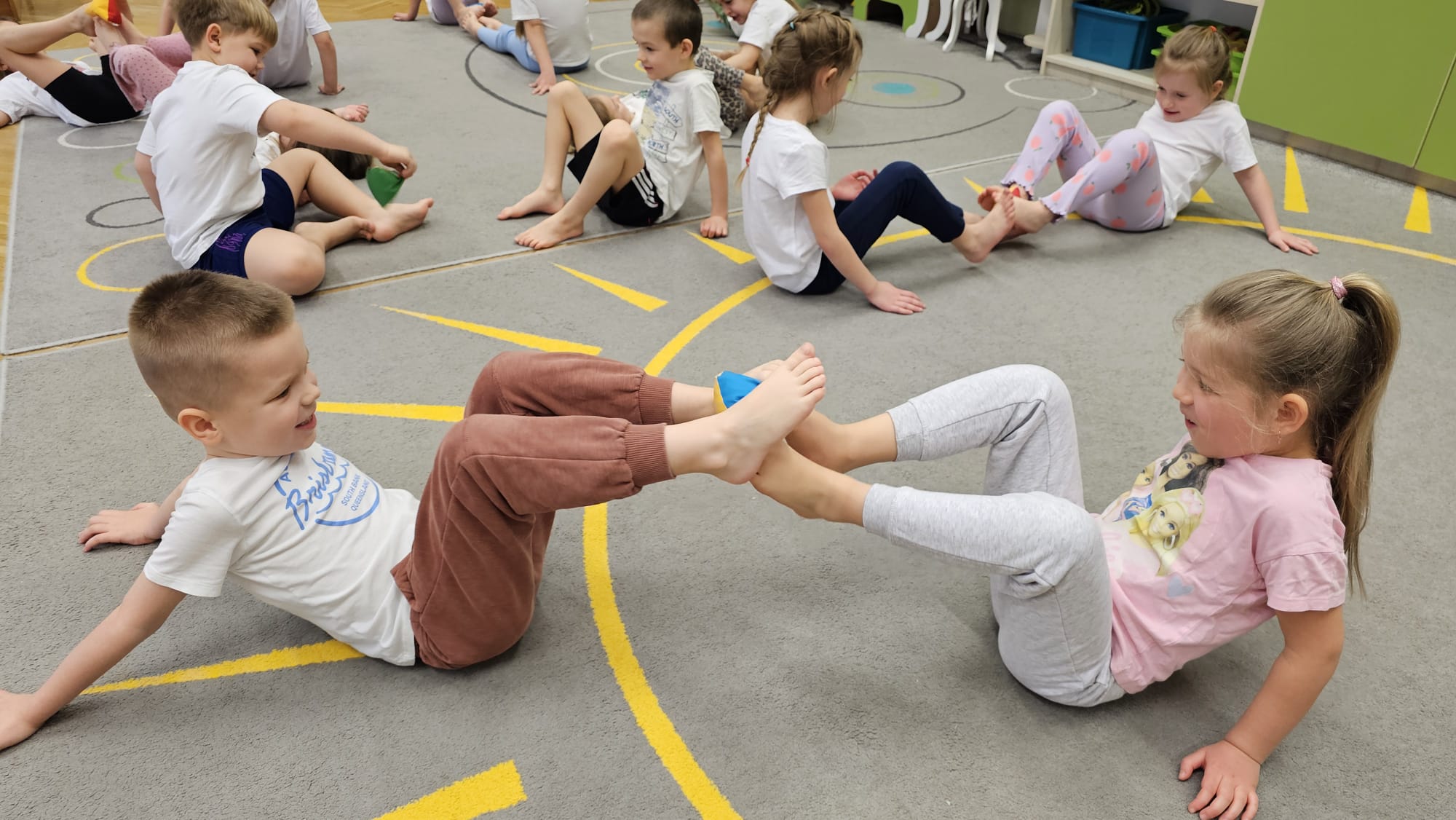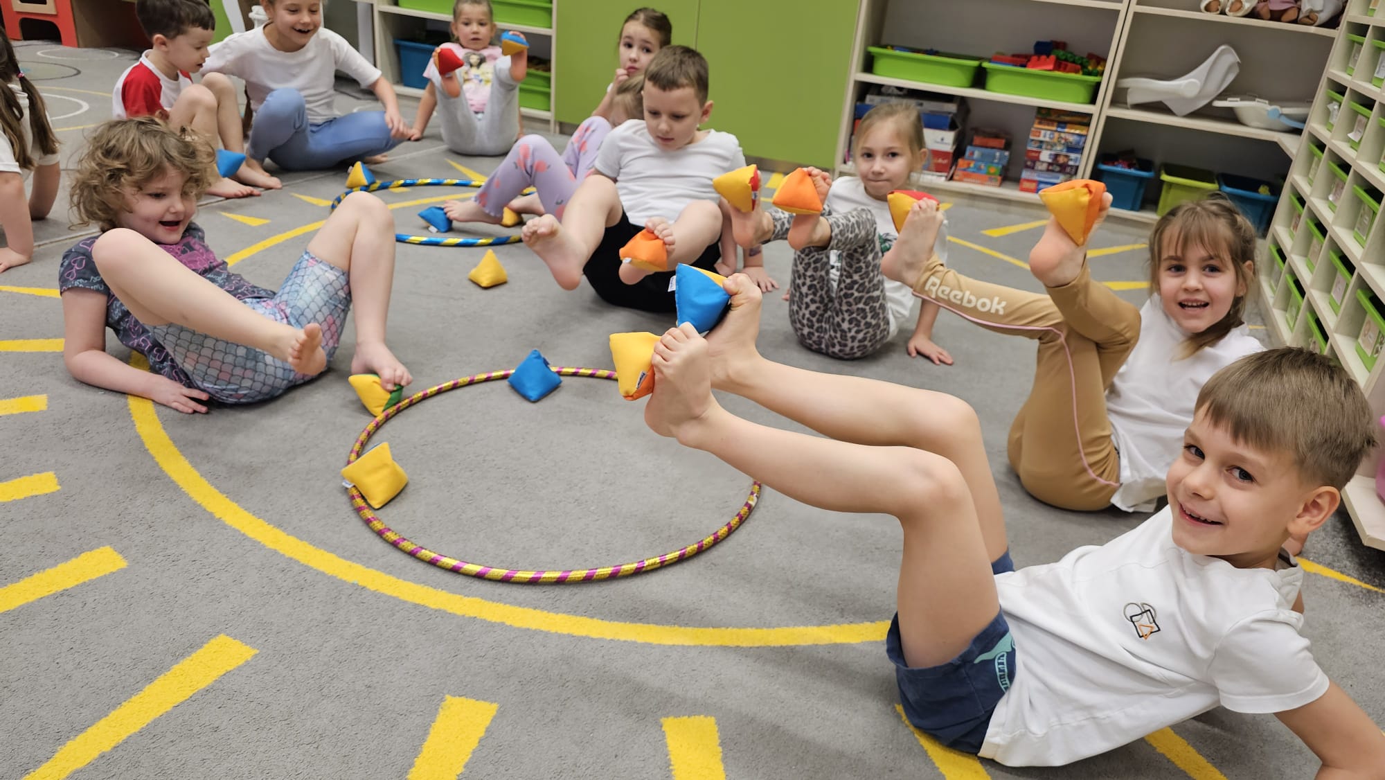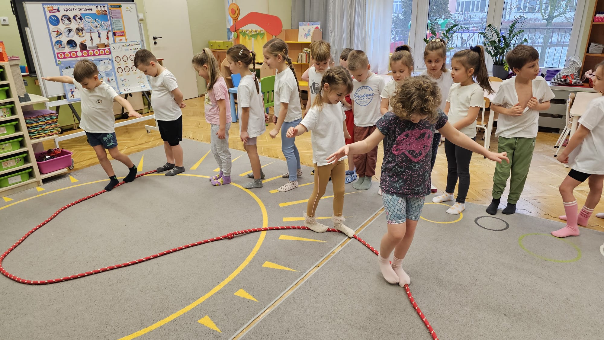 W oczekiwaniu na bardziej sprzyjającą aurę, by bezpiecznie uprawiać Nordic Walking w terenie, grupa IV starszaków nie próżnuje, ale ćwiczy i wzmacnia poszczególne grupy mięśniowe. Tym razem jest to stopa – bardzo ważna część, bo to przecież podstawa całego ciała. To ona jako pierwsza styka się z podłożem i przenosi ciężar na wyższe partie układu ruchu. Prawidłowo wykształcone mięśnie i sklepienia stopy zapewniają amortyzację, stabilność oraz właściwe ustawienie nóg, miednicy i kręgosłupa. Regularne ćwiczenia stóp mają bardzo duże znaczenie w przygotowaniu i prawidłowym uprawianiu Nordic Walkingu, ponieważ stopa stanowi podstawę całego łańcucha ruchu podczas marszu z kijkami. Wzmocnione mięśnie stóp zapewniają lepszą stabilizację i amortyzację, co pozwala na prawidłowe przetaczanie stopy od pięty do palców. Dzięki temu krok staje się dłuższy, bardziej sprężysty i ekonomiczny, a odbicie z palców skuteczniejsze, co bezpośrednio wpływa na tempo marszu i pracę kończyn górnych z kijkami. Dobra sprawność stóp poprawia równowagę i kontrolę postawy, szczególnie na nierównym podłożu, które często występuje podczas marszu w terenie. Zmniejsza to ryzyko przeciążeń stawów skokowych, kolan i kręgosłupa oraz zapobiega urazom. Prawidłowo funkcjonujące sklepienia stopy wspomagają stabilne ustawienie kończyn dolnych i miednicy, co umożliwia zachowanie wyprostowanej sylwetki, aktywnej pracy tułowia i efektywnej współpracy rąk z kijami. W efekcie Nordic Walking staje się bardziej płynny, bezpieczny i korzystny dla całego układu ruchu. Mając to wszystko na uwadze dzieci z ochotą i dużym zaangażowaniem wykonywały zaproponowane im ćwiczenia i zabawy czerpiąc radość oraz satysfakcję.