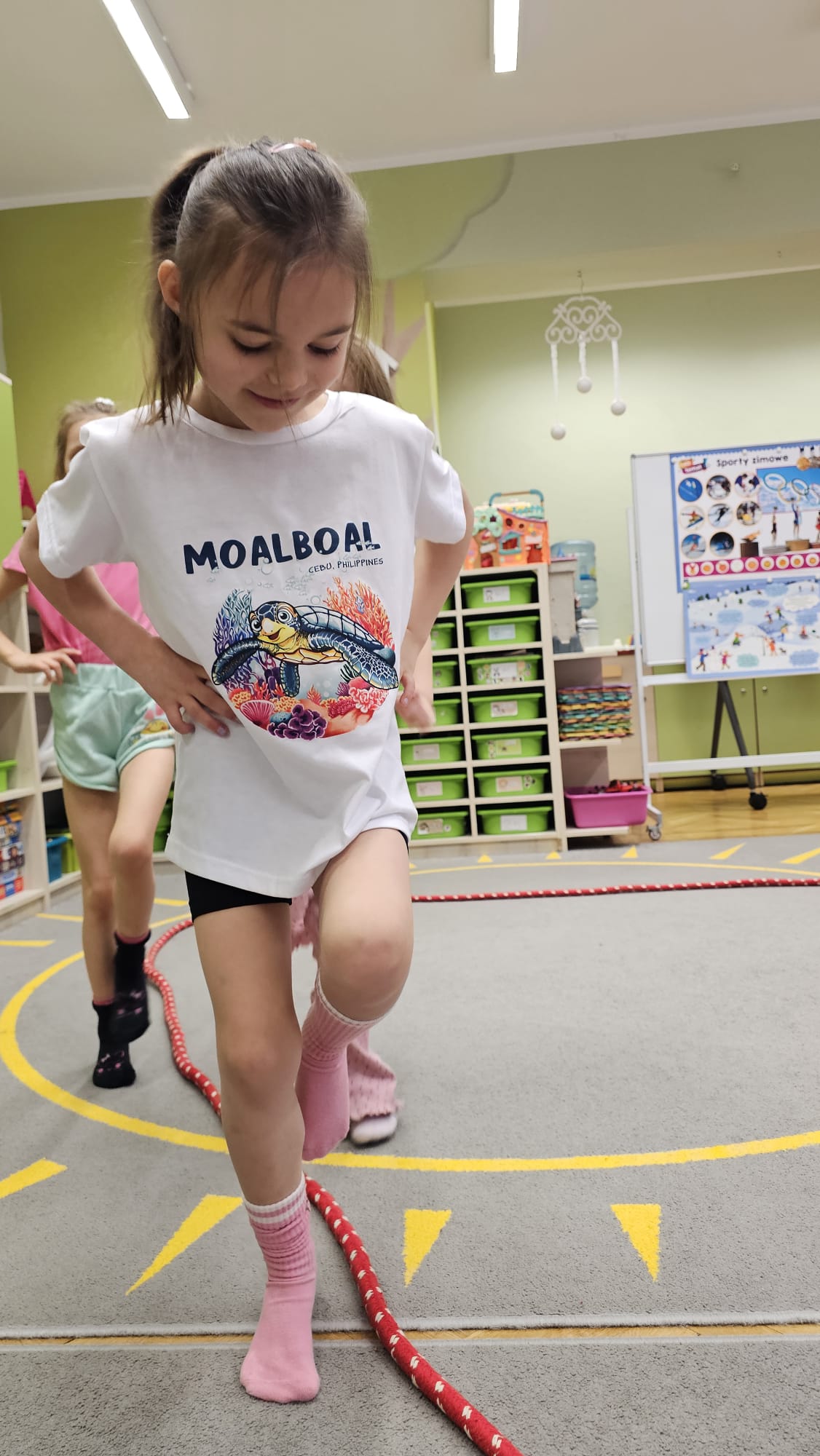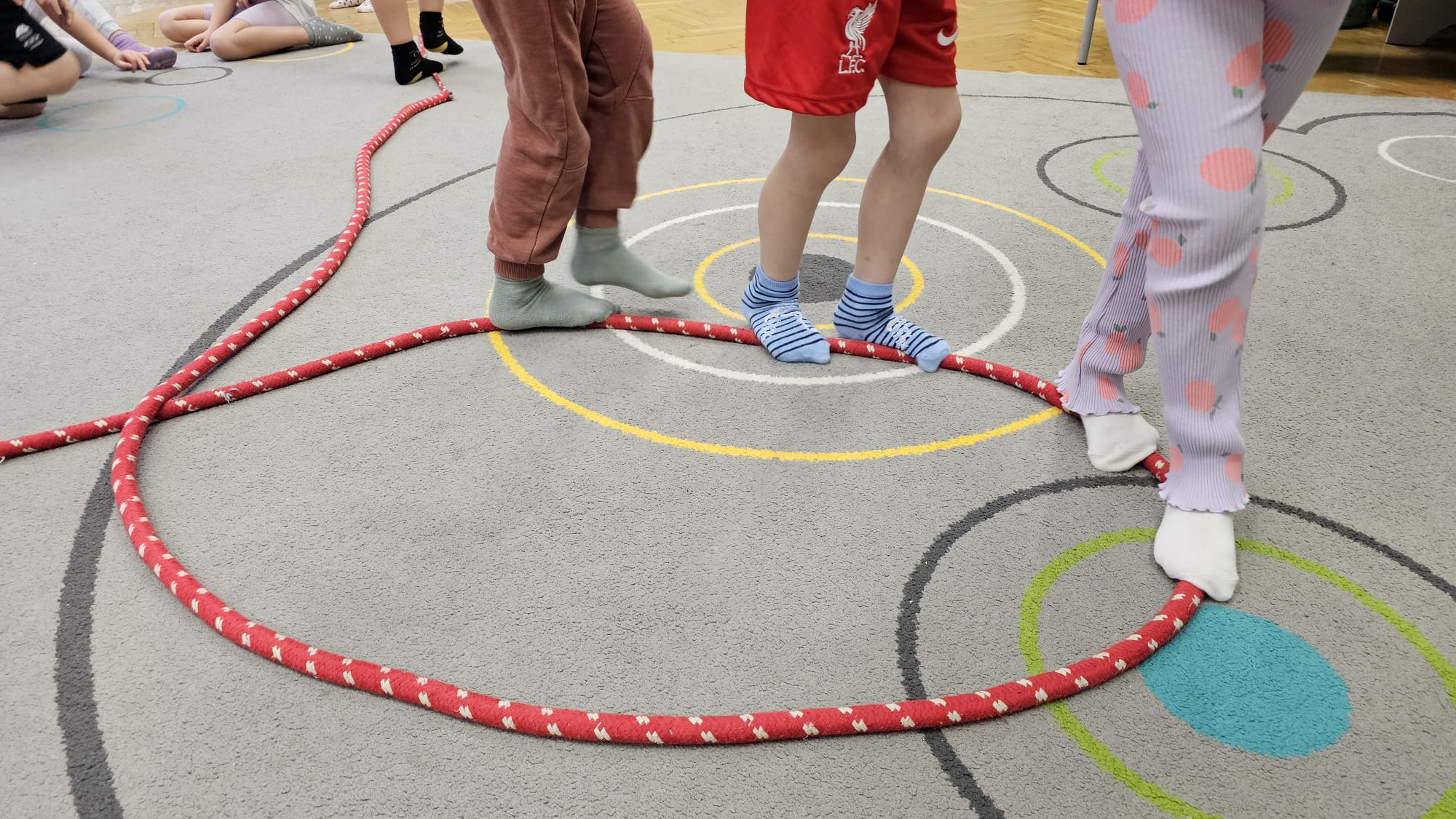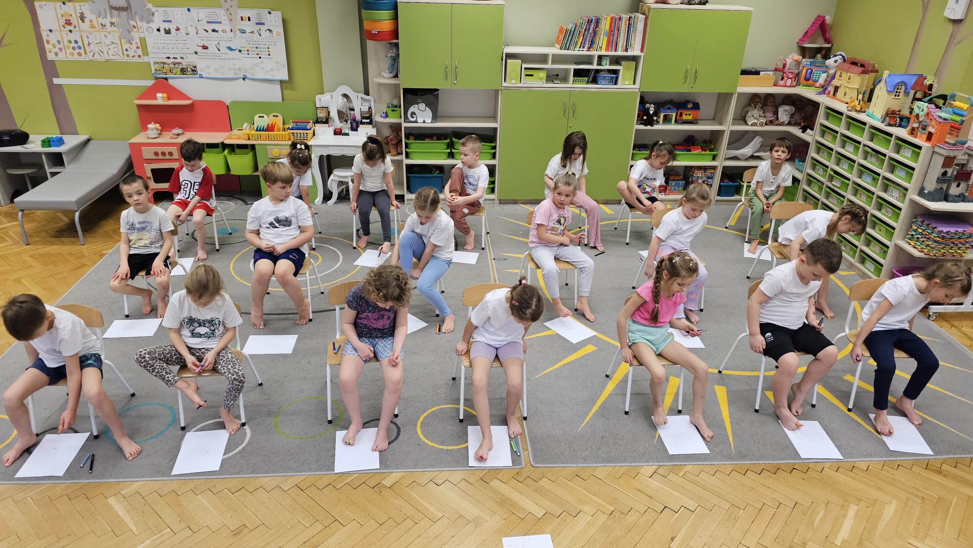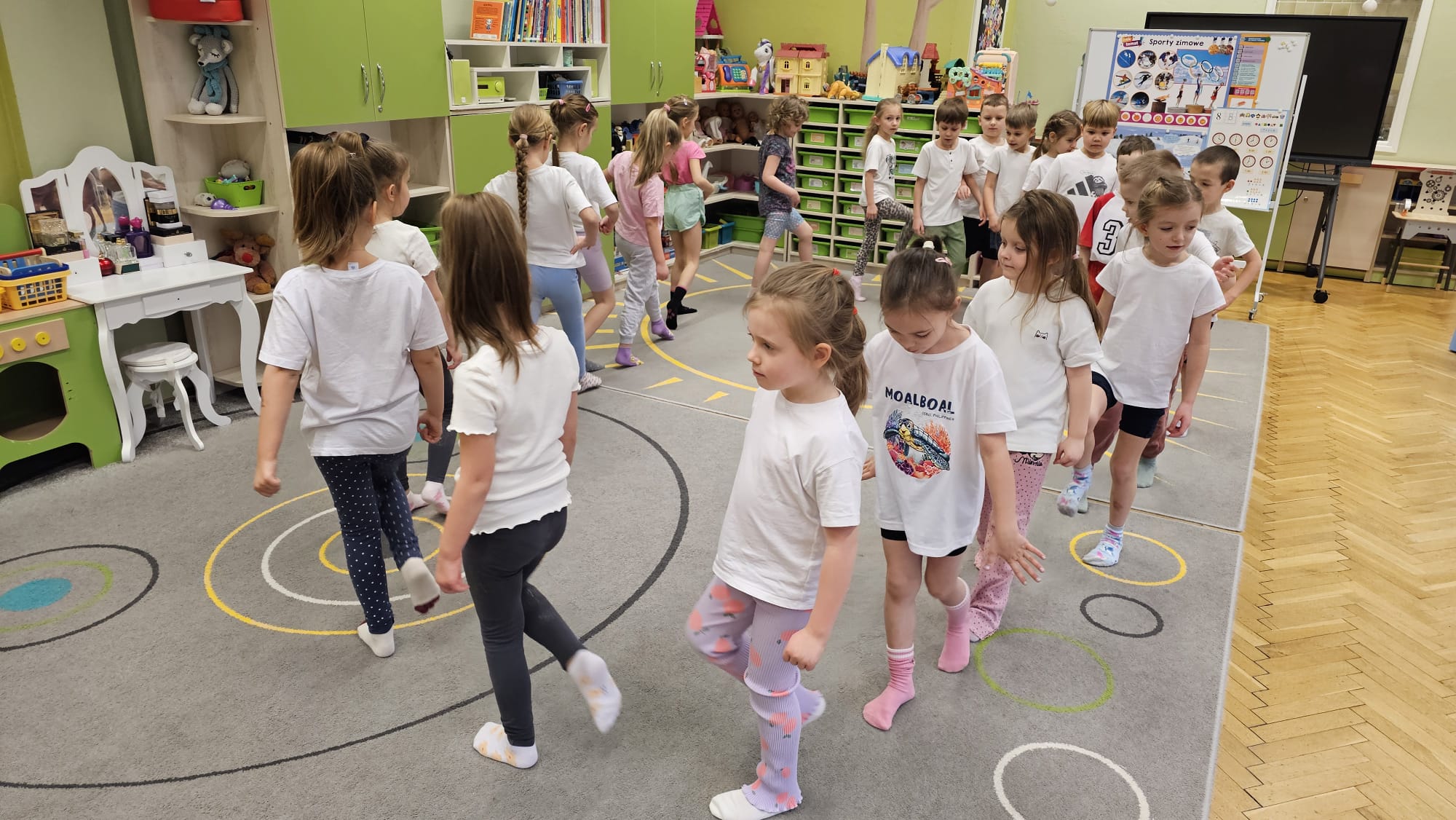 W oczekiwaniu na bardziej sprzyjającą aurę, by bezpiecznie uprawiać Nordic Walking w terenie, grupa IV starszaków nie próżnuje, ale ćwiczy i wzmacnia poszczególne grupy mięśniowe. Tym razem jest to stopa – bardzo ważna część, bo to przecież podstawa całego ciała. To ona jako pierwsza styka się z podłożem i przenosi ciężar na wyższe partie układu ruchu. Prawidłowo wykształcone mięśnie i sklepienia stopy zapewniają amortyzację, stabilność oraz właściwe ustawienie nóg, miednicy i kręgosłupa. Regularne ćwiczenia stóp mają bardzo duże znaczenie w przygotowaniu i prawidłowym uprawianiu Nordic Walkingu, ponieważ stopa stanowi podstawę całego łańcucha ruchu podczas marszu z kijkami. Wzmocnione mięśnie stóp zapewniają lepszą stabilizację i amortyzację, co pozwala na prawidłowe przetaczanie stopy od pięty do palców. Dzięki temu krok staje się dłuższy, bardziej sprężysty i ekonomiczny, a odbicie z palców skuteczniejsze, co bezpośrednio wpływa na tempo marszu i pracę kończyn górnych z kijkami. Dobra sprawność stóp poprawia równowagę i kontrolę postawy, szczególnie na nierównym podłożu, które często występuje podczas marszu w terenie. Zmniejsza to ryzyko przeciążeń stawów skokowych, kolan i kręgosłupa oraz zapobiega urazom. Prawidłowo funkcjonujące sklepienia stopy wspomagają stabilne ustawienie kończyn dolnych i miednicy, co umożliwia zachowanie wyprostowanej sylwetki, aktywnej pracy tułowia i efektywnej współpracy rąk z kijami. W efekcie Nordic Walking staje się bardziej płynny, bezpieczny i korzystny dla całego układu ruchu. Mając to wszystko na uwadze dzieci z ochotą i dużym zaangażowaniem wykonywały zaproponowane im ćwiczenia i zabawy czerpiąc radość oraz satysfakcję.