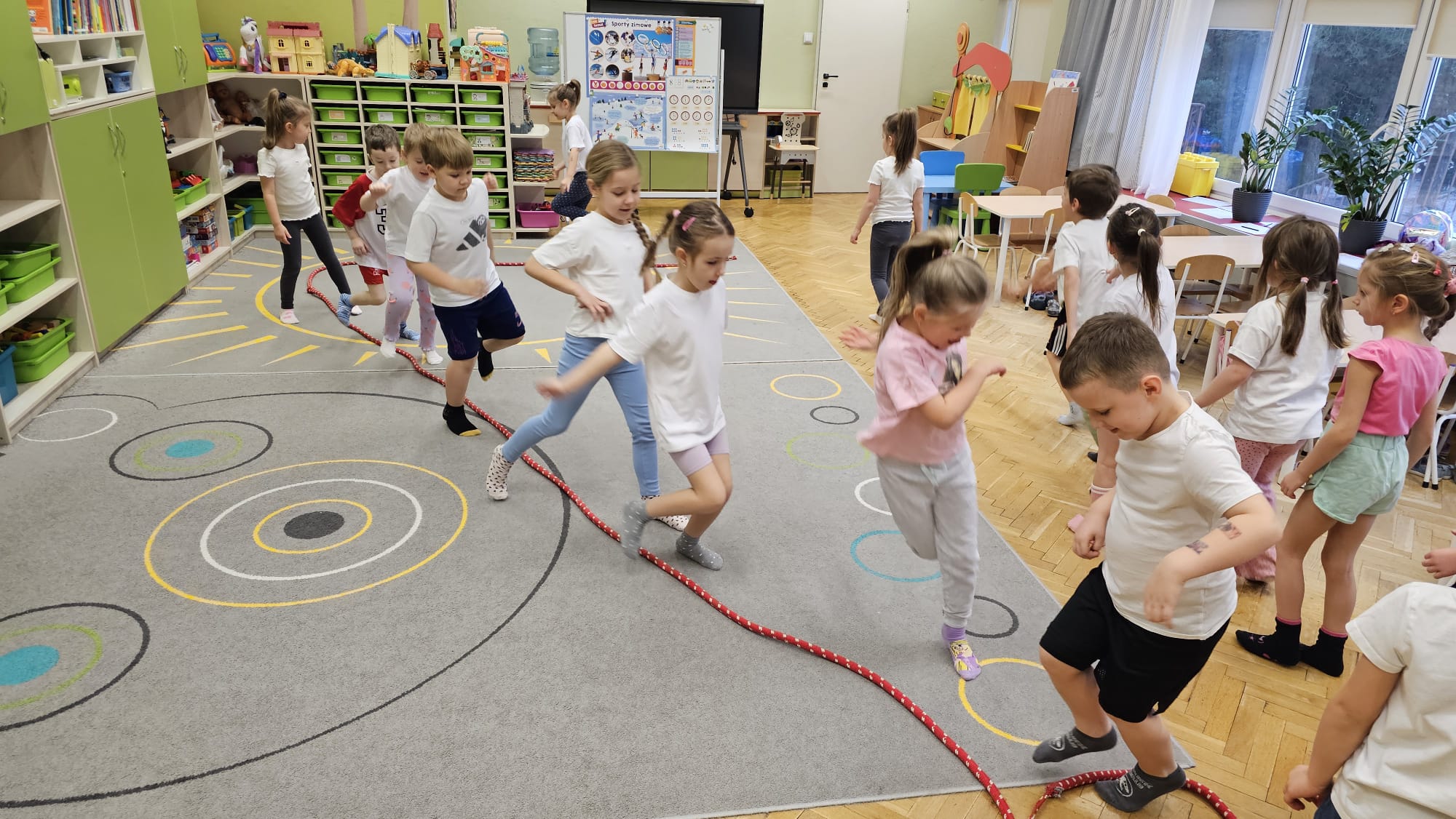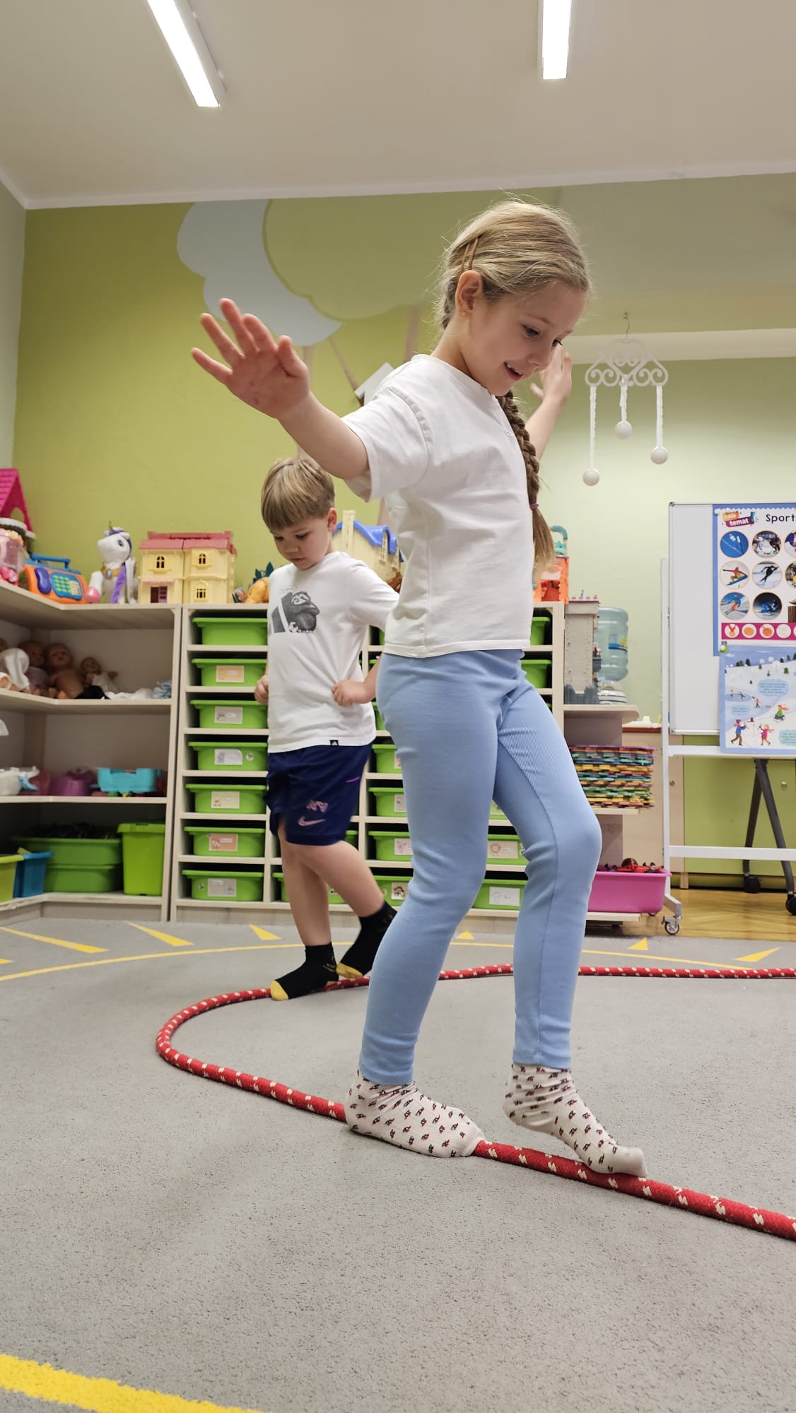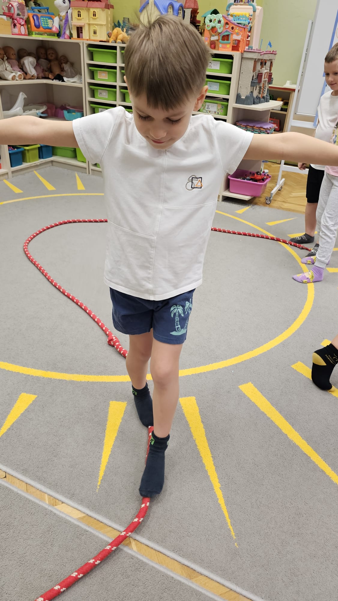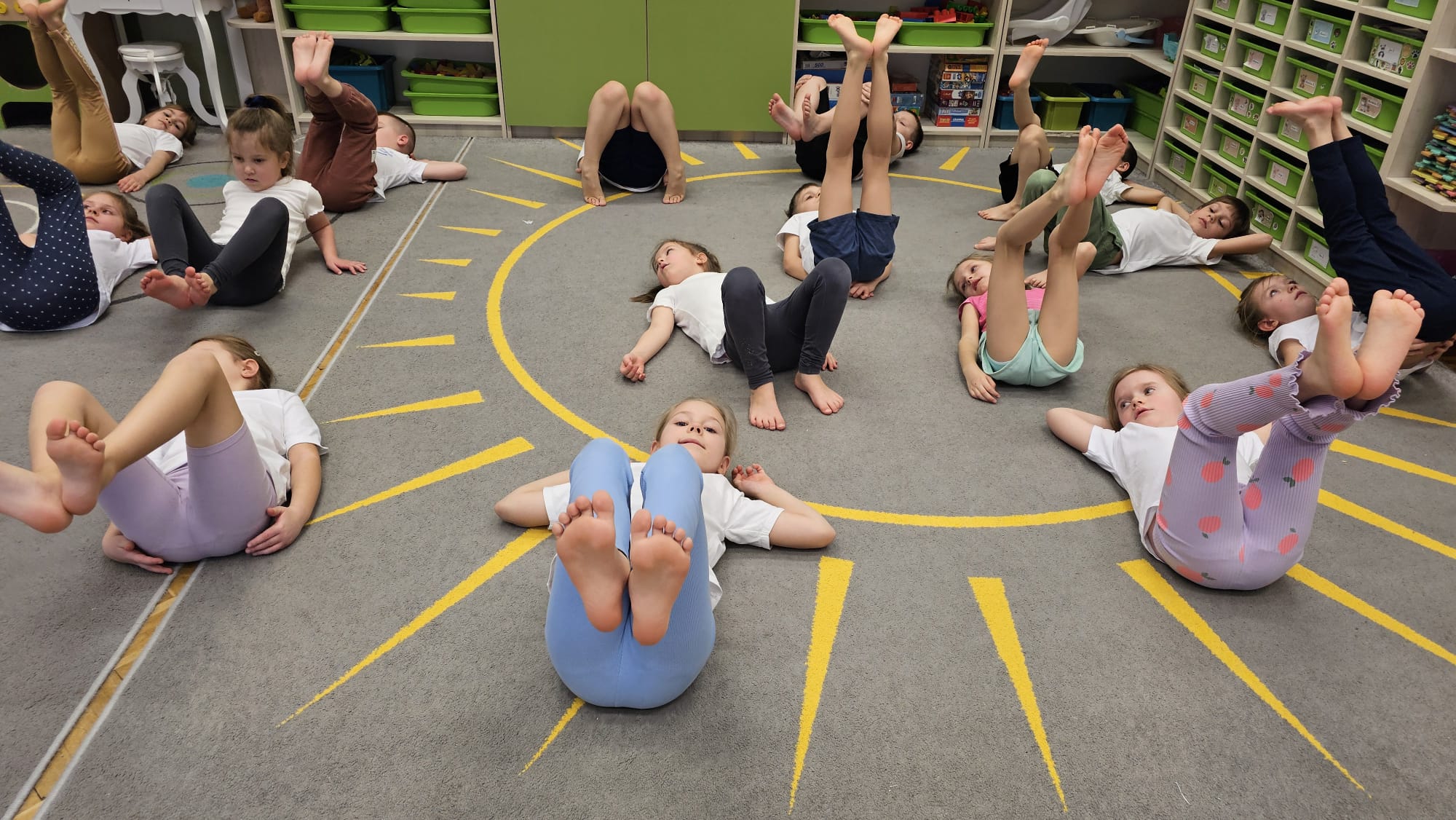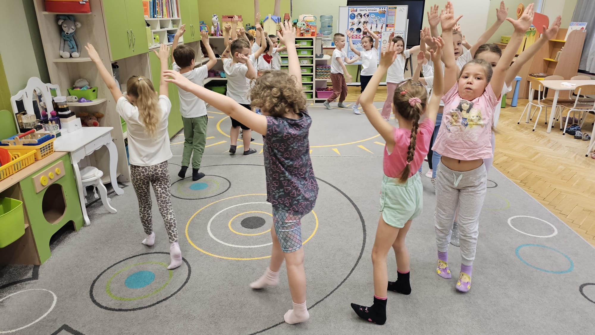 W oczekiwaniu na bardziej sprzyjającą aurę, by bezpiecznie uprawiać Nordic Walking w terenie, grupa IV starszaków nie próżnuje, ale ćwiczy i wzmacnia poszczególne grupy mięśniowe. Tym razem jest to stopa – bardzo ważna część, bo to przecież podstawa całego ciała. To ona jako pierwsza styka się z podłożem i przenosi ciężar na wyższe partie układu ruchu. Prawidłowo wykształcone mięśnie i sklepienia stopy zapewniają amortyzację, stabilność oraz właściwe ustawienie nóg, miednicy i kręgosłupa. Regularne ćwiczenia stóp mają bardzo duże znaczenie w przygotowaniu i prawidłowym uprawianiu Nordic Walkingu, ponieważ stopa stanowi podstawę całego łańcucha ruchu podczas marszu z kijkami. Wzmocnione mięśnie stóp zapewniają lepszą stabilizację i amortyzację, co pozwala na prawidłowe przetaczanie stopy od pięty do palców. Dzięki temu krok staje się dłuższy, bardziej sprężysty i ekonomiczny, a odbicie z palców skuteczniejsze, co bezpośrednio wpływa na tempo marszu i pracę kończyn górnych z kijkami. Dobra sprawność stóp poprawia równowagę i kontrolę postawy, szczególnie na nierównym podłożu, które często występuje podczas marszu w terenie. Zmniejsza to ryzyko przeciążeń stawów skokowych, kolan i kręgosłupa oraz zapobiega urazom. Prawidłowo funkcjonujące sklepienia stopy wspomagają stabilne ustawienie kończyn dolnych i miednicy, co umożliwia zachowanie wyprostowanej sylwetki, aktywnej pracy tułowia i efektywnej współpracy rąk z kijami. W efekcie Nordic Walking staje się bardziej płynny, bezpieczny i korzystny dla całego układu ruchu. Mając to wszystko na uwadze dzieci z ochotą i dużym zaangażowaniem wykonywały zaproponowane im ćwiczenia i zabawy czerpiąc radość oraz satysfakcję.