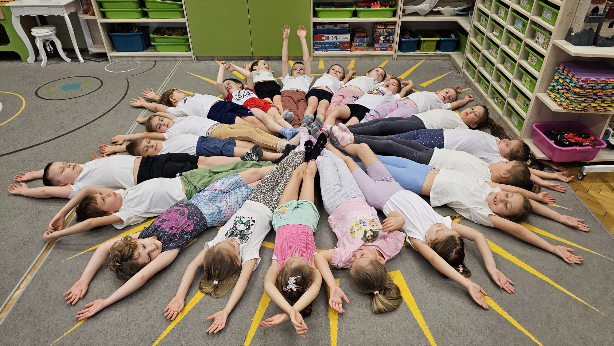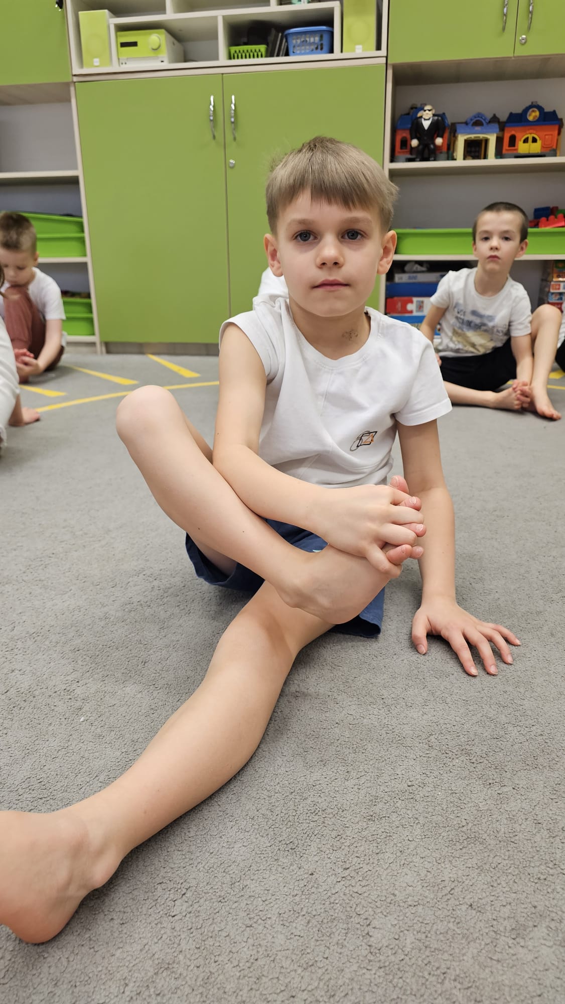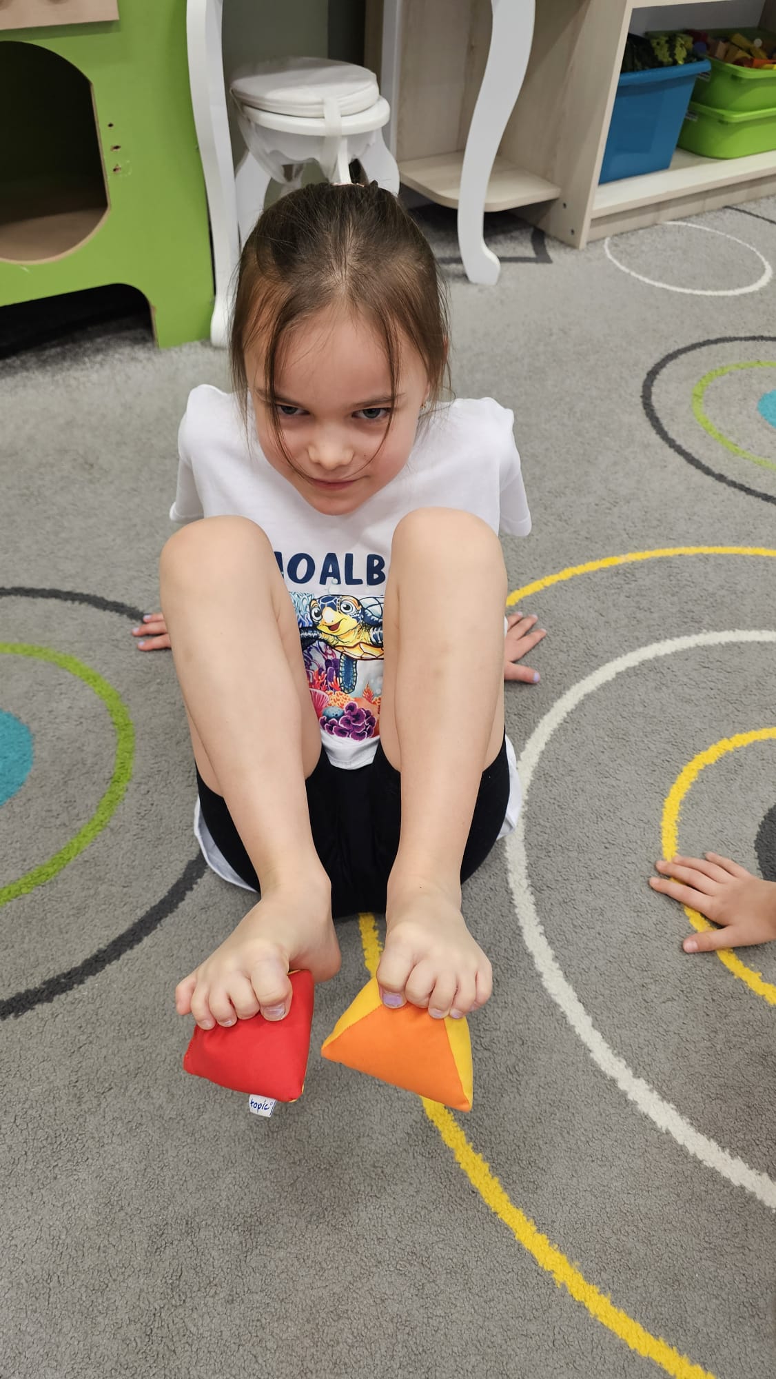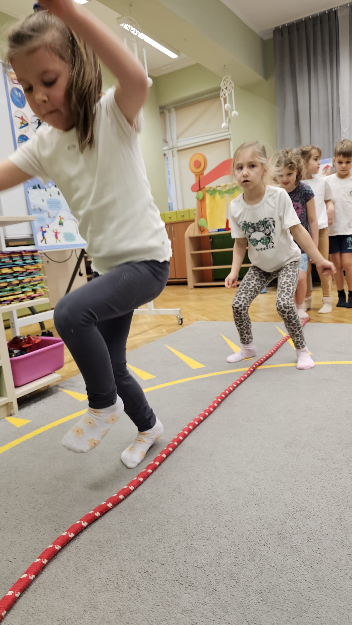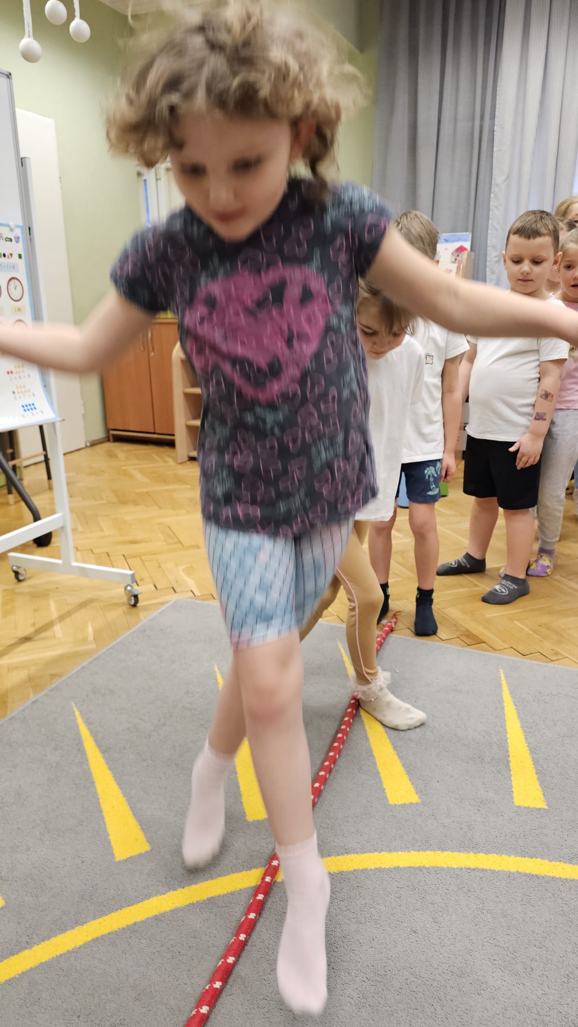 W oczekiwaniu na bardziej sprzyjającą aurę, by bezpiecznie uprawiać Nordic Walking w terenie, grupa IV starszaków nie próżnuje, ale ćwiczy i wzmacnia poszczególne grupy mięśniowe. Tym razem jest to stopa – bardzo ważna część, bo to przecież podstawa całego ciała. To ona jako pierwsza styka się z podłożem i przenosi ciężar na wyższe partie układu ruchu. Prawidłowo wykształcone mięśnie i sklepienia stopy zapewniają amortyzację, stabilność oraz właściwe ustawienie nóg, miednicy i kręgosłupa. Regularne ćwiczenia stóp mają bardzo duże znaczenie w przygotowaniu i prawidłowym uprawianiu Nordic Walkingu, ponieważ stopa stanowi podstawę całego łańcucha ruchu podczas marszu z kijkami. Wzmocnione mięśnie stóp zapewniają lepszą stabilizację i amortyzację, co pozwala na prawidłowe przetaczanie stopy od pięty do palców. Dzięki temu krok staje się dłuższy, bardziej sprężysty i ekonomiczny, a odbicie z palców skuteczniejsze, co bezpośrednio wpływa na tempo marszu i pracę kończyn górnych z kijkami. Dobra sprawność stóp poprawia równowagę i kontrolę postawy, szczególnie na nierównym podłożu, które często występuje podczas marszu w terenie. Zmniejsza to ryzyko przeciążeń stawów skokowych, kolan i kręgosłupa oraz zapobiega urazom. Prawidłowo funkcjonujące sklepienia stopy wspomagają stabilne ustawienie kończyn dolnych i miednicy, co umożliwia zachowanie wyprostowanej sylwetki, aktywnej pracy tułowia i efektywnej współpracy rąk z kijami. W efekcie Nordic Walking staje się bardziej płynny, bezpieczny i korzystny dla całego układu ruchu. Mając to wszystko na uwadze dzieci z ochotą i dużym zaangażowaniem wykonywały zaproponowane im ćwiczenia i zabawy czerpiąc radość oraz satysfakcję.