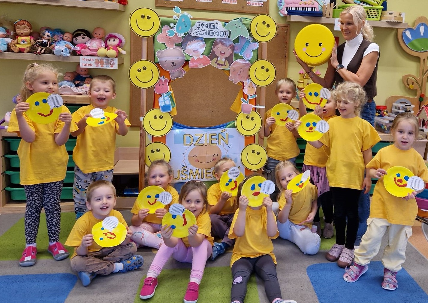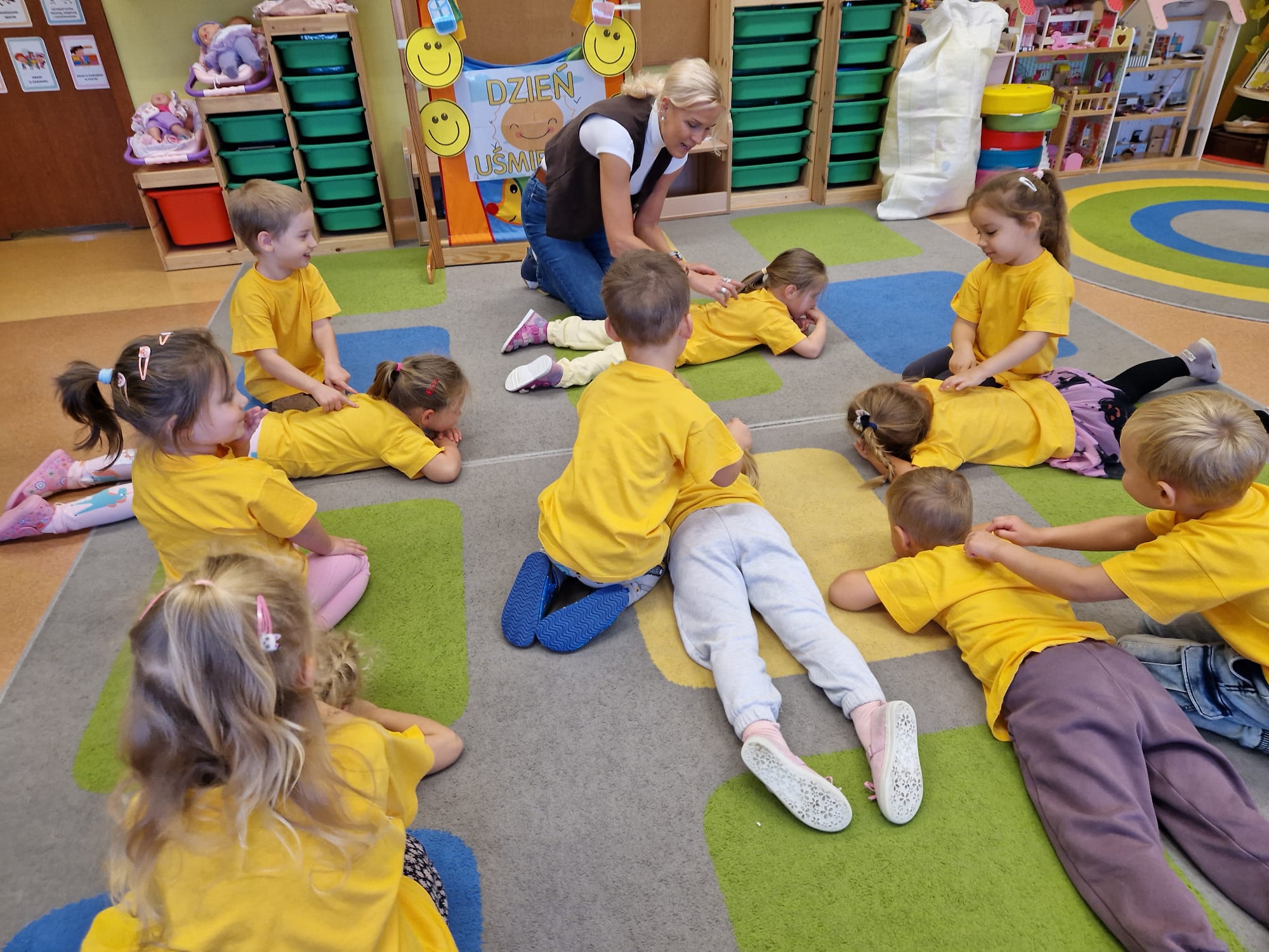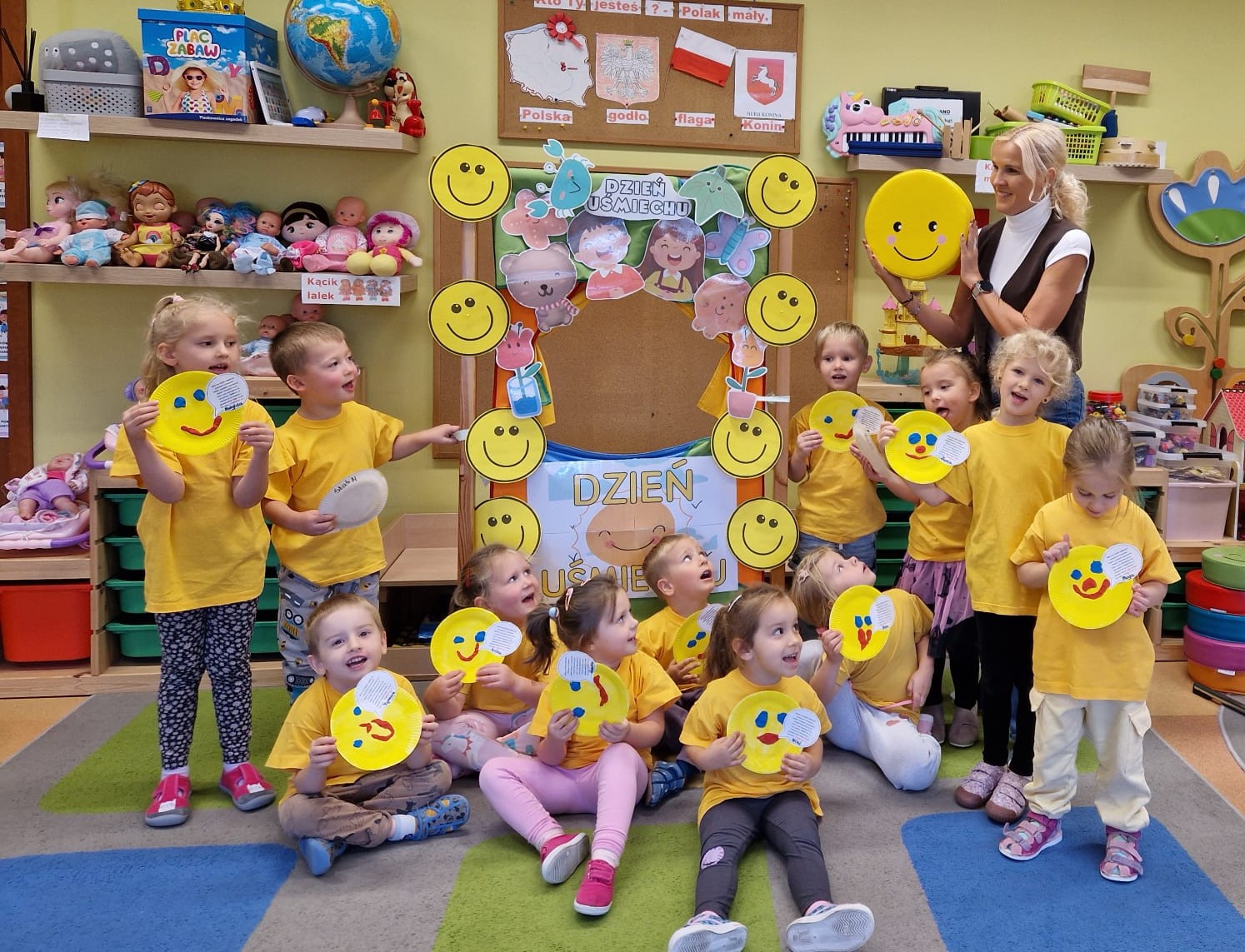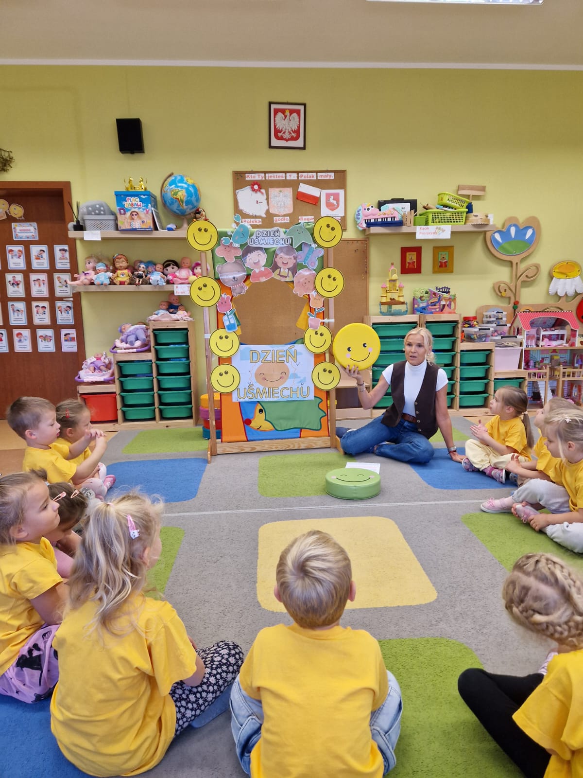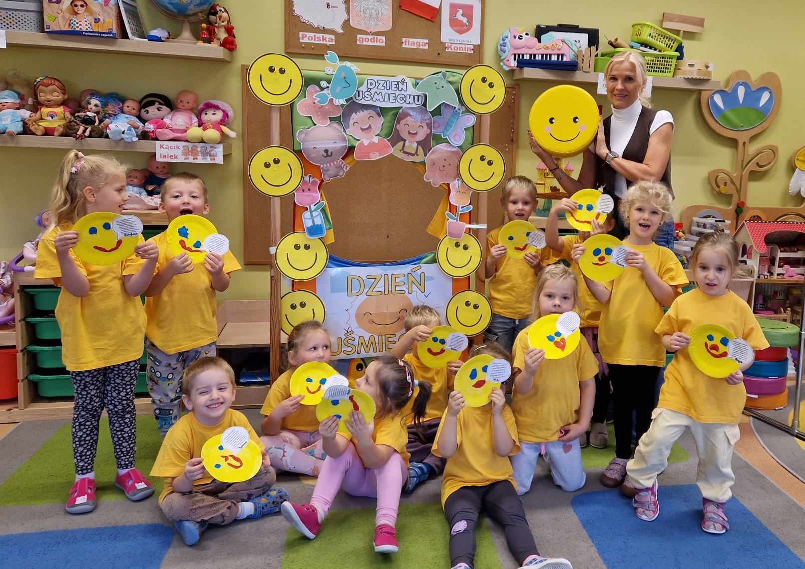 Czy wiecie, że w pierwszy piątek października każdego roku obchodzone jest bardzo wyjątkowe święto – Światowy Dzień Uśmiechu? W bieżącym roku szkolnym do świętowania Światowego Dnia Uśmiechu dołączyły przedszkolaki z grupy X i w piątek 03.10. 2025 r. uśmiech towarzyszył dzieciom już od rana. Ten radosny dzień został stworzony po to, abyśmy wszyscy przypomnieli sobie, jak ważny jest uśmiech w naszym życiu. Historia tego dnia sięga roku 1999, kiedy to amerykański artysta Harvey Ball, twórca słynnej żółtej, uśmiechniętej buzi, postanowił ogłosić jedno specjalne święto, które będzie przypominać ludziom na całym świecie, aby się więcej uśmiechali. Przedszkolne lata są niezwykle ważnym okresem w życiu każdego dziecka. To czas, w którym maluchy odkrywają świat, rozwijają swoje umiejętności społeczne, poznają emocje i uczą się jak budować relacje. Zamysł tego święta, realizowana innowacja pedagogiczna „ Kolorowe emocje”, a także tydzień budowania relacji stały się wyjątkową okazją, aby uświadomić najmłodszym, jaką moc ma UŚMIECH. Uśmiech, to przecież mały gest, który ma ogromne znaczenie dla dzieci w przedszkolu. To nie tylko wyraz sympatii czy radości, ale również narzędzie, które pomaga budować pozytywne relacje i sprzyja rozwojowi emocjonalnemu maluchów. Wszystkie zaaranżowane aktywności podczas świętowania Dnia Uśmiechu ... teatrzyk „ O wesołym słoneczku i smutnej chmurce”, zabawa” podaj uśmiech”, taniec z uśmiechem, czy też masażyk z „ uśmiechniętym dreszczykiem”, pozwoliły dzieciom poczuć moc uśmiechu, moc radości ze wspólnych zbaw. Razem uczyliśmy się, jak uśmiechać się i sprawiać, że inni się uśmiechają. Rozmawialiśmy o uśmiechu, tworzyliśmy uśmiechy, dzieliliśmy się uśmiechami i poznawaliśmy, jak uśmiech może sprawić, że świat staje się lepszy, przyjemniejszy i że uśmiech sprawia przyjemność nam i innym oraz niesie ze sobą dużo pozytywnej energii. Cele został osiągnięte zarówno w zakresie rozwijania umiejętności wyrażania pozytywnych emocji jak również w zakresie budowania relacji społecznych przez wspólną zabawę i wzmacniania własnej wartości. A jak było wesoło??? Zapraszamy do galerii.
