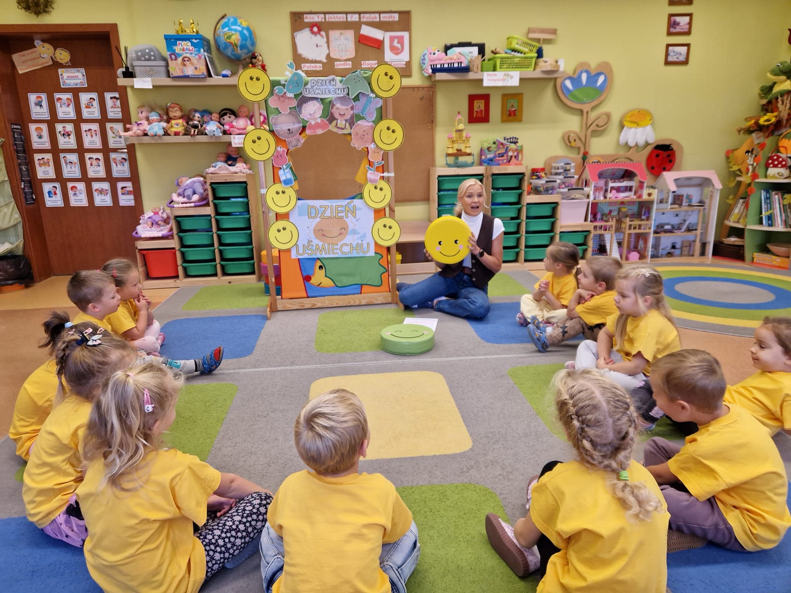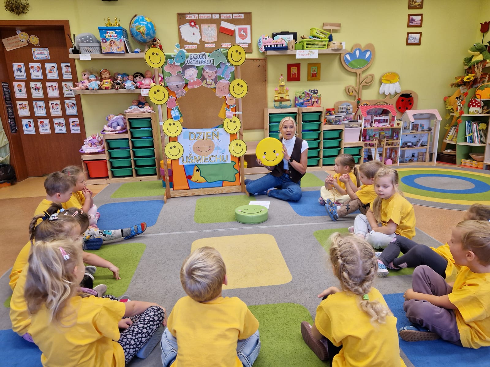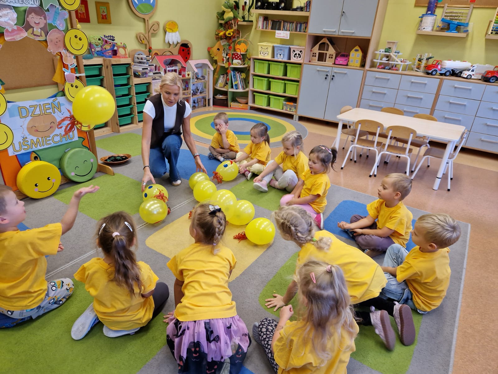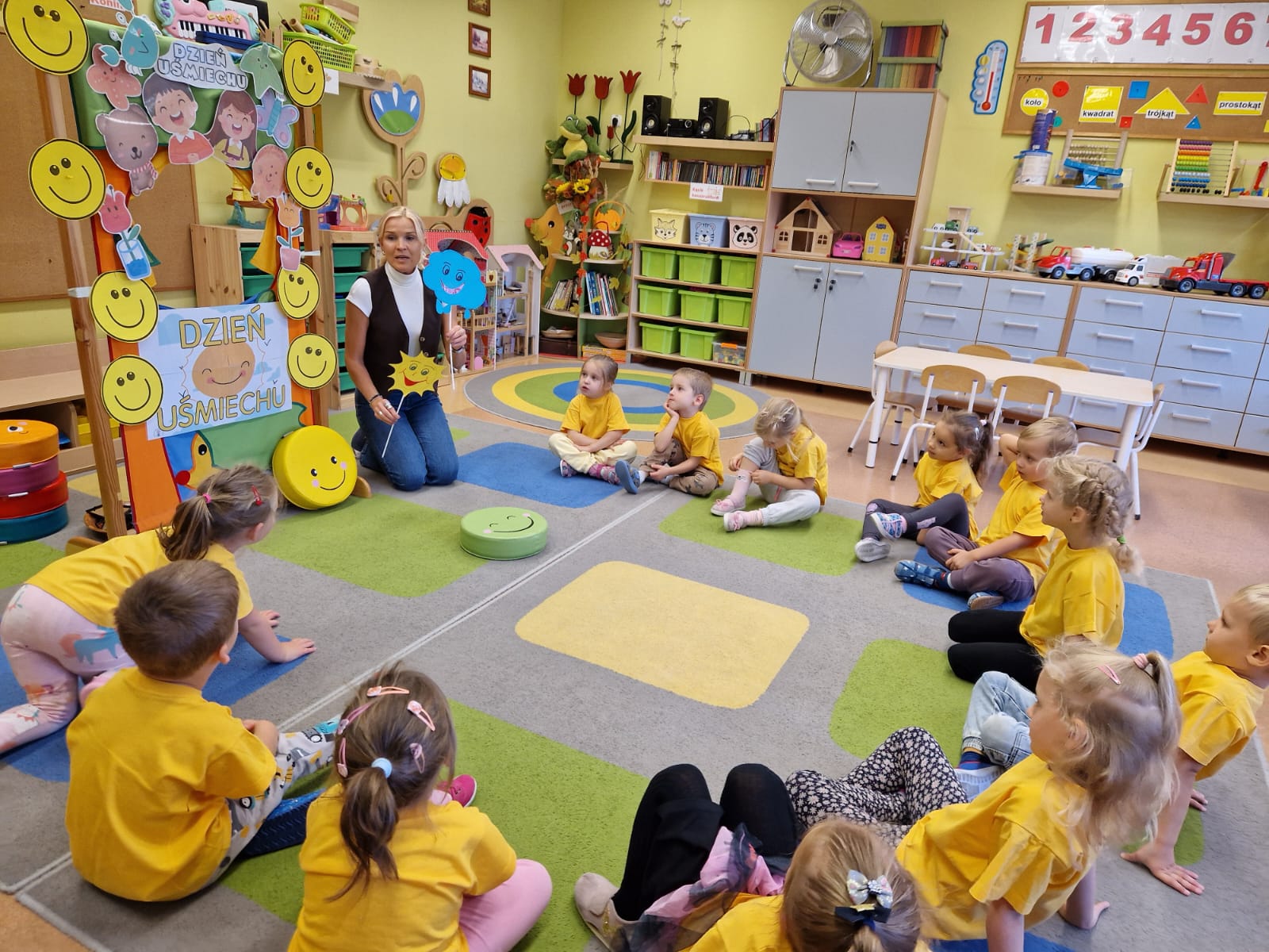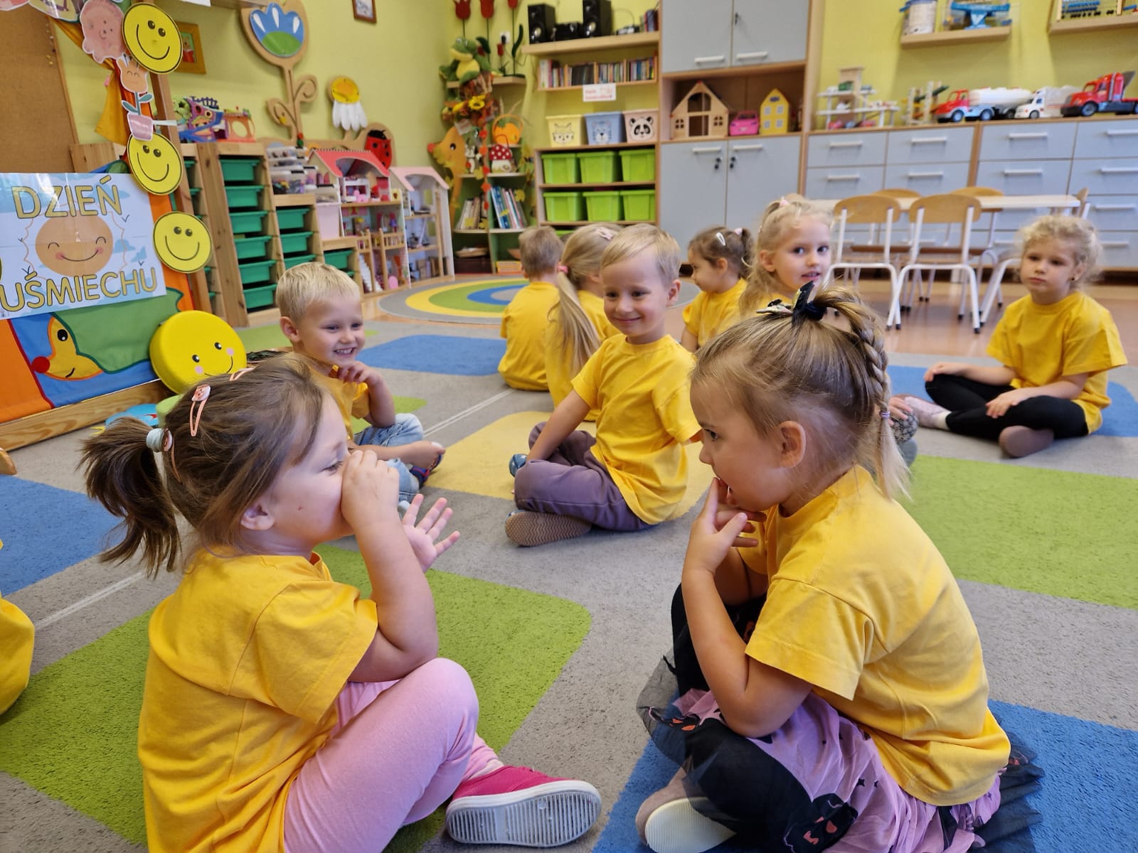 Czy wiecie, że w pierwszy piątek października każdego roku obchodzone jest bardzo wyjątkowe święto – Światowy Dzień Uśmiechu? W bieżącym roku szkolnym do świętowania Światowego Dnia Uśmiechu dołączyły przedszkolaki z grupy X i w piątek 03.10. 2025 r. uśmiech towarzyszył dzieciom już od rana. Ten radosny dzień został stworzony po to, abyśmy wszyscy przypomnieli sobie, jak ważny jest uśmiech w naszym życiu. Historia tego dnia sięga roku 1999, kiedy to amerykański artysta Harvey Ball, twórca słynnej żółtej, uśmiechniętej buzi, postanowił ogłosić jedno specjalne święto, które będzie przypominać ludziom na całym świecie, aby się więcej uśmiechali. Przedszkolne lata są niezwykle ważnym okresem w życiu każdego dziecka. To czas, w którym maluchy odkrywają świat, rozwijają swoje umiejętności społeczne, poznają emocje i uczą się jak budować relacje. Zamysł tego święta, realizowana innowacja pedagogiczna „ Kolorowe emocje”, a także tydzień budowania relacji stały się wyjątkową okazją, aby uświadomić najmłodszym, jaką moc ma UŚMIECH. Uśmiech, to przecież mały gest, który ma ogromne znaczenie dla dzieci w przedszkolu. To nie tylko wyraz sympatii czy radości, ale również narzędzie, które pomaga budować pozytywne relacje i sprzyja rozwojowi emocjonalnemu maluchów. Wszystkie zaaranżowane aktywności podczas świętowania Dnia Uśmiechu ... teatrzyk „ O wesołym słoneczku i smutnej chmurce”, zabawa” podaj uśmiech”, taniec z uśmiechem, czy też masażyk z „ uśmiechniętym dreszczykiem”, pozwoliły dzieciom poczuć moc uśmiechu, moc radości ze wspólnych zbaw. Razem uczyliśmy się, jak uśmiechać się i sprawiać, że inni się uśmiechają. Rozmawialiśmy o uśmiechu, tworzyliśmy uśmiechy, dzieliliśmy się uśmiechami i poznawaliśmy, jak uśmiech może sprawić, że świat staje się lepszy, przyjemniejszy i że uśmiech sprawia przyjemność nam i innym oraz niesie ze sobą dużo pozytywnej energii. Cele został osiągnięte zarówno w zakresie rozwijania umiejętności wyrażania pozytywnych emocji jak również w zakresie budowania relacji społecznych przez wspólną zabawę i wzmacniania własnej wartości. A jak było wesoło??? Zapraszamy do galerii.
