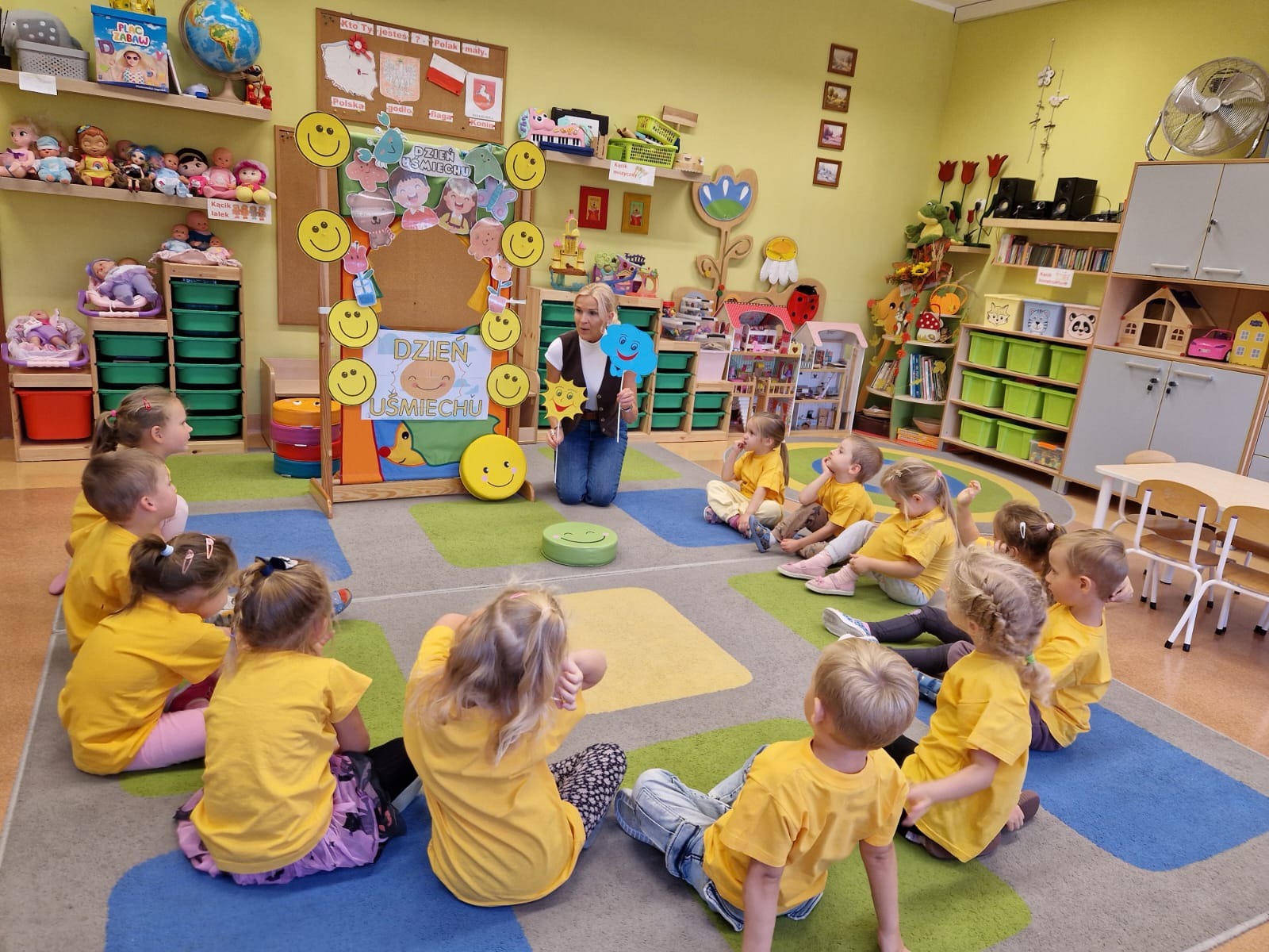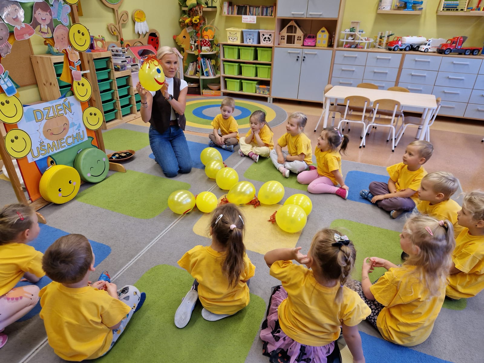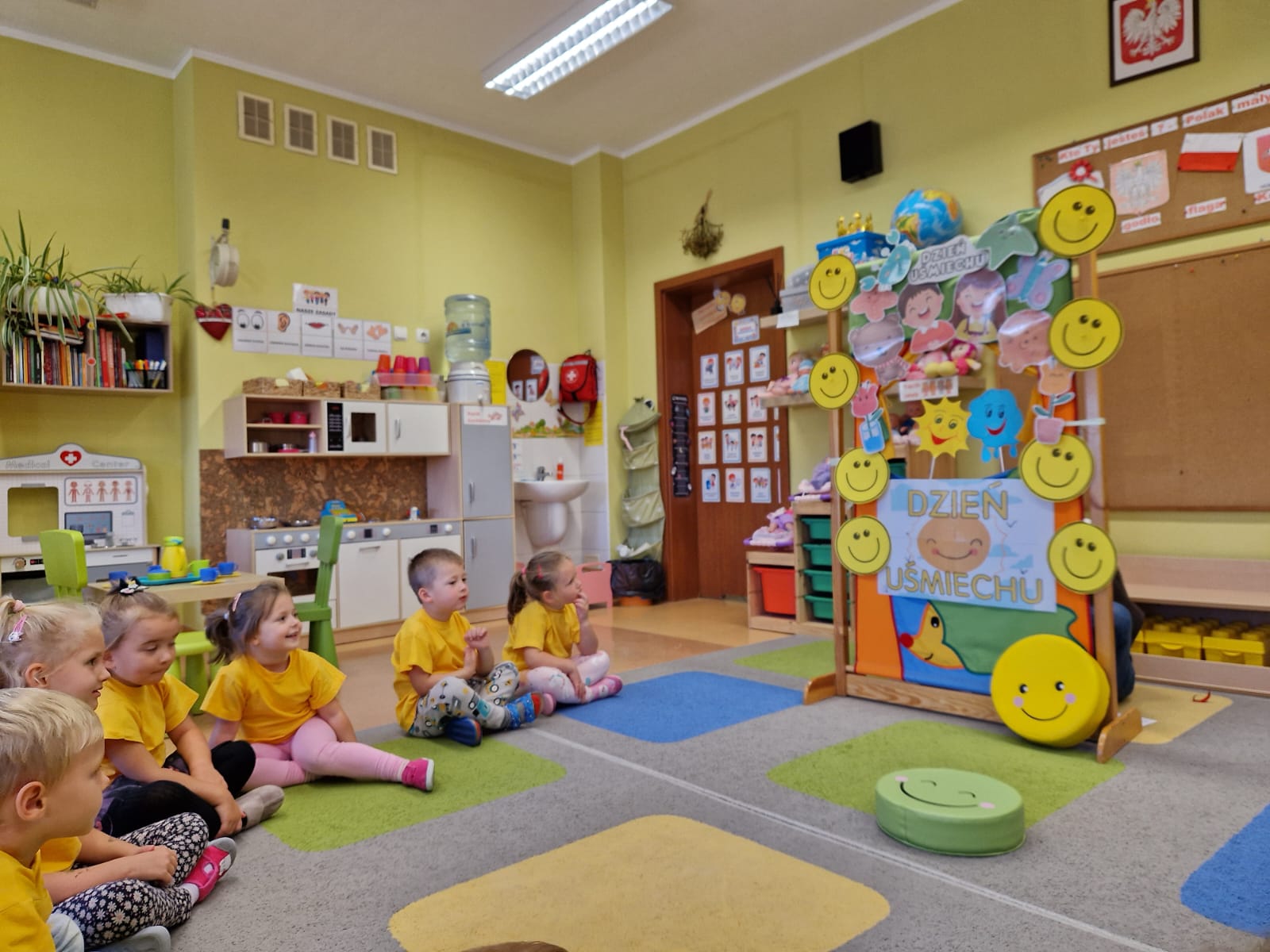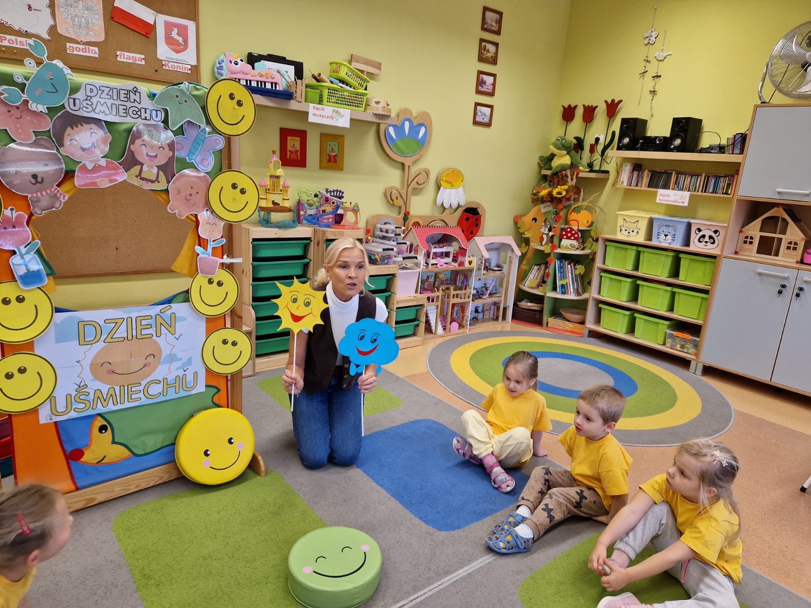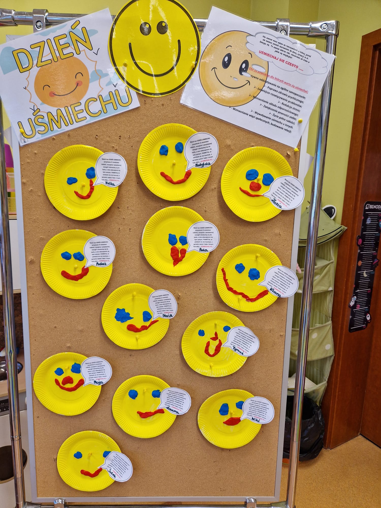 Czy wiecie, że w pierwszy piątek października każdego roku obchodzone jest bardzo wyjątkowe święto – Światowy Dzień Uśmiechu? W bieżącym roku szkolnym do świętowania Światowego Dnia Uśmiechu dołączyły przedszkolaki z grupy X i w piątek 03.10. 2025 r. uśmiech towarzyszył dzieciom już od rana. Ten radosny dzień został stworzony po to, abyśmy wszyscy przypomnieli sobie, jak ważny jest uśmiech w naszym życiu. Historia tego dnia sięga roku 1999, kiedy to amerykański artysta Harvey Ball, twórca słynnej żółtej, uśmiechniętej buzi, postanowił ogłosić jedno specjalne święto, które będzie przypominać ludziom na całym świecie, aby się więcej uśmiechali. Przedszkolne lata są niezwykle ważnym okresem w życiu każdego dziecka. To czas, w którym maluchy odkrywają świat, rozwijają swoje umiejętności społeczne, poznają emocje i uczą się jak budować relacje. Zamysł tego święta, realizowana innowacja pedagogiczna „ Kolorowe emocje”, a także tydzień budowania relacji stały się wyjątkową okazją, aby uświadomić najmłodszym, jaką moc ma UŚMIECH. Uśmiech, to przecież mały gest, który ma ogromne znaczenie dla dzieci w przedszkolu. To nie tylko wyraz sympatii czy radości, ale również narzędzie, które pomaga budować pozytywne relacje i sprzyja rozwojowi emocjonalnemu maluchów. Wszystkie zaaranżowane aktywności podczas świętowania Dnia Uśmiechu ... teatrzyk „ O wesołym słoneczku i smutnej chmurce”, zabawa” podaj uśmiech”, taniec z uśmiechem, czy też masażyk z „ uśmiechniętym dreszczykiem”, pozwoliły dzieciom poczuć moc uśmiechu, moc radości ze wspólnych zbaw. Razem uczyliśmy się, jak uśmiechać się i sprawiać, że inni się uśmiechają. Rozmawialiśmy o uśmiechu, tworzyliśmy uśmiechy, dzieliliśmy się uśmiechami i poznawaliśmy, jak uśmiech może sprawić, że świat staje się lepszy, przyjemniejszy i że uśmiech sprawia przyjemność nam i innym oraz niesie ze sobą dużo pozytywnej energii. Cele został osiągnięte zarówno w zakresie rozwijania umiejętności wyrażania pozytywnych emocji jak również w zakresie budowania relacji społecznych przez wspólną zabawę i wzmacniania własnej wartości. A jak było wesoło??? Zapraszamy do galerii.