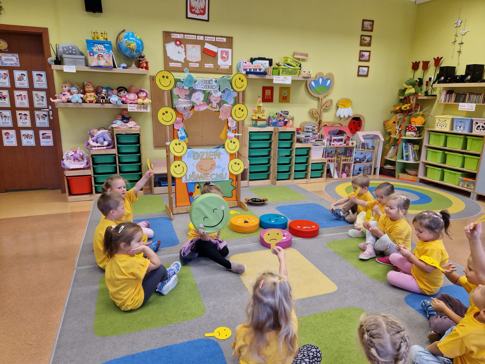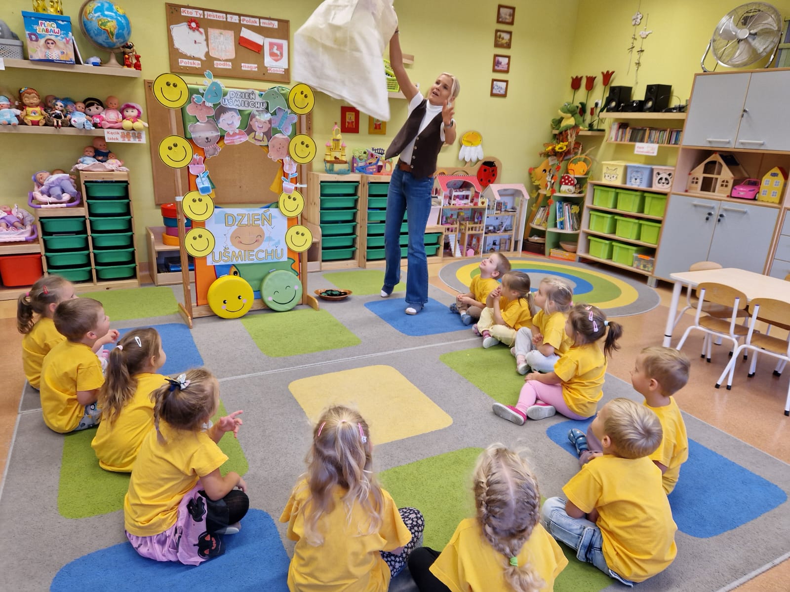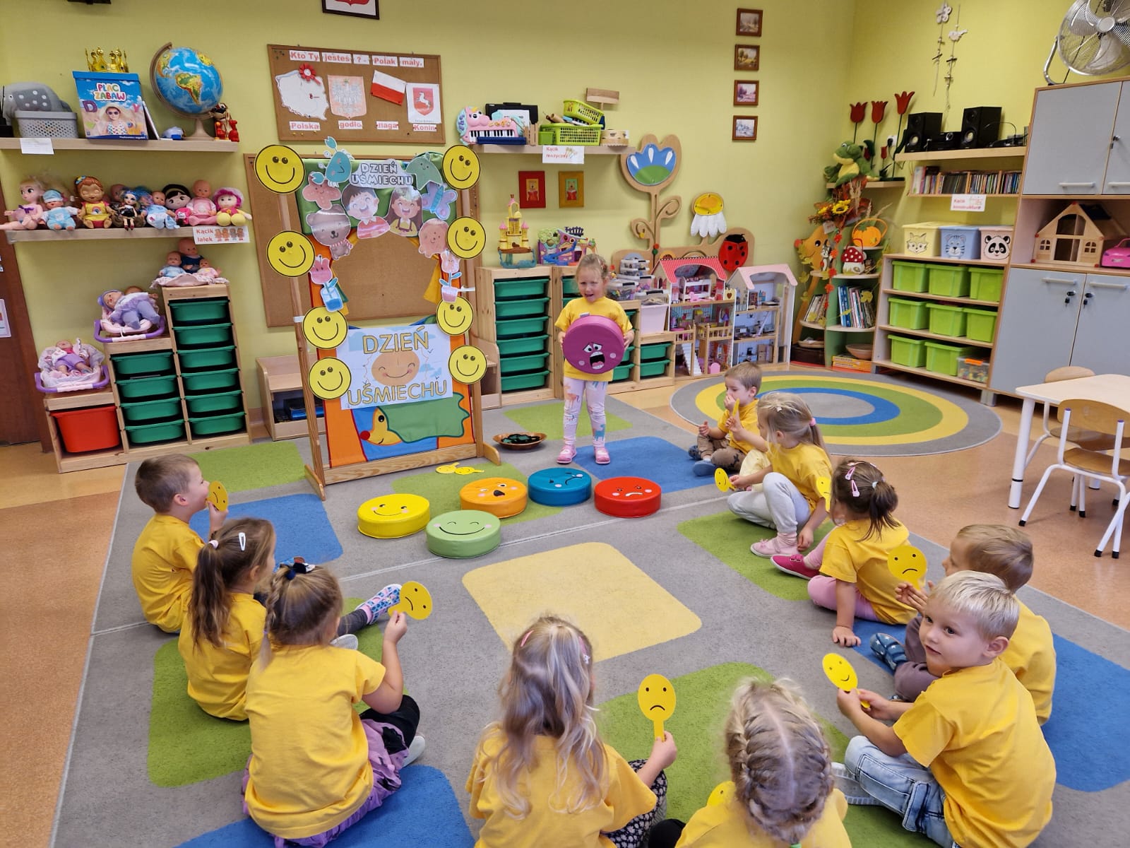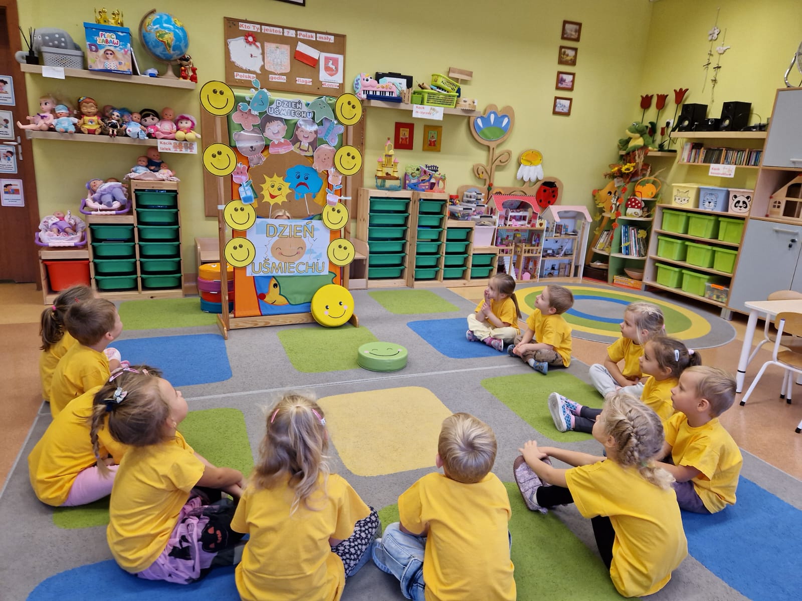Czy wiecie, że w pierwszy piątek października każdego roku obchodzone jest bardzo wyjątkowe święto – Światowy Dzień Uśmiechu? W bieżącym roku szkolnym do świętowania Światowego Dnia Uśmiechu dołączyły przedszkolaki z grupy X i w piątek 03.10. 2025 r. uśmiech towarzyszył dzieciom już od rana. Ten radosny dzień został stworzony po to, abyśmy wszyscy przypomnieli sobie, jak ważny jest uśmiech w naszym życiu. Historia tego dnia sięga roku 1999, kiedy to amerykański artysta Harvey Ball, twórca słynnej żółtej, uśmiechniętej buzi, postanowił ogłosić jedno specjalne święto, które będzie przypominać ludziom na całym świecie, aby się więcej uśmiechali. Przedszkolne lata są niezwykle ważnym okresem w życiu każdego dziecka. To czas, w którym maluchy odkrywają świat, rozwijają swoje umiejętności społeczne, poznają emocje i uczą się jak budować relacje. Zamysł tego święta, realizowana innowacja pedagogiczna „ Kolorowe emocje”, a także tydzień budowania relacji stały się wyjątkową okazją, aby uświadomić najmłodszym, jaką moc ma UŚMIECH. Uśmiech, to przecież mały gest, który ma ogromne znaczenie dla dzieci w przedszkolu. To nie tylko wyraz sympatii czy radości, ale również narzędzie, które pomaga budować pozytywne relacje i sprzyja rozwojowi emocjonalnemu maluchów. Wszystkie zaaranżowane aktywności podczas świętowania Dnia Uśmiechu ... teatrzyk „ O wesołym słoneczku i smutnej chmurce”, zabawa” podaj uśmiech”, taniec z uśmiechem, czy też masażyk z „ uśmiechniętym dreszczykiem”, pozwoliły dzieciom poczuć moc uśmiechu, moc radości ze wspólnych zbaw. Razem uczyliśmy się, jak uśmiechać się i sprawiać, że inni się uśmiechają. Rozmawialiśmy o uśmiechu, tworzyliśmy uśmiechy, dzieliliśmy się uśmiechami i poznawaliśmy, jak uśmiech może sprawić, że świat staje się lepszy, przyjemniejszy i że uśmiech sprawia przyjemność nam i innym oraz niesie ze sobą dużo pozytywnej energii. Cele został osiągnięte zarówno w zakresie rozwijania umiejętności wyrażania pozytywnych emocji jak również w zakresie budowania relacji społecznych przez wspólną zabawę i wzmacniania własnej wartości. A jak było wesoło??? Zapraszamy do galerii.