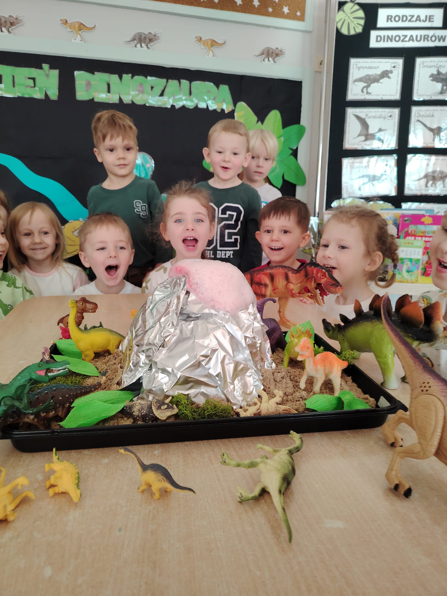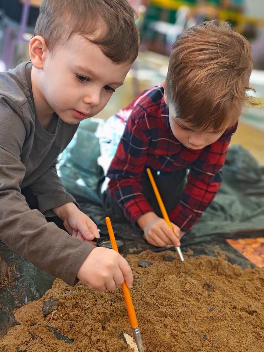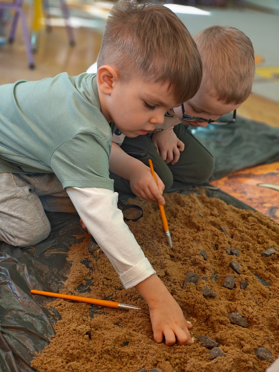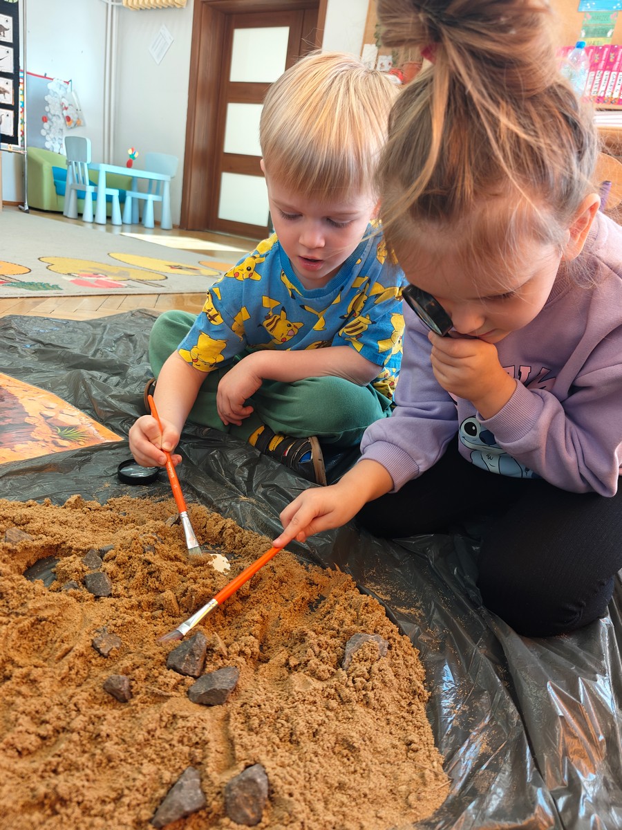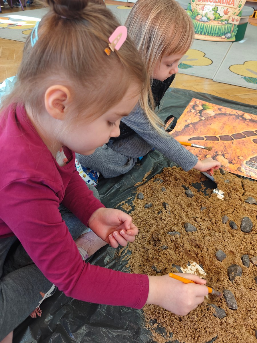 Dzieci z ogromnym zainteresowaniem przeniosły się w odległe czasy, aby poznać niezwykły świat dinozaurów i dowiedzieć się, jak wyglądało życie na Ziemi miliony lat temu. Podczas zajęć przedszkolaki poznawały różne gatunki dinozaurów, ich wygląd, sposób życia oraz ciekawostki związane z prehistorycznym światem. Dzieci z zaciekawieniem oglądały książki i ilustracje, słuchały opowiadań i uczestniczyły w rozmowach. W trakcie realizacji projektu nie zabrakło wielu ciekawych aktywności. Dużym zainteresowaniem cieszyły się zajęcia badawcze i eksperymenty. Dzieci obserwowały eksperyment przedstawiający wybuch wulkanu, dzięki czemu mogły dowiedzieć się, jakie zjawiska przyrodnicze występowały na Ziemi w czasach prehistorycznych. Przedszkolaki wcielały się w rolę małych paleontologów, poszukiwały „dinozaurowe skamieniałości”, tropiły ślady dinozaurów oraz brały udział w zabawach ruchowych i dydaktycznych związanych z tematyką prehistorii. Realizacja projektu była dla dzieci fascynującą przygodą i okazją do zdobywania nowej wiedzy poprzez zabawę, doświadczenia i wspólne odkrywanie tajemnic prehistorycznego świata dinozaurów. Zapraszamy do galerii!