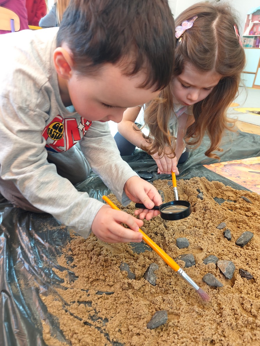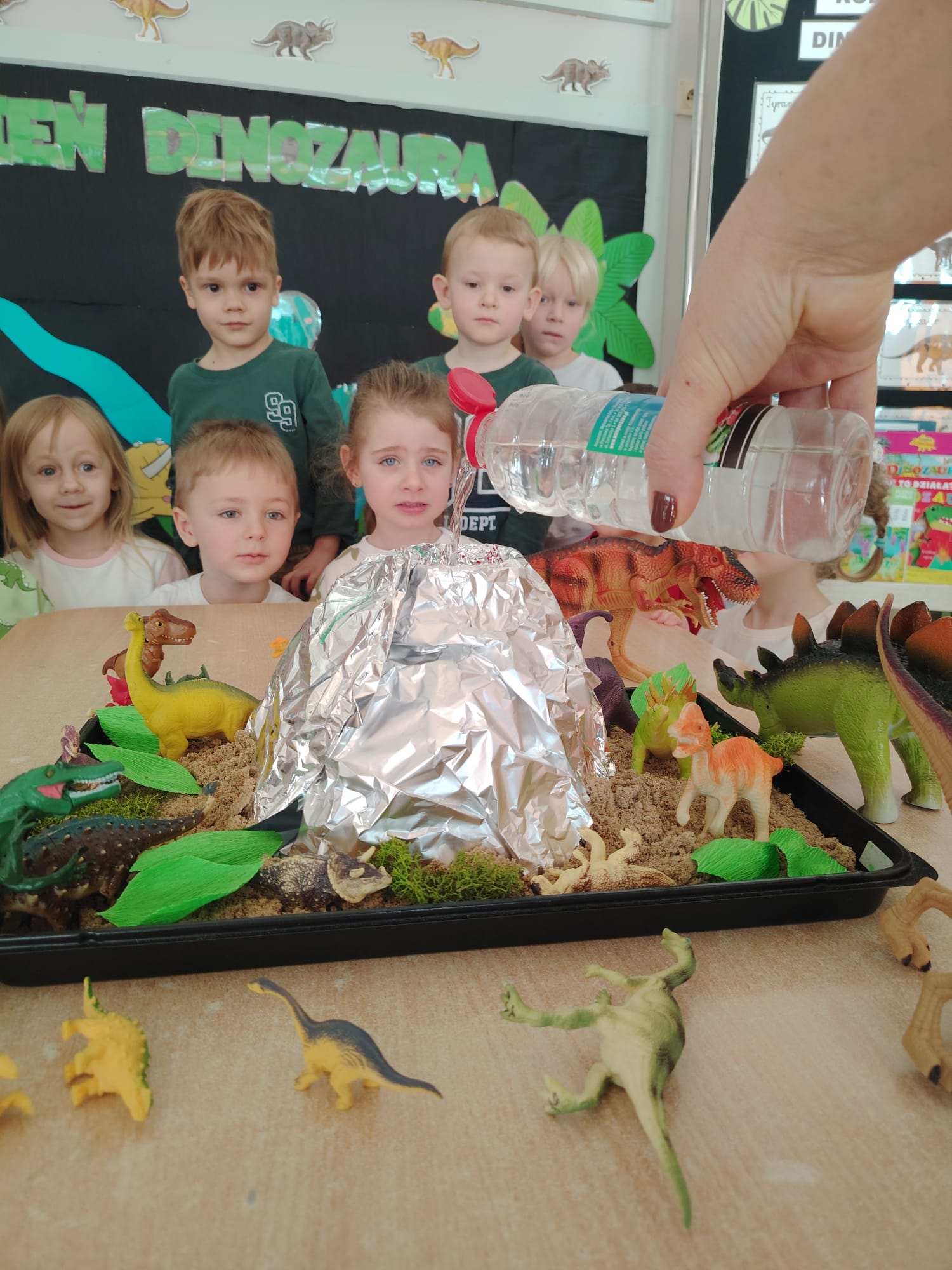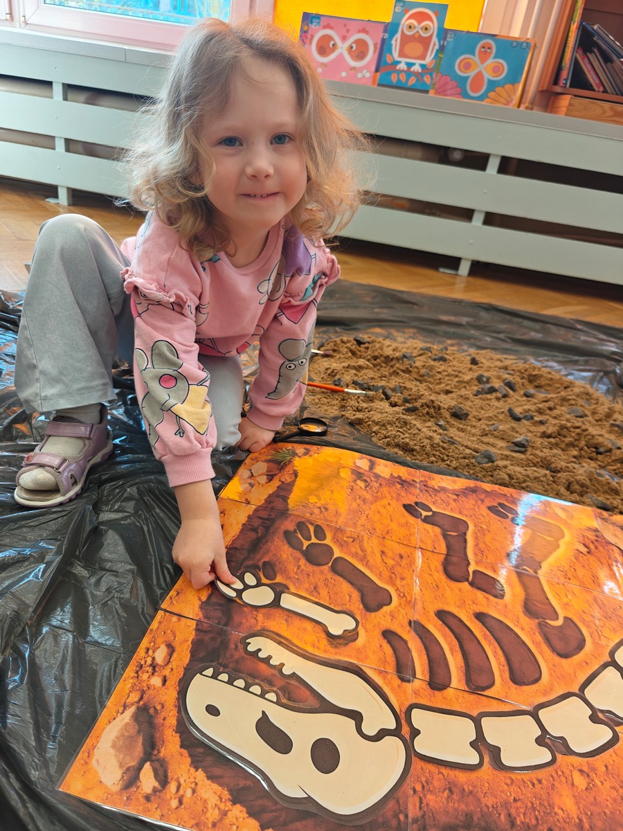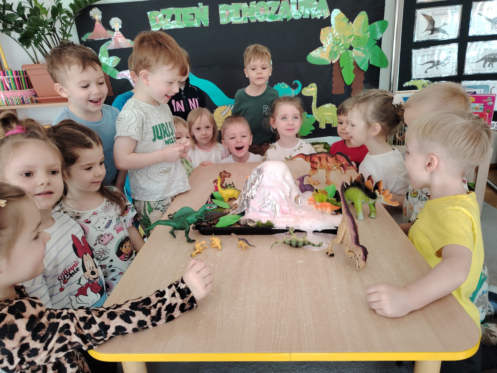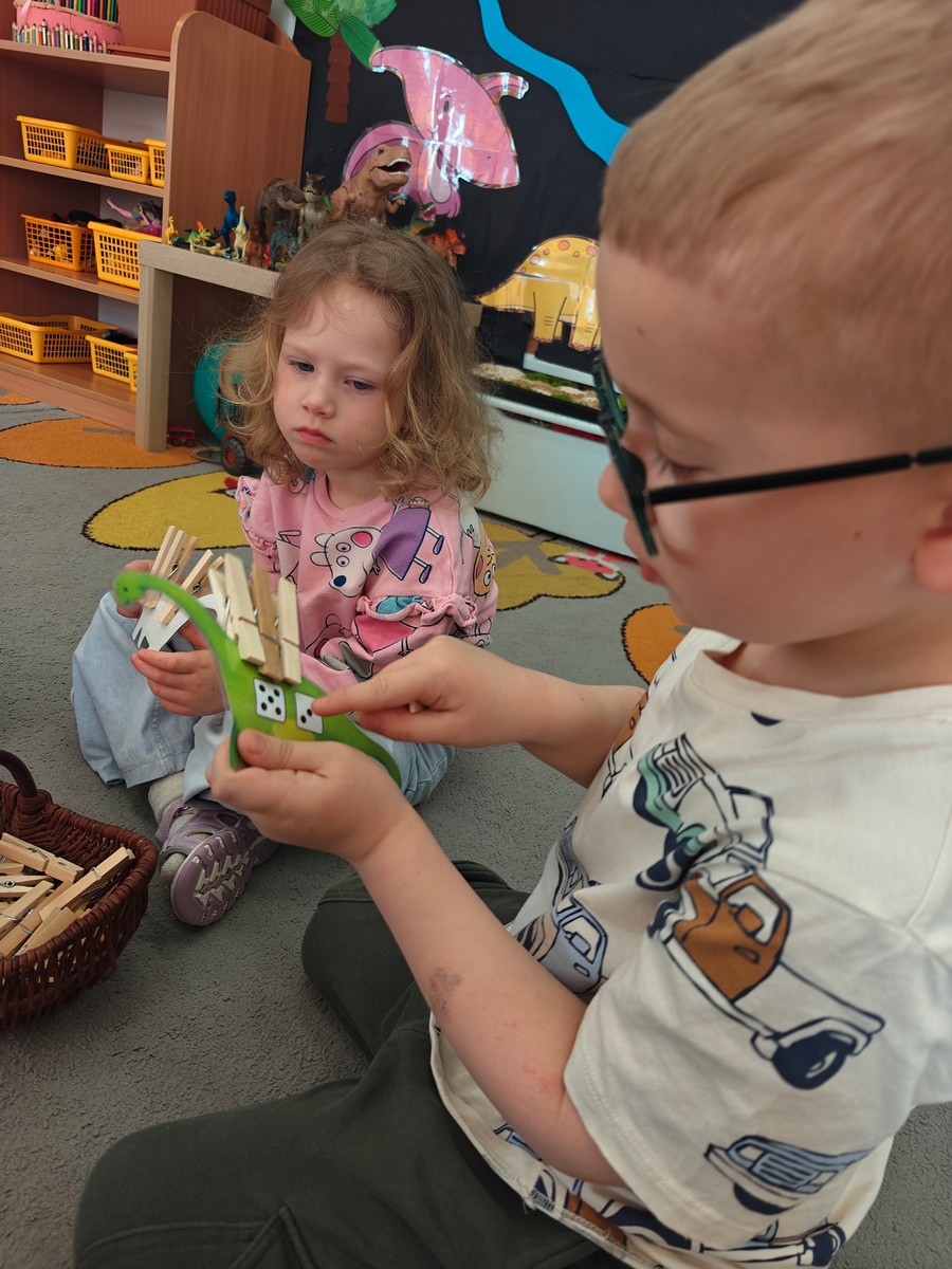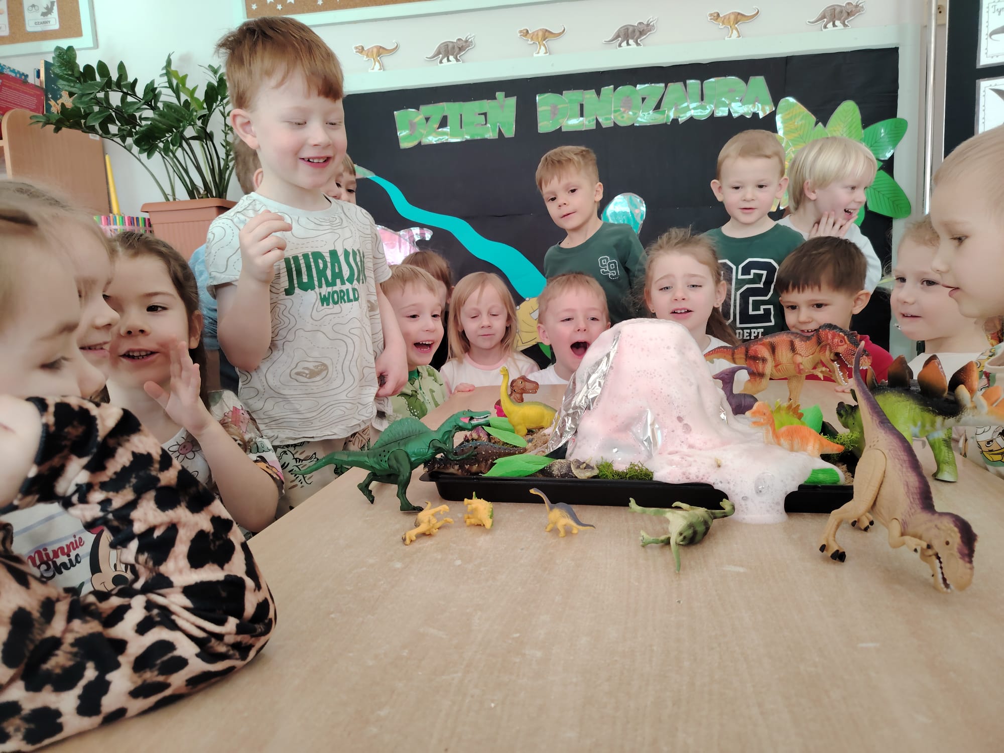 Dzieci z ogromnym zainteresowaniem przeniosły się w odległe czasy, aby poznać niezwykły świat dinozaurów i dowiedzieć się, jak wyglądało życie na Ziemi miliony lat temu. Podczas zajęć przedszkolaki poznawały różne gatunki dinozaurów, ich wygląd, sposób życia oraz ciekawostki związane z prehistorycznym światem. Dzieci z zaciekawieniem oglądały książki i ilustracje, słuchały opowiadań i uczestniczyły w rozmowach. W trakcie realizacji projektu nie zabrakło wielu ciekawych aktywności. Dużym zainteresowaniem cieszyły się zajęcia badawcze i eksperymenty. Dzieci obserwowały eksperyment przedstawiający wybuch wulkanu, dzięki czemu mogły dowiedzieć się, jakie zjawiska przyrodnicze występowały na Ziemi w czasach prehistorycznych. Przedszkolaki wcielały się w rolę małych paleontologów, poszukiwały „dinozaurowe skamieniałości”, tropiły ślady dinozaurów oraz brały udział w zabawach ruchowych i dydaktycznych związanych z tematyką prehistorii. Realizacja projektu była dla dzieci fascynującą przygodą i okazją do zdobywania nowej wiedzy poprzez zabawę, doświadczenia i wspólne odkrywanie tajemnic prehistorycznego świata dinozaurów. Zapraszamy do galerii!