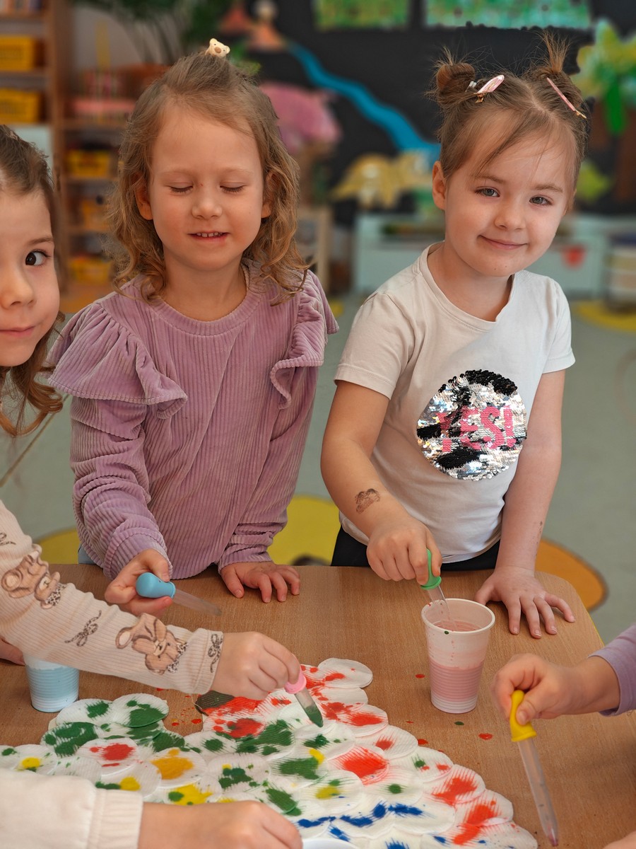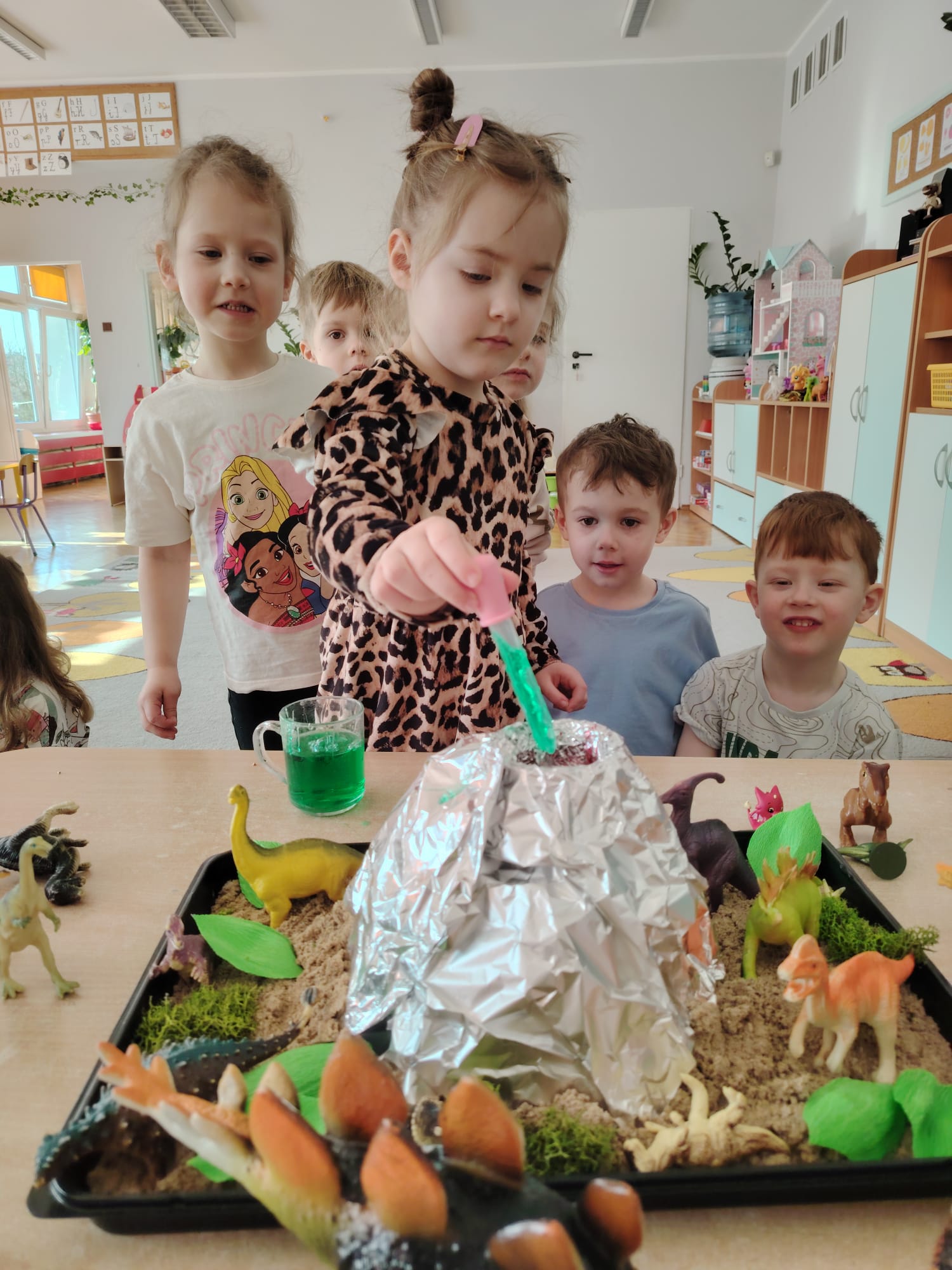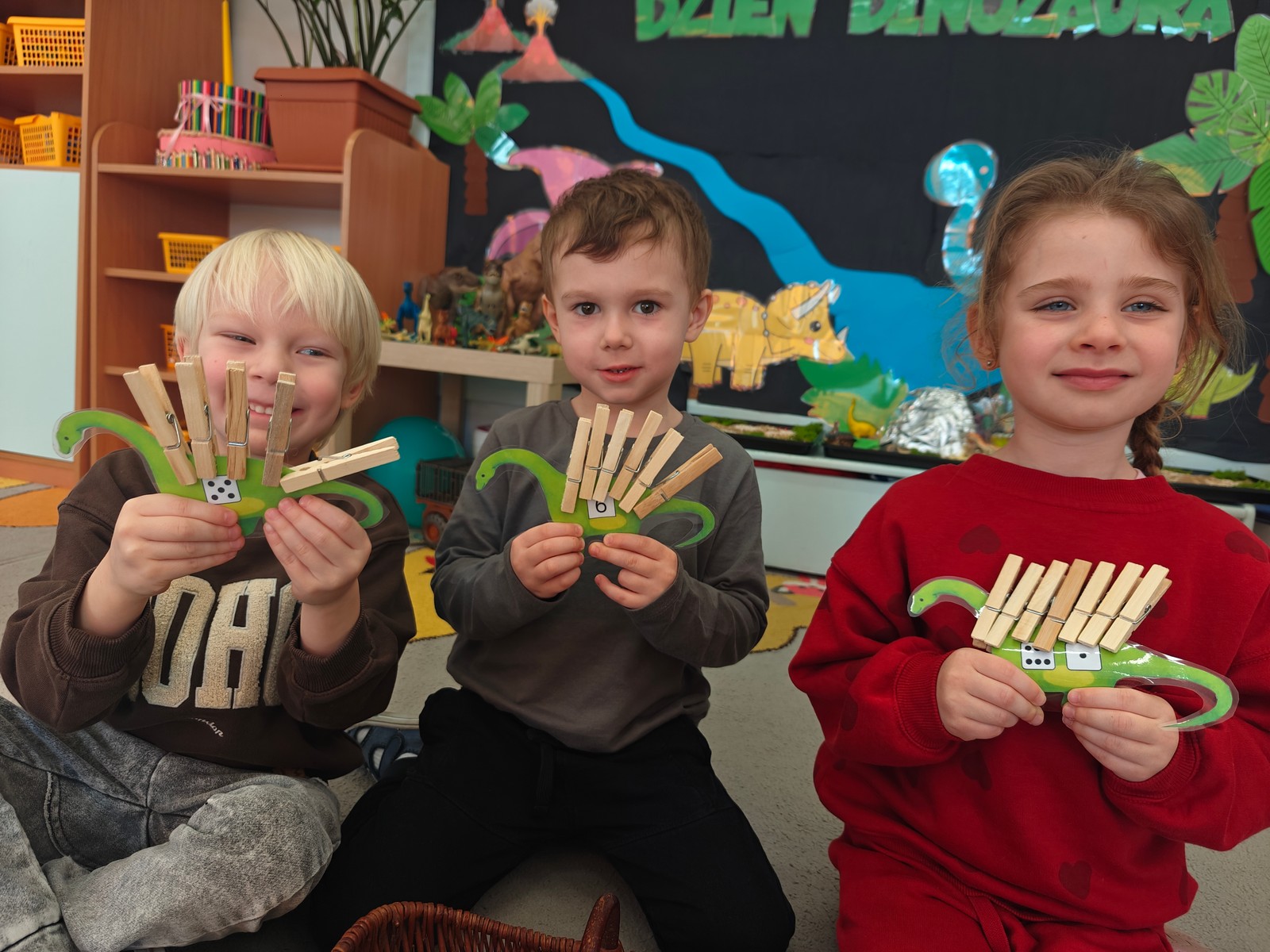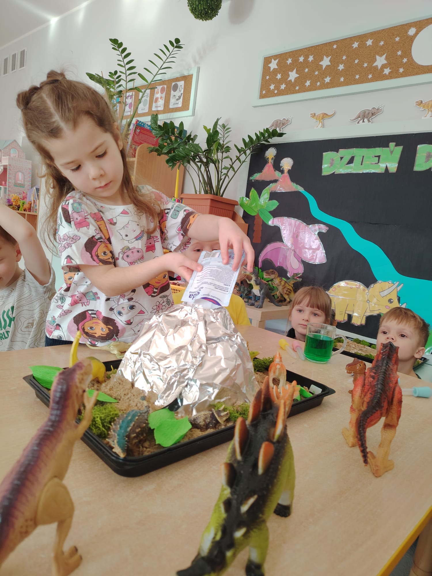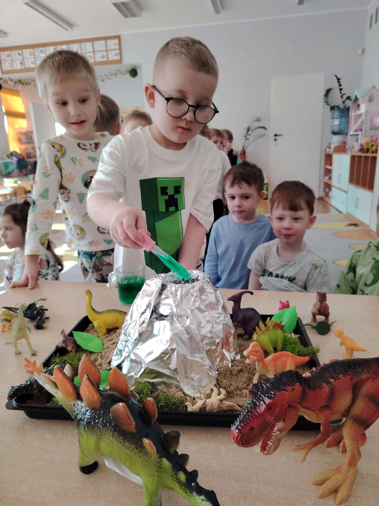 Dzieci z ogromnym zainteresowaniem przeniosły się w odległe czasy, aby poznać niezwykły świat dinozaurów i dowiedzieć się, jak wyglądało życie na Ziemi miliony lat temu. Podczas zajęć przedszkolaki poznawały różne gatunki dinozaurów, ich wygląd, sposób życia oraz ciekawostki związane z prehistorycznym światem. Dzieci z zaciekawieniem oglądały książki i ilustracje, słuchały opowiadań i uczestniczyły w rozmowach. W trakcie realizacji projektu nie zabrakło wielu ciekawych aktywności. Dużym zainteresowaniem cieszyły się zajęcia badawcze i eksperymenty. Dzieci obserwowały eksperyment przedstawiający wybuch wulkanu, dzięki czemu mogły dowiedzieć się, jakie zjawiska przyrodnicze występowały na Ziemi w czasach prehistorycznych. Przedszkolaki wcielały się w rolę małych paleontologów, poszukiwały „dinozaurowe skamieniałości”, tropiły ślady dinozaurów oraz brały udział w zabawach ruchowych i dydaktycznych związanych z tematyką prehistorii. Realizacja projektu była dla dzieci fascynującą przygodą i okazją do zdobywania nowej wiedzy poprzez zabawę, doświadczenia i wspólne odkrywanie tajemnic prehistorycznego świata dinozaurów. Zapraszamy do galerii!