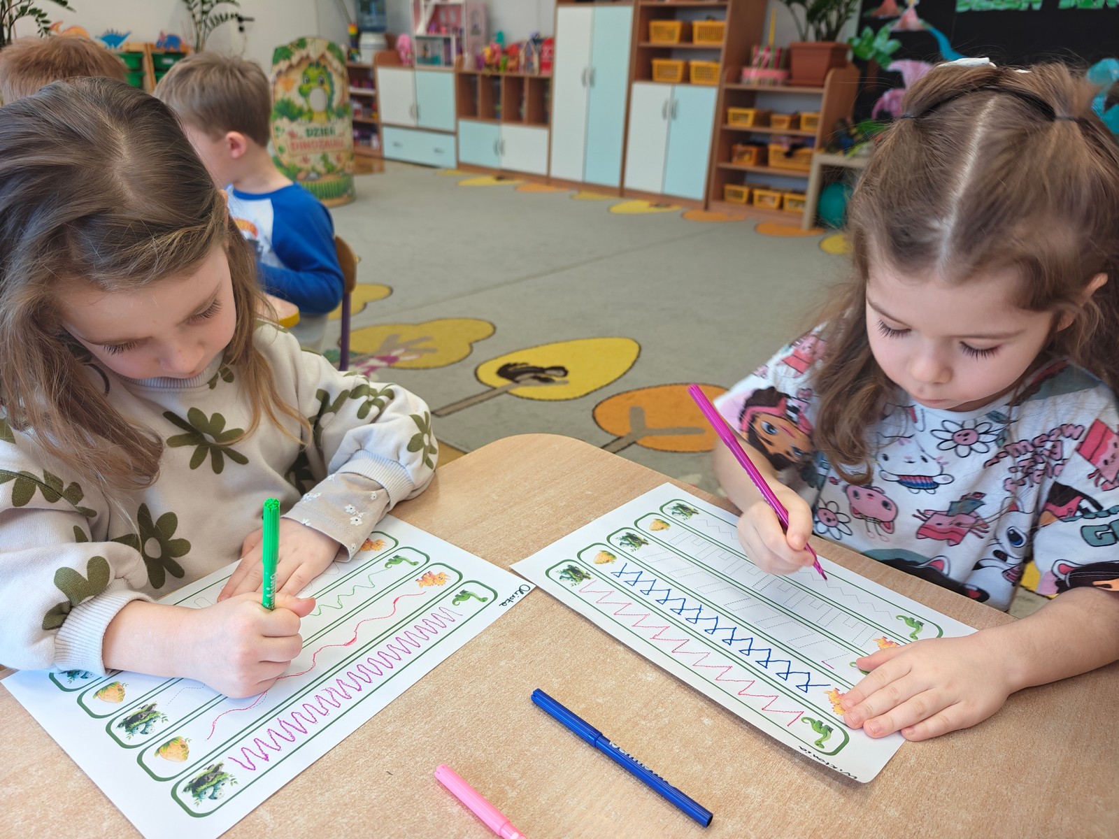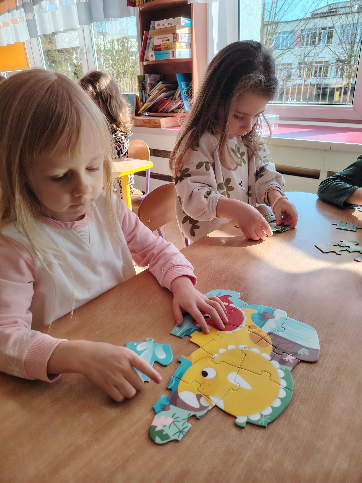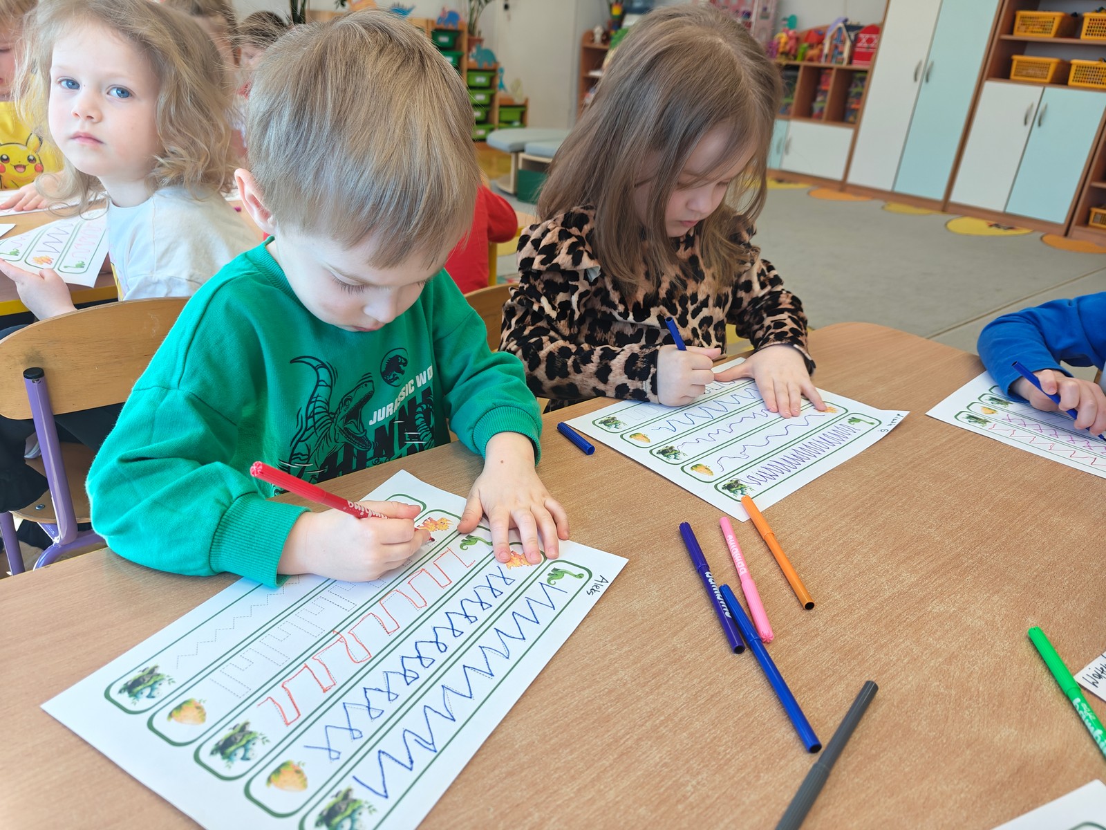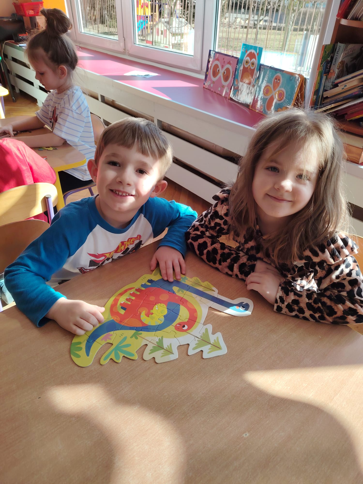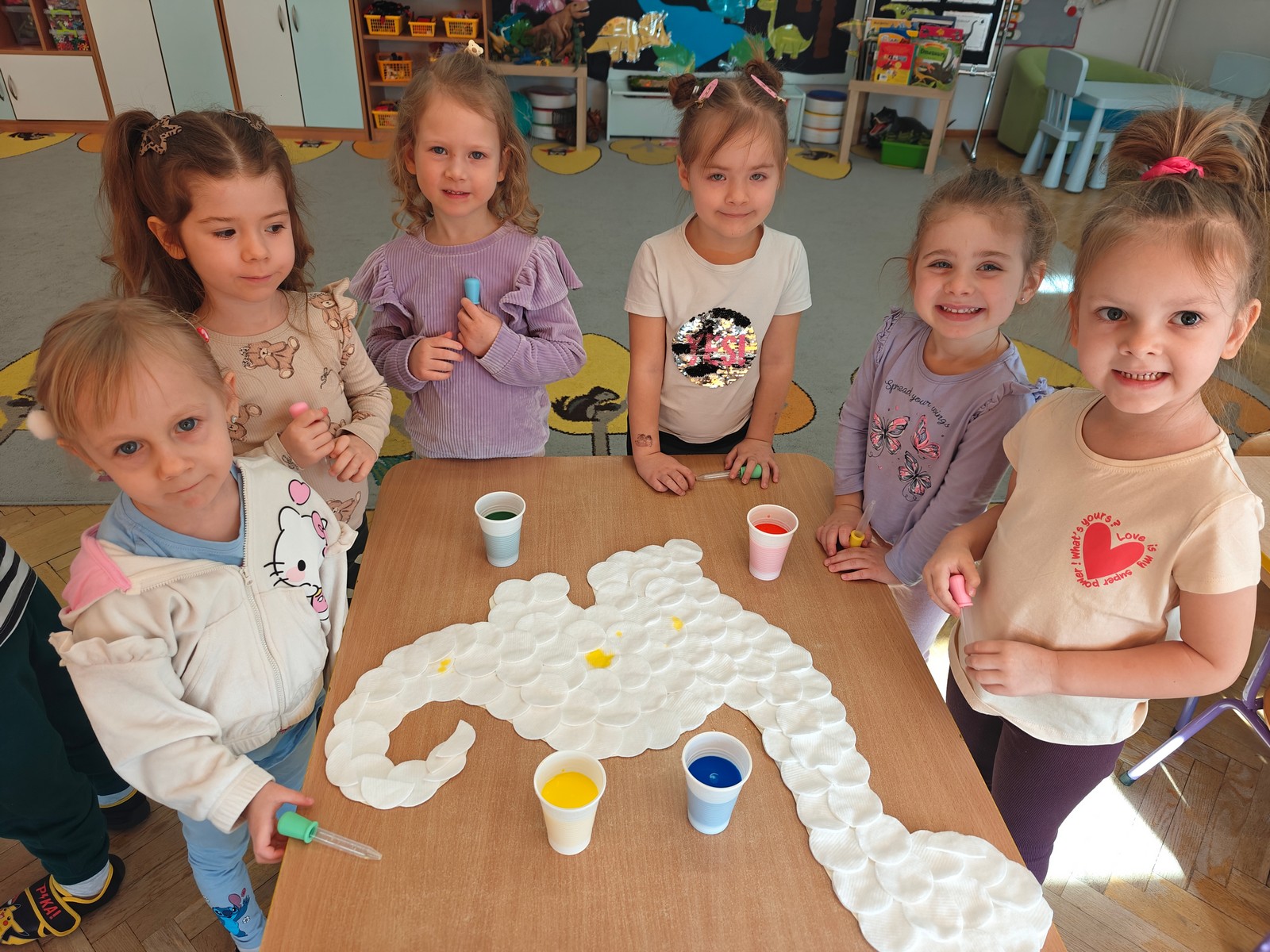 Dzieci z ogromnym zainteresowaniem przeniosły się w odległe czasy, aby poznać niezwykły świat dinozaurów i dowiedzieć się, jak wyglądało życie na Ziemi miliony lat temu. Podczas zajęć przedszkolaki poznawały różne gatunki dinozaurów, ich wygląd, sposób życia oraz ciekawostki związane z prehistorycznym światem. Dzieci z zaciekawieniem oglądały książki i ilustracje, słuchały opowiadań i uczestniczyły w rozmowach. W trakcie realizacji projektu nie zabrakło wielu ciekawych aktywności. Dużym zainteresowaniem cieszyły się zajęcia badawcze i eksperymenty. Dzieci obserwowały eksperyment przedstawiający wybuch wulkanu, dzięki czemu mogły dowiedzieć się, jakie zjawiska przyrodnicze występowały na Ziemi w czasach prehistorycznych. Przedszkolaki wcielały się w rolę małych paleontologów, poszukiwały „dinozaurowe skamieniałości”, tropiły ślady dinozaurów oraz brały udział w zabawach ruchowych i dydaktycznych związanych z tematyką prehistorii. Realizacja projektu była dla dzieci fascynującą przygodą i okazją do zdobywania nowej wiedzy poprzez zabawę, doświadczenia i wspólne odkrywanie tajemnic prehistorycznego świata dinozaurów. Zapraszamy do galerii!