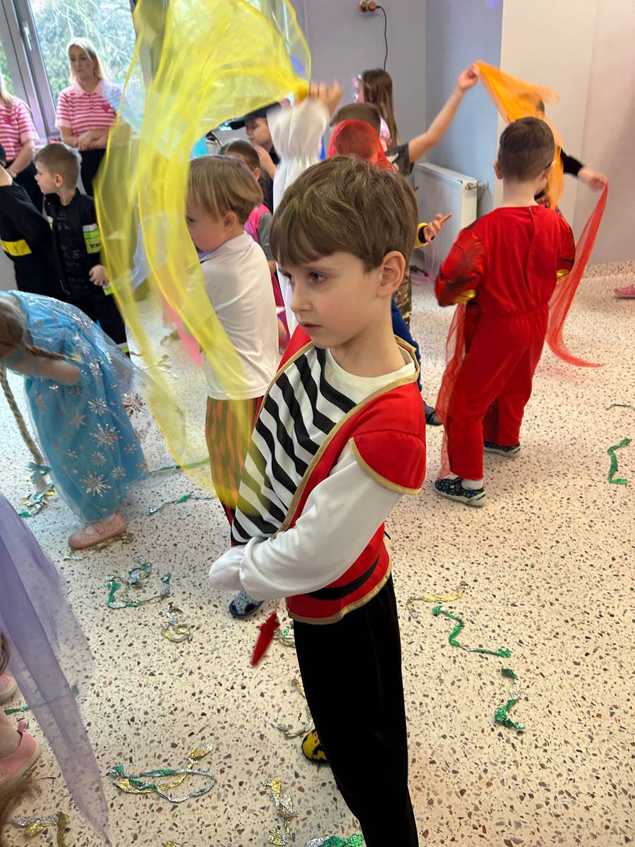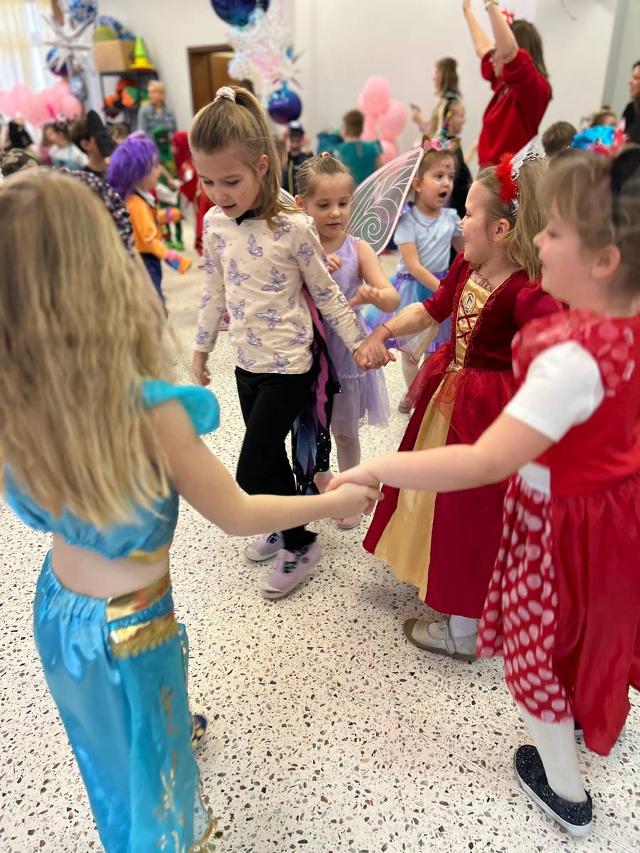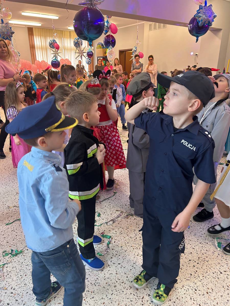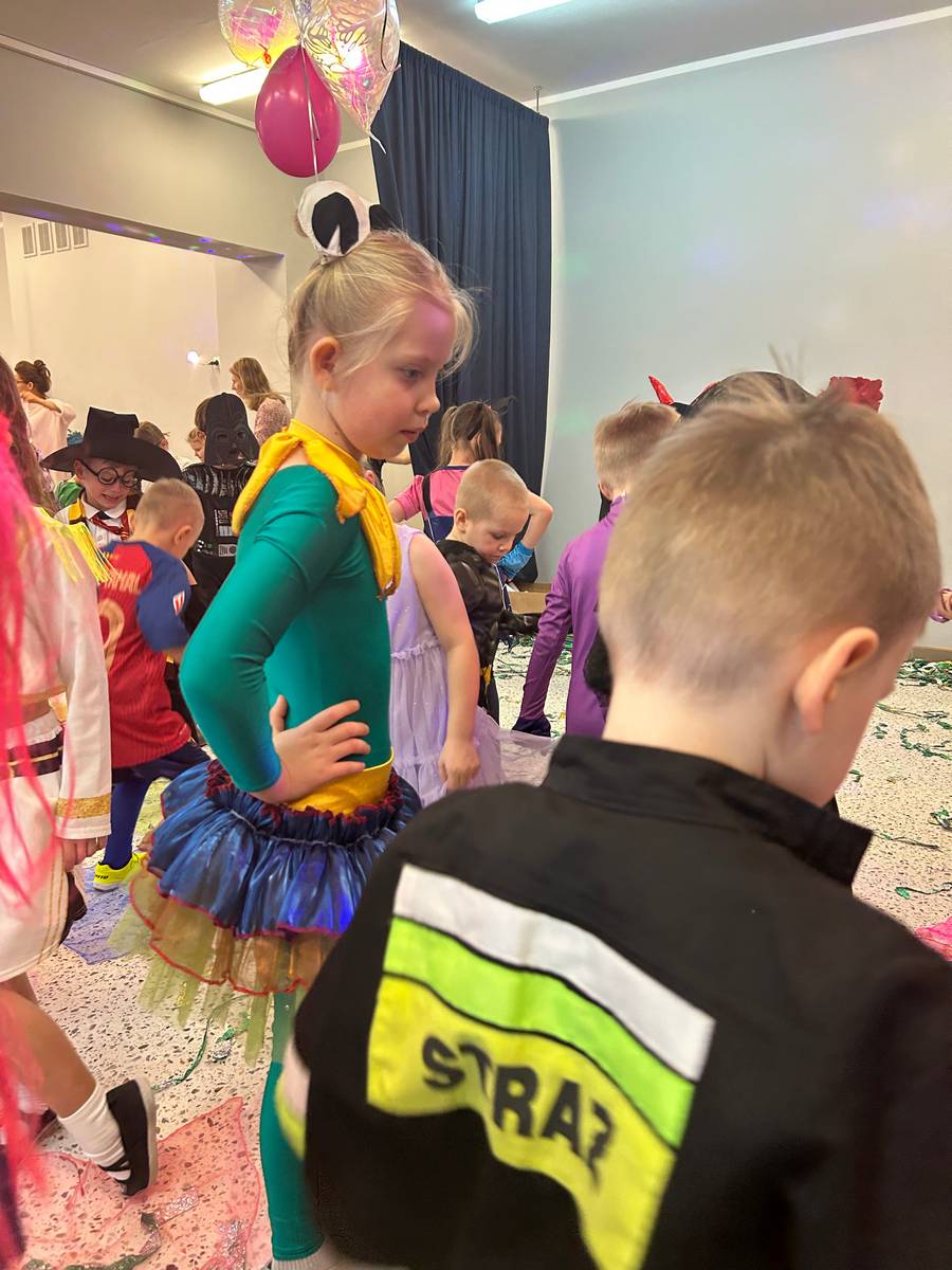 Za nami kolejny wspaniały bal Karnawałowy pełen muzyki, tańca i dziecięcej radości. Nasza sala zamieniła się w roztańczoną krainę wyobraźni. Na parkiecie pojawiło się wiele różnorodnych postaci: wróżki, policjanci, księżniczki, a nawet Józef Piłsudski. Wielobarwne stroje, uśmiechy i dużo energii towarzyszyło dzieciom już od pierwszych dźwięków muzyki aż do ostatniego tańca. Dzieci z ogromnym zaangażowaniem brały udział w zabawach tanecznych, konkursach. Nie zabrakło niezwykłych rekwizytów. Wyjątkową atrakcją okazały się być bańki mydlane, które unosiły się nad parkietem. Był to czas integracji grup, zabawy i dziecięcej radości. Z niecierpliwością będziemy czekali na kolejny bal!