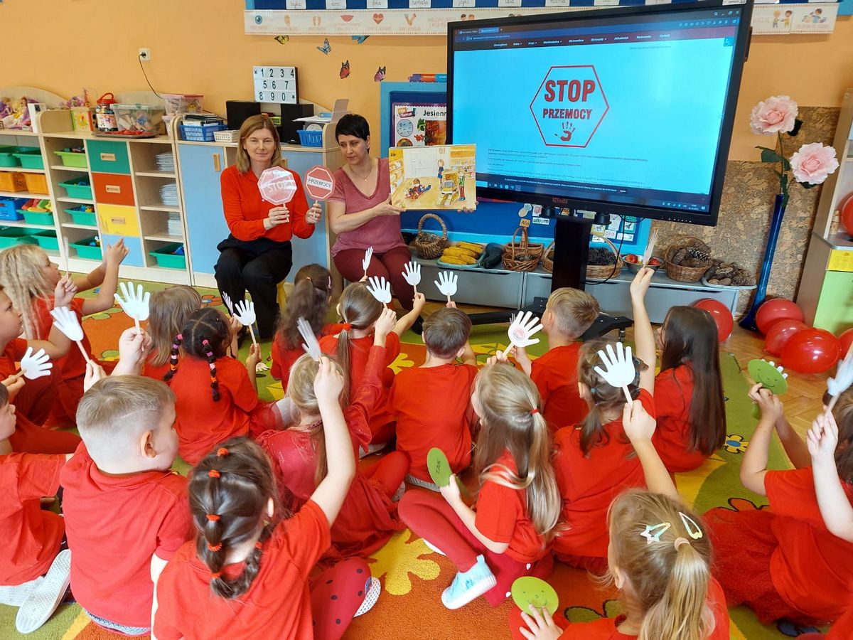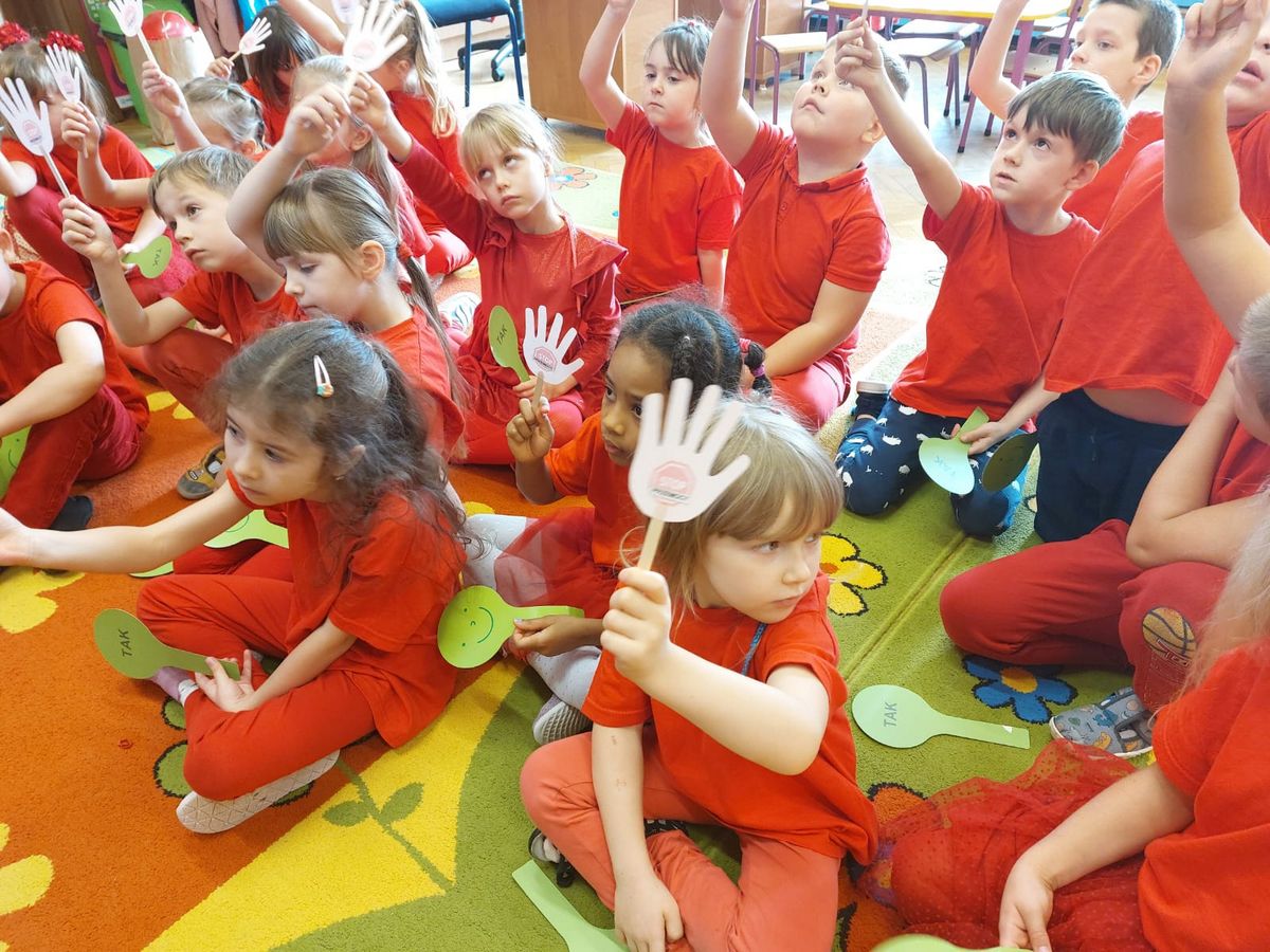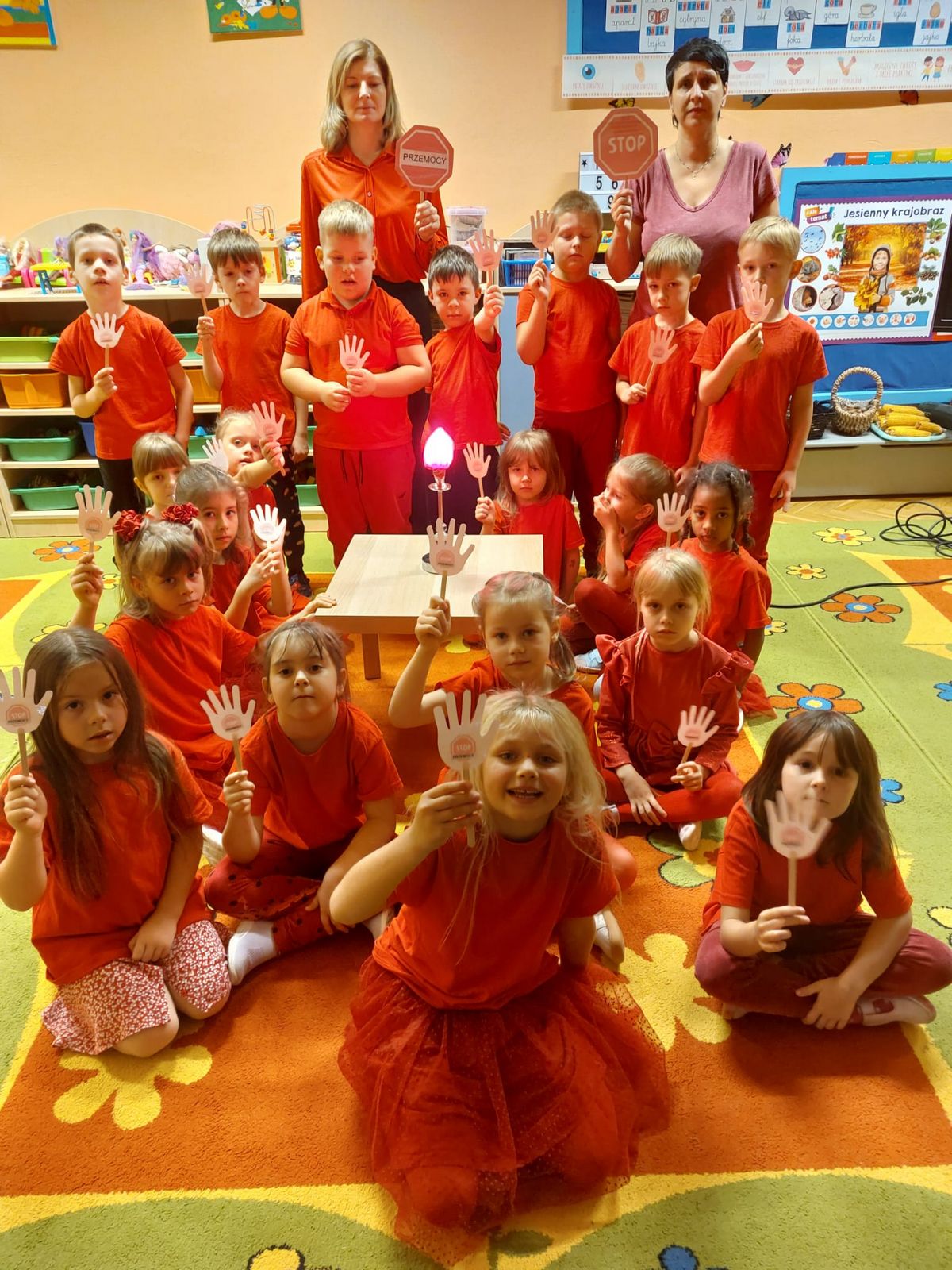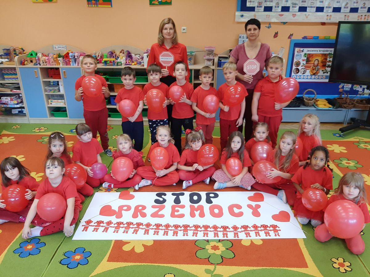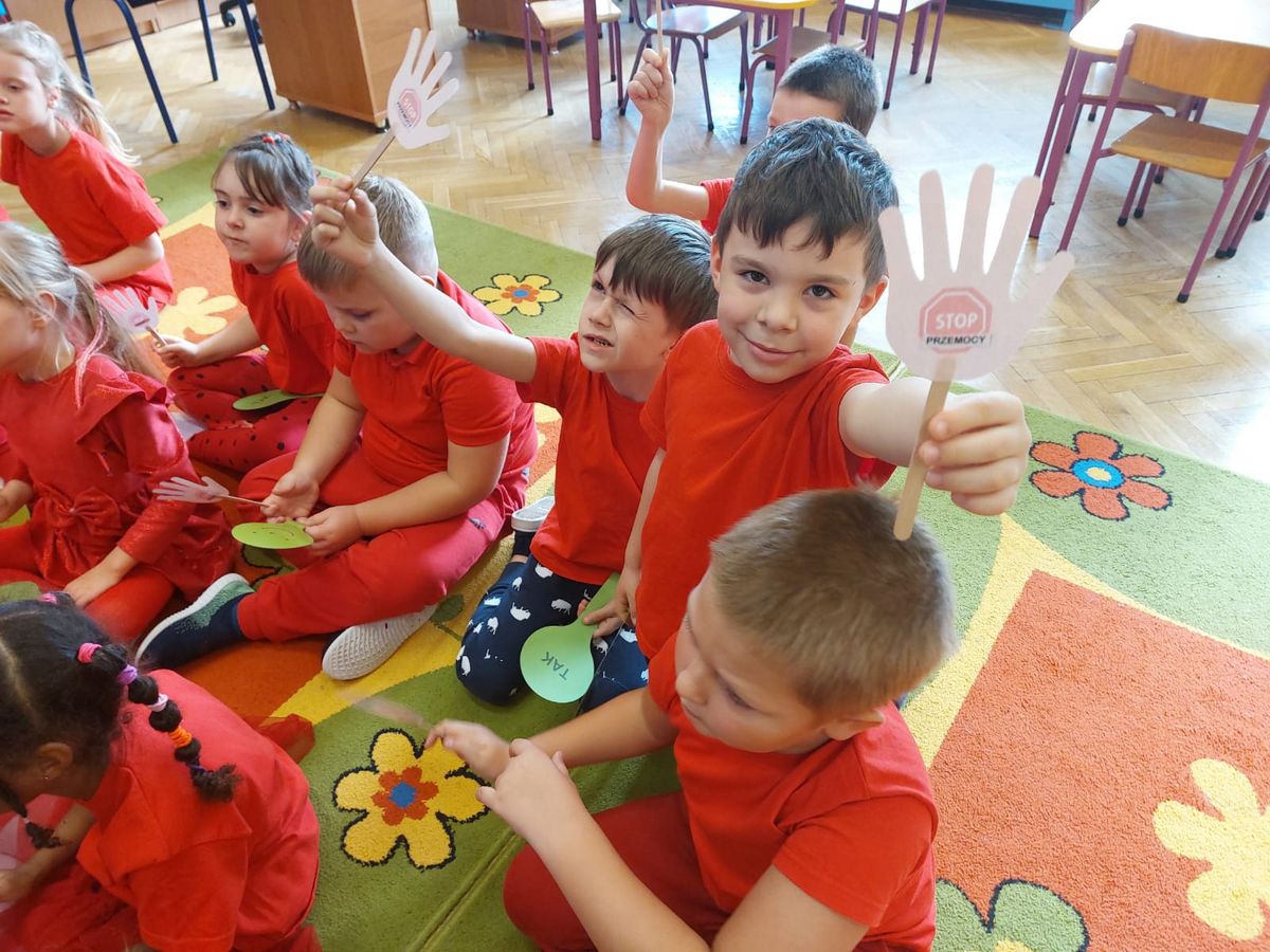 Przedszkolaki z grupy V dołączyły do Ogólnopolskiej kampanii „Dzieciństwo bez przemocy”, której celem jest przeciwdziałanie przemocy wobec dzieci. Dzieci uczestniczyły w zajęciach edukacyjnych pod hasłem „Stop Przemocy” podczas których wysłuchały opowiadania z książki „Nie daj się gnębić!” M. Młodnickiej i obejrzały film edukacyjny pt. „Powiedz Nie!”. Przedszkolaki zastanawiały się czym jest przemoc i jak można jej przeciwdziałać. Dowiedziały się w jaki sposób reagować na przemoc, gdzie szukać pomocy i dlaczego nie wolno pozostawać obojętnym wobec krzywdy innych. Dzieci uczestniczyły w zabawach ruchowych, odgrywały scenki dramowe i rozmawiały o różnych sytuacjach w domu lub przedszkolu, kiedy mogą powiedzieć: Stop Przemocy !. W symbolicznym geście solidarności i wsparcia kampanii w naszej sali zapaliliśmy czerwone światło jako wyraz sprzeciwu przeciw krzywdzeniu dzieci. Na zakończenie wspólnie wykonaliśmy plakat. To były bardzo ważne zajęcia, które pokazały, że każdy ma prawo do bezpieczeństwa i szacunku.