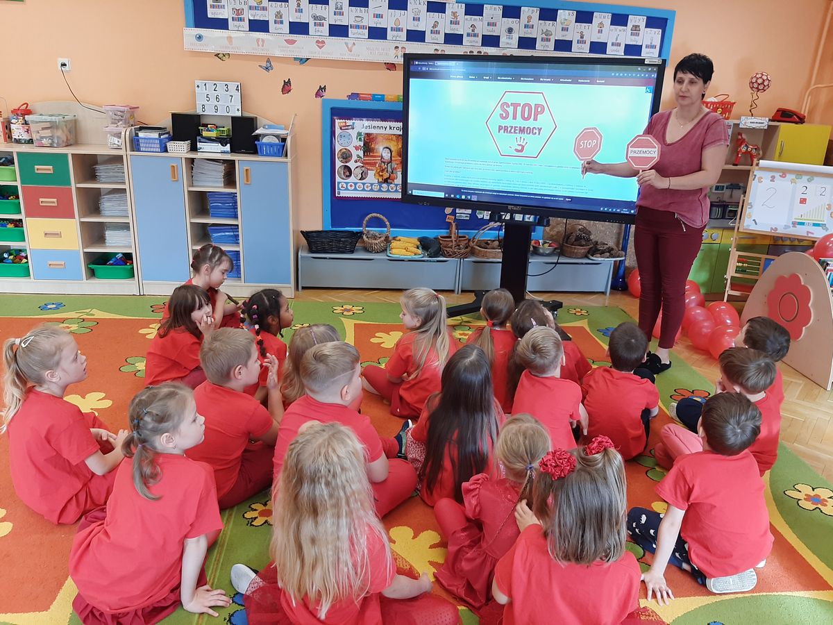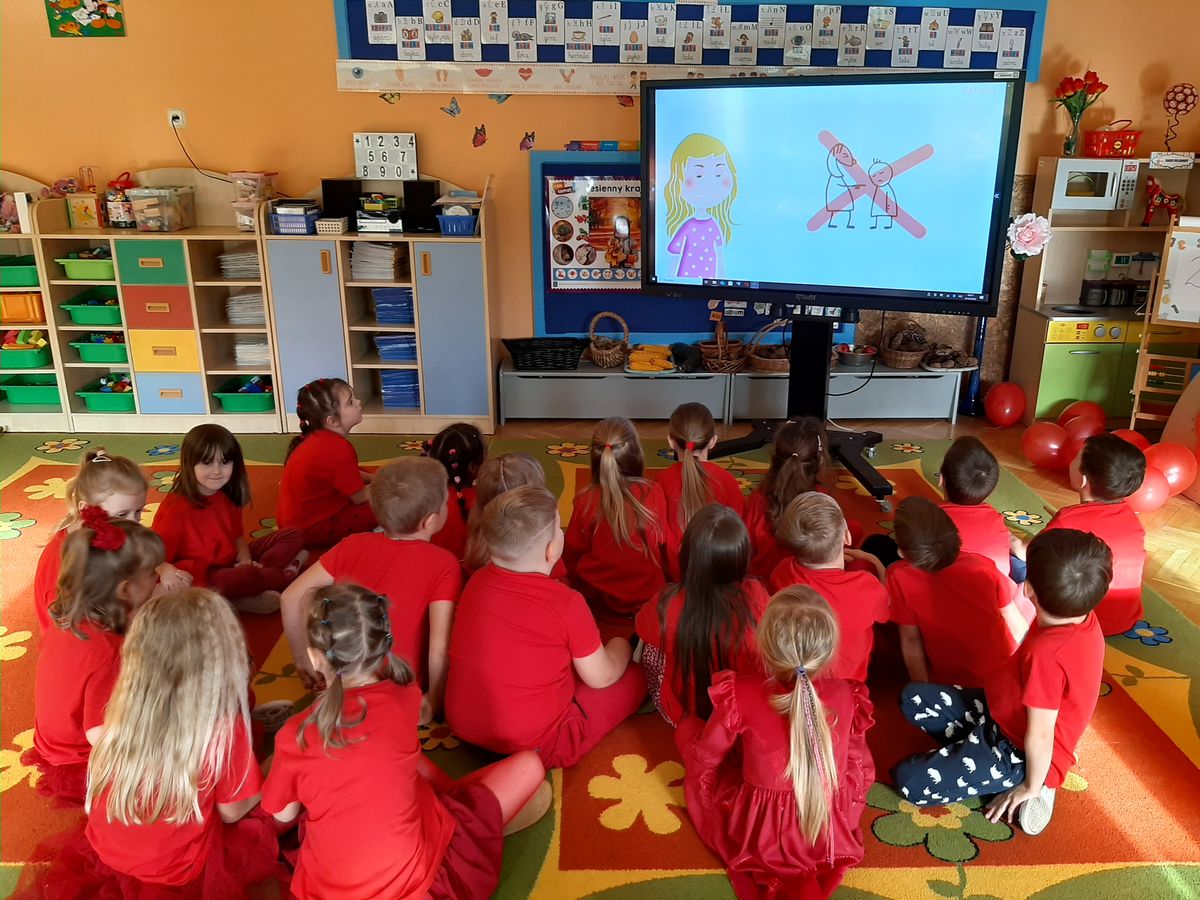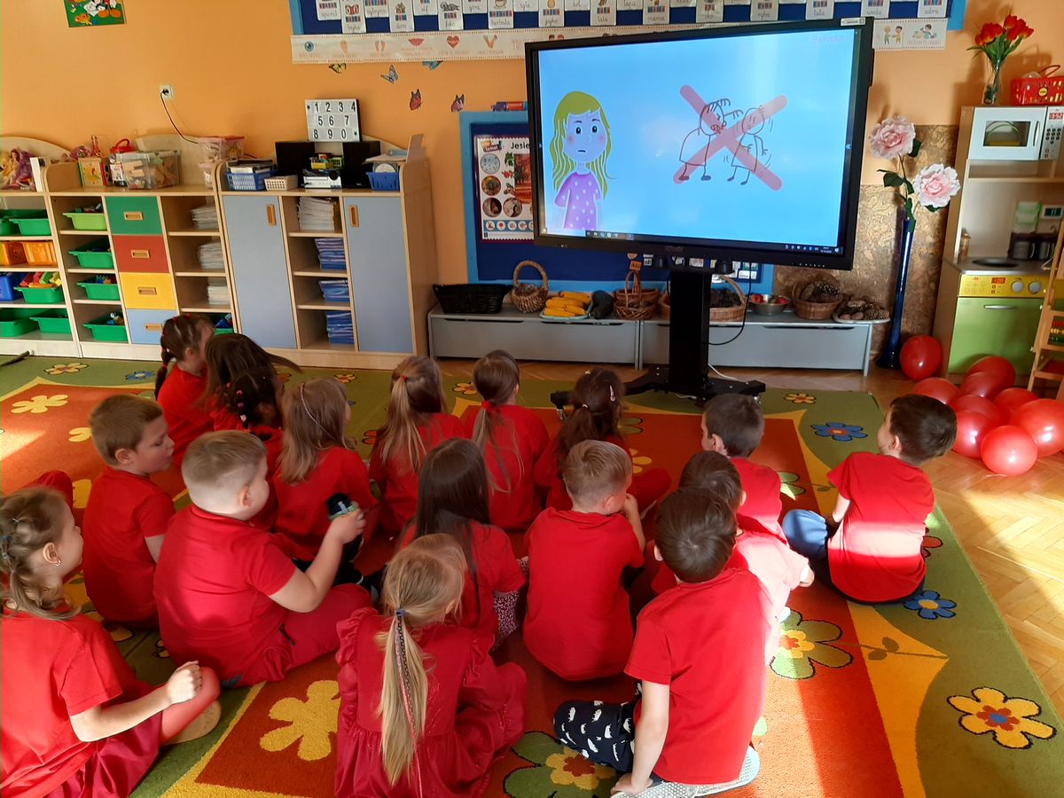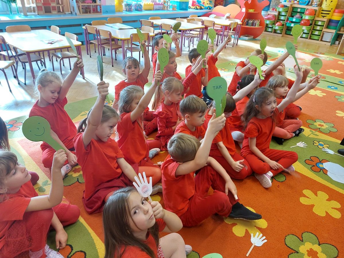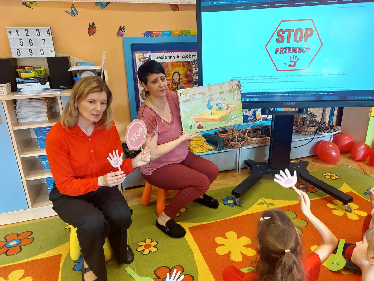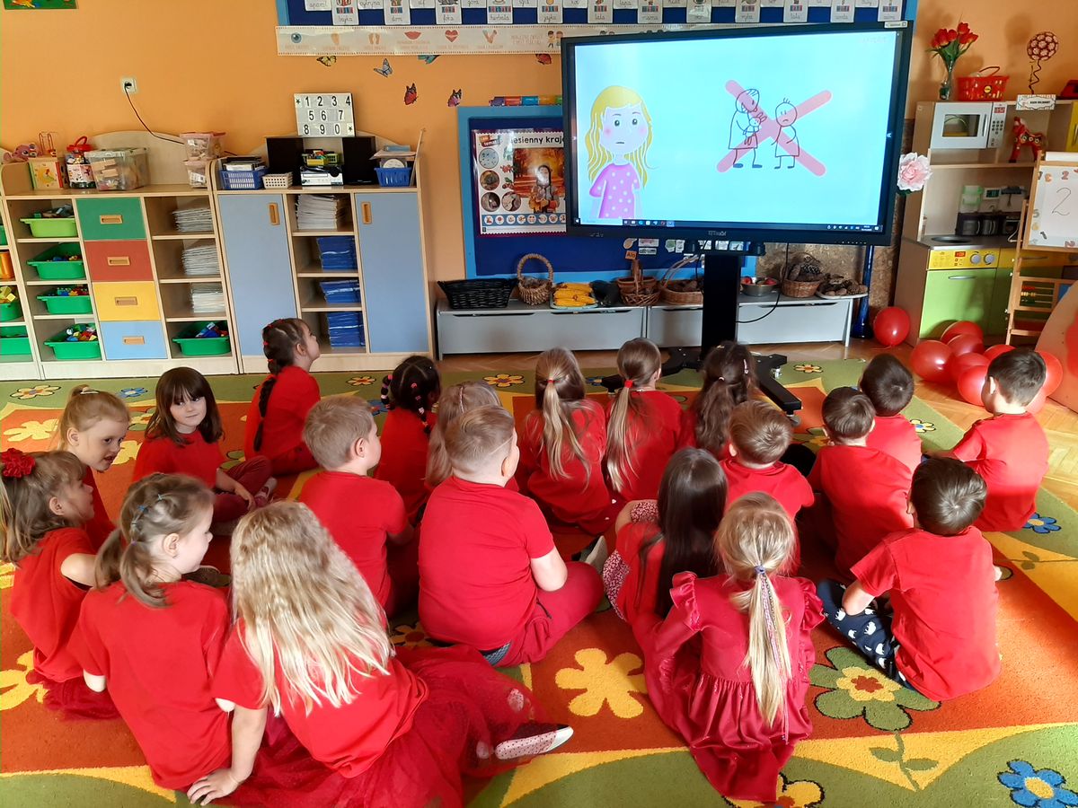 Przedszkolaki z grupy V dołączyły do Ogólnopolskiej kampanii „Dzieciństwo bez przemocy”, której celem jest przeciwdziałanie przemocy wobec dzieci. Dzieci uczestniczyły w zajęciach edukacyjnych pod hasłem „Stop Przemocy” podczas których wysłuchały opowiadania z książki „Nie daj się gnębić!” M. Młodnickiej i obejrzały film edukacyjny pt. „Powiedz Nie!”. Przedszkolaki zastanawiały się czym jest przemoc i jak można jej przeciwdziałać. Dowiedziały się w jaki sposób reagować na przemoc, gdzie szukać pomocy i dlaczego nie wolno pozostawać obojętnym wobec krzywdy innych. Dzieci uczestniczyły w zabawach ruchowych, odgrywały scenki dramowe i rozmawiały o różnych sytuacjach w domu lub przedszkolu, kiedy mogą powiedzieć: Stop Przemocy !. W symbolicznym geście solidarności i wsparcia kampanii w naszej sali zapaliliśmy czerwone światło jako wyraz sprzeciwu przeciw krzywdzeniu dzieci. Na zakończenie wspólnie wykonaliśmy plakat. To były bardzo ważne zajęcia, które pokazały, że każdy ma prawo do bezpieczeństwa i szacunku.