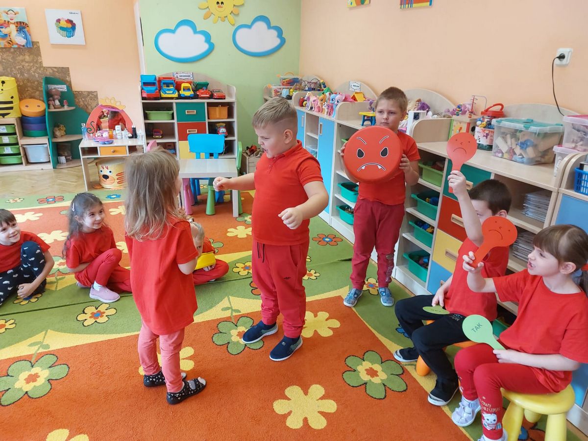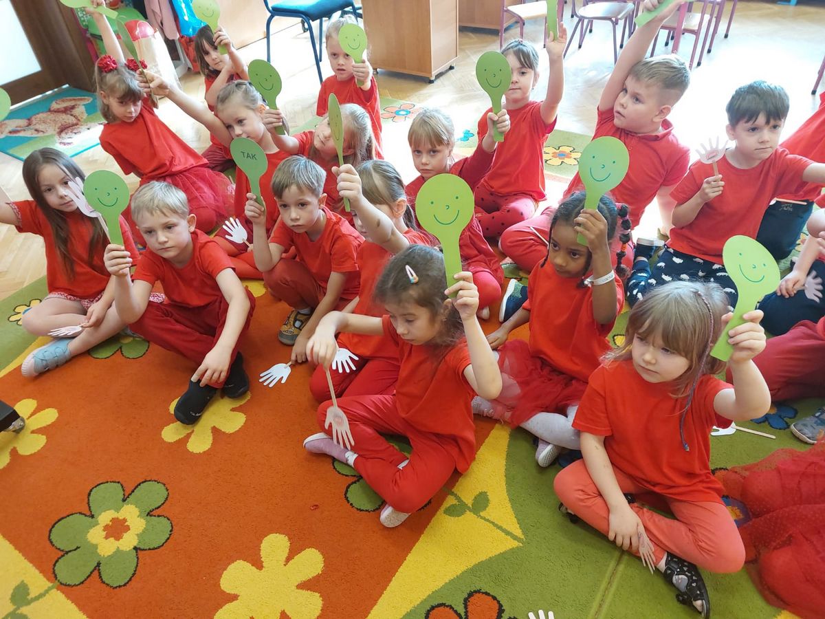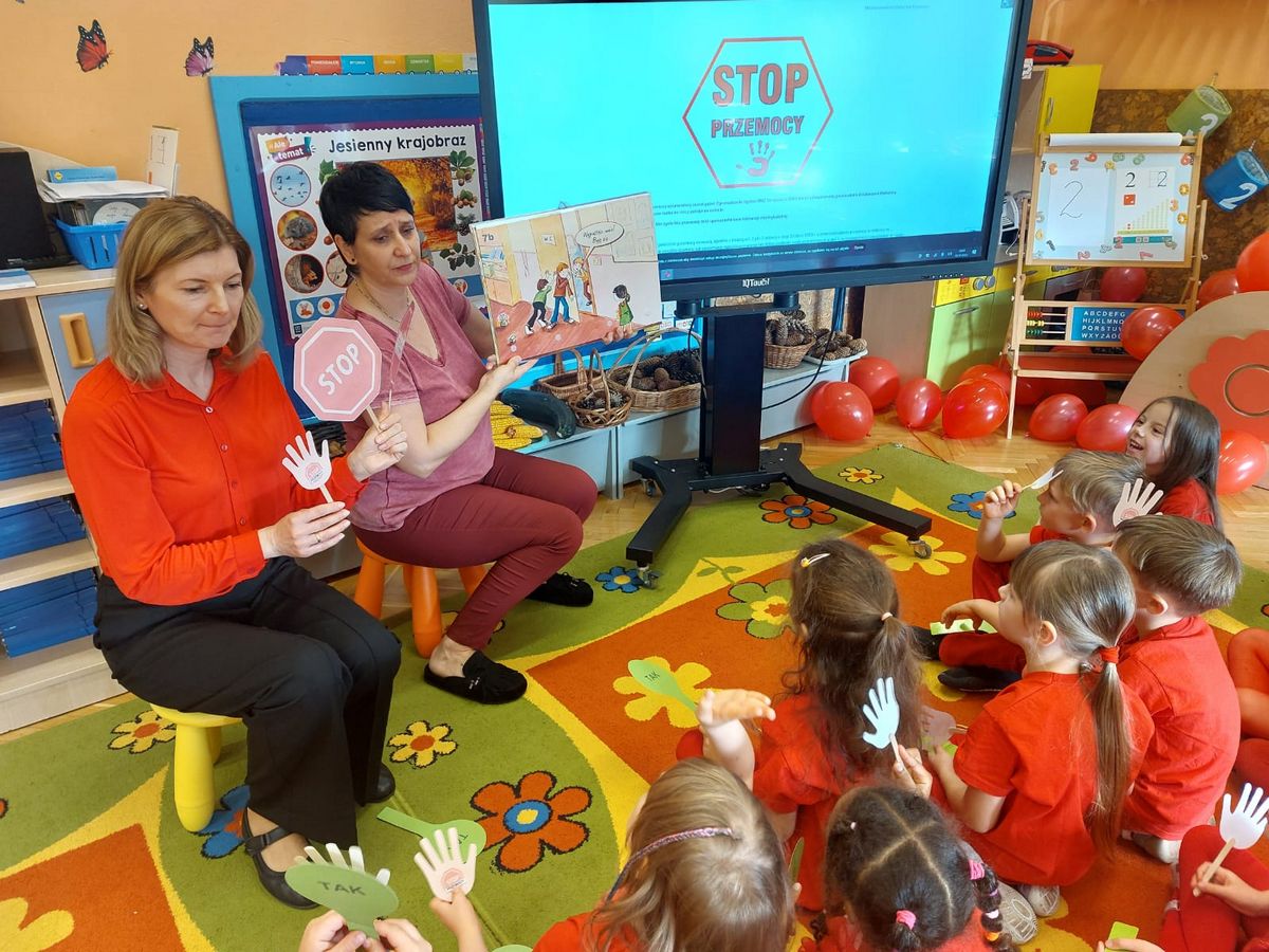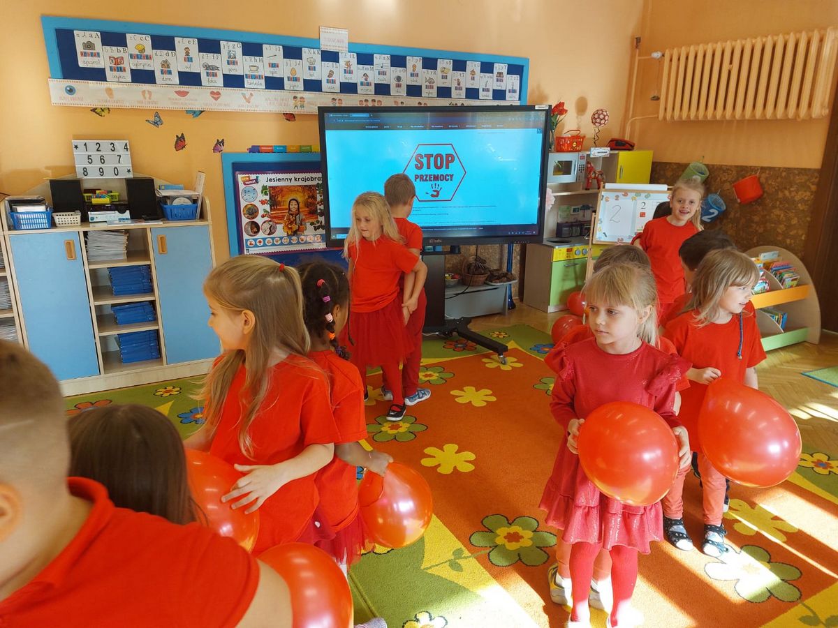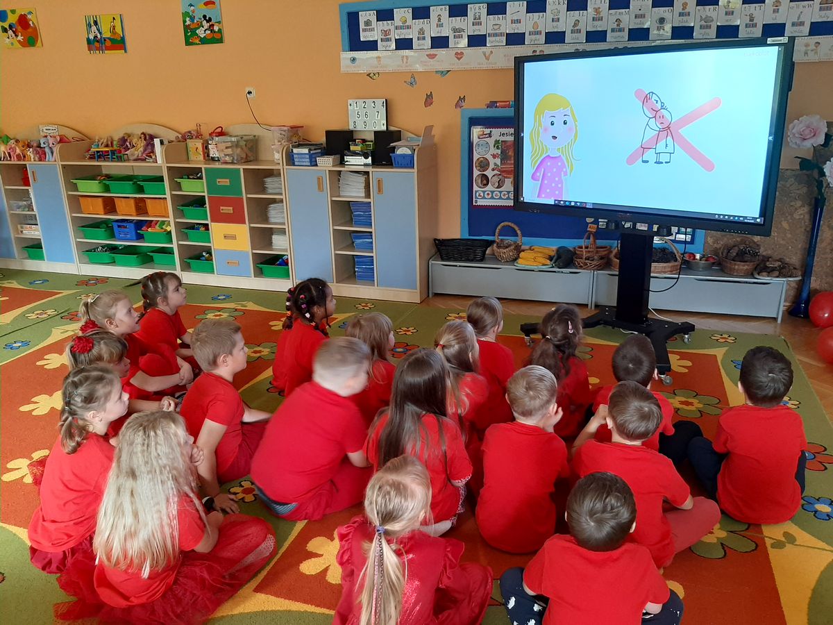 Przedszkolaki z grupy V dołączyły do Ogólnopolskiej kampanii „Dzieciństwo bez przemocy”, której celem jest przeciwdziałanie przemocy wobec dzieci. Dzieci uczestniczyły w zajęciach edukacyjnych pod hasłem „Stop Przemocy” podczas których wysłuchały opowiadania z książki „Nie daj się gnębić!” M. Młodnickiej i obejrzały film edukacyjny pt. „Powiedz Nie!”. Przedszkolaki zastanawiały się czym jest przemoc i jak można jej przeciwdziałać. Dowiedziały się w jaki sposób reagować na przemoc, gdzie szukać pomocy i dlaczego nie wolno pozostawać obojętnym wobec krzywdy innych. Dzieci uczestniczyły w zabawach ruchowych, odgrywały scenki dramowe i rozmawiały o różnych sytuacjach w domu lub przedszkolu, kiedy mogą powiedzieć: Stop Przemocy !. W symbolicznym geście solidarności i wsparcia kampanii w naszej sali zapaliliśmy czerwone światło jako wyraz sprzeciwu przeciw krzywdzeniu dzieci. Na zakończenie wspólnie wykonaliśmy plakat. To były bardzo ważne zajęcia, które pokazały, że każdy ma prawo do bezpieczeństwa i szacunku.