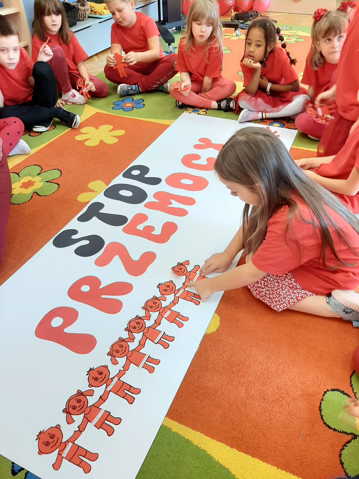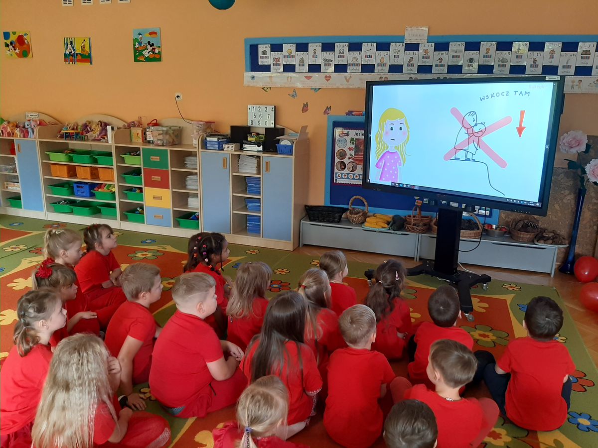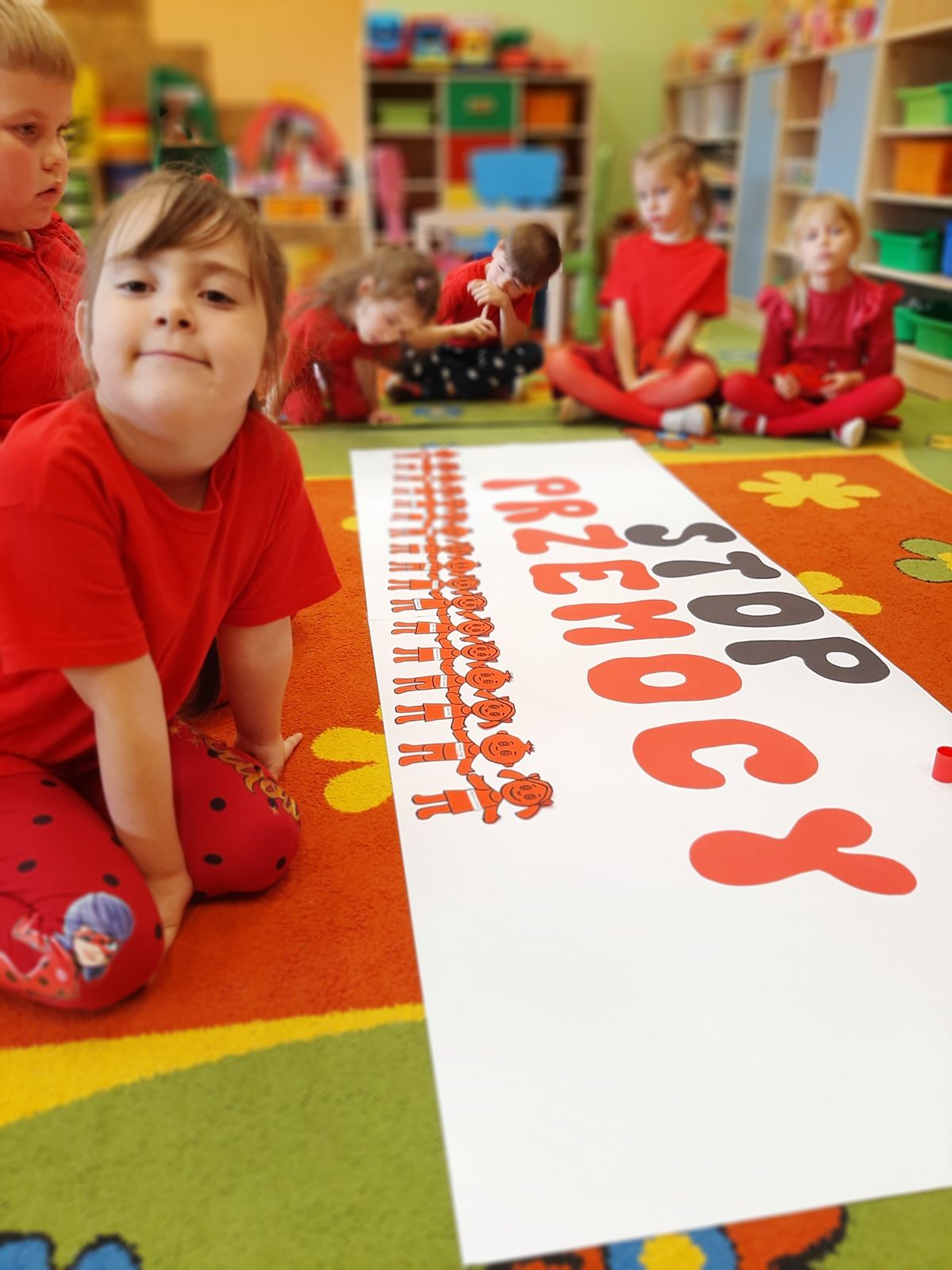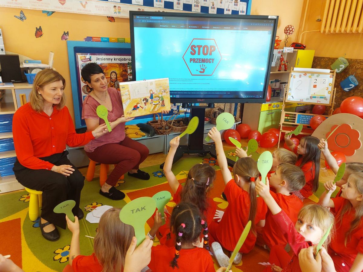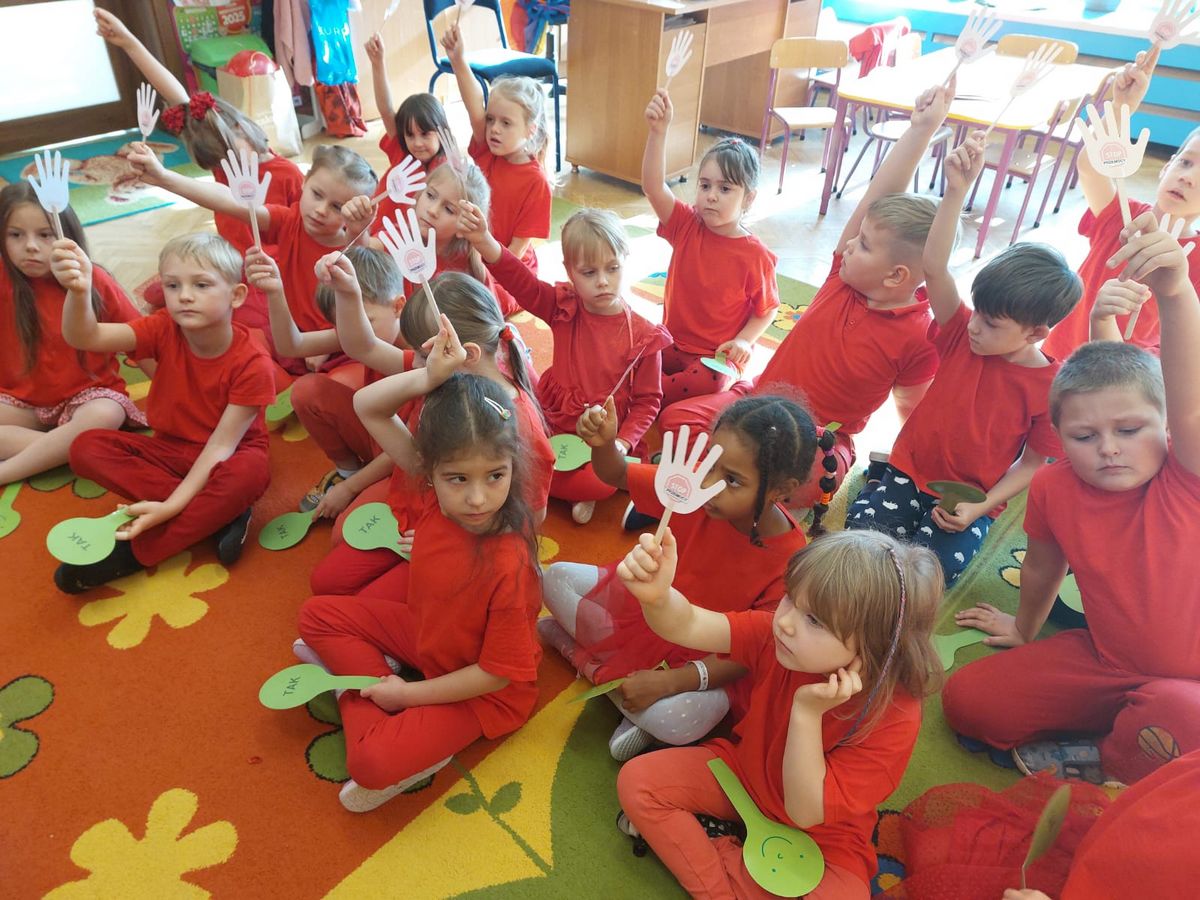 Przedszkolaki z grupy V dołączyły do Ogólnopolskiej kampanii „Dzieciństwo bez przemocy”, której celem jest przeciwdziałanie przemocy wobec dzieci. Dzieci uczestniczyły w zajęciach edukacyjnych pod hasłem „Stop Przemocy” podczas których wysłuchały opowiadania z książki „Nie daj się gnębić!” M. Młodnickiej i obejrzały film edukacyjny pt. „Powiedz Nie!”. Przedszkolaki zastanawiały się czym jest przemoc i jak można jej przeciwdziałać. Dowiedziały się w jaki sposób reagować na przemoc, gdzie szukać pomocy i dlaczego nie wolno pozostawać obojętnym wobec krzywdy innych. Dzieci uczestniczyły w zabawach ruchowych, odgrywały scenki dramowe i rozmawiały o różnych sytuacjach w domu lub przedszkolu, kiedy mogą powiedzieć: Stop Przemocy !. W symbolicznym geście solidarności i wsparcia kampanii w naszej sali zapaliliśmy czerwone światło jako wyraz sprzeciwu przeciw krzywdzeniu dzieci. Na zakończenie wspólnie wykonaliśmy plakat. To były bardzo ważne zajęcia, które pokazały, że każdy ma prawo do bezpieczeństwa i szacunku.