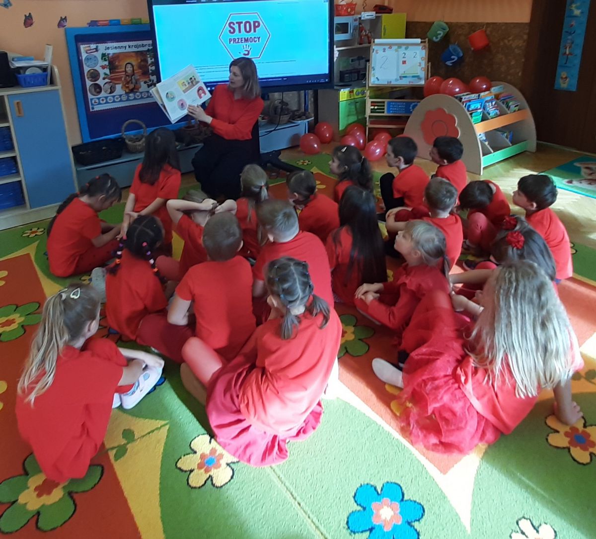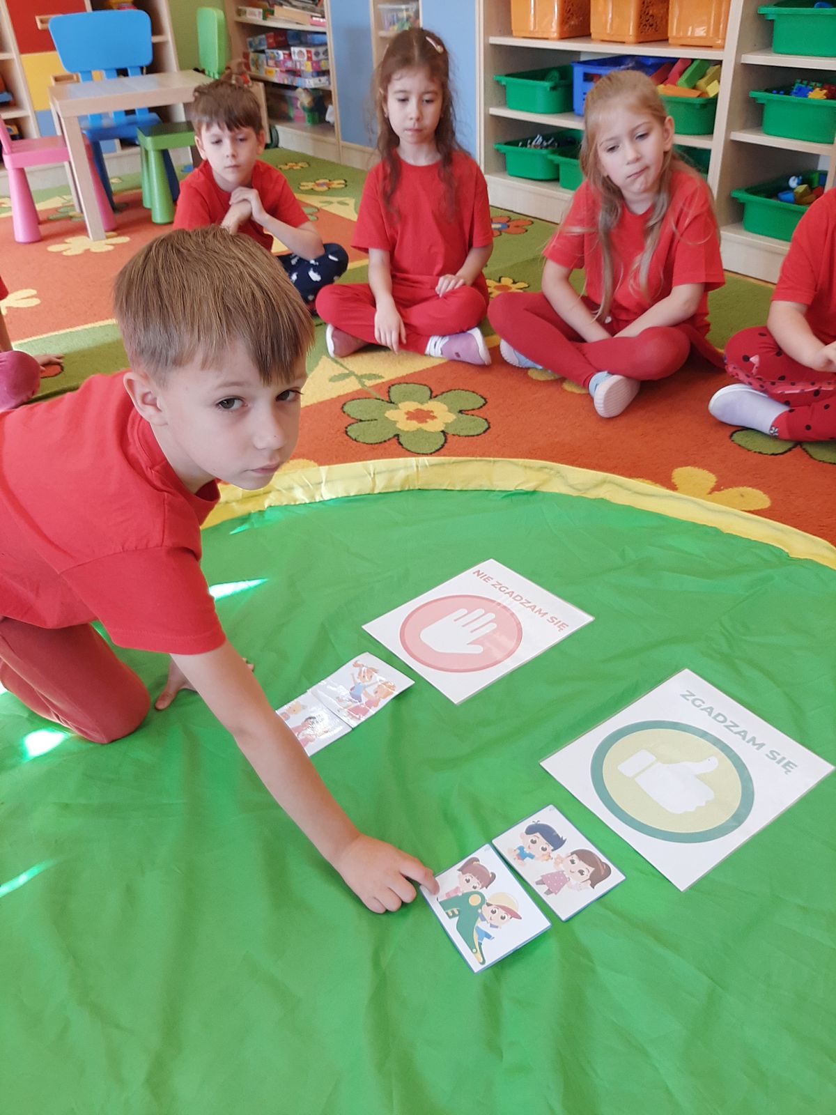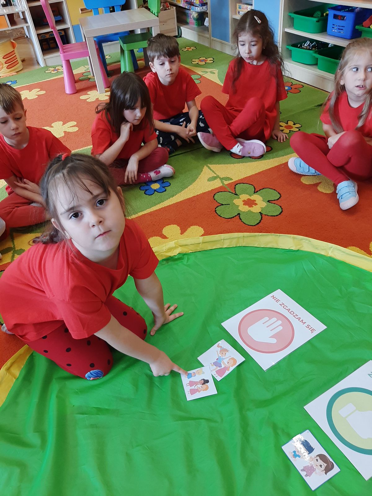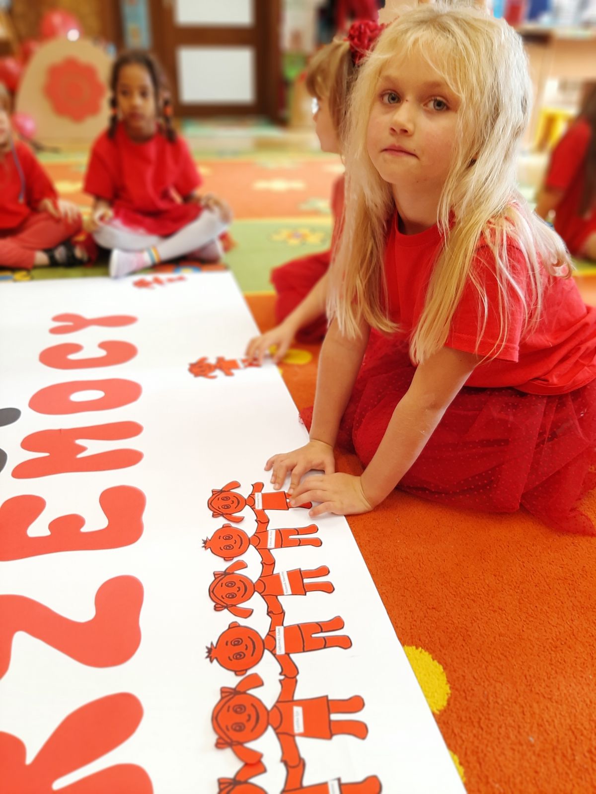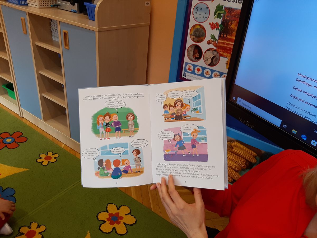 Przedszkolaki z grupy V dołączyły do Ogólnopolskiej kampanii „Dzieciństwo bez przemocy”, której celem jest przeciwdziałanie przemocy wobec dzieci. Dzieci uczestniczyły w zajęciach edukacyjnych pod hasłem „Stop Przemocy” podczas których wysłuchały opowiadania z książki „Nie daj się gnębić!” M. Młodnickiej i obejrzały film edukacyjny pt. „Powiedz Nie!”. Przedszkolaki zastanawiały się czym jest przemoc i jak można jej przeciwdziałać. Dowiedziały się w jaki sposób reagować na przemoc, gdzie szukać pomocy i dlaczego nie wolno pozostawać obojętnym wobec krzywdy innych. Dzieci uczestniczyły w zabawach ruchowych, odgrywały scenki dramowe i rozmawiały o różnych sytuacjach w domu lub przedszkolu, kiedy mogą powiedzieć: Stop Przemocy !. W symbolicznym geście solidarności i wsparcia kampanii w naszej sali zapaliliśmy czerwone światło jako wyraz sprzeciwu przeciw krzywdzeniu dzieci. Na zakończenie wspólnie wykonaliśmy plakat. To były bardzo ważne zajęcia, które pokazały, że każdy ma prawo do bezpieczeństwa i szacunku.