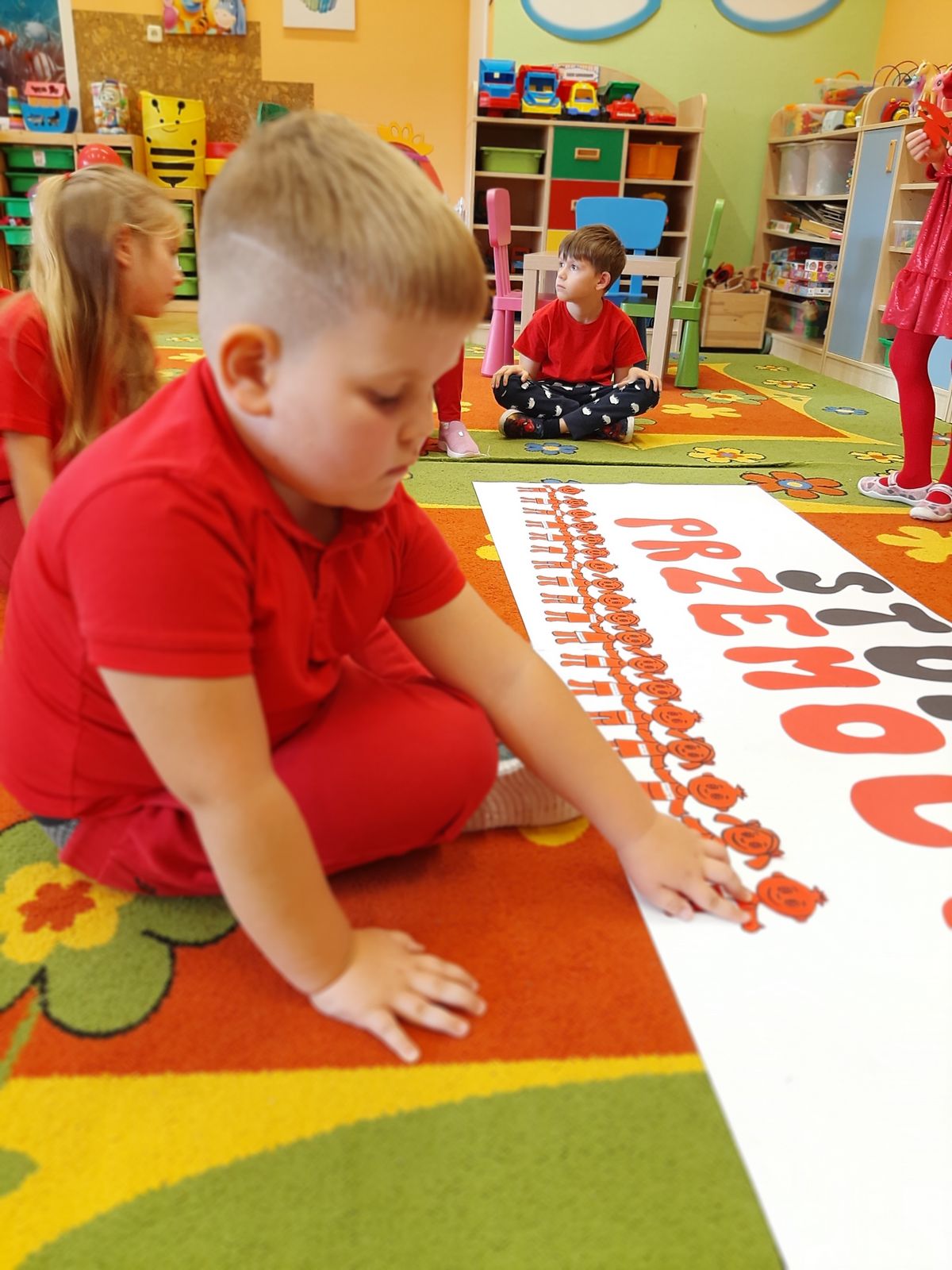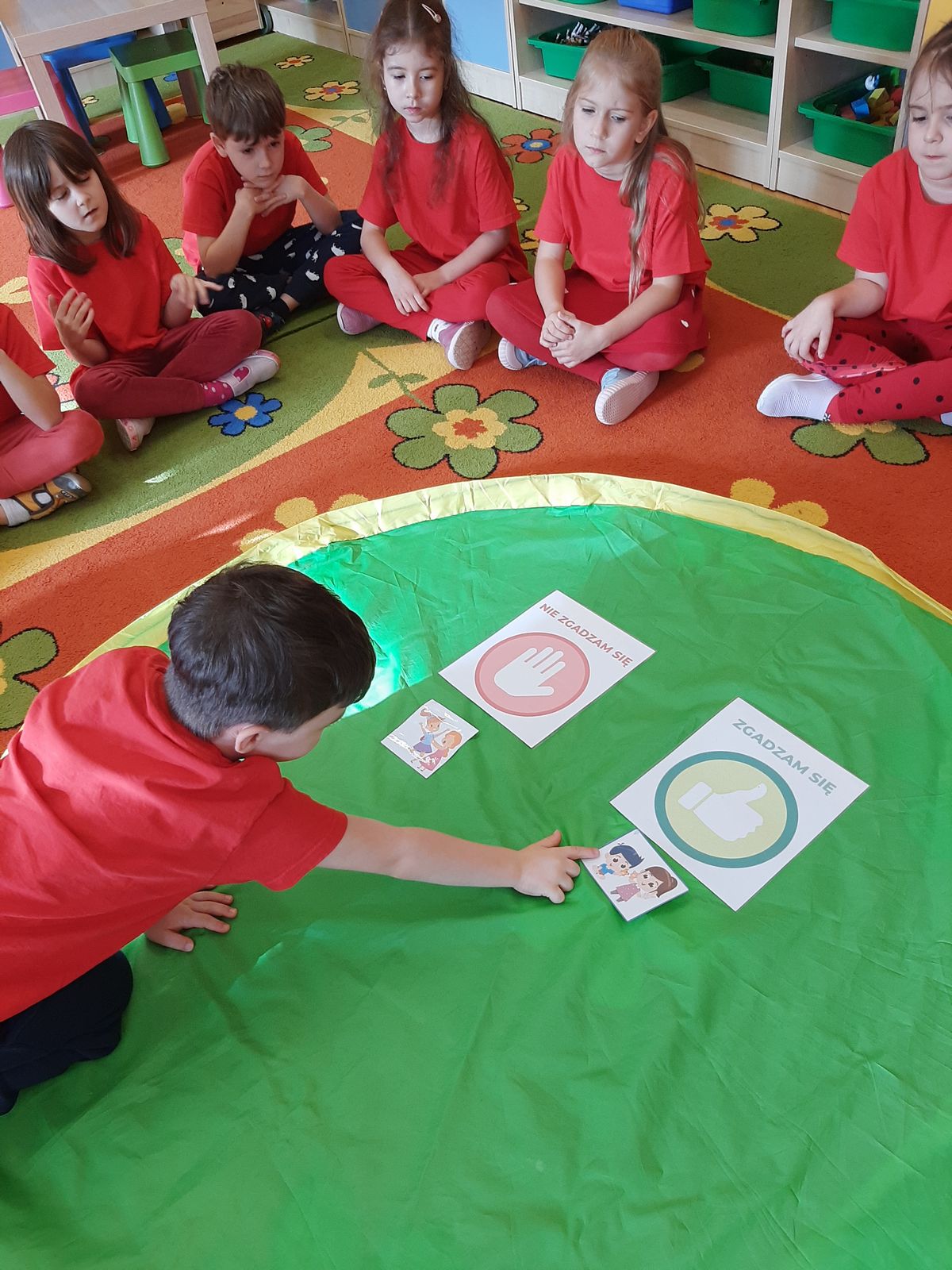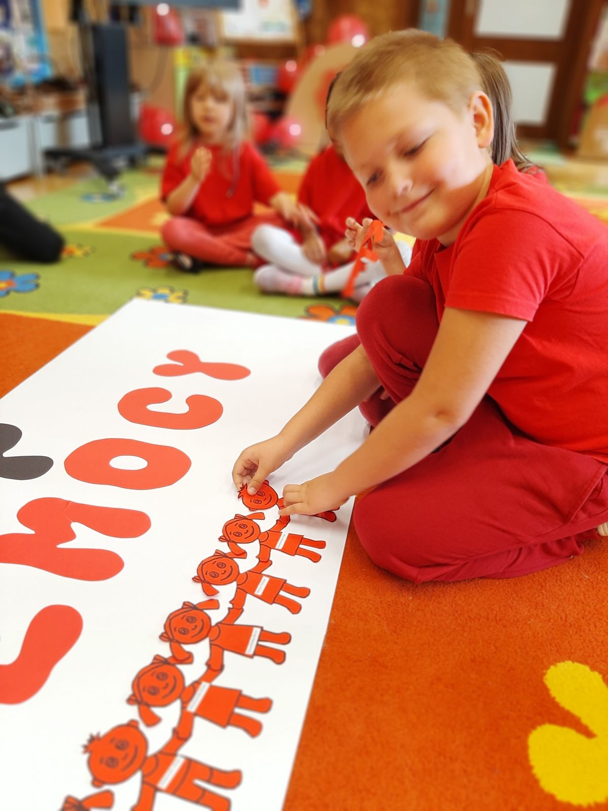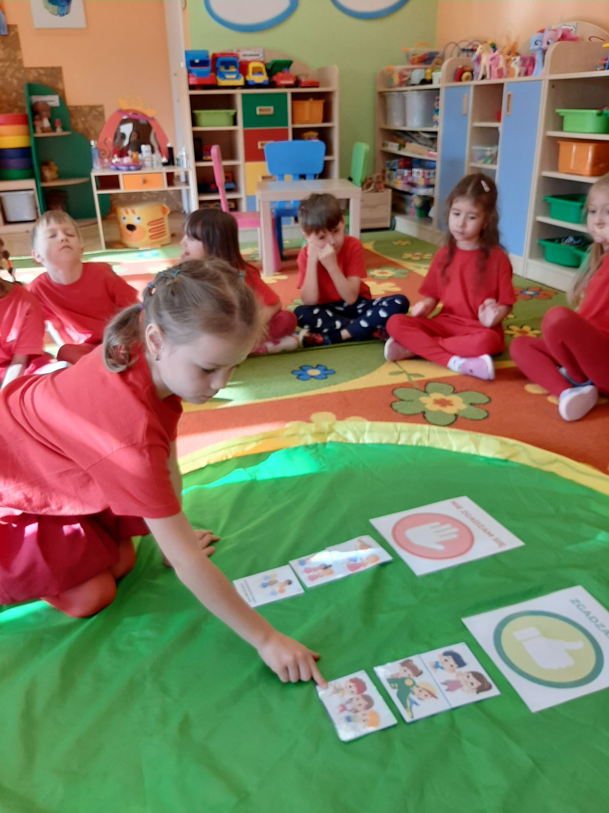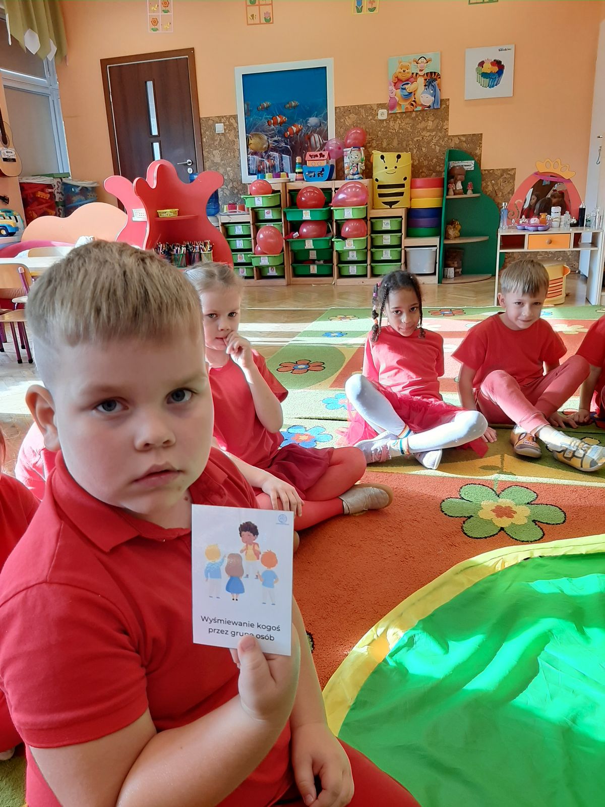Przedszkolaki z grupy V dołączyły do Ogólnopolskiej kampanii „Dzieciństwo bez przemocy”, której celem jest przeciwdziałanie przemocy wobec dzieci. Dzieci uczestniczyły w zajęciach edukacyjnych pod hasłem „Stop Przemocy” podczas których wysłuchały opowiadania z książki „Nie daj się gnębić!” M. Młodnickiej i obejrzały film edukacyjny pt. „Powiedz Nie!”. Przedszkolaki zastanawiały się czym jest przemoc i jak można jej przeciwdziałać. Dowiedziały się w jaki sposób reagować na przemoc, gdzie szukać pomocy i dlaczego nie wolno pozostawać obojętnym wobec krzywdy innych. Dzieci uczestniczyły w zabawach ruchowych, odgrywały scenki dramowe i rozmawiały o różnych sytuacjach w domu lub przedszkolu, kiedy mogą powiedzieć: Stop Przemocy !. W symbolicznym geście solidarności i wsparcia kampanii w naszej sali zapaliliśmy czerwone światło jako wyraz sprzeciwu przeciw krzywdzeniu dzieci. Na zakończenie wspólnie wykonaliśmy plakat. To były bardzo ważne zajęcia, które pokazały, że każdy ma prawo do bezpieczeństwa i szacunku.