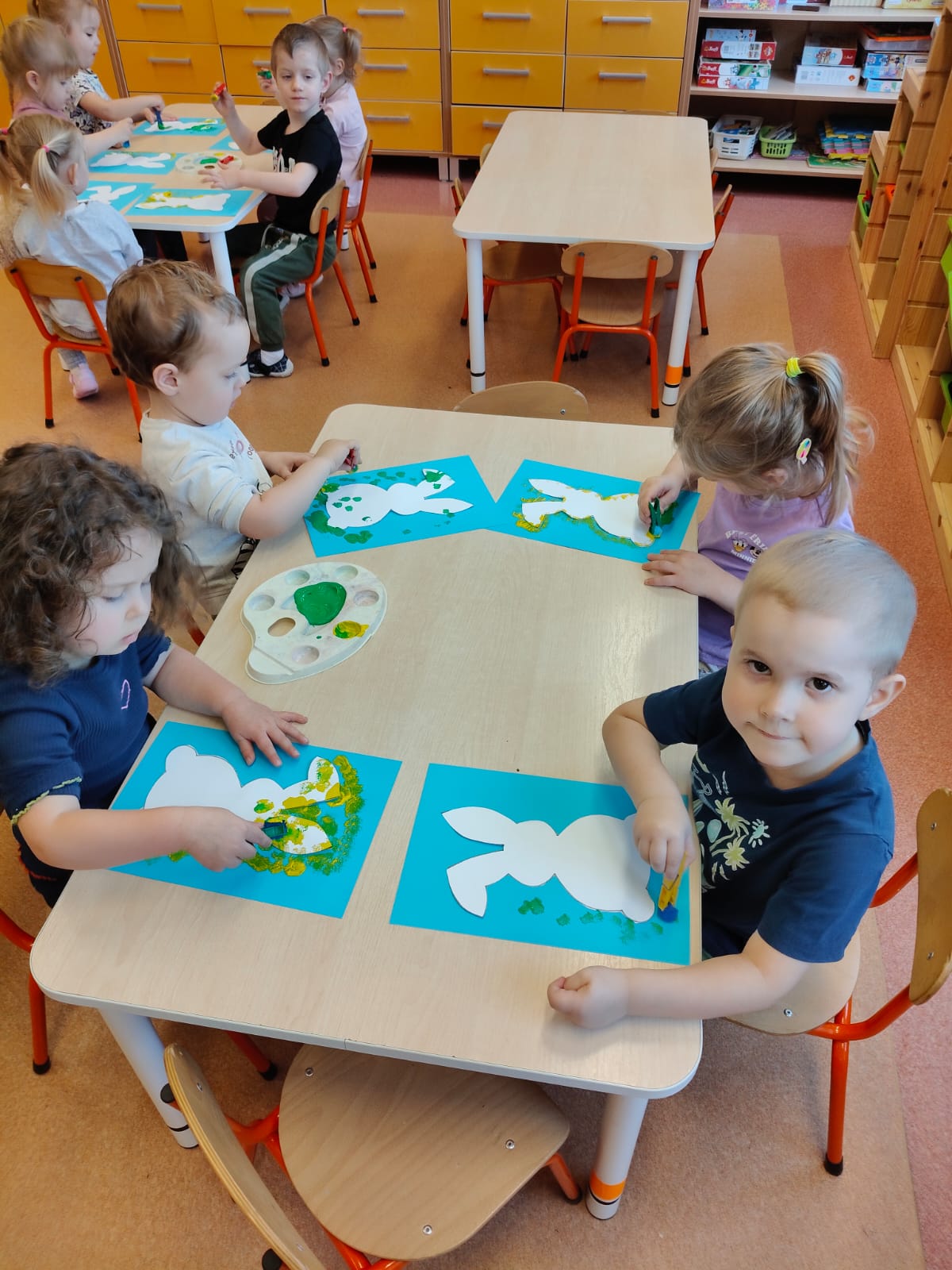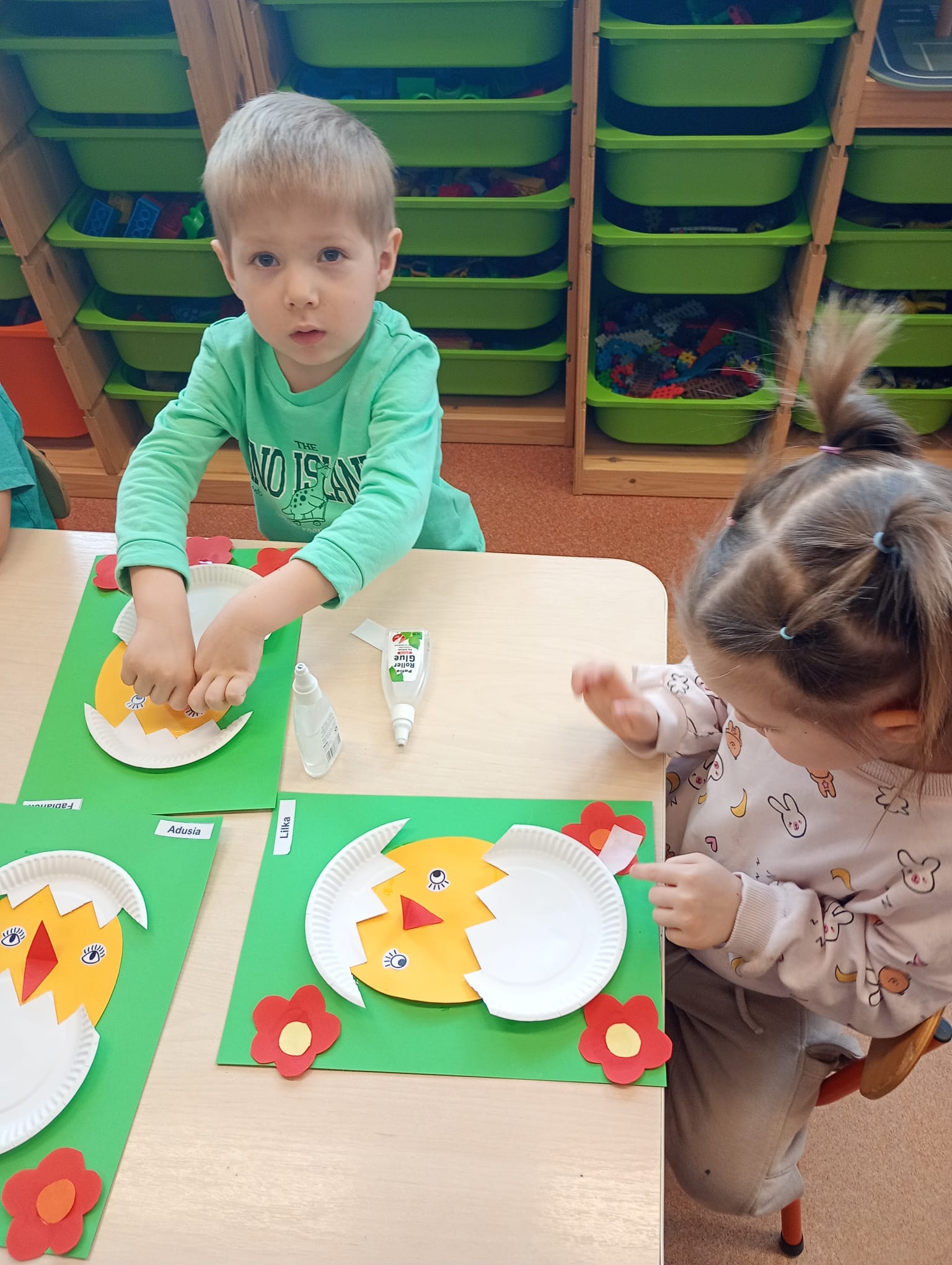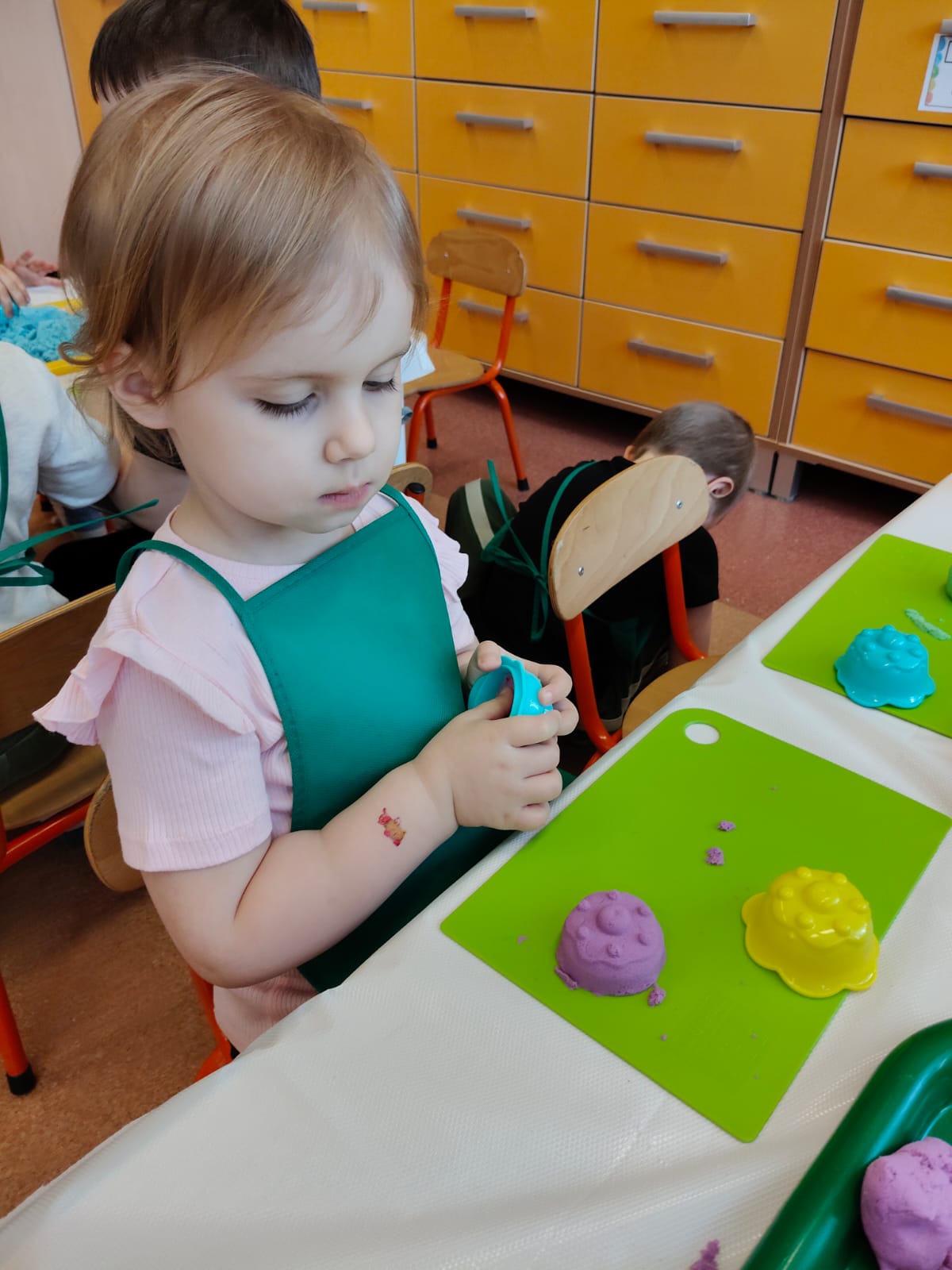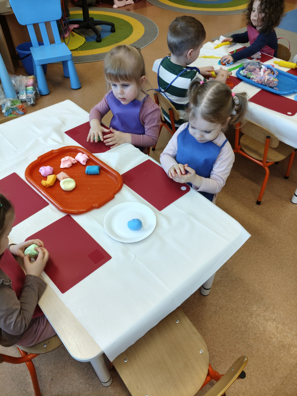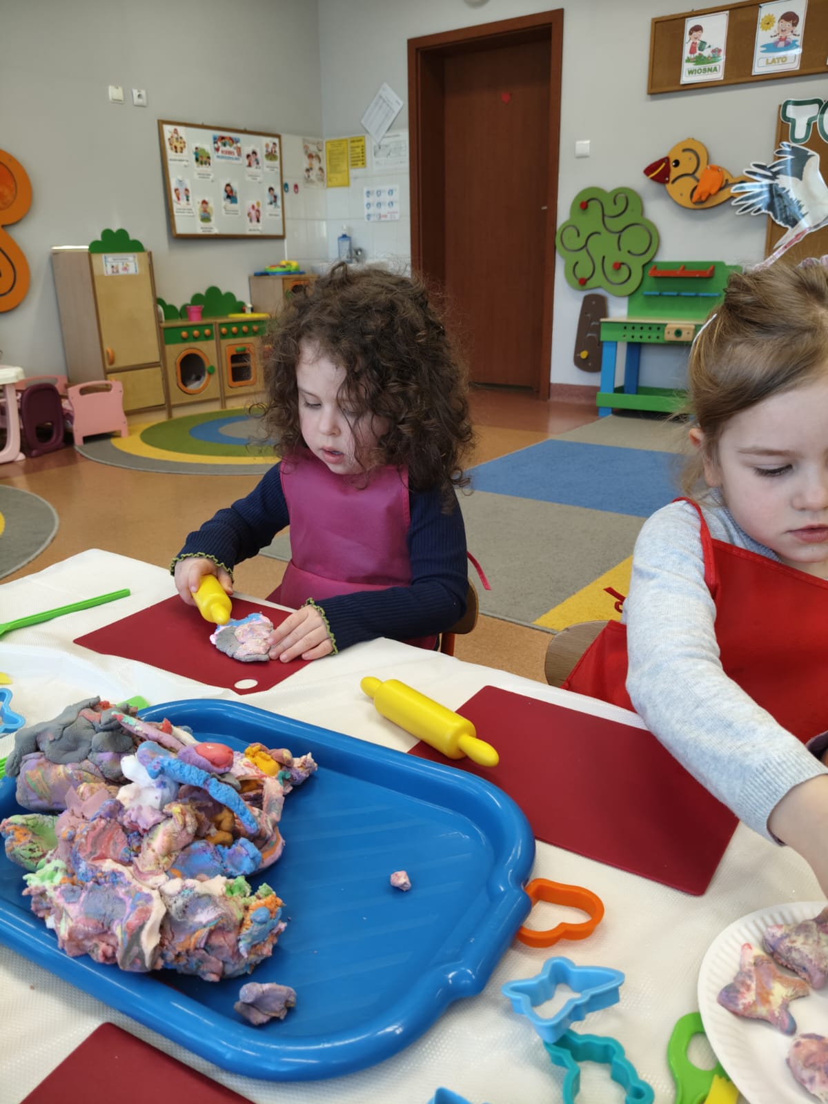 Podczas zajęć dzieci ugniatały, formowały i wycinały kształty przy użyciu foremek, co sprzyjało doskonaleniu koordynacji ręka–oko. Zabawy przebiegały w miłej, świątecznej atmosferze, a wykonane prace stały się piękną dekoracją sali. Zajęcia nie tylko wprowadziły dzieci w tematykę Świąt Wielkanocnych, ale także wspierały ich rozwój.