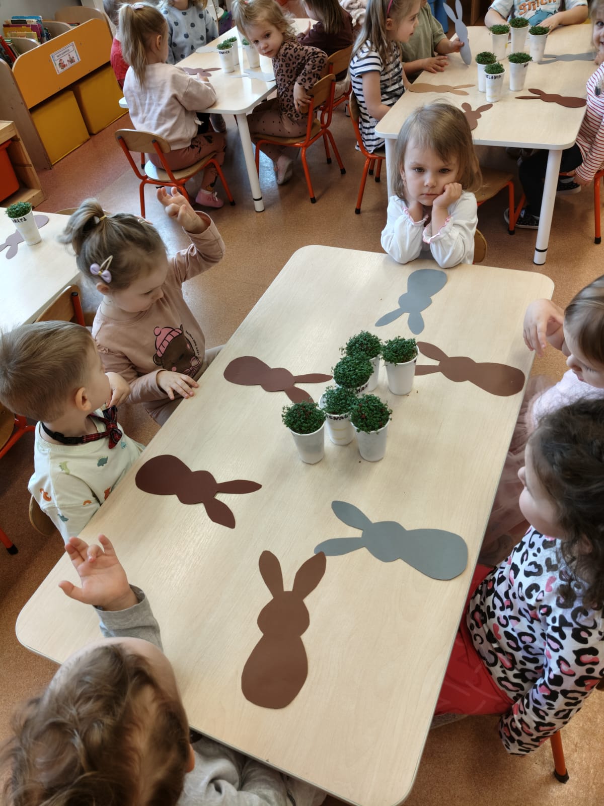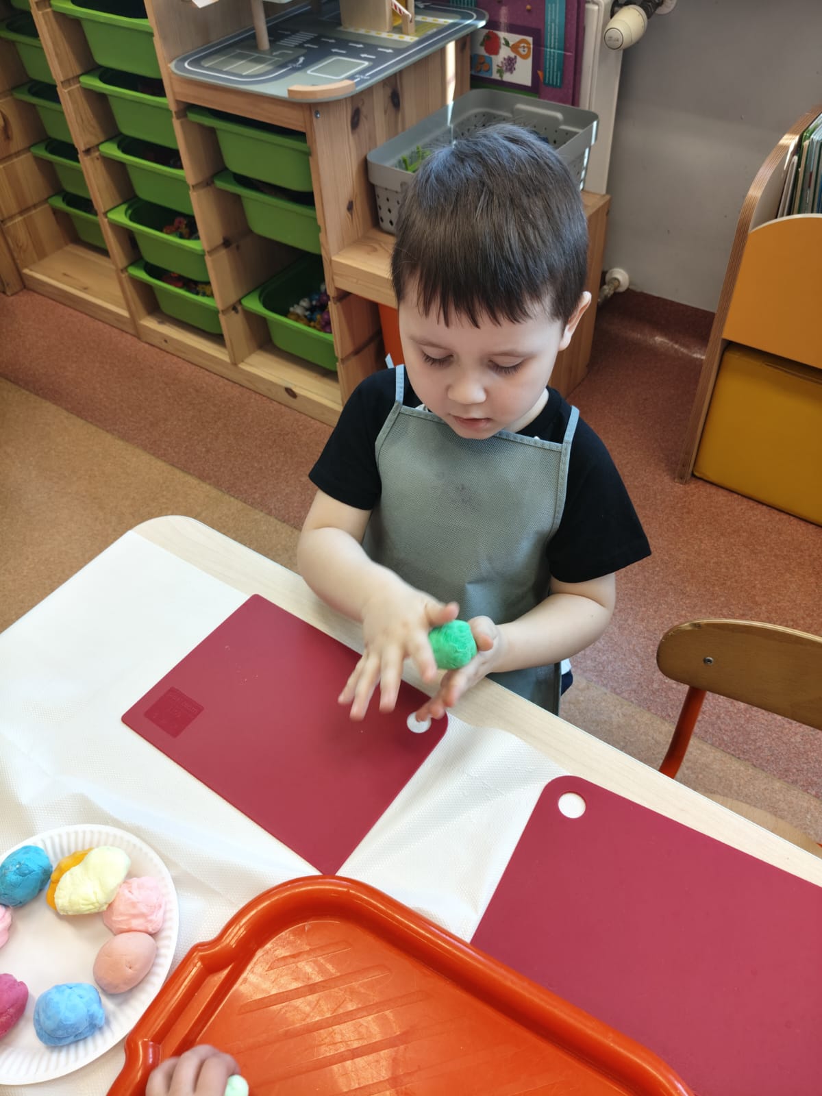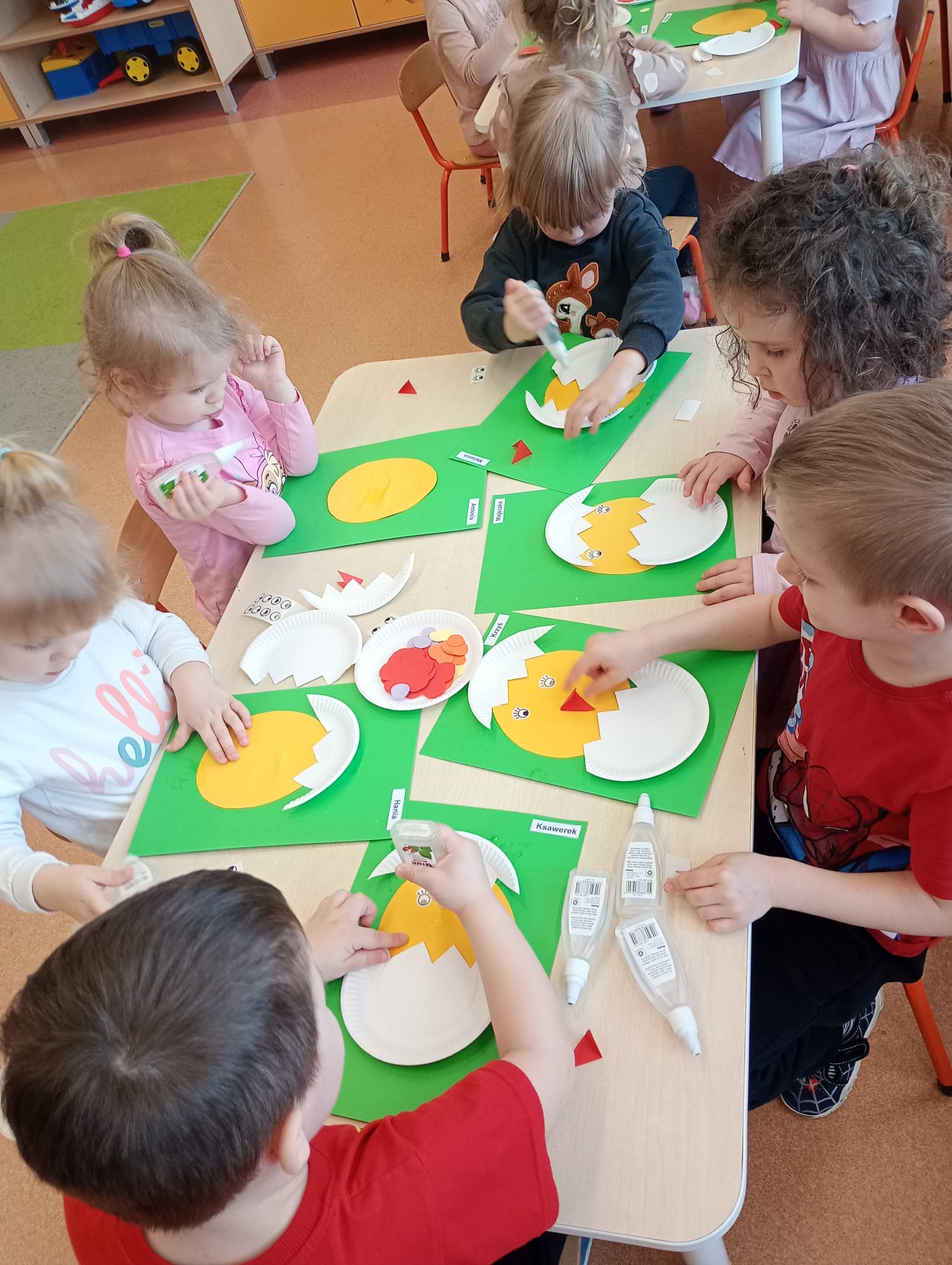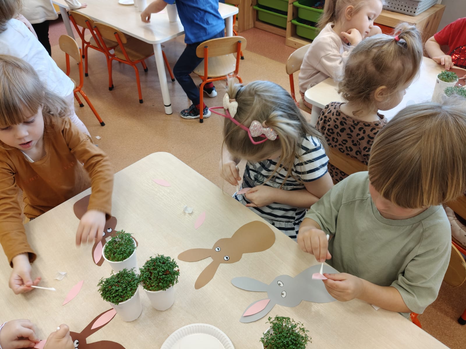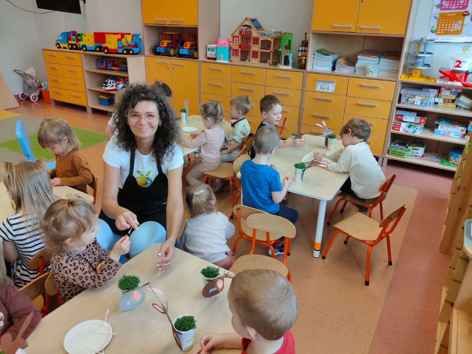 Podczas zajęć dzieci ugniatały, formowały i wycinały kształty przy użyciu foremek, co sprzyjało doskonaleniu koordynacji ręka–oko. Zabawy przebiegały w miłej, świątecznej atmosferze, a wykonane prace stały się piękną dekoracją sali. Zajęcia nie tylko wprowadziły dzieci w tematykę Świąt Wielkanocnych, ale także wspierały ich rozwój.
