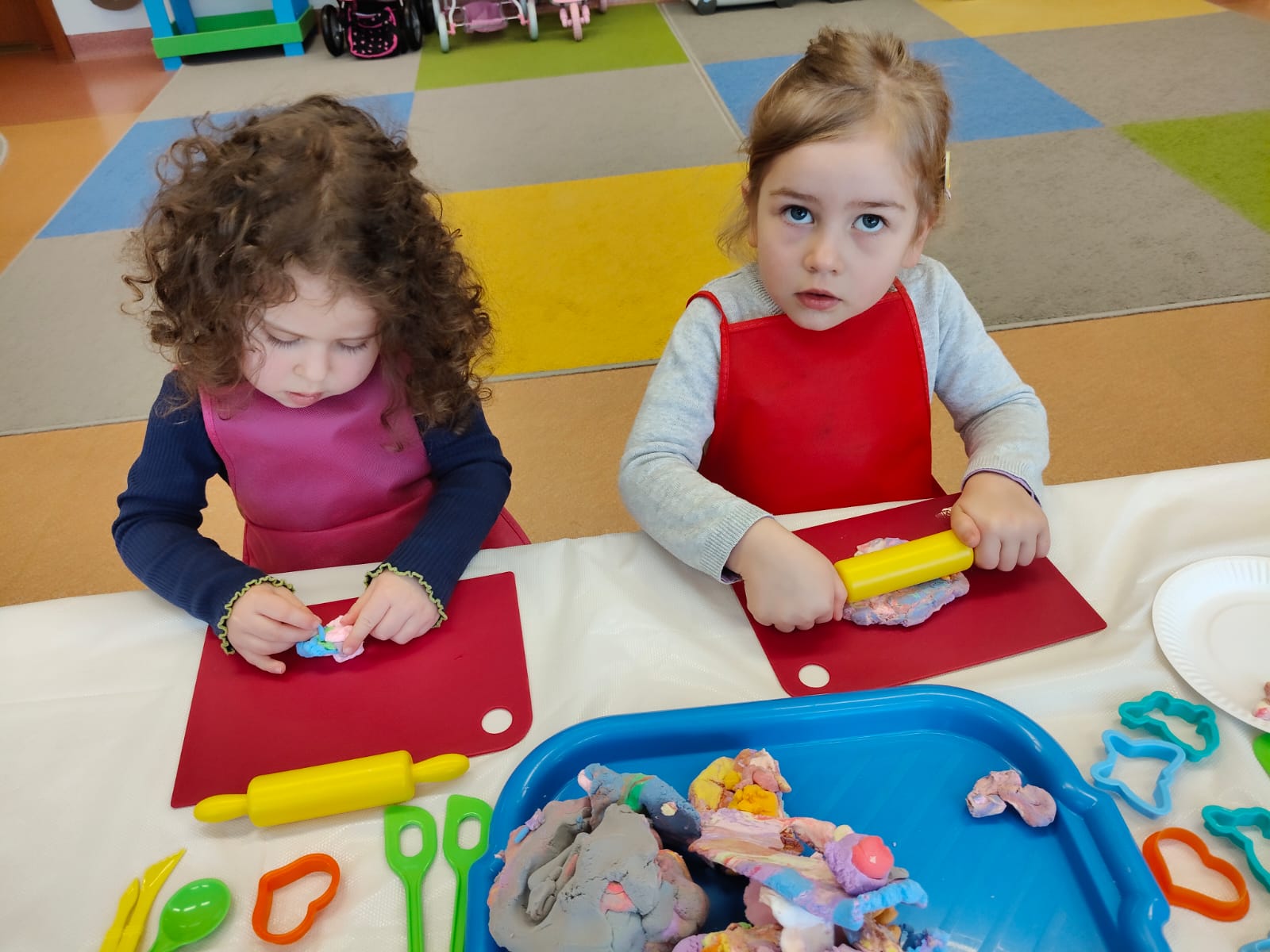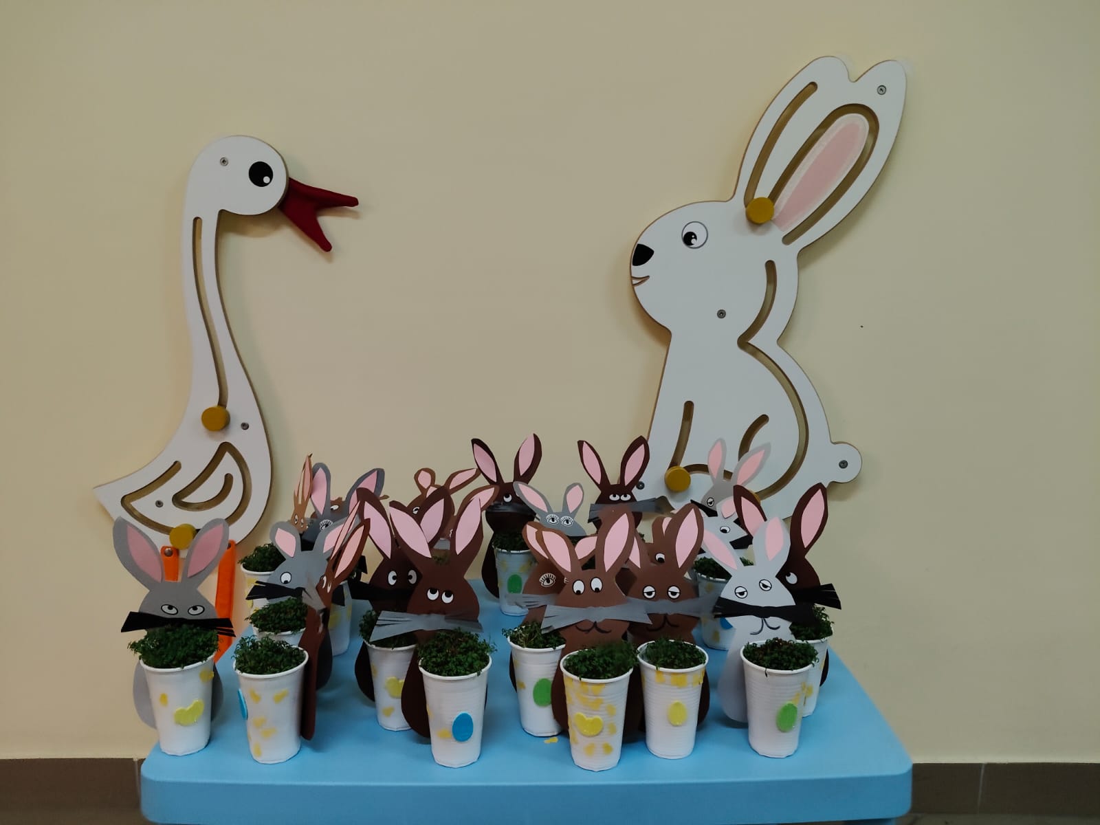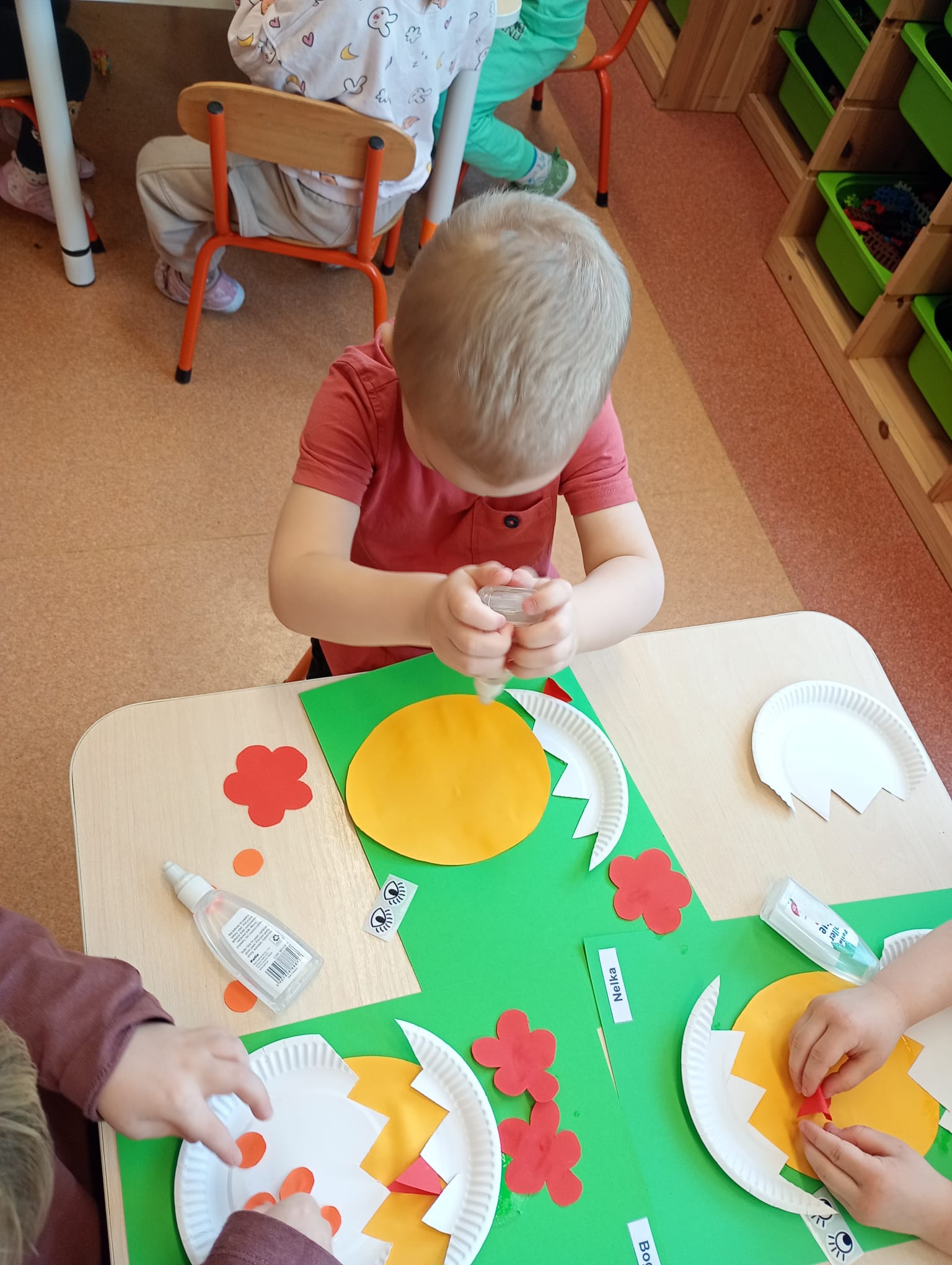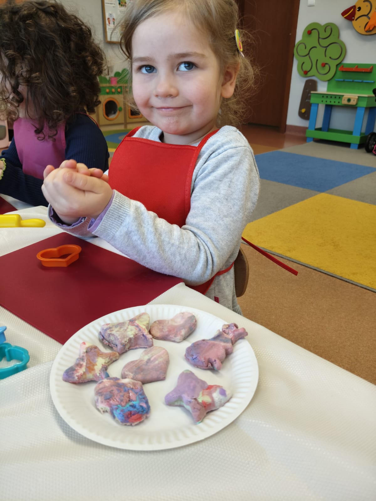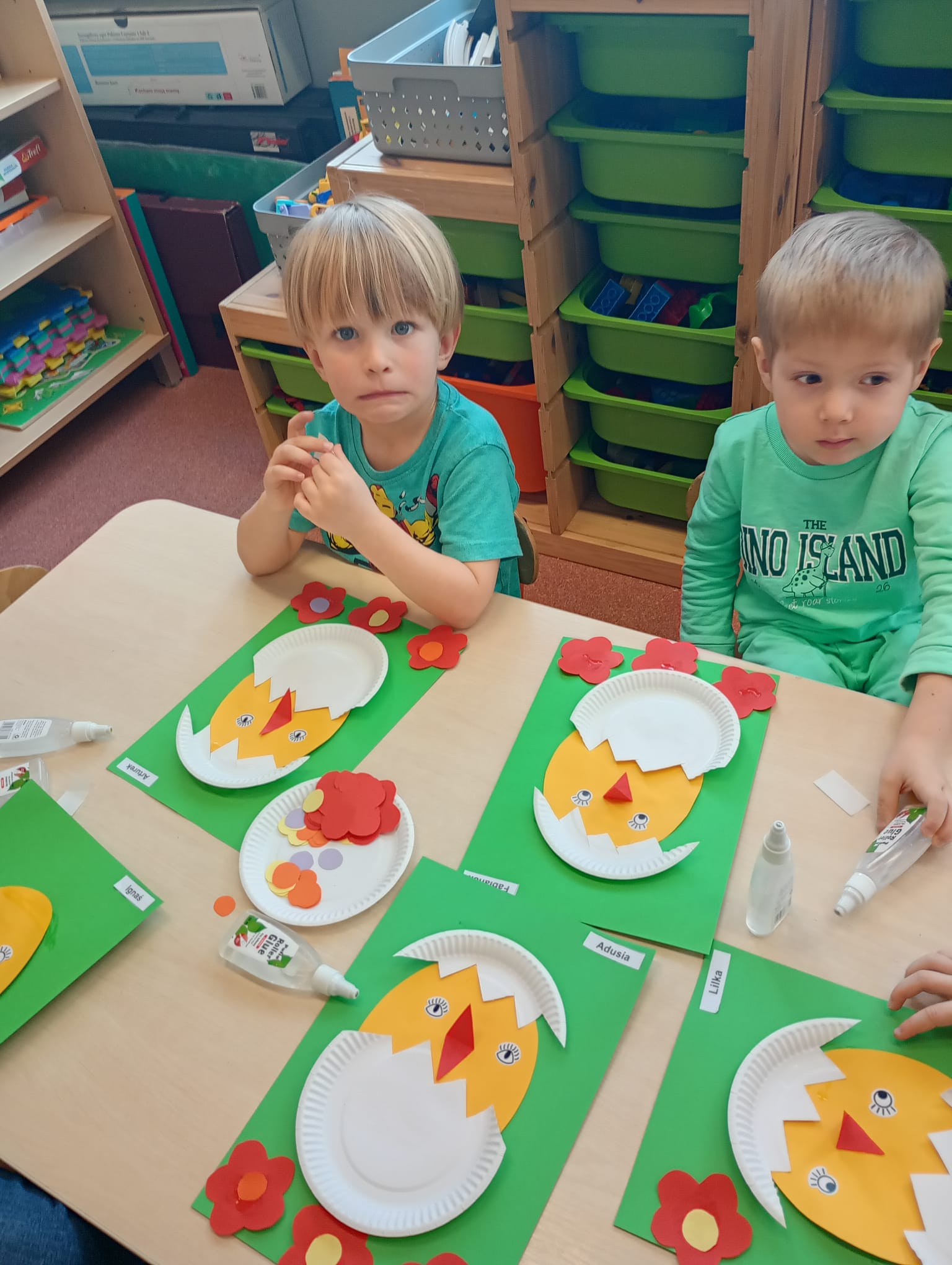 Podczas zajęć dzieci ugniatały, formowały i wycinały kształty przy użyciu foremek, co sprzyjało doskonaleniu koordynacji ręka–oko. Zabawy przebiegały w miłej, świątecznej atmosferze, a wykonane prace stały się piękną dekoracją sali. Zajęcia nie tylko wprowadziły dzieci w tematykę Świąt Wielkanocnych, ale także wspierały ich rozwój.