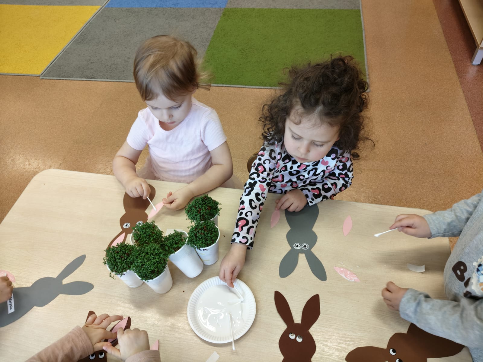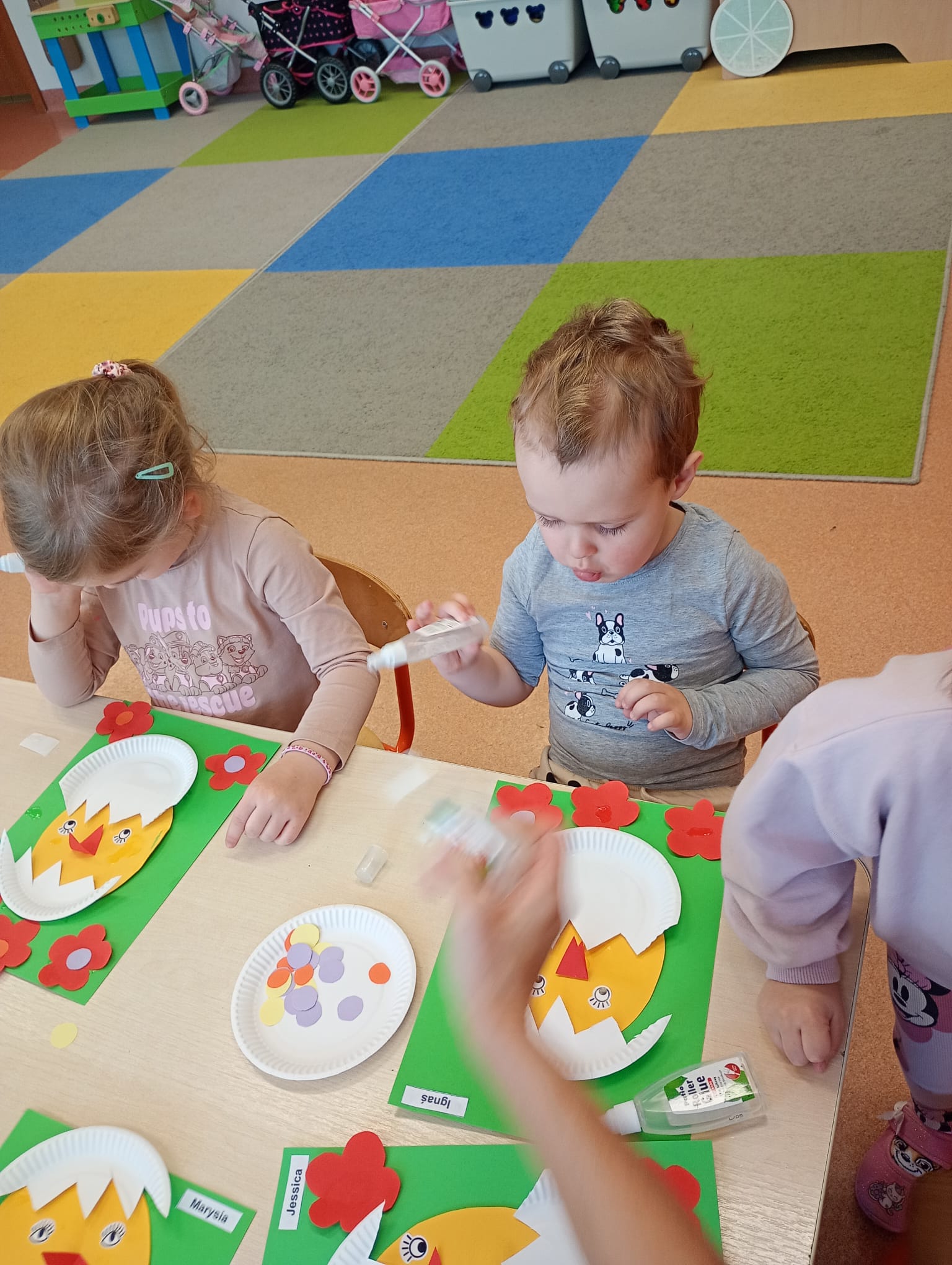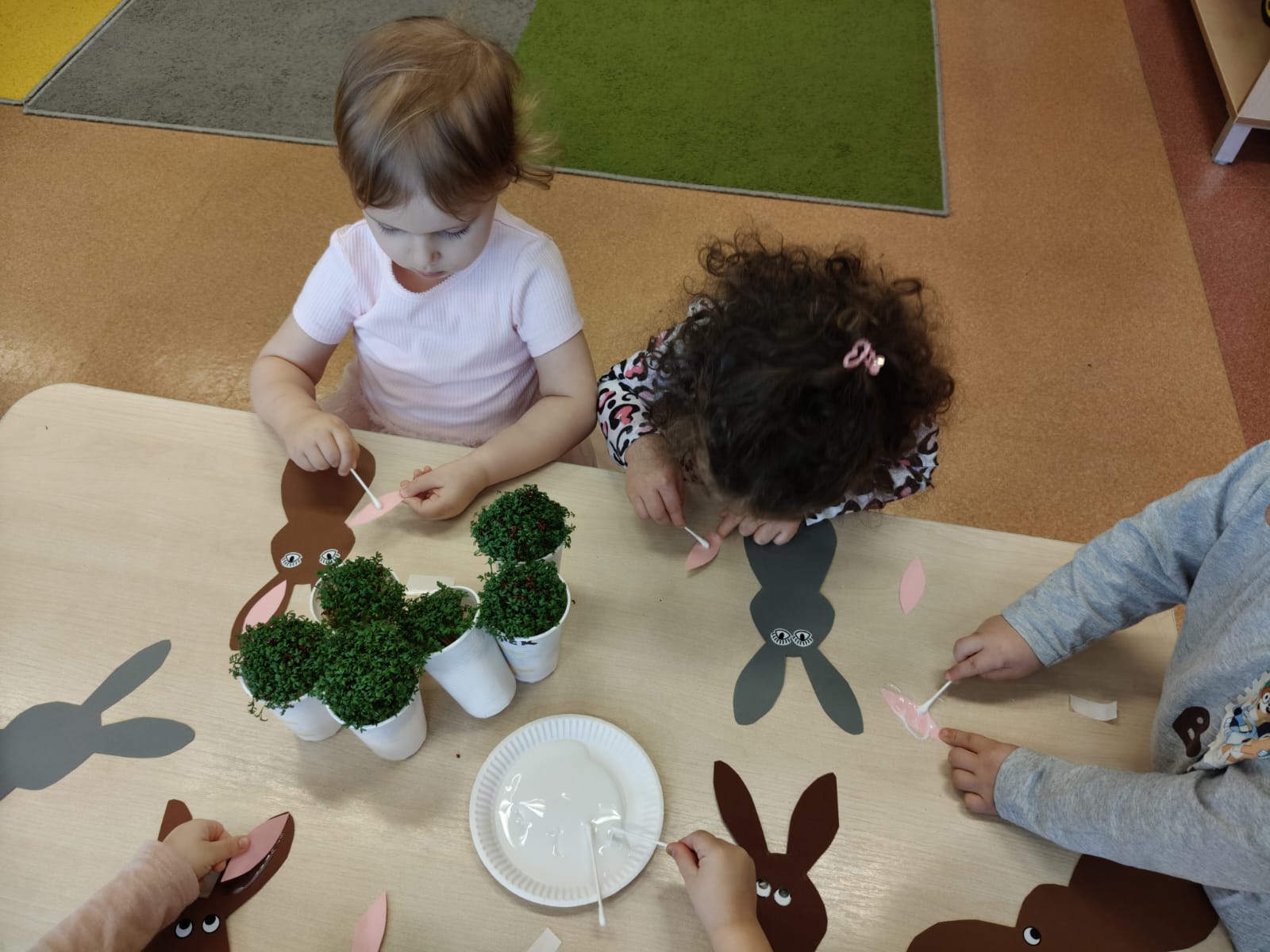 Czas przedświąteczny w grupie maluszków obfitował w przeróżne wielkanocne zabawy plastyczne. Dzieci miały okazję rozwijać swoją wyobraźnię i sprawność manualną poprzez tworzenie wielkanocnych motywów, takich jak pisanki, zajączki czy kurczaczki a praca z różnorodnymi materiałami sensorycznymi – piaskiem kinetycznym i ciastoliną dostarczyła im wielu wrażeń dotykowych oraz radości z eksperymentowania.