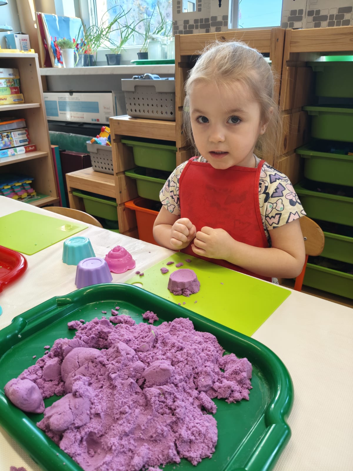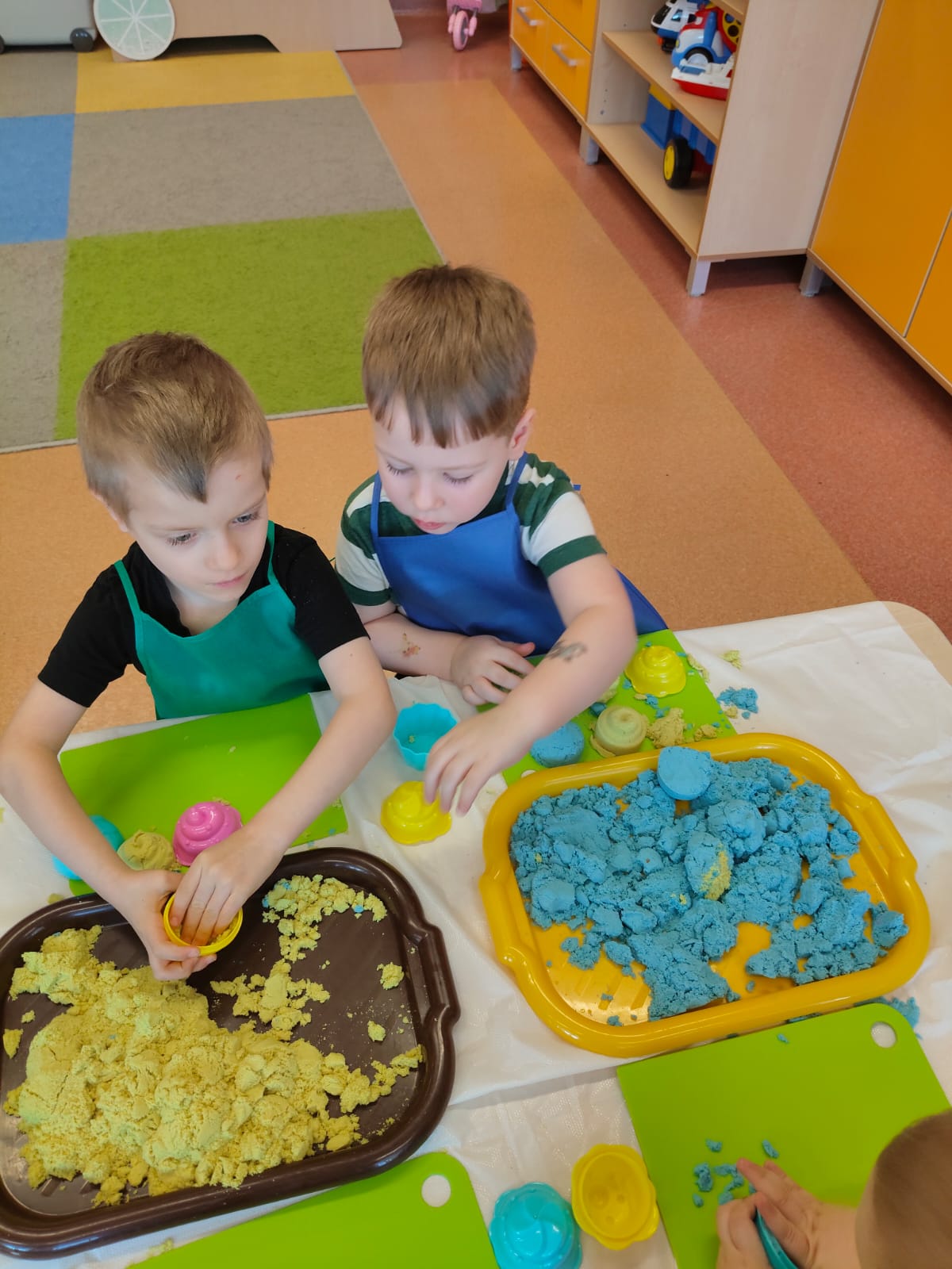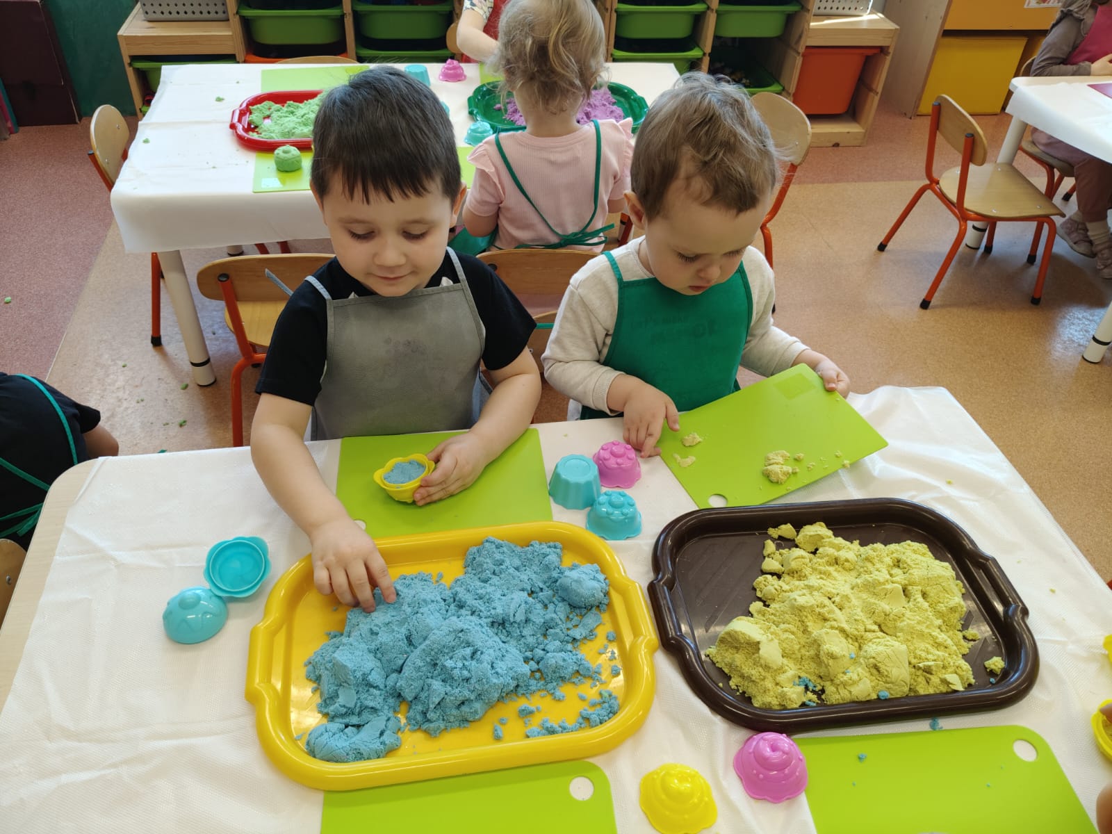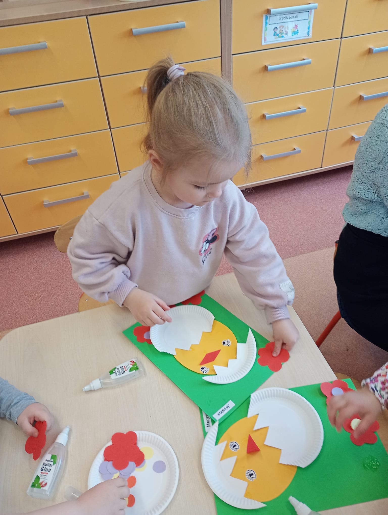 Czas przedświąteczny w grupie maluszków obfitował w przeróżne wielkanocne zabawy plastyczne. Dzieci miały okazję rozwijać swoją wyobraźnię i sprawność manualną poprzez tworzenie wielkanocnych motywów, takich jak pisanki, zajączki czy kurczaczki a praca z różnorodnymi materiałami sensorycznymi – piaskiem kinetycznym i ciastoliną dostarczyła im wielu wrażeń dotykowych oraz radości z eksperymentowania.