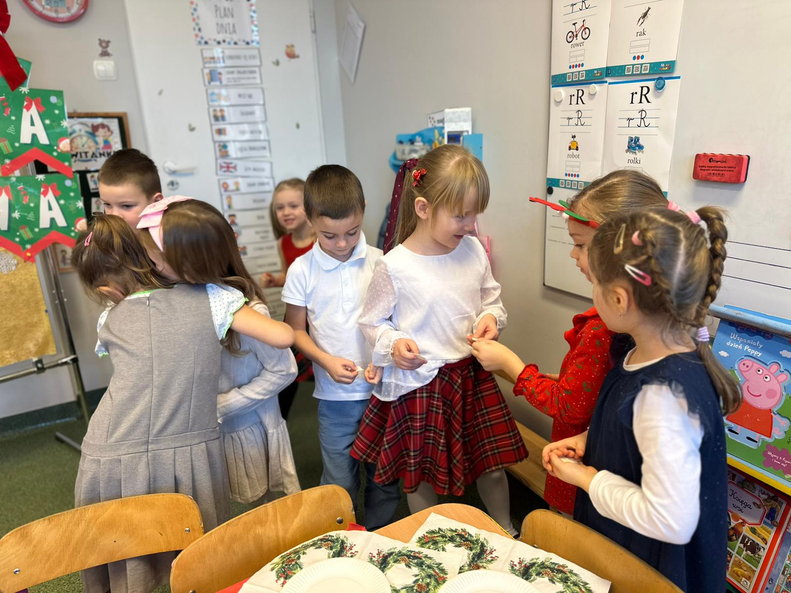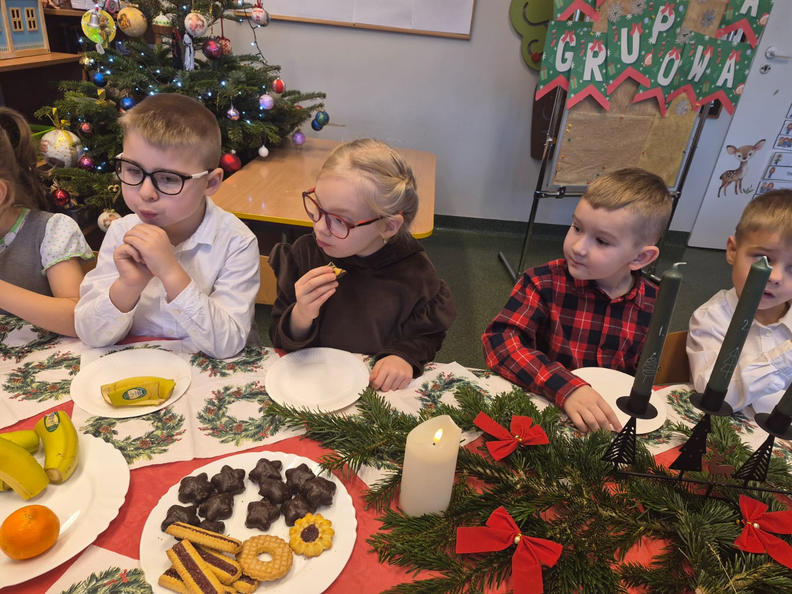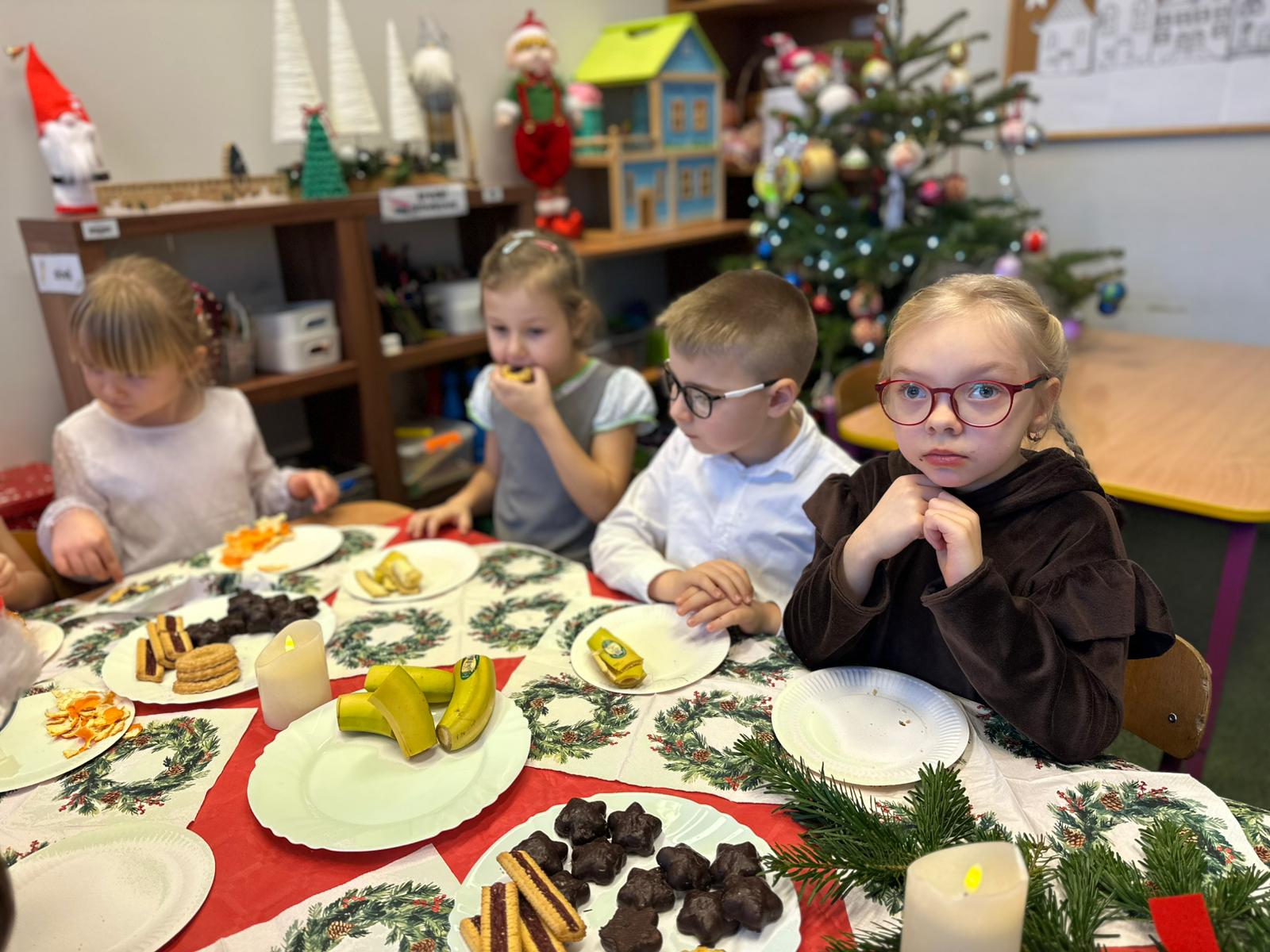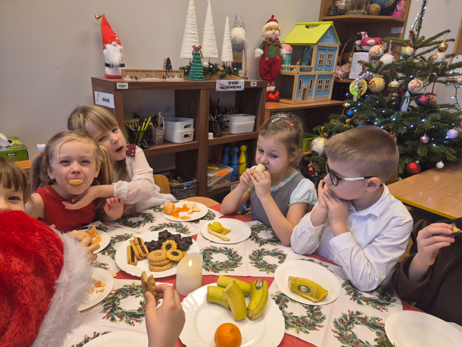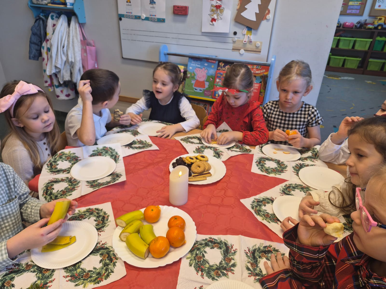 Przedszkole to miejsce gdzie uczymy się nie tylko pisać, śpiewać, tańczyć, poznawać literki ale również współdziałać i współtworzyć idealne miejsce do wszechstronnego rozwoju. W dniu 19. 12.2025 przedszkolaki z gr III zasiadły do wigilii grupowej. Jak w każdej rodzinie, również w naszej przedszkolnej najważniejsze były życzenia świąteczne i podzielenie się opłatkiem. Powiedzenie sobie nawzajem czegoś miłego staje się magicznym tym bardziej, że w chwili zapominamy o tych innych niemiłych sytuacjach. Następnie dzieci odświętnie ubrane zasiadły do pięknie nakrytego stołu, z siankiem pod obrusem ,by wspólnie zaśpiewać kolędę i cieszyć się swoim towarzystwem. Po uroczystej wigilii dzieci zagrały na kolorowych dzwonkach kolędę Jesteśmy przedszkolną rodzinką i wspólnie tworzymy piękne wspomnienia i wspólnie uczymy się wielu zasad życia. Życzymy wszystkim tak pięknych wspomnień z przedszkola jakie my mamy.