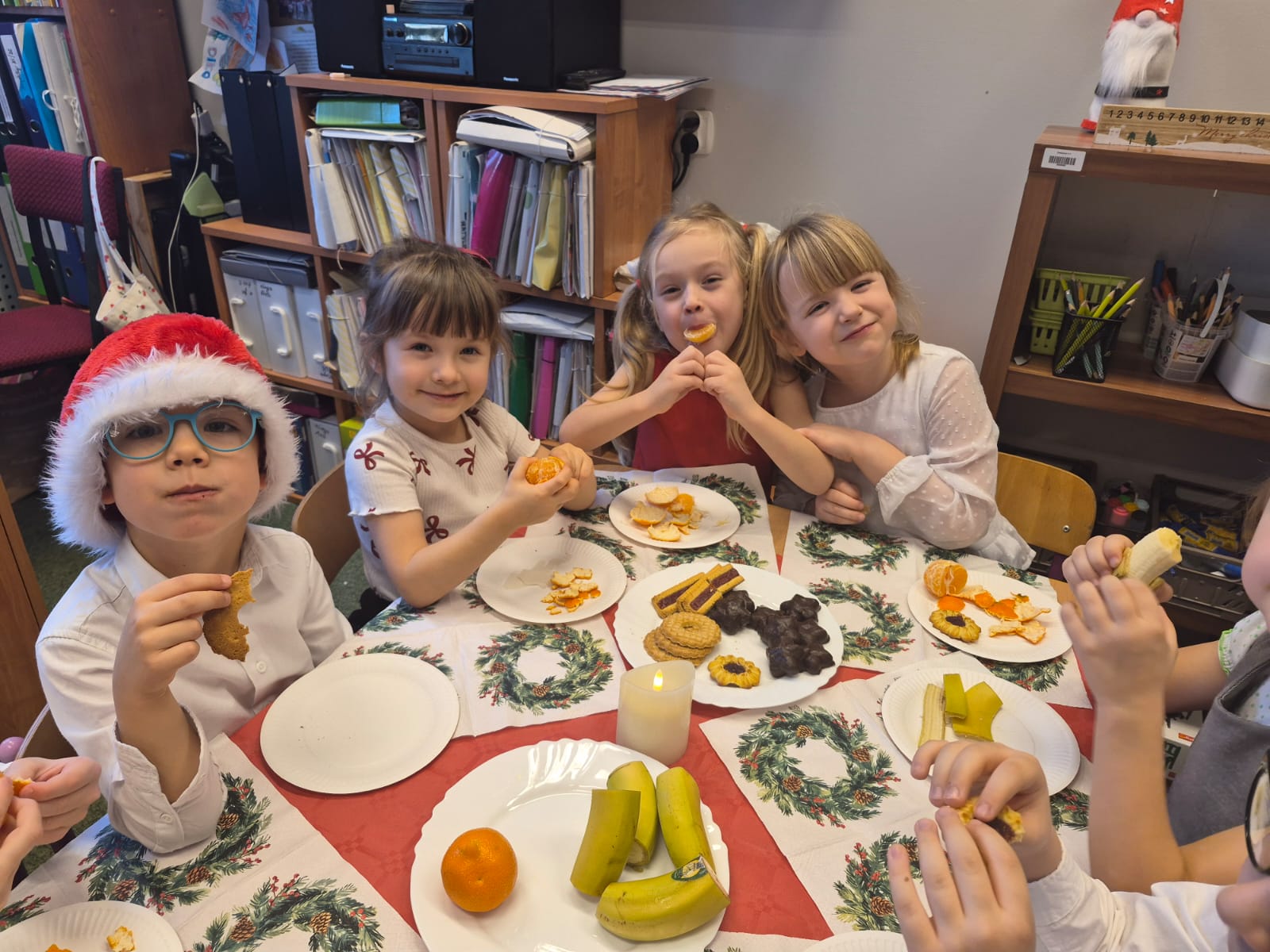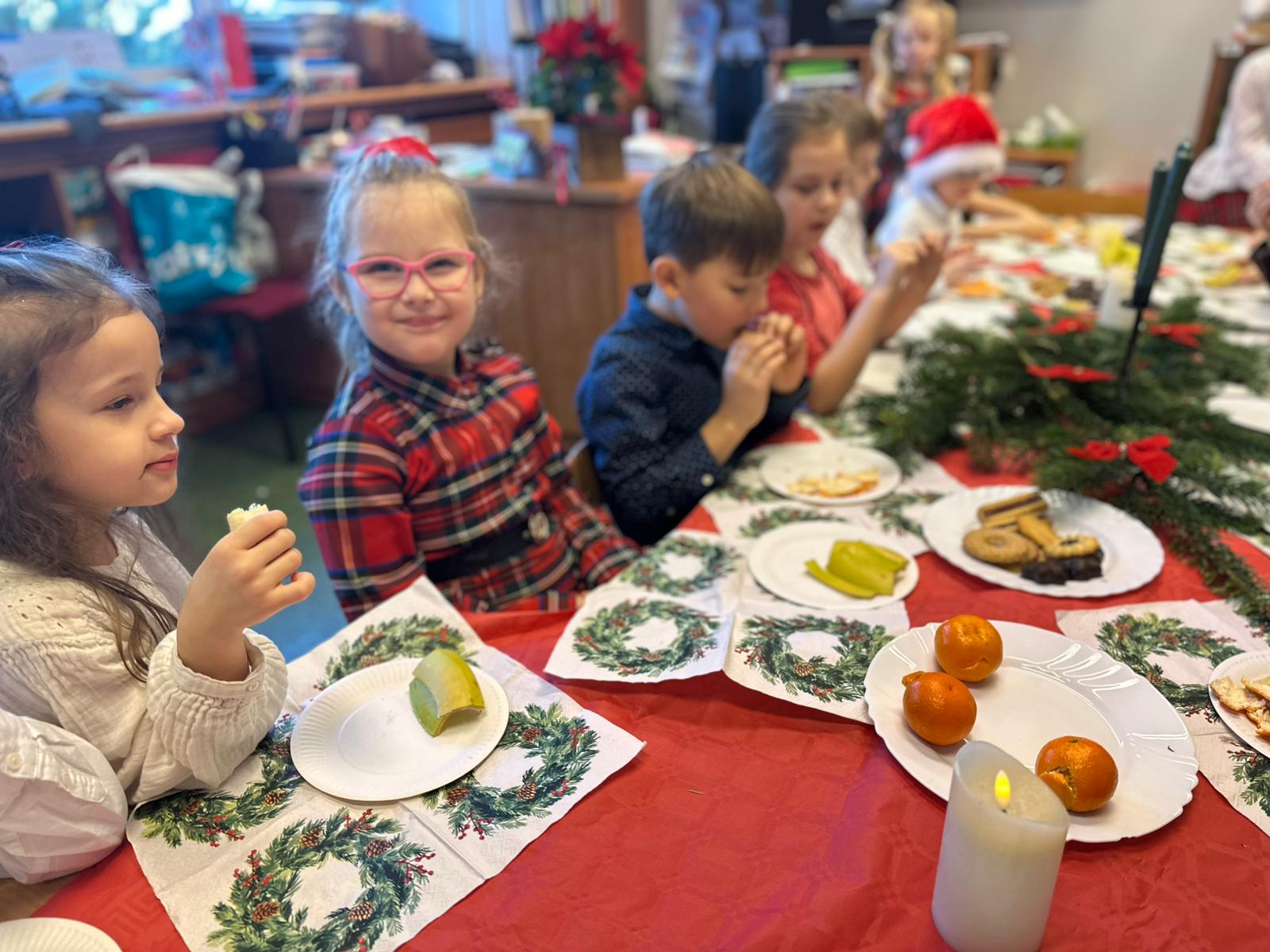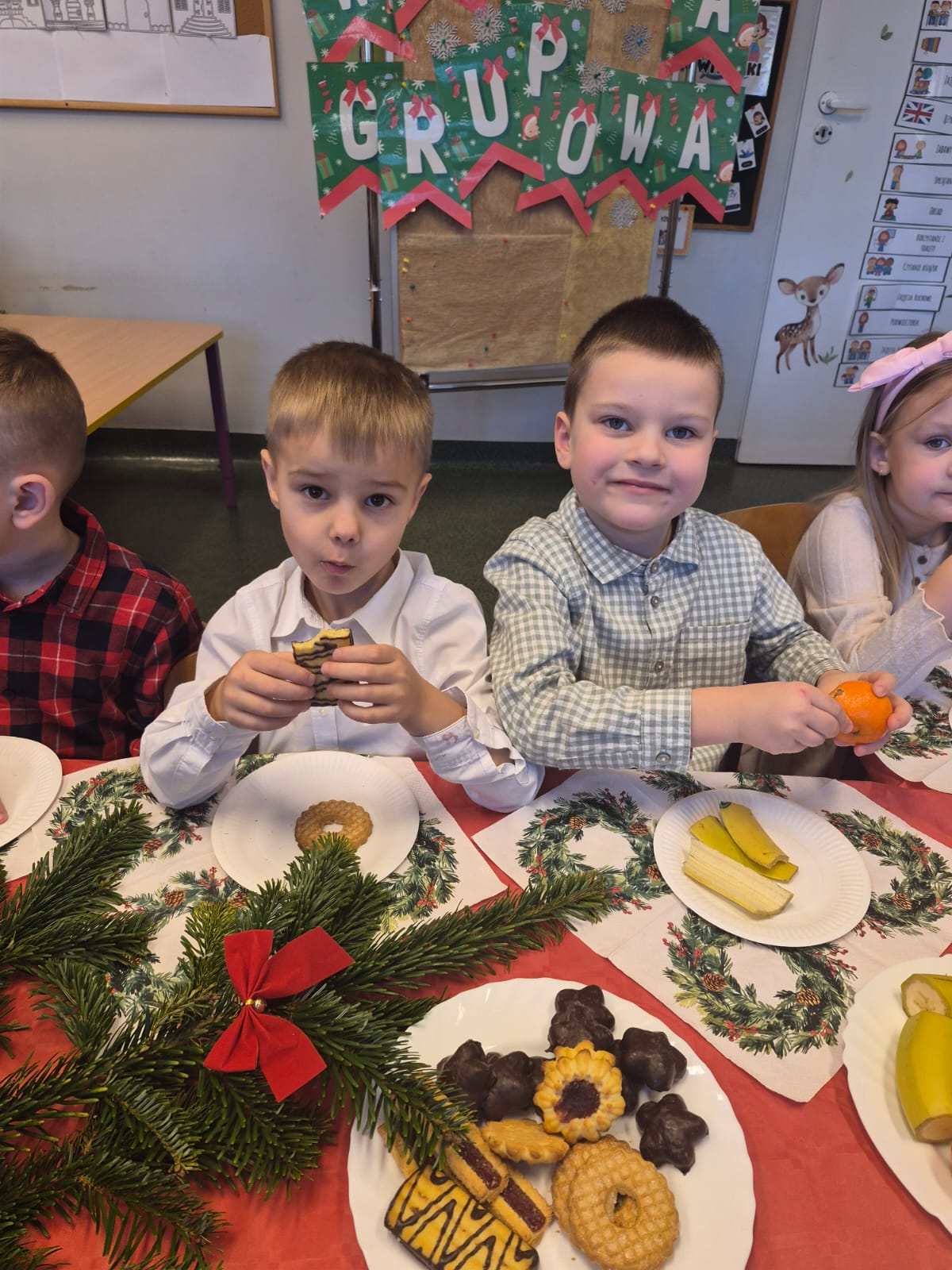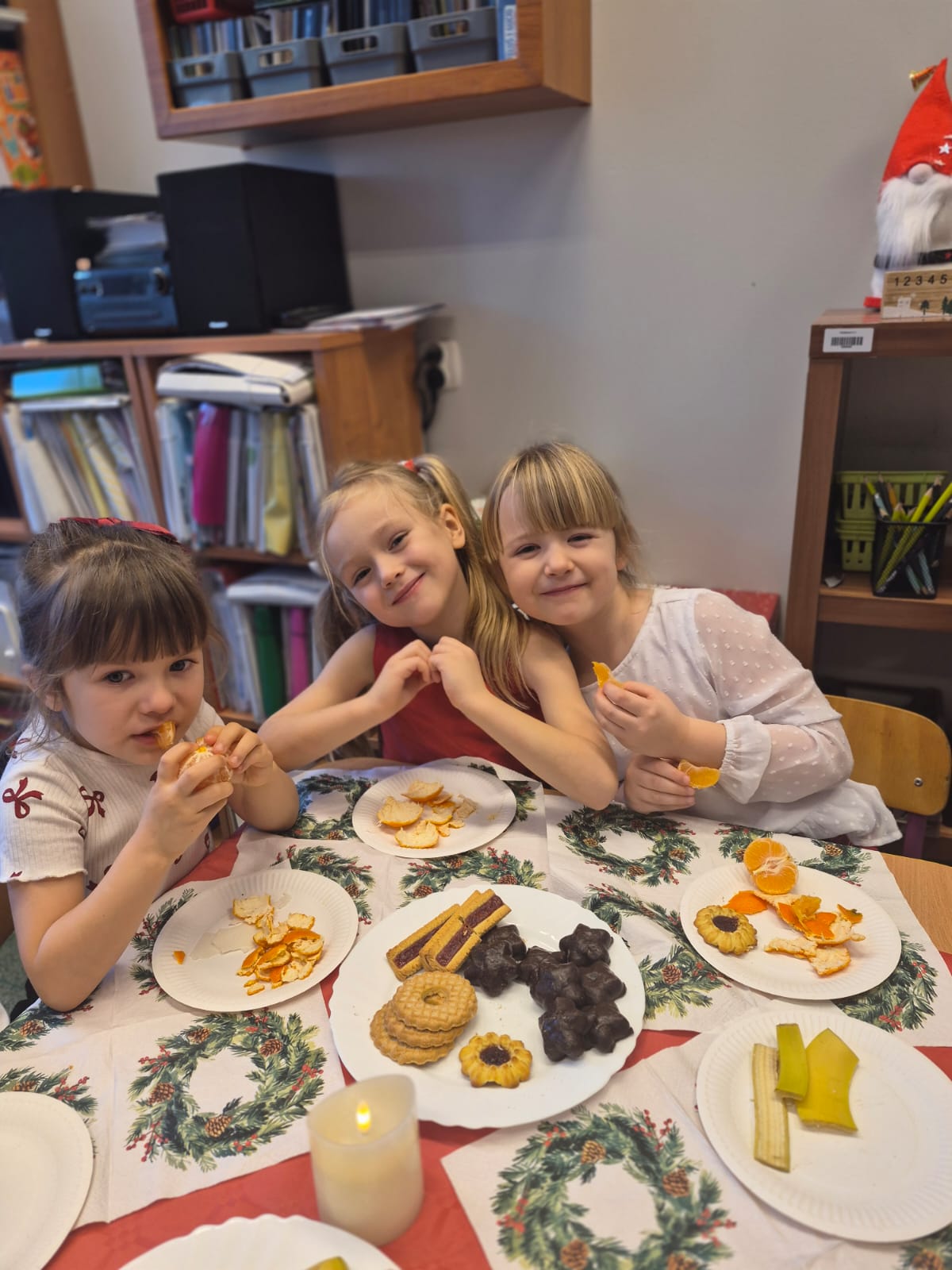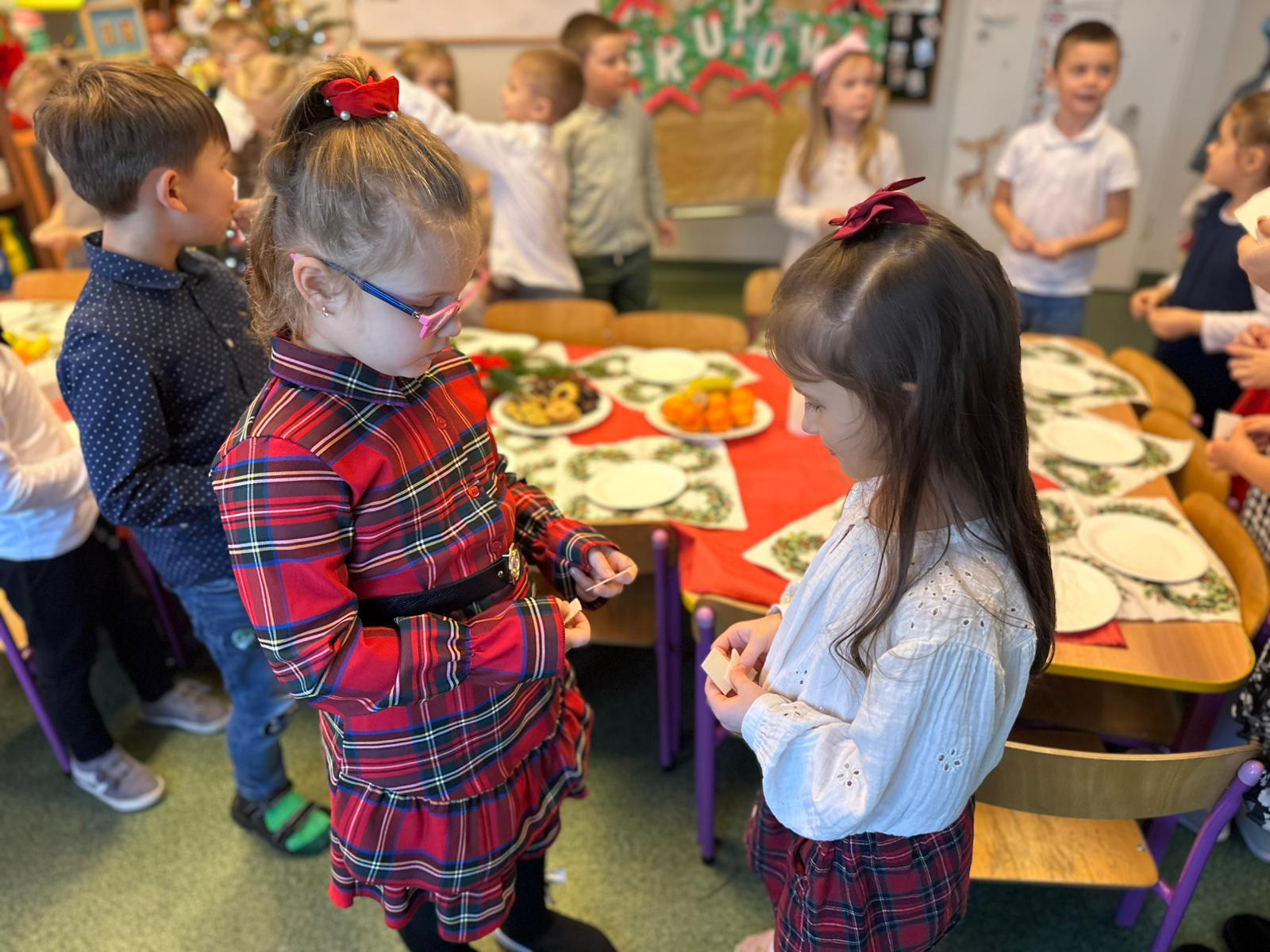 Przedszkole to miejsce gdzie uczymy się nie tylko pisać, śpiewać, tańczyć, poznawać literki ale również współdziałać i współtworzyć idealne miejsce do wszechstronnego rozwoju. W dniu 19. 12.2025 przedszkolaki z gr III zasiadły do wigilii grupowej. Jak w każdej rodzinie, również w naszej przedszkolnej najważniejsze były życzenia świąteczne i podzielenie się opłatkiem. Powiedzenie sobie nawzajem czegoś miłego staje się magicznym tym bardziej, że w chwili zapominamy o tych innych niemiłych sytuacjach. Następnie dzieci odświętnie ubrane zasiadły do pięknie nakrytego stołu, z siankiem pod obrusem ,by wspólnie zaśpiewać kolędę i cieszyć się swoim towarzystwem. Po uroczystej wigilii dzieci zagrały na kolorowych dzwonkach kolędę Jesteśmy przedszkolną rodzinką i wspólnie tworzymy piękne wspomnienia i wspólnie uczymy się wielu zasad życia. Życzymy wszystkim tak pięknych wspomnień z przedszkola jakie my mamy.