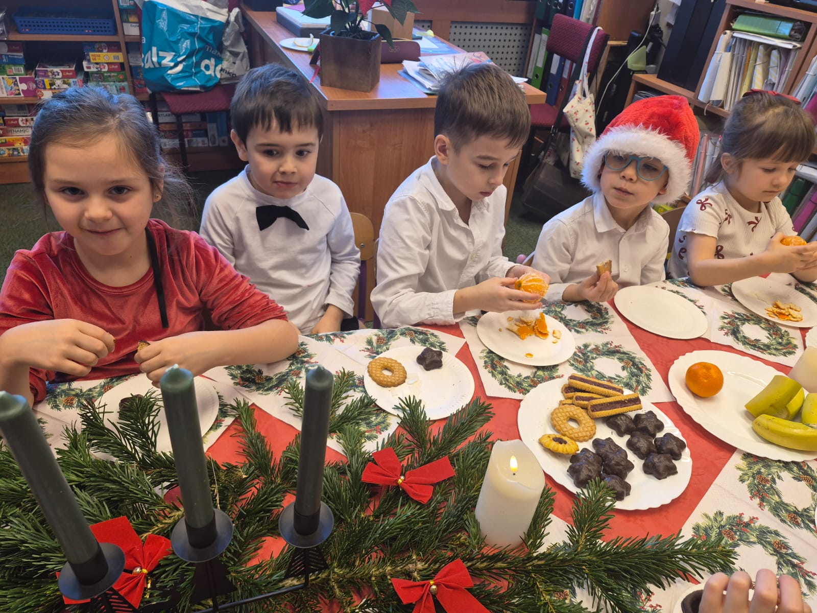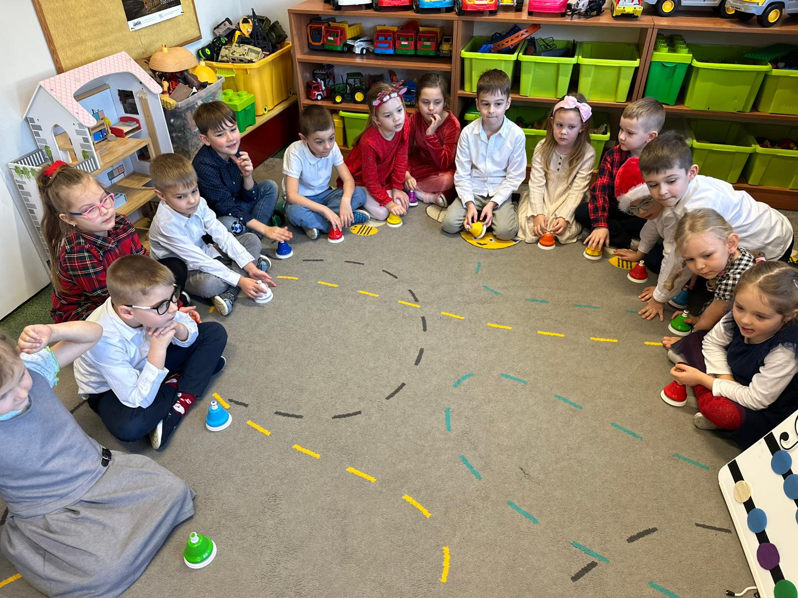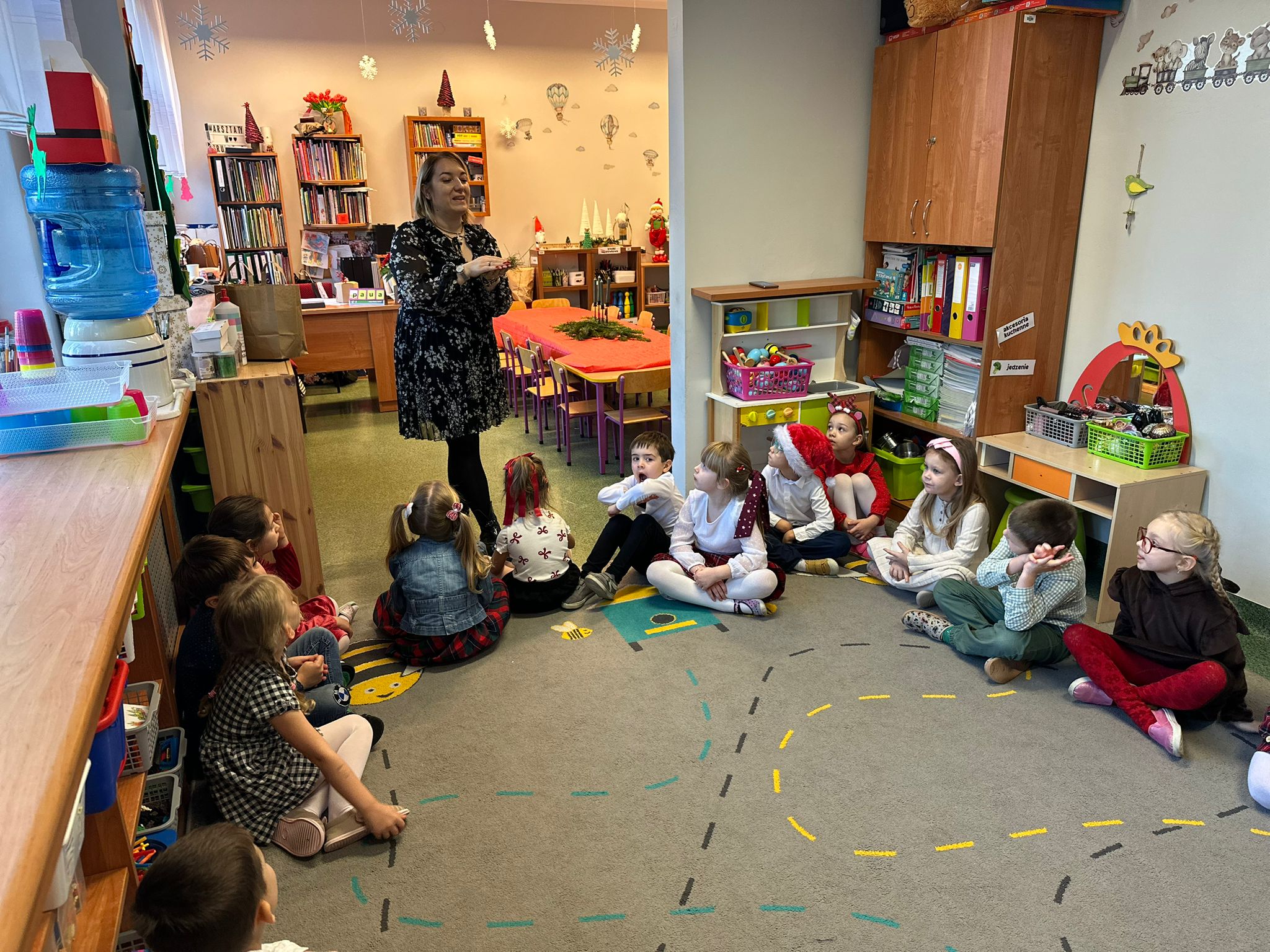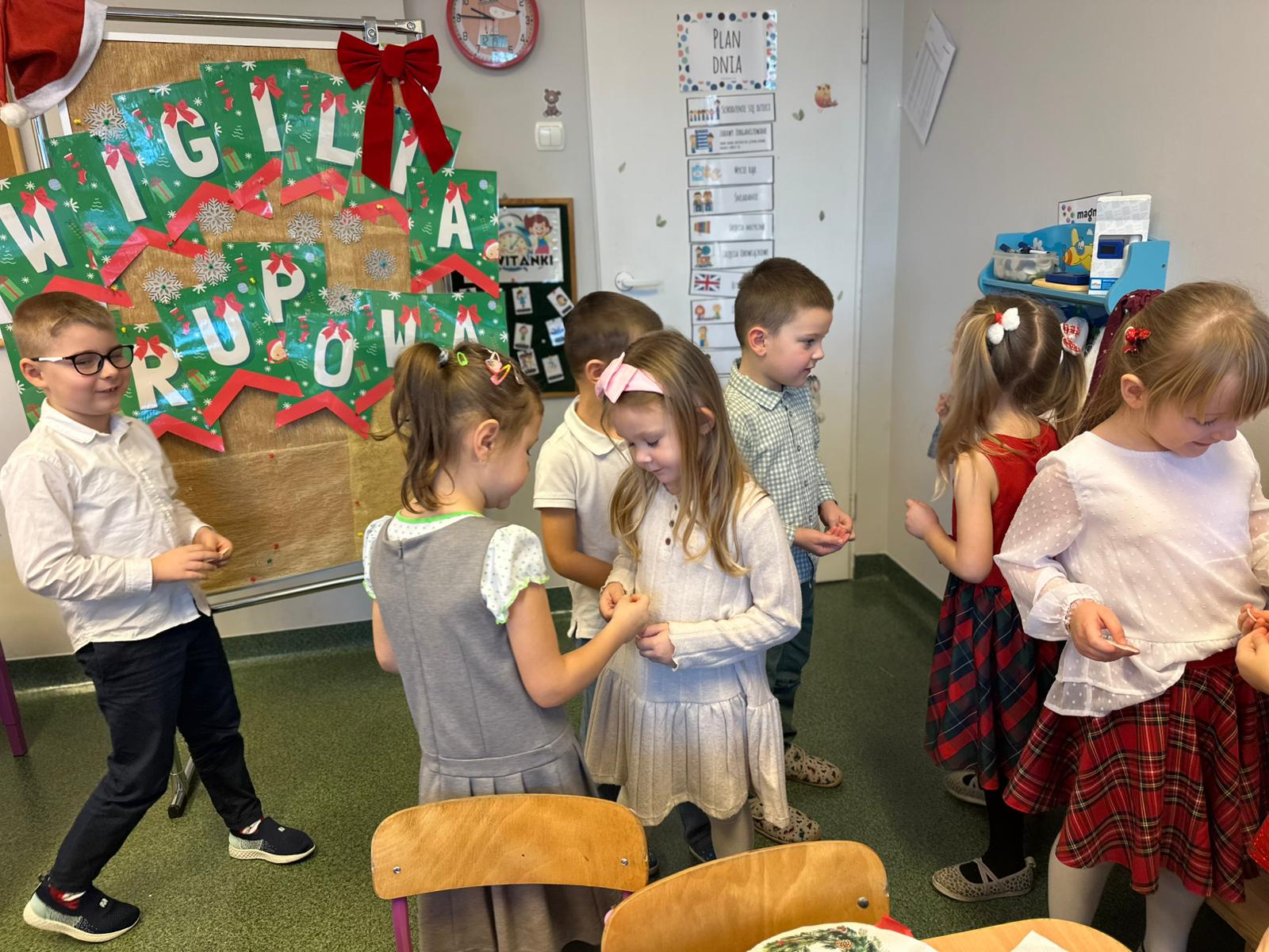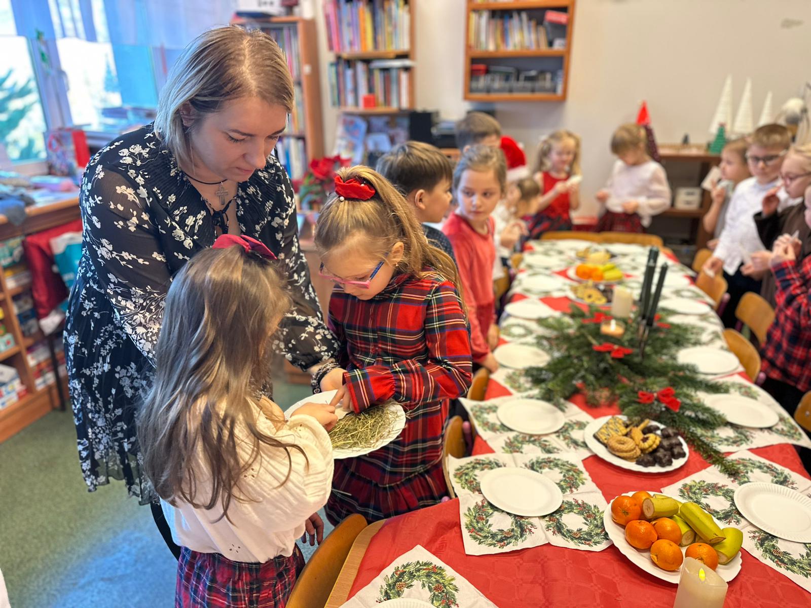 Przedszkole to miejsce gdzie uczymy się nie tylko pisać, śpiewać, tańczyć, poznawać literki ale również współdziałać i współtworzyć idealne miejsce do wszechstronnego rozwoju. W dniu 19. 12.2025 przedszkolaki z gr III zasiadły do wigilii grupowej. Jak w każdej rodzinie, również w naszej przedszkolnej najważniejsze były życzenia świąteczne i podzielenie się opłatkiem. Powiedzenie sobie nawzajem czegoś miłego staje się magicznym tym bardziej, że w chwili zapominamy o tych innych niemiłych sytuacjach. Następnie dzieci odświętnie ubrane zasiadły do pięknie nakrytego stołu, z siankiem pod obrusem ,by wspólnie zaśpiewać kolędę i cieszyć się swoim towarzystwem. Po uroczystej wigilii dzieci zagrały na kolorowych dzwonkach kolędę Jesteśmy przedszkolną rodzinką i wspólnie tworzymy piękne wspomnienia i wspólnie uczymy się wielu zasad życia. Życzymy wszystkim tak pięknych wspomnień z przedszkola jakie my mamy.