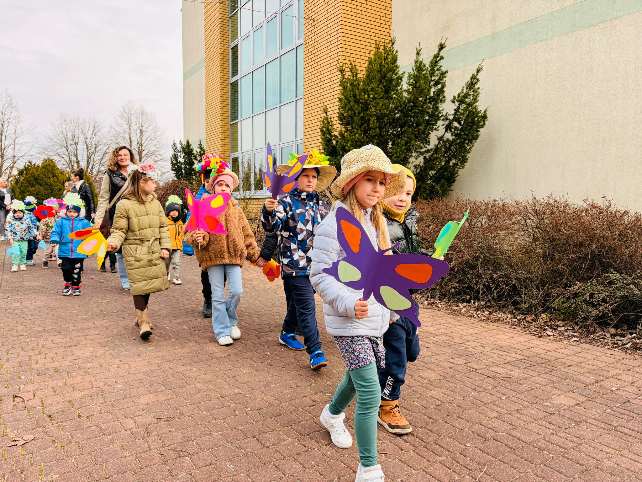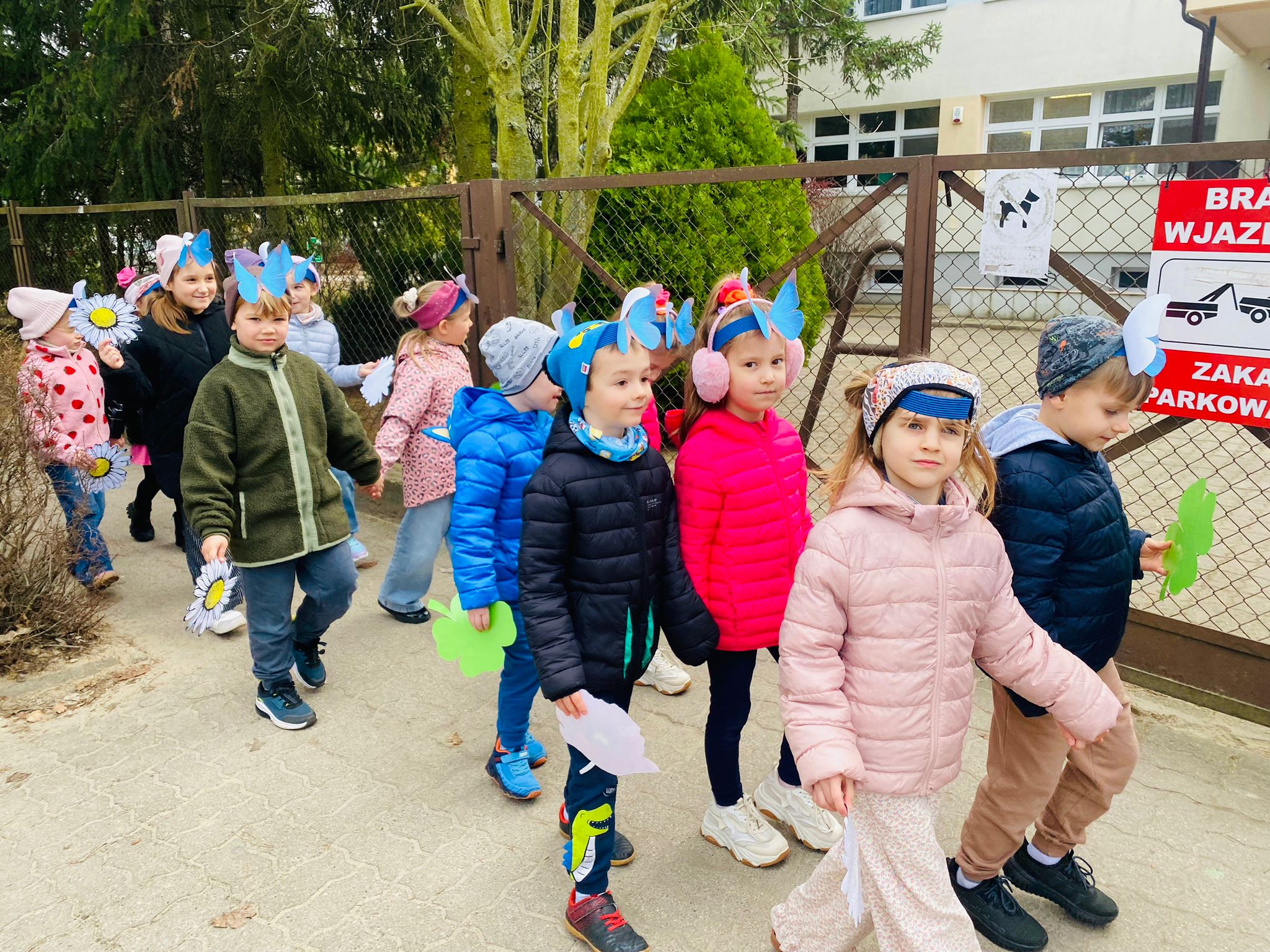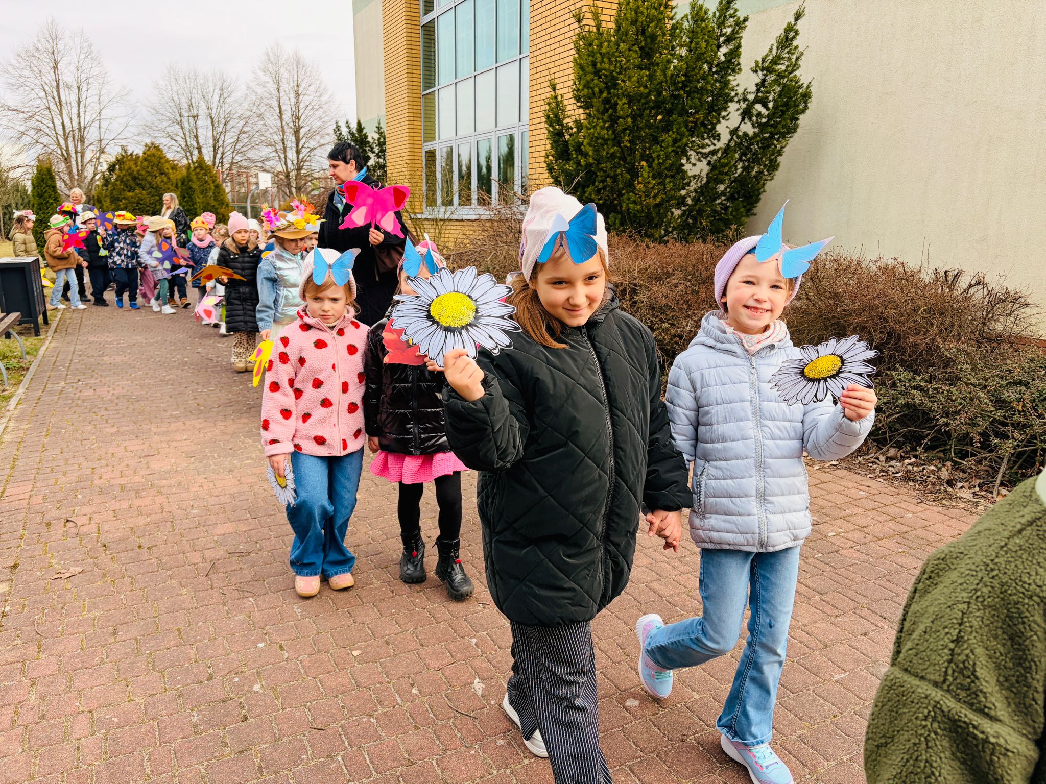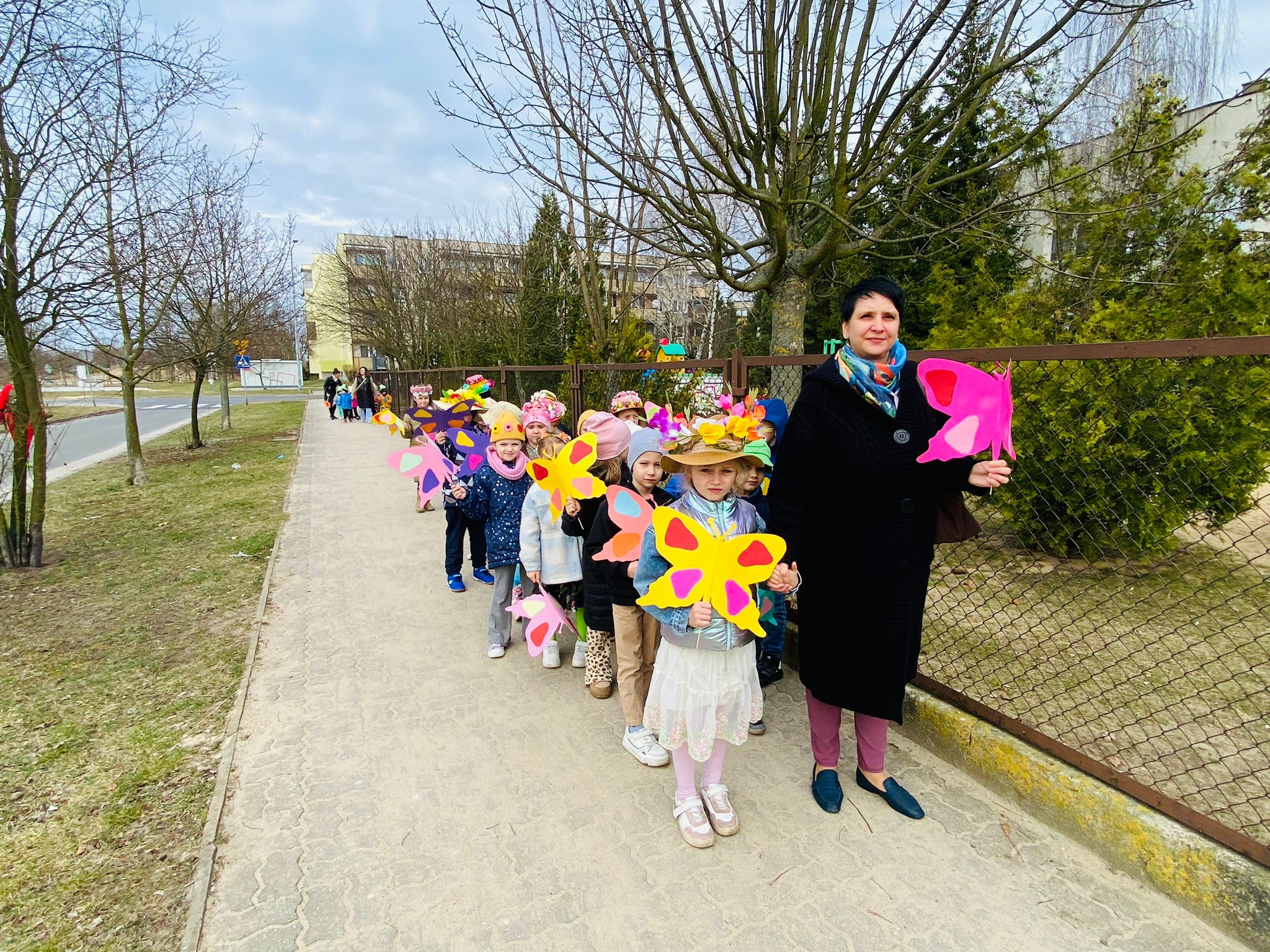 Dzieci wspólnie zaśpiewały piosenkę przed budynkiem przedszkola, a następnie wyruszyły w kolorowym pochodzie ulicami osiedla. Z kwiatami i motylami w dłoniach oraz uśmiechem na twarzach dzieci śpiewały wiosenne piosenki, wprowadzając wszystkich w radosny nastrój. Wiosno! Jak dobrze, że jesteś J