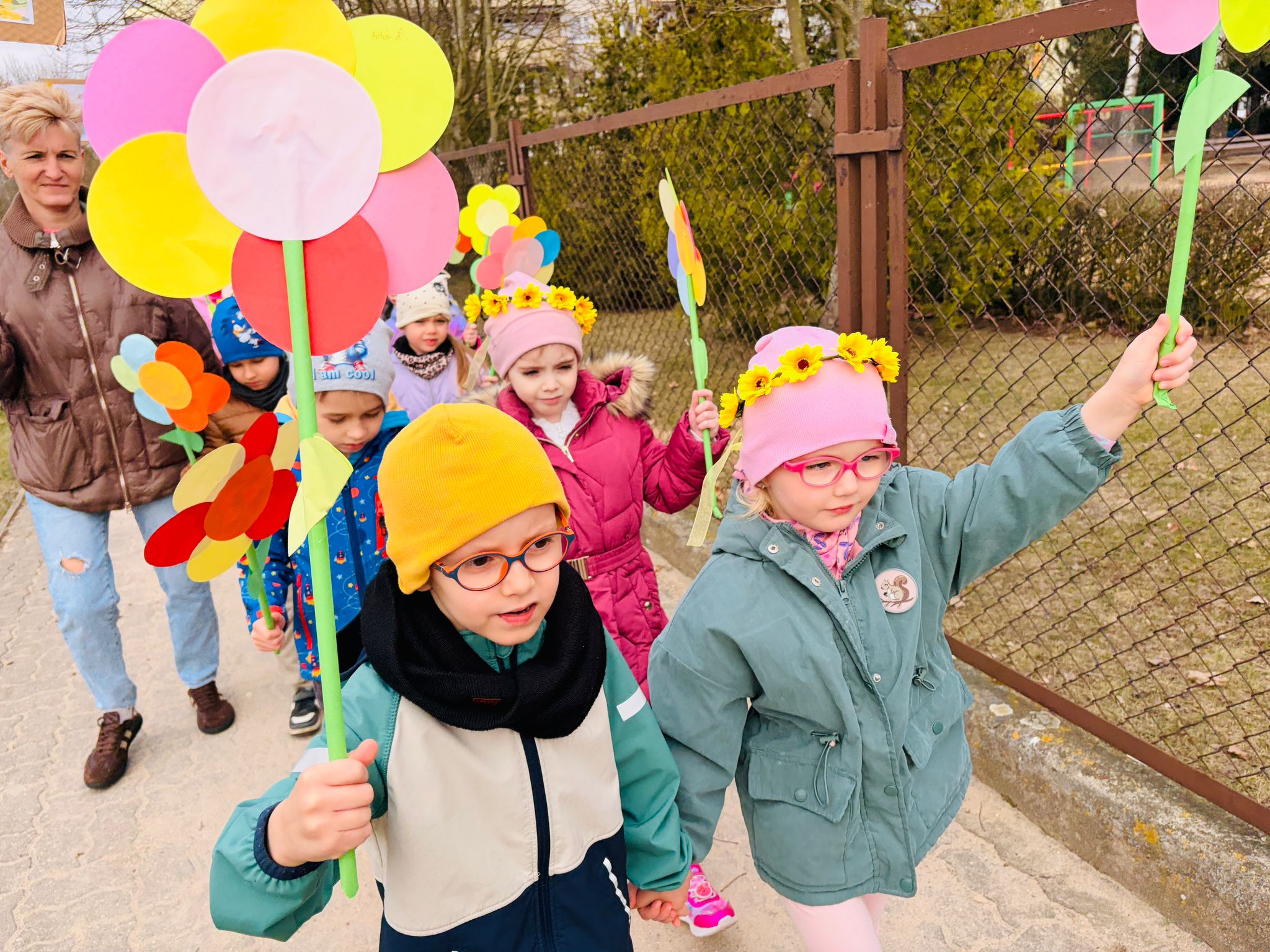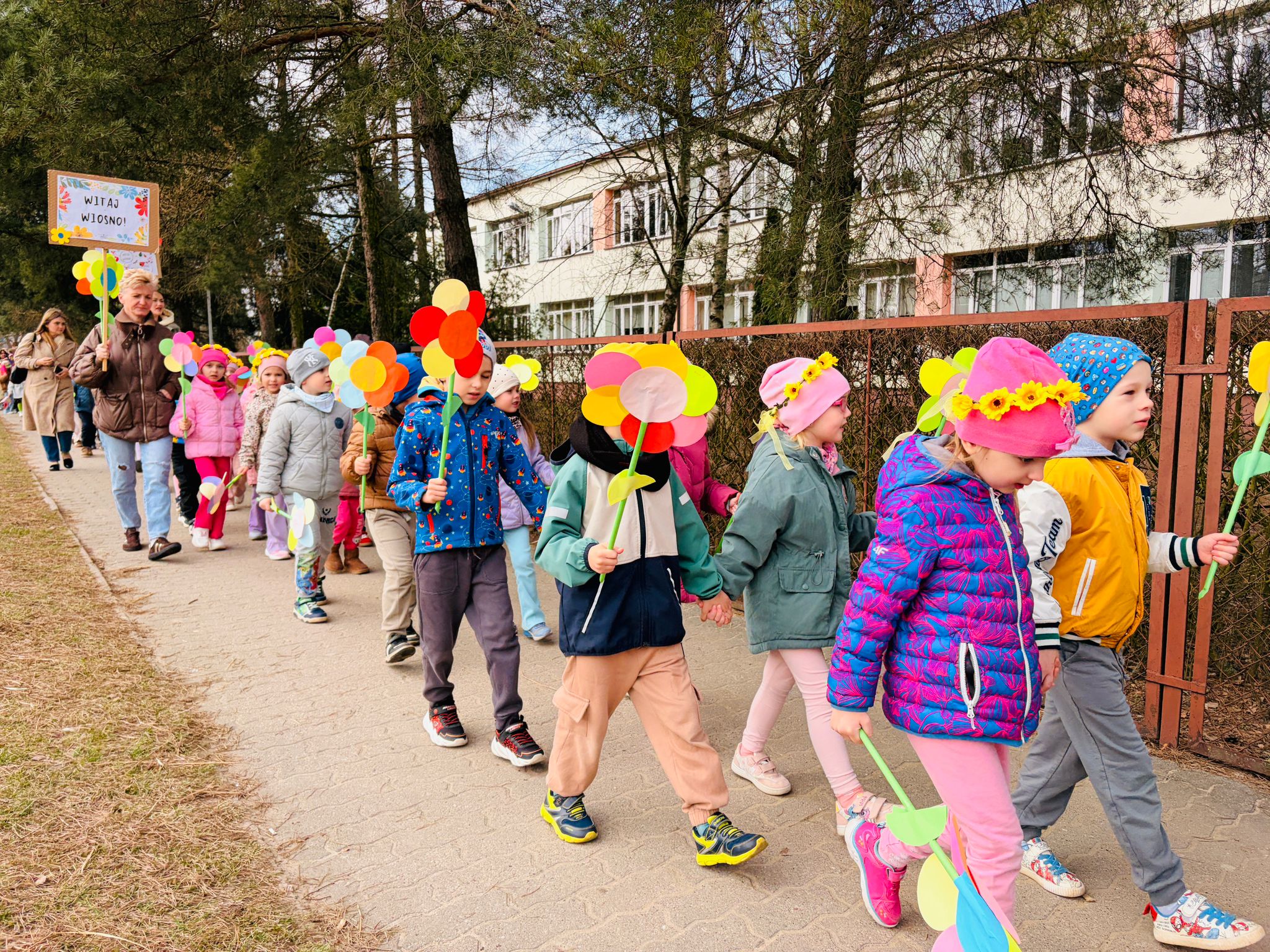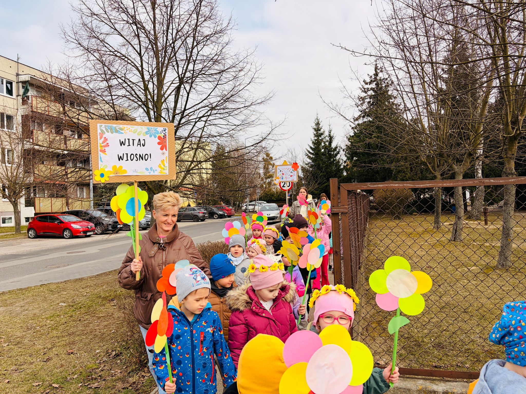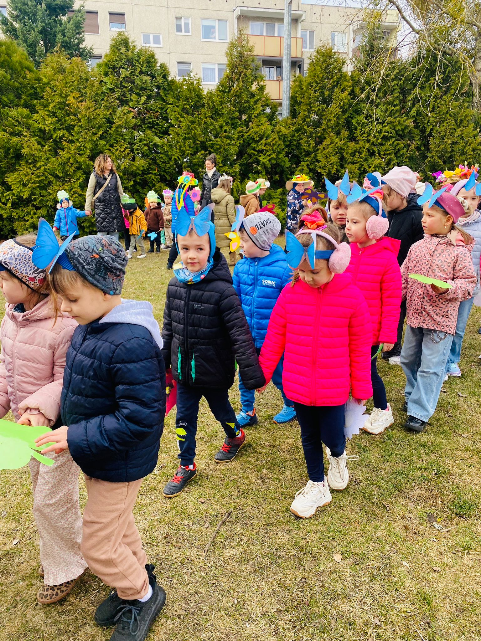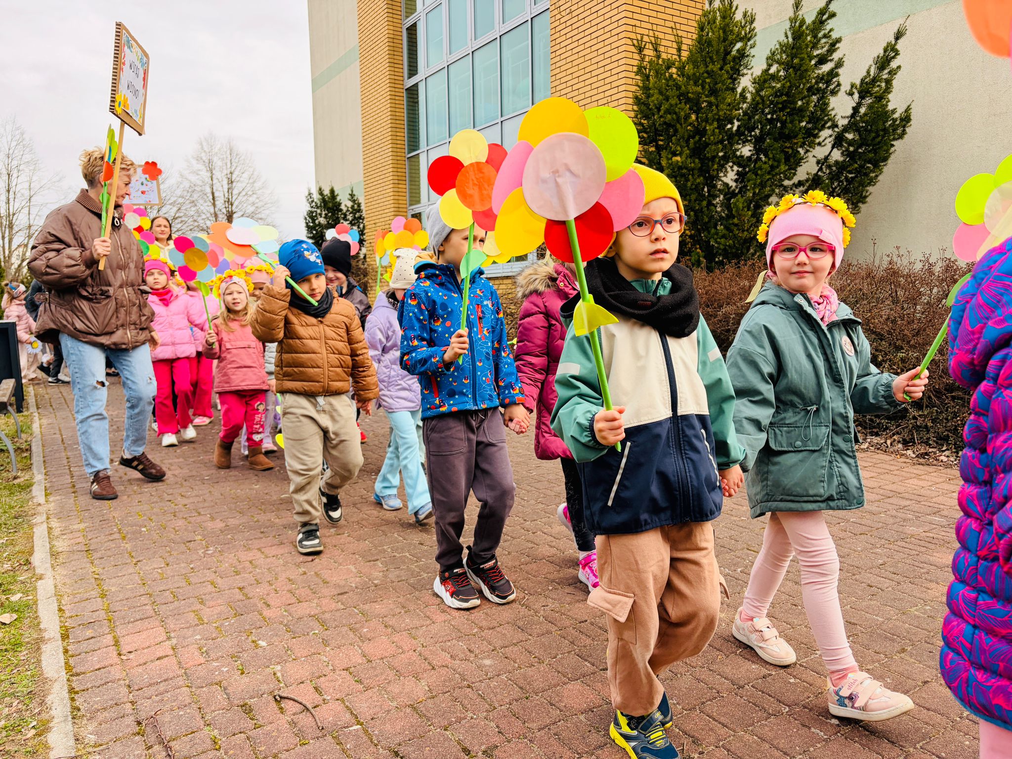 Dzieci wspólnie zaśpiewały piosenkę przed budynkiem przedszkola, a następnie wyruszyły w kolorowym pochodzie ulicami osiedla. Z kwiatami i motylami w dłoniach oraz uśmiechem na twarzach dzieci śpiewały wiosenne piosenki, wprowadzając wszystkich w radosny nastrój. Wiosno! Jak dobrze, że jesteś J