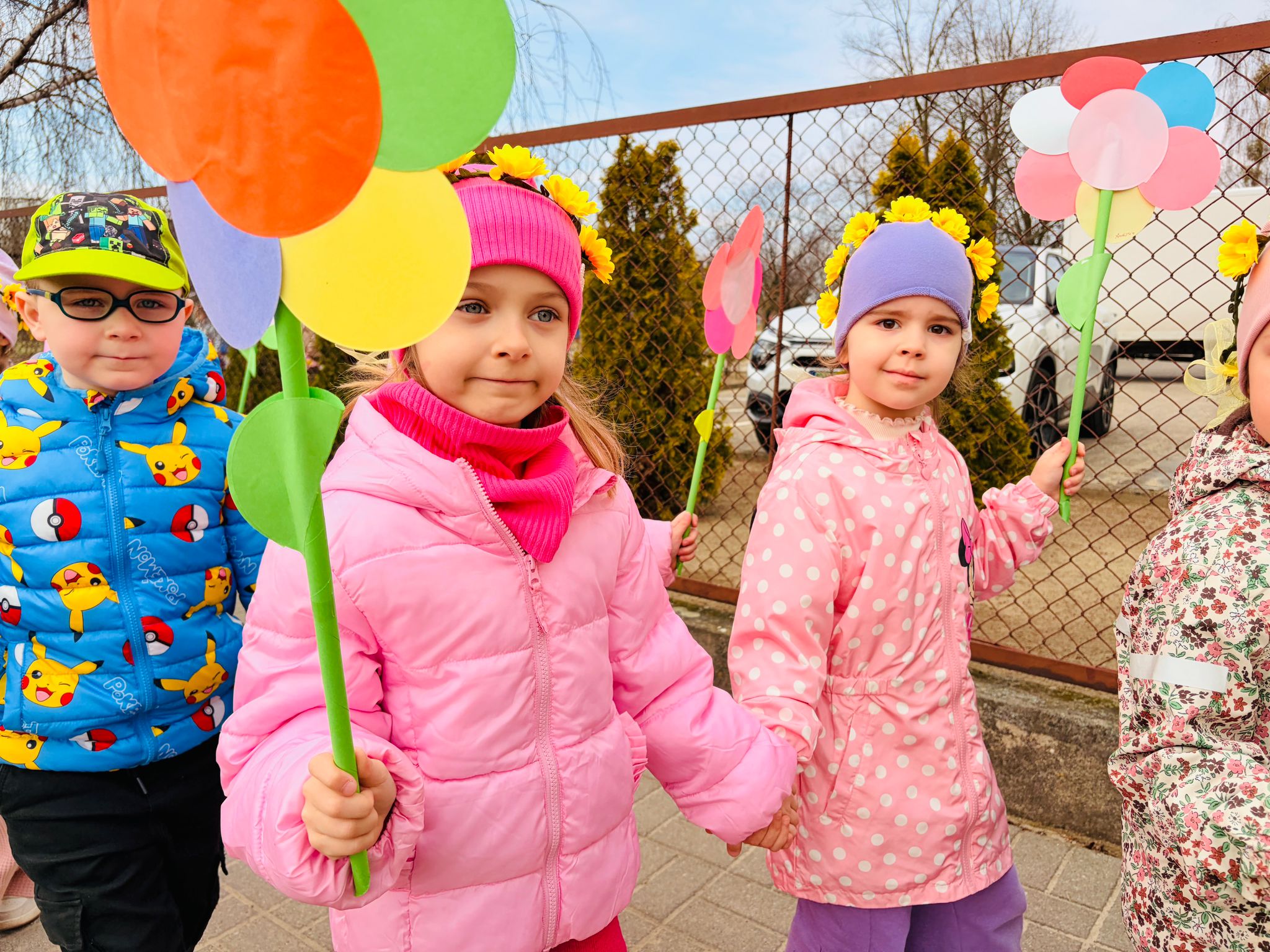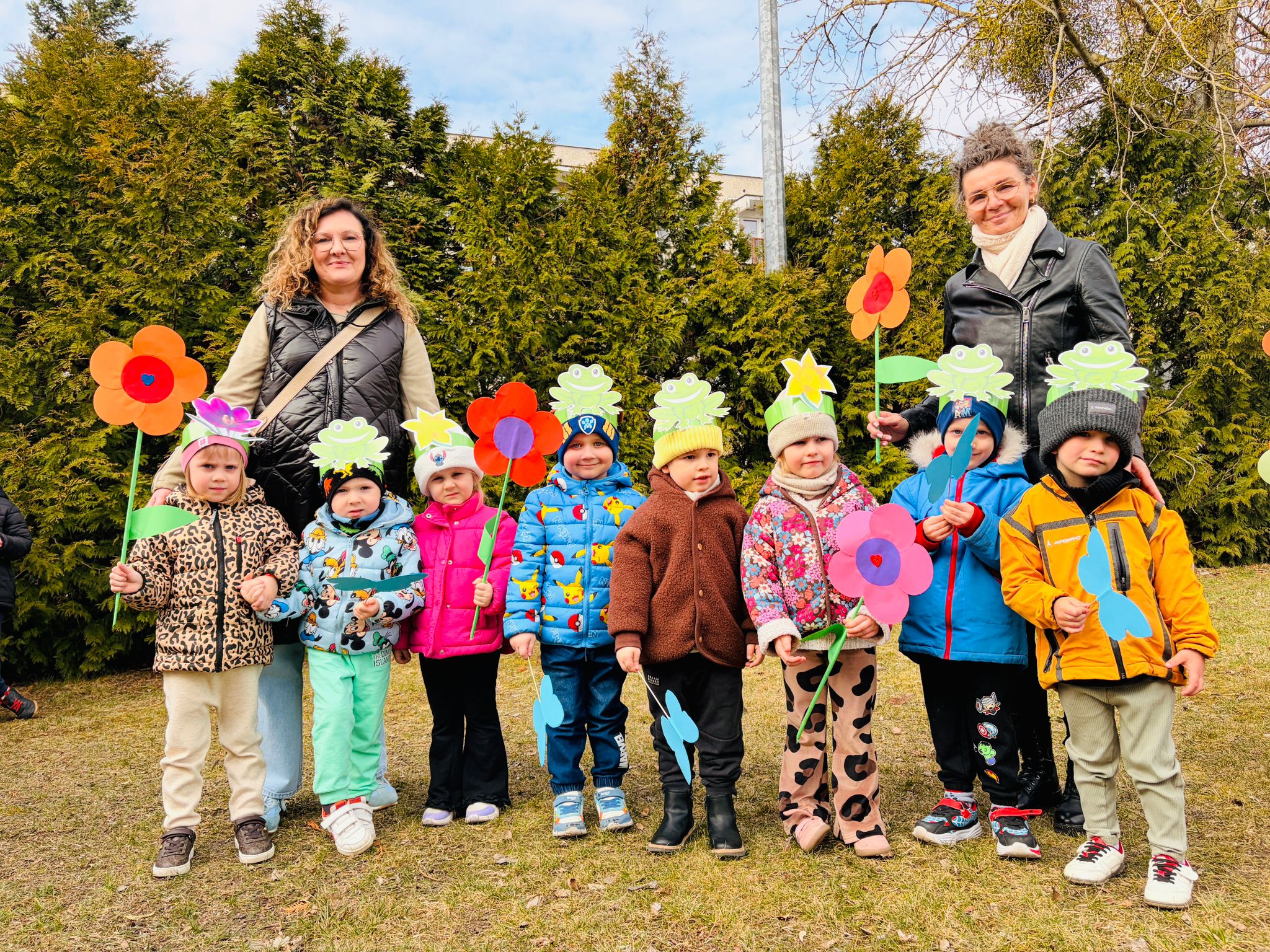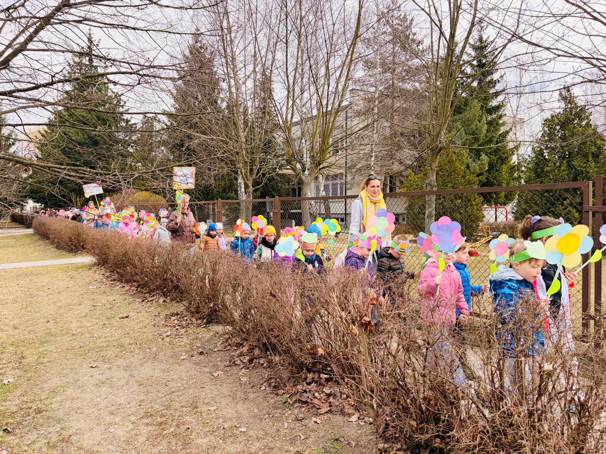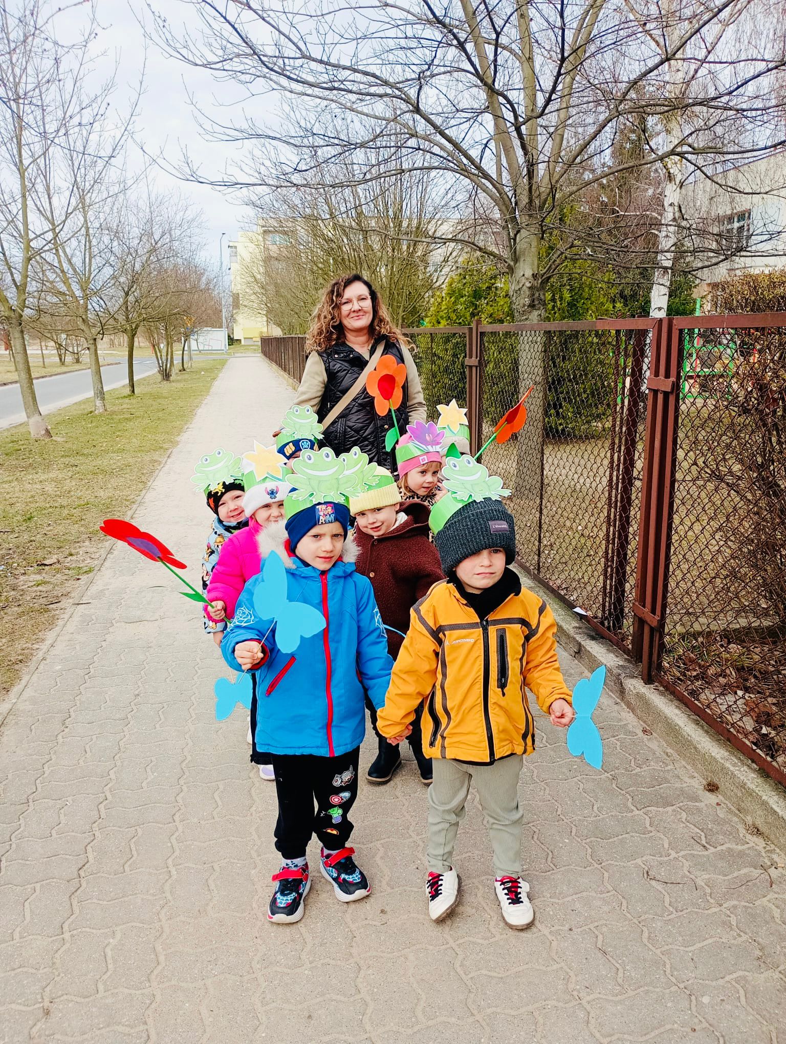 Dzieci wspólnie zaśpiewały piosenkę przed budynkiem przedszkola, a następnie wyruszyły w kolorowym pochodzie ulicami osiedla. Z kwiatami i motylami w dłoniach oraz uśmiechem na twarzach dzieci śpiewały wiosenne piosenki, wprowadzając wszystkich w radosny nastrój. Wiosno! Jak dobrze, że jesteś J