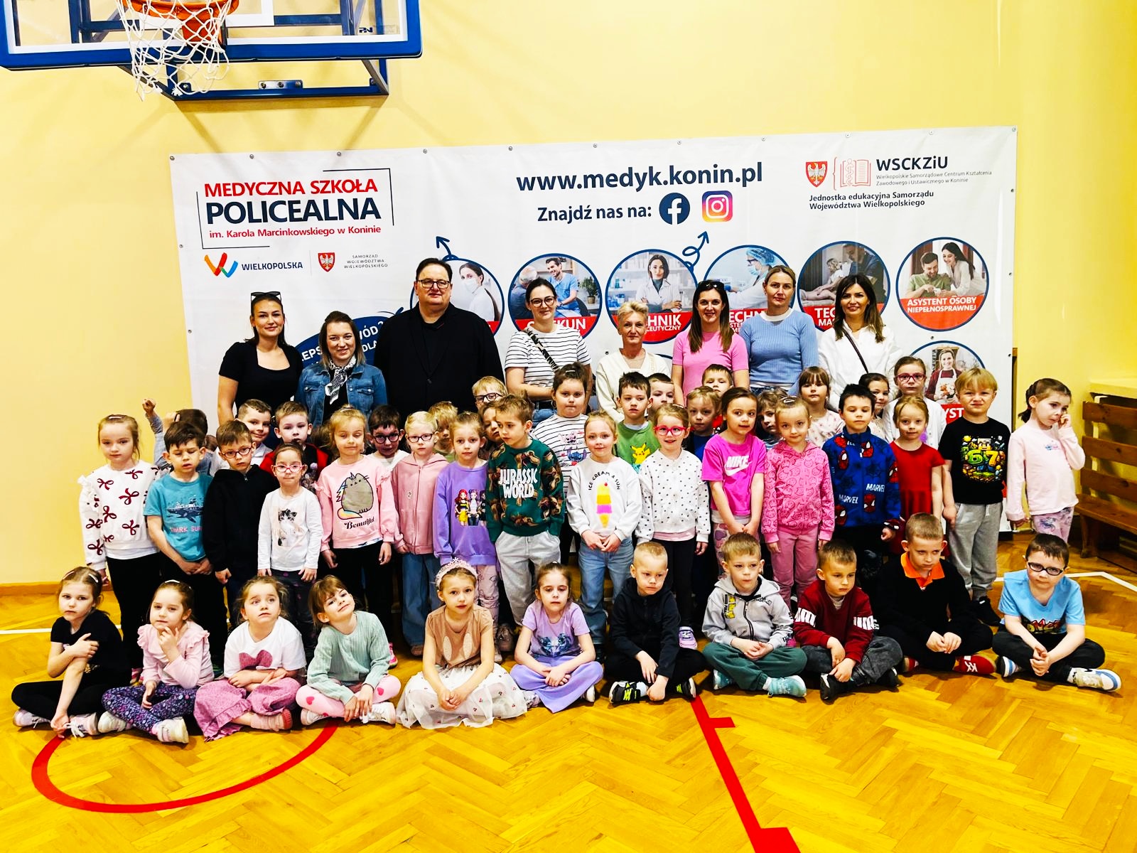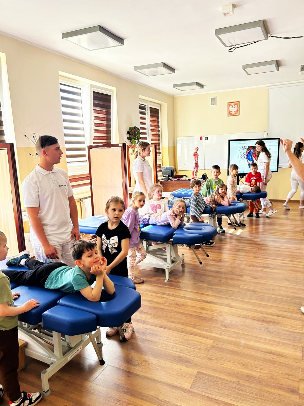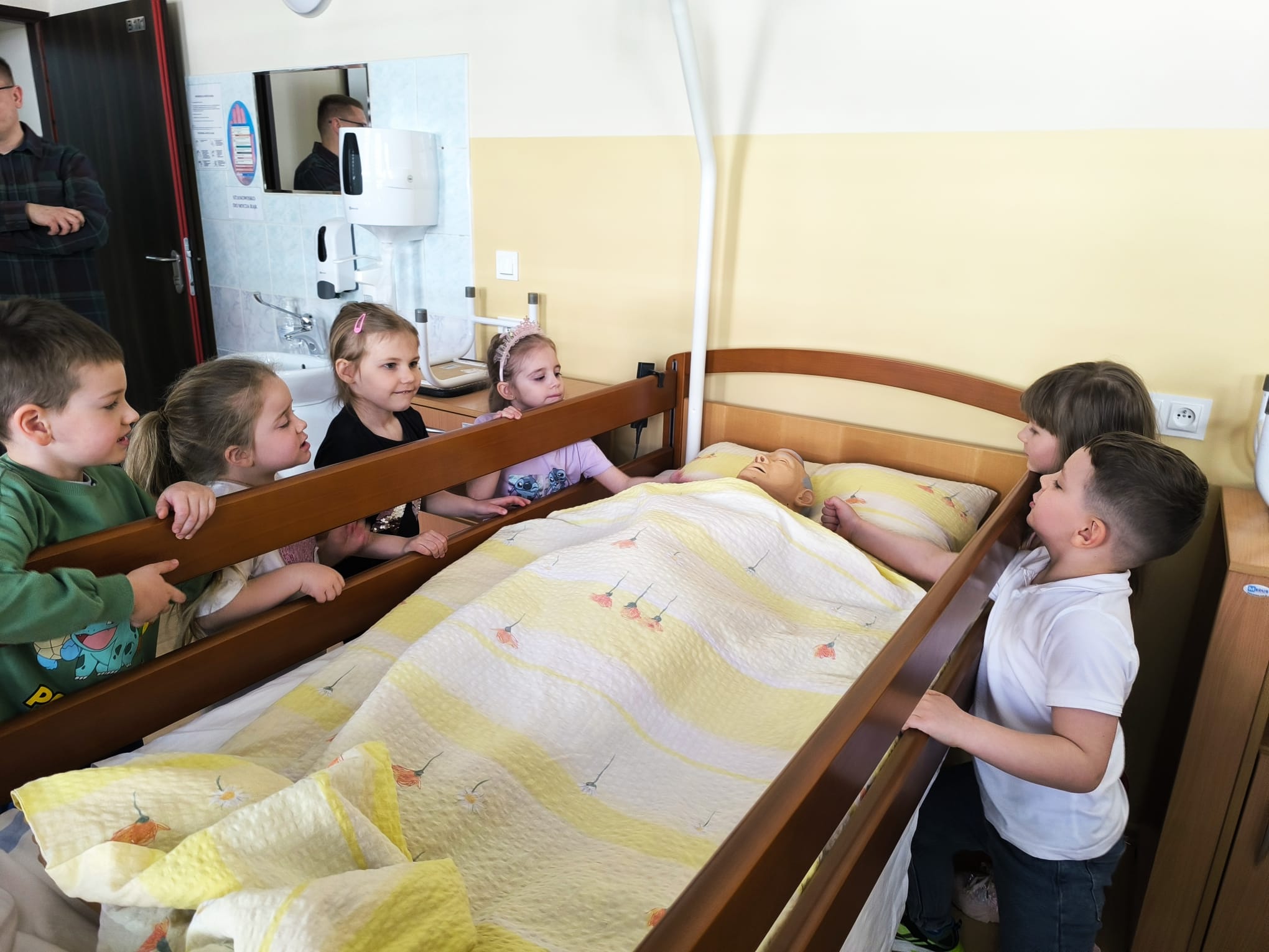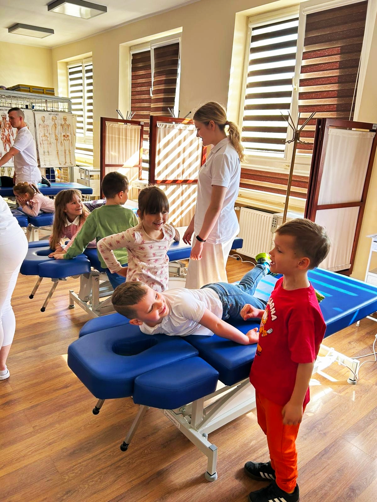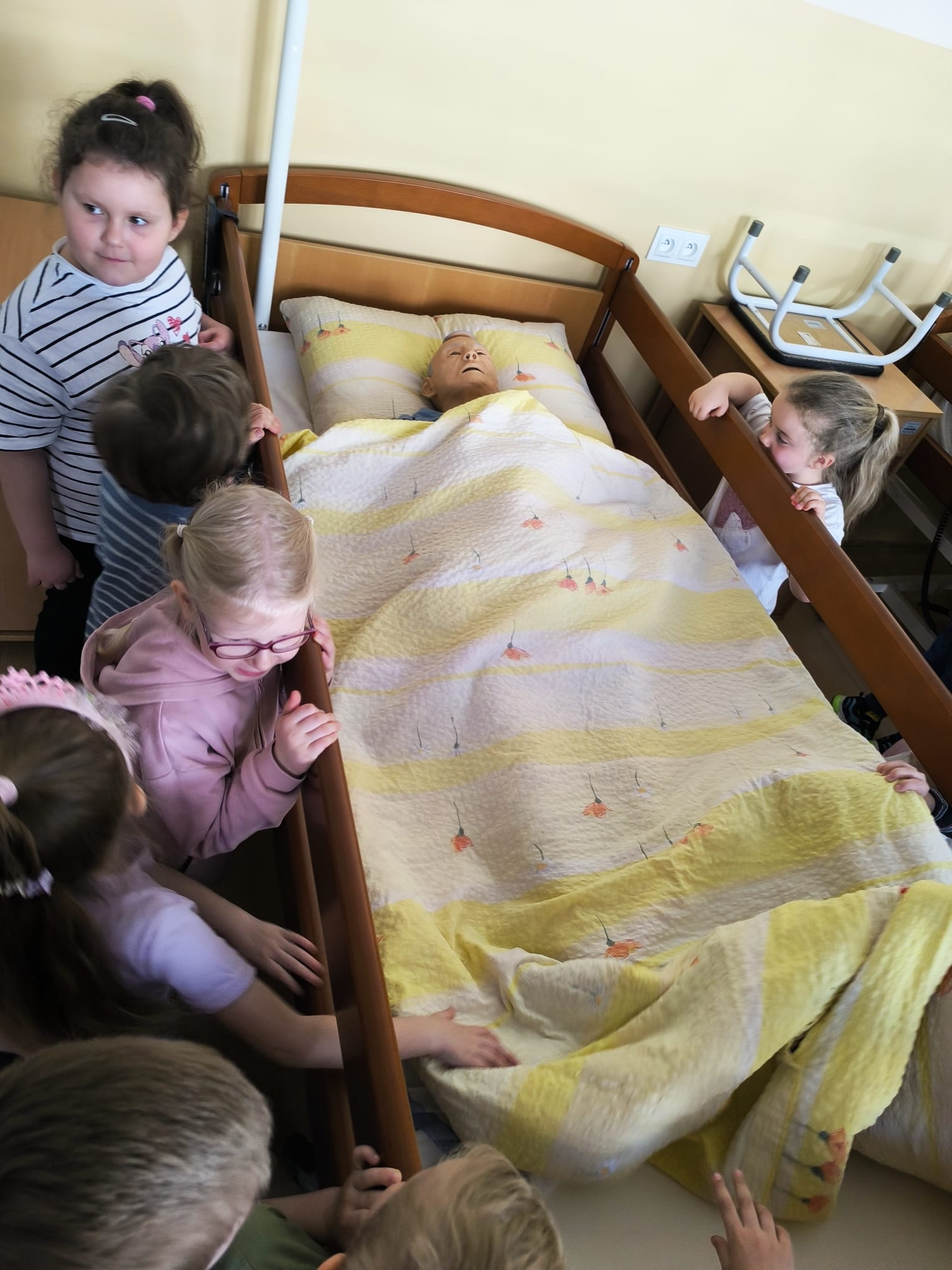 Przedszkolaki z gr. XI i XII w środę 22 kwietnia uczciły niedawno obchodzony Dzień Zdrowia wycieczką do Wielkopolskiego Samorządowego Centrum Kształcenia Zawodowego i Ustawicznego "Medyk" w Koninie. Wizyta w tym miejscu okazała się niezwykle cenną lekcją dla poszerzania wiedzy dzieci na temat zdrowia i prawidłowego stylu życia. W WSCKZiU mogliśmy usłyszeć o wielu zawodach medycznych, do których szkoła przygotowuje chętne osoby. Widzieliśmy również sale wyposażone w profesjonalny sprzęt, by słuchacze mogli zdobywać wiedzę nie tylko teoretyczną, ale również praktyczną- m.in. salę wyglądającą, jak prawdziwy gabinet dentystyczny, czy salę dla chorych, starszych osób, które wymagają szczególnej opieki. Dzieci na własnej skórze mogły doświadczyć masażu, przekonały się, że farmacja i chemia mają wiele wspólnego z magią, a na koniec kolejny raz udowodniły, że ruch to zdrowie. Nie obyło się również bez pysznego poczęstunku- by zdobyć siły do dalszych działań. Wszystkie aktywności, dzięki uprzejmości pracowników i słuchaczy, odbywały się w fantastycznej atmosferze za co z całego serca dziękujemy- szczególnie Panu Wojciechowi Szymczakowi za udzielenie zgody na odwiedziny placówki i miłe powitanie, Panu Piotrowi Rosińskiemu- dziadkowi naszej Antosi z gr. XII za zainicjowanie spotkania oraz Panu Markowi Sobierajskiemu za organizację i koordynowanie wszystkich atrakcji. Mamy nadzieję, że to nie ostatnia wizyta przedszkolaków w tak ciekawym miejscu