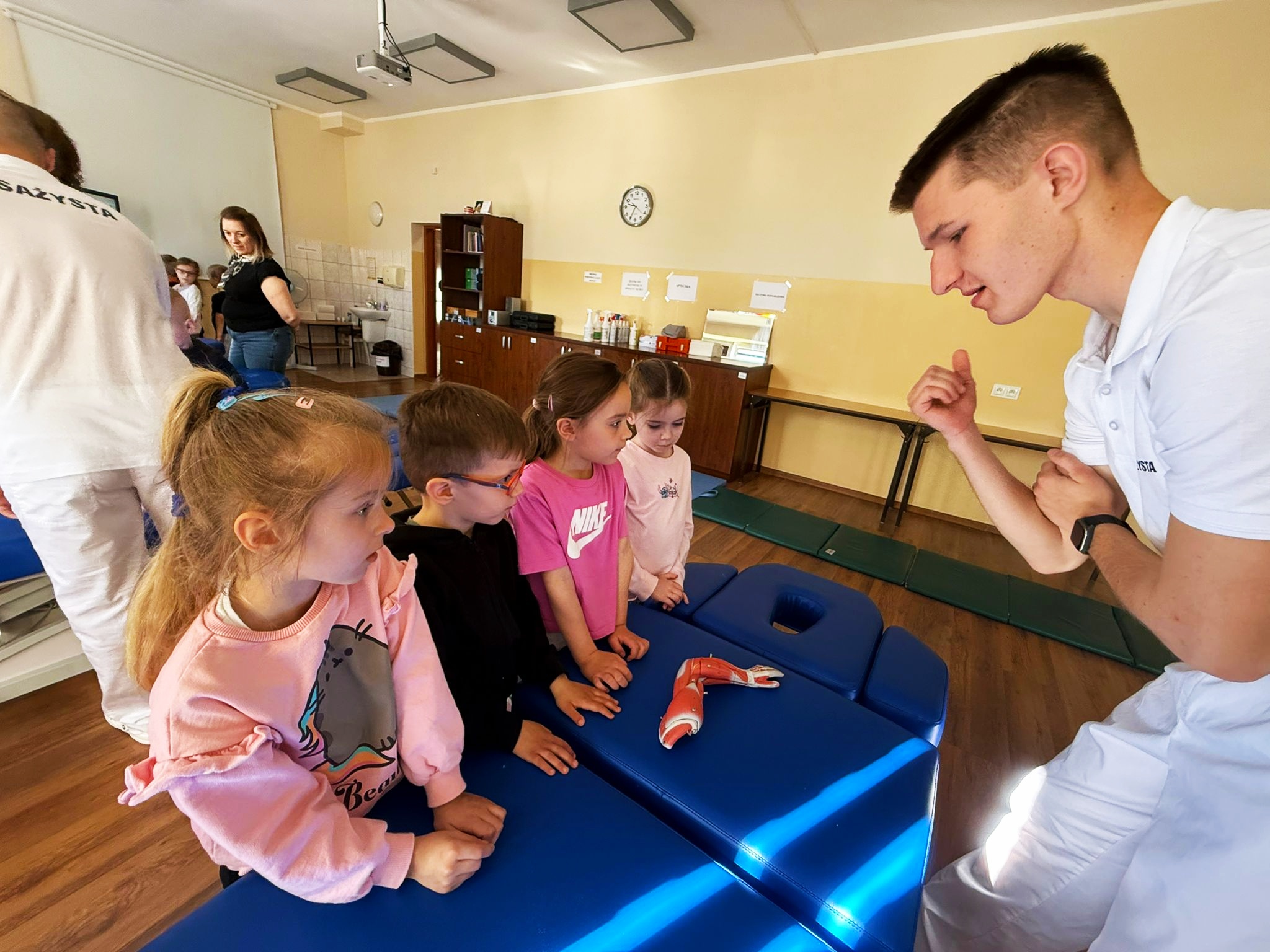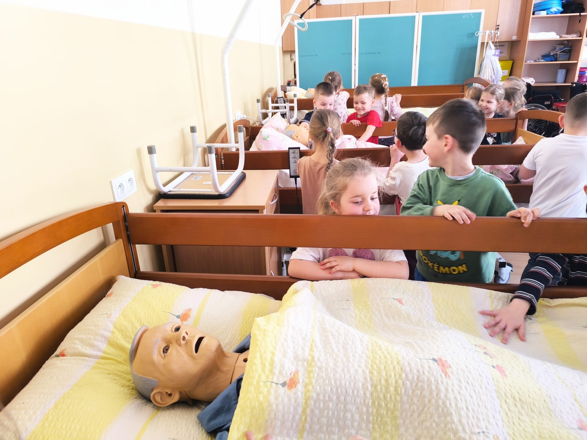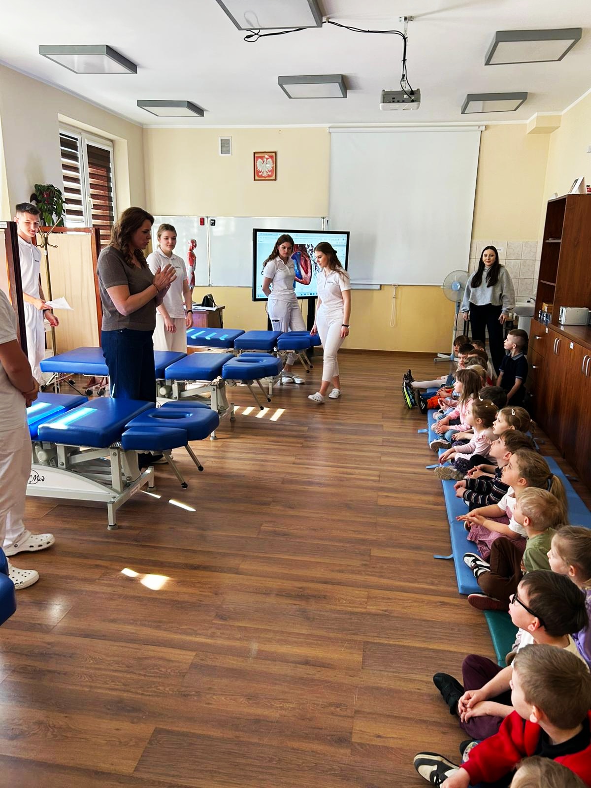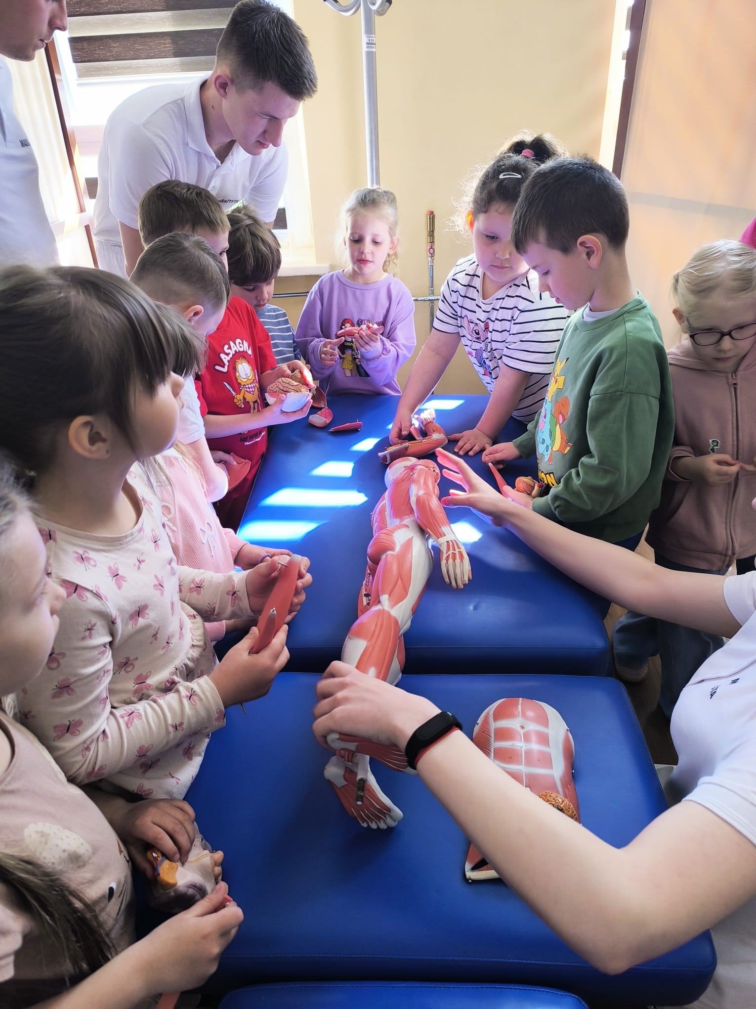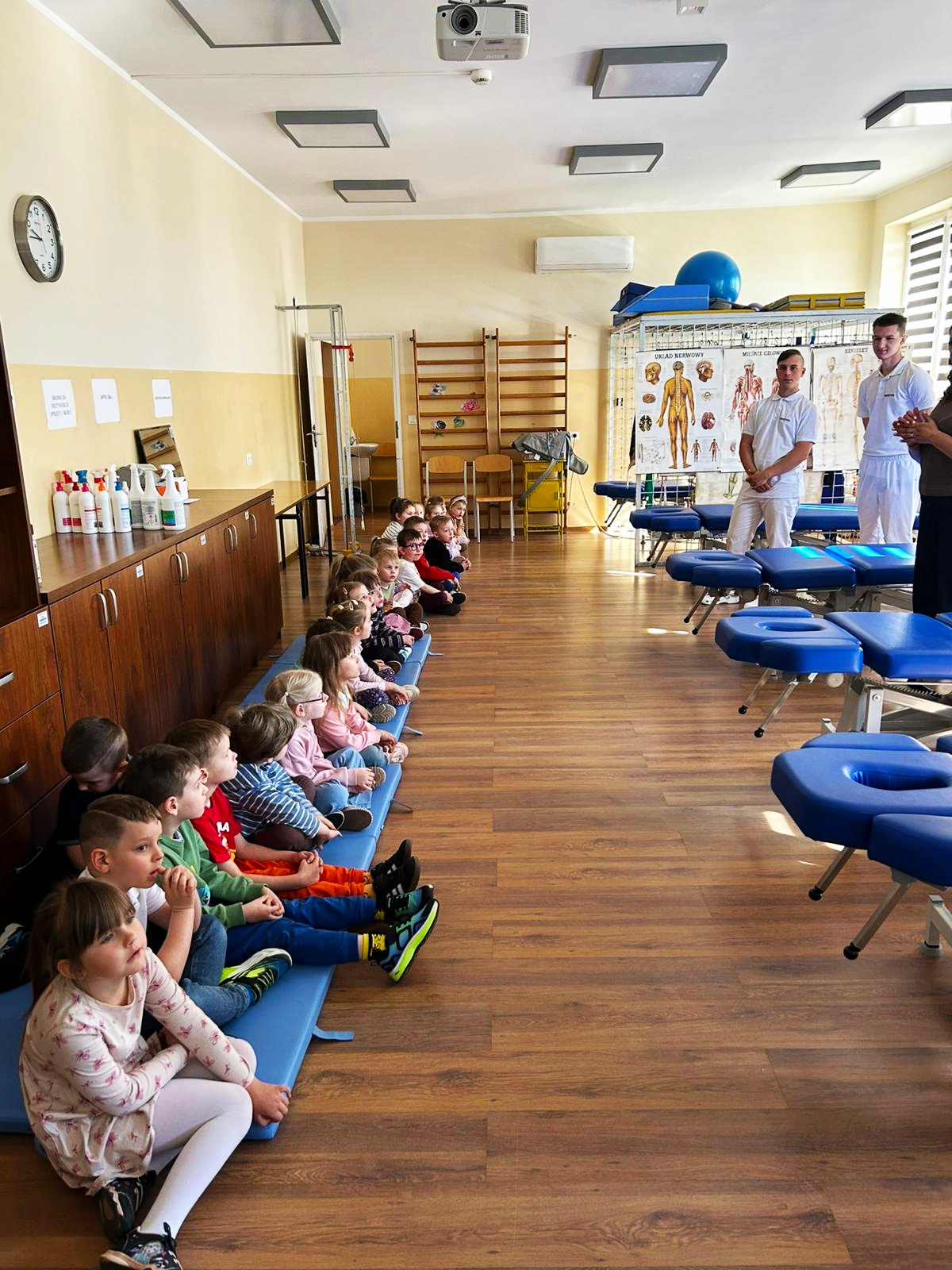 Przedszkolaki z gr. XI i XII w środę 22 kwietnia uczciły niedawno obchodzony Dzień Zdrowia wycieczką do Wielkopolskiego Samorządowego Centrum Kształcenia Zawodowego i Ustawicznego "Medyk" w Koninie. Wizyta w tym miejscu okazała się niezwykle cenną lekcją dla poszerzania wiedzy dzieci na temat zdrowia i prawidłowego stylu życia. W WSCKZiU mogliśmy usłyszeć o wielu zawodach medycznych, do których szkoła przygotowuje chętne osoby. Widzieliśmy również sale wyposażone w profesjonalny sprzęt, by słuchacze mogli zdobywać wiedzę nie tylko teoretyczną, ale również praktyczną- m.in. salę wyglądającą, jak prawdziwy gabinet dentystyczny, czy salę dla chorych, starszych osób, które wymagają szczególnej opieki. Dzieci na własnej skórze mogły doświadczyć masażu, przekonały się, że farmacja i chemia mają wiele wspólnego z magią, a na koniec kolejny raz udowodniły, że ruch to zdrowie. Nie obyło się również bez pysznego poczęstunku- by zdobyć siły do dalszych działań. Wszystkie aktywności, dzięki uprzejmości pracowników i słuchaczy, odbywały się w fantastycznej atmosferze za co z całego serca dziękujemy- szczególnie Panu Wojciechowi Szymczakowi za udzielenie zgody na odwiedziny placówki i miłe powitanie, Panu Piotrowi Rosińskiemu- dziadkowi naszej Antosi z gr. XII za zainicjowanie spotkania oraz Panu Markowi Sobierajskiemu za organizację i koordynowanie wszystkich atrakcji. Mamy nadzieję, że to nie ostatnia wizyta przedszkolaków w tak ciekawym miejscu