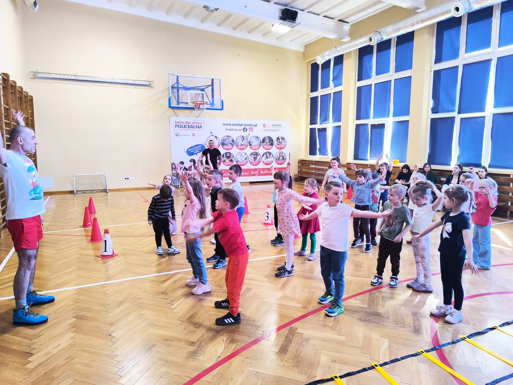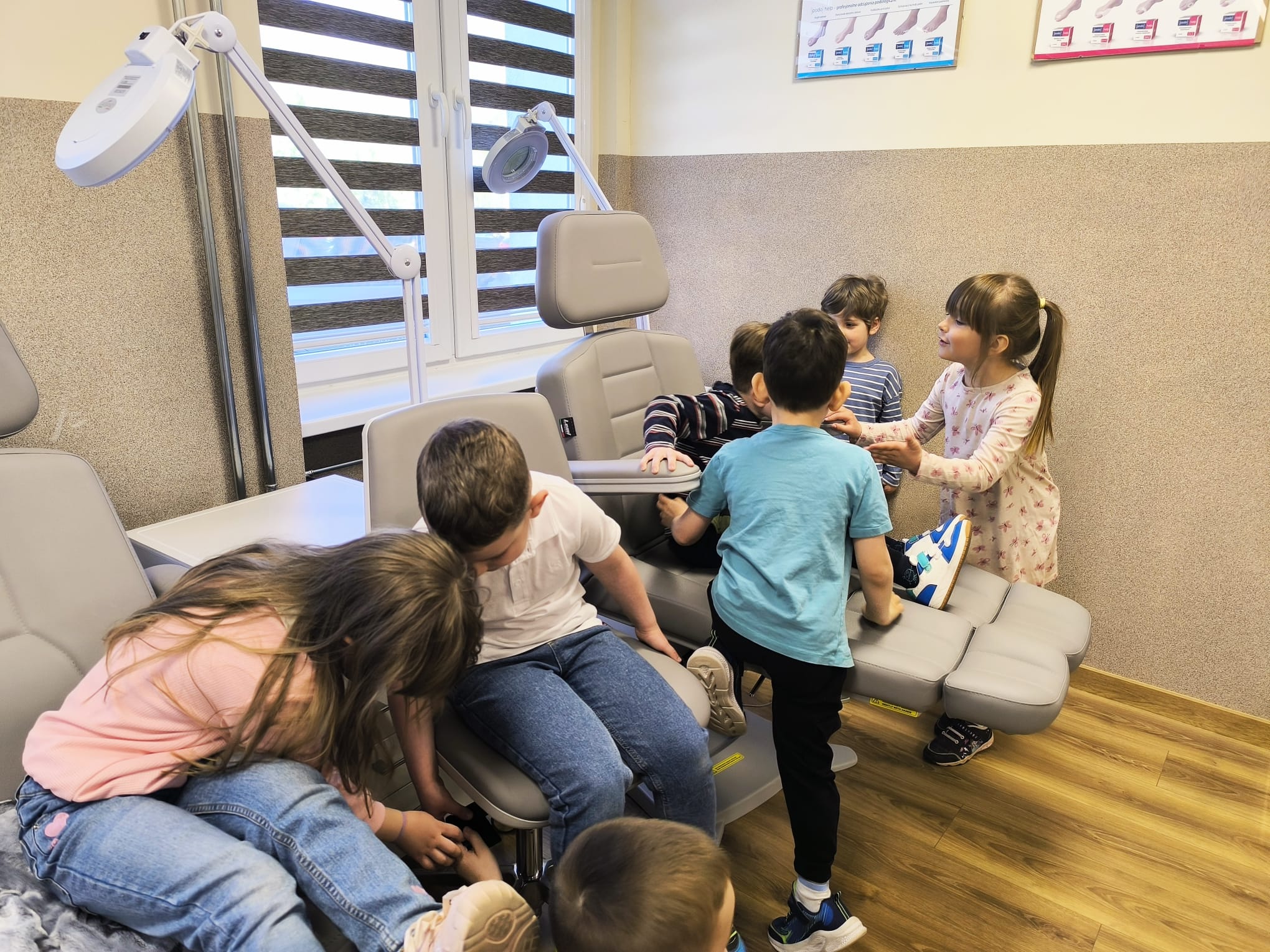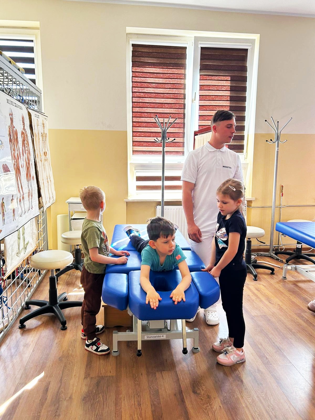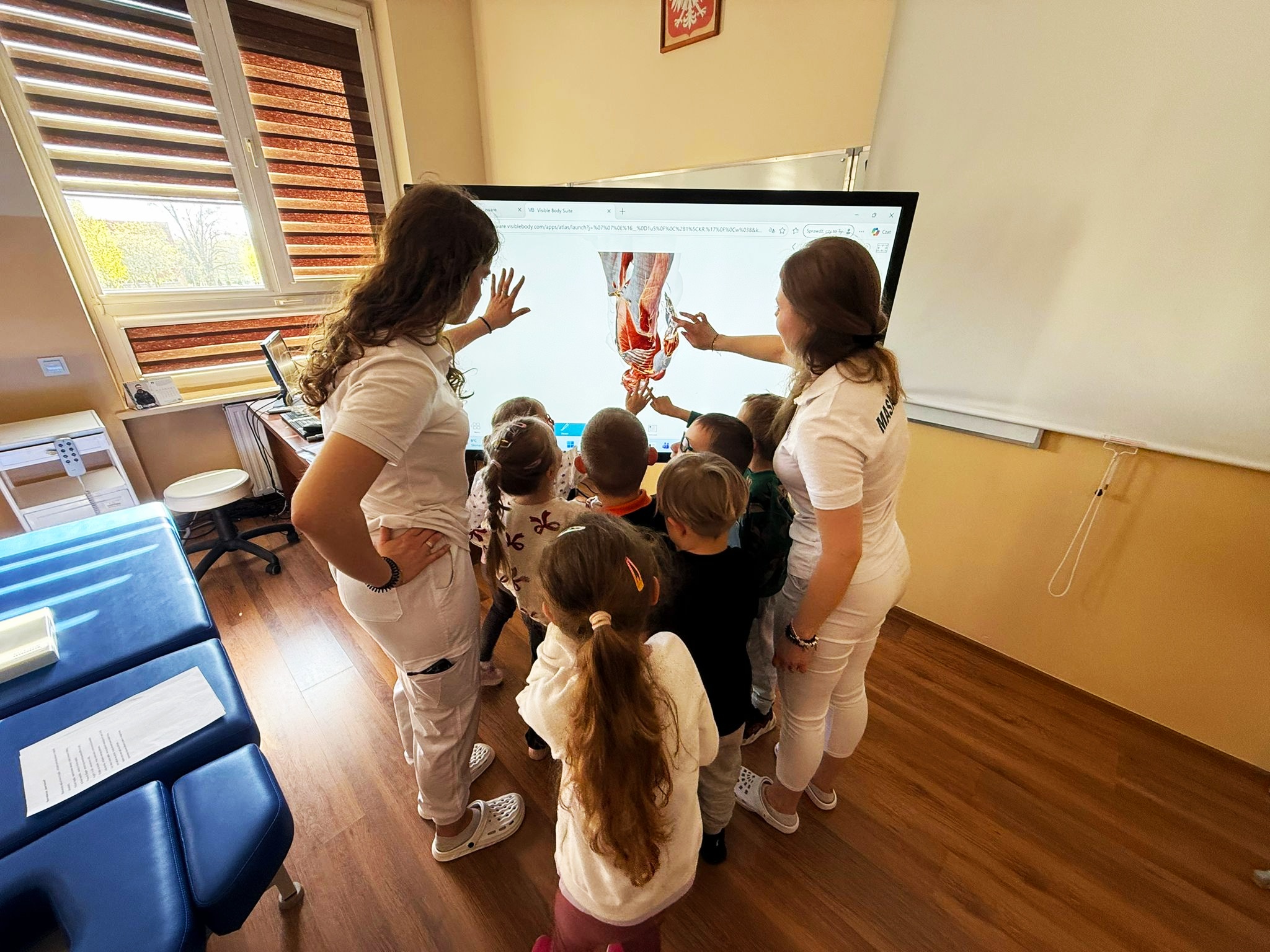 Przedszkolaki z gr. XI i XII w środę 22 kwietnia uczciły niedawno obchodzony Dzień Zdrowia wycieczką do Wielkopolskiego Samorządowego Centrum Kształcenia Zawodowego i Ustawicznego "Medyk" w Koninie. Wizyta w tym miejscu okazała się niezwykle cenną lekcją dla poszerzania wiedzy dzieci na temat zdrowia i prawidłowego stylu życia. W WSCKZiU mogliśmy usłyszeć o wielu zawodach medycznych, do których szkoła przygotowuje chętne osoby. Widzieliśmy również sale wyposażone w profesjonalny sprzęt, by słuchacze mogli zdobywać wiedzę nie tylko teoretyczną, ale również praktyczną- m.in. salę wyglądającą, jak prawdziwy gabinet dentystyczny, czy salę dla chorych, starszych osób, które wymagają szczególnej opieki. Dzieci na własnej skórze mogły doświadczyć masażu, przekonały się, że farmacja i chemia mają wiele wspólnego z magią, a na koniec kolejny raz udowodniły, że ruch to zdrowie. Nie obyło się również bez pysznego poczęstunku- by zdobyć siły do dalszych działań. Wszystkie aktywności, dzięki uprzejmości pracowników i słuchaczy, odbywały się w fantastycznej atmosferze za co z całego serca dziękujemy- szczególnie Panu Wojciechowi Szymczakowi za udzielenie zgody na odwiedziny placówki i miłe powitanie, Panu Piotrowi Rosińskiemu- dziadkowi naszej Antosi z gr. XII za zainicjowanie spotkania oraz Panu Markowi Sobierajskiemu za organizację i koordynowanie wszystkich atrakcji. Mamy nadzieję, że to nie ostatnia wizyta przedszkolaków w tak ciekawym miejscu