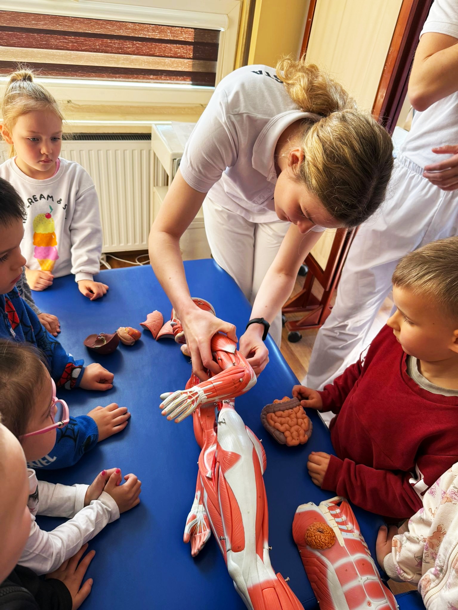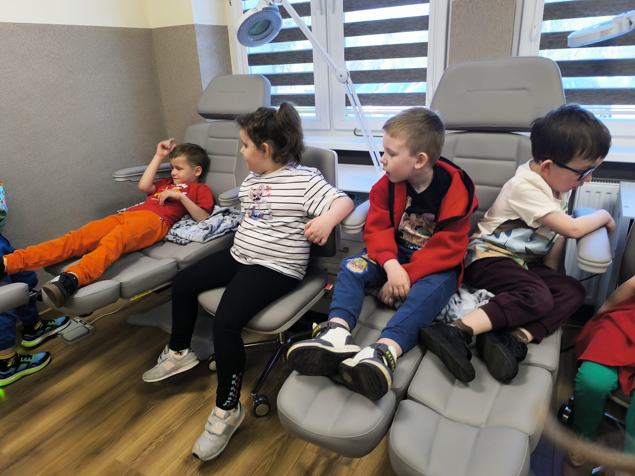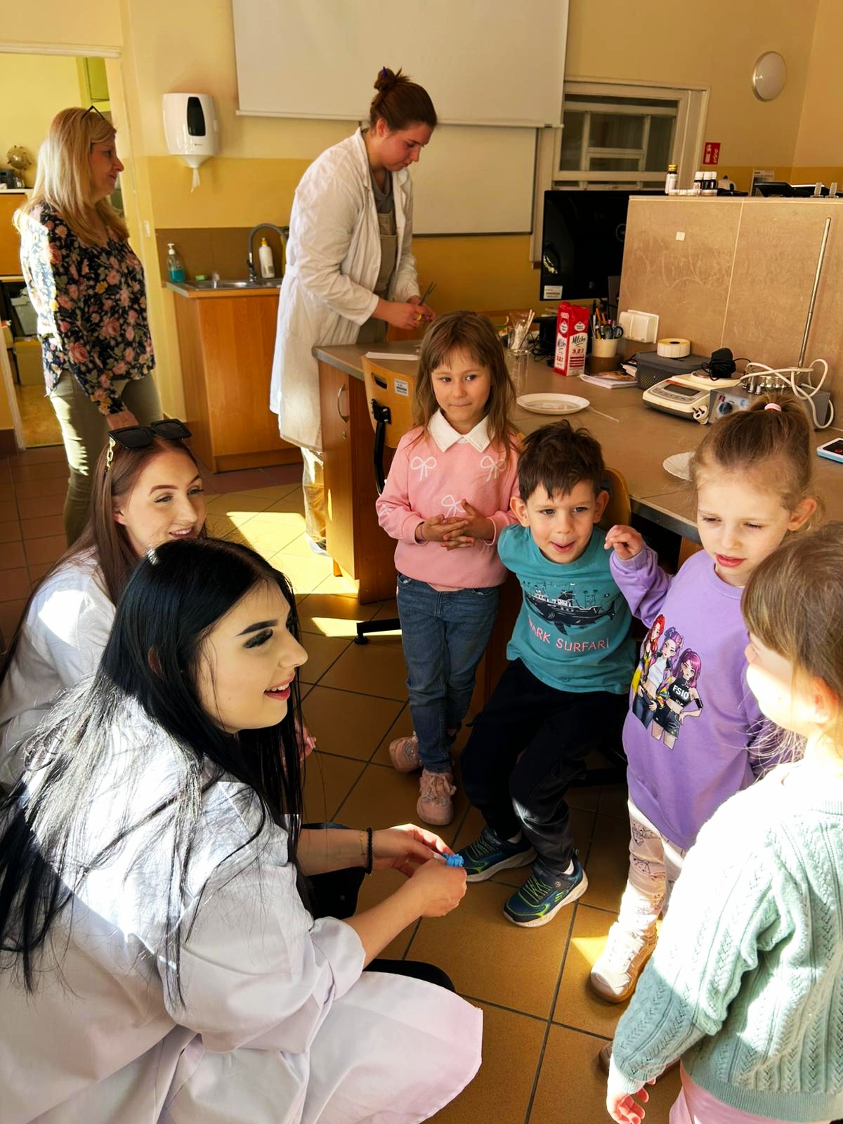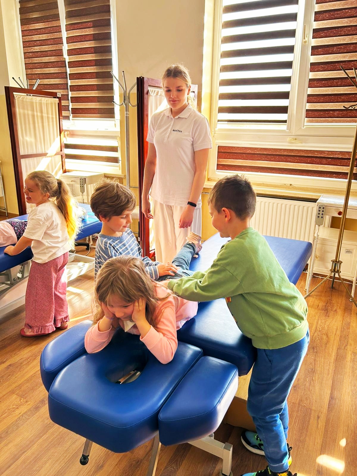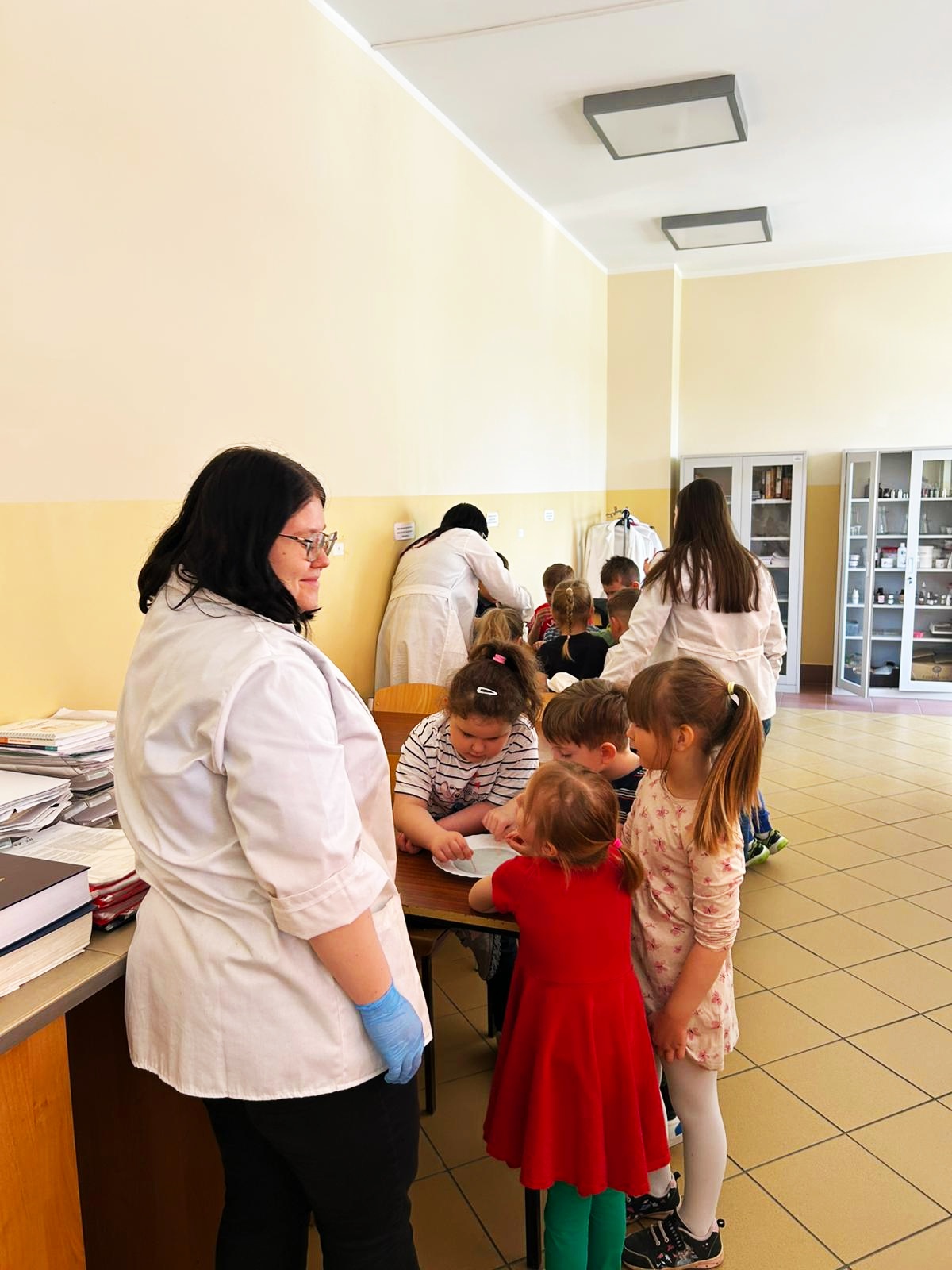 Przedszkolaki z gr. XI i XII w środę 22 kwietnia uczciły niedawno obchodzony Dzień Zdrowia wycieczką do Wielkopolskiego Samorządowego Centrum Kształcenia Zawodowego i Ustawicznego "Medyk" w Koninie. Wizyta w tym miejscu okazała się niezwykle cenną lekcją dla poszerzania wiedzy dzieci na temat zdrowia i prawidłowego stylu życia. W WSCKZiU mogliśmy usłyszeć o wielu zawodach medycznych, do których szkoła przygotowuje chętne osoby. Widzieliśmy również sale wyposażone w profesjonalny sprzęt, by słuchacze mogli zdobywać wiedzę nie tylko teoretyczną, ale również praktyczną- m.in. salę wyglądającą, jak prawdziwy gabinet dentystyczny, czy salę dla chorych, starszych osób, które wymagają szczególnej opieki. Dzieci na własnej skórze mogły doświadczyć masażu, przekonały się, że farmacja i chemia mają wiele wspólnego z magią, a na koniec kolejny raz udowodniły, że ruch to zdrowie. Nie obyło się również bez pysznego poczęstunku- by zdobyć siły do dalszych działań. Wszystkie aktywności, dzięki uprzejmości pracowników i słuchaczy, odbywały się w fantastycznej atmosferze za co z całego serca dziękujemy- szczególnie Panu Wojciechowi Szymczakowi za udzielenie zgody na odwiedziny placówki i miłe powitanie, Panu Piotrowi Rosińskiemu- dziadkowi naszej Antosi z gr. XII za zainicjowanie spotkania oraz Panu Markowi Sobierajskiemu za organizację i koordynowanie wszystkich atrakcji. Mamy nadzieję, że to nie ostatnia wizyta przedszkolaków w tak ciekawym miejscu