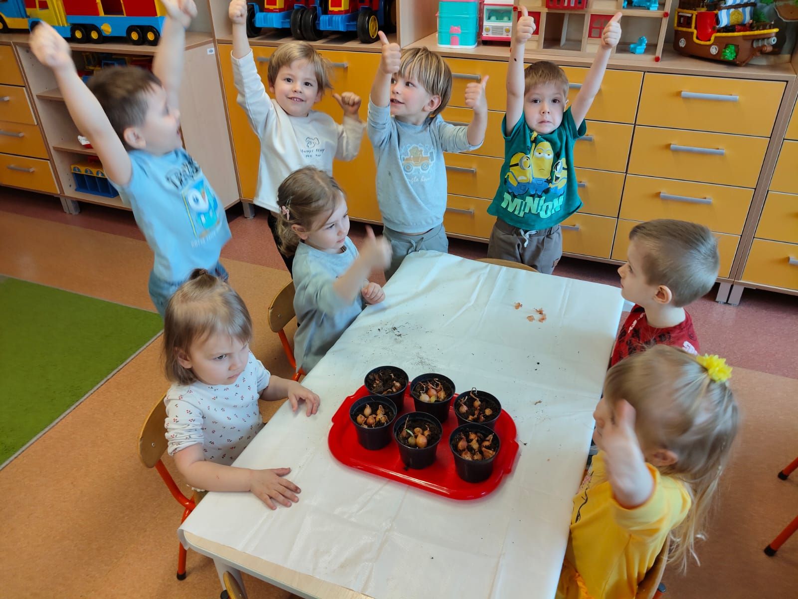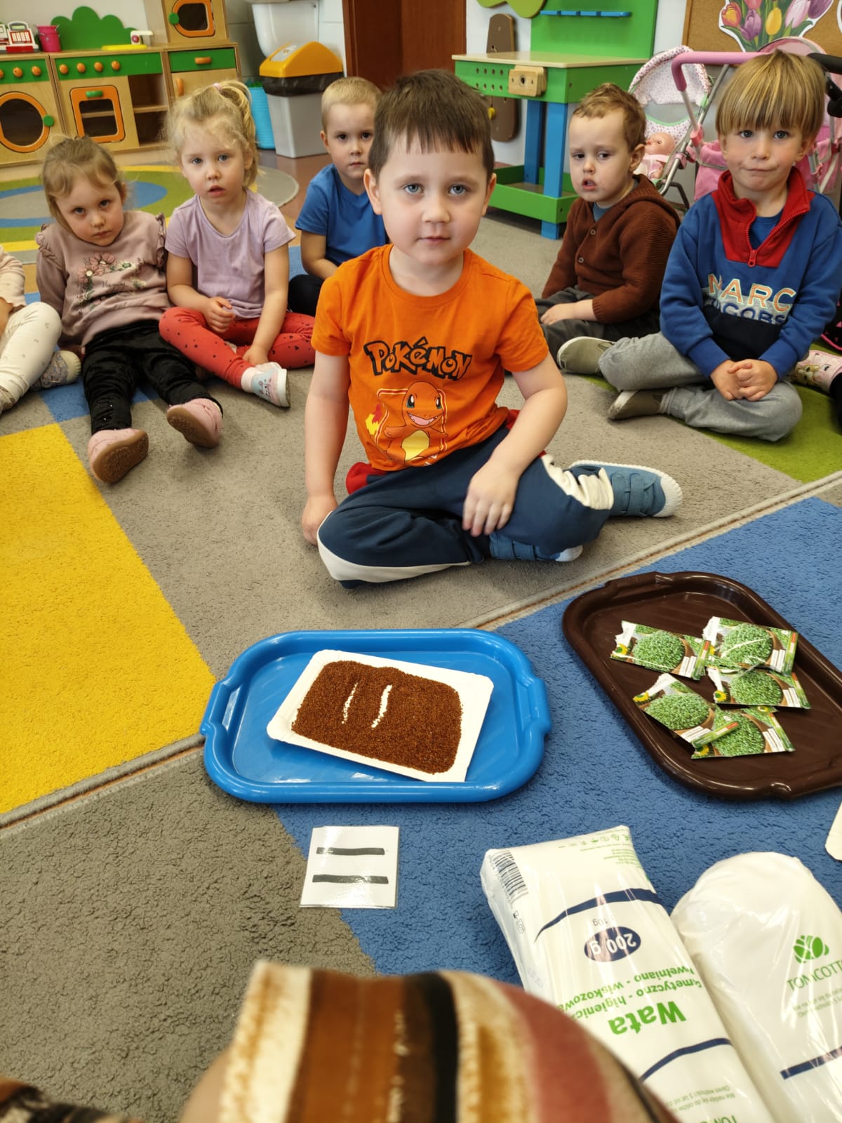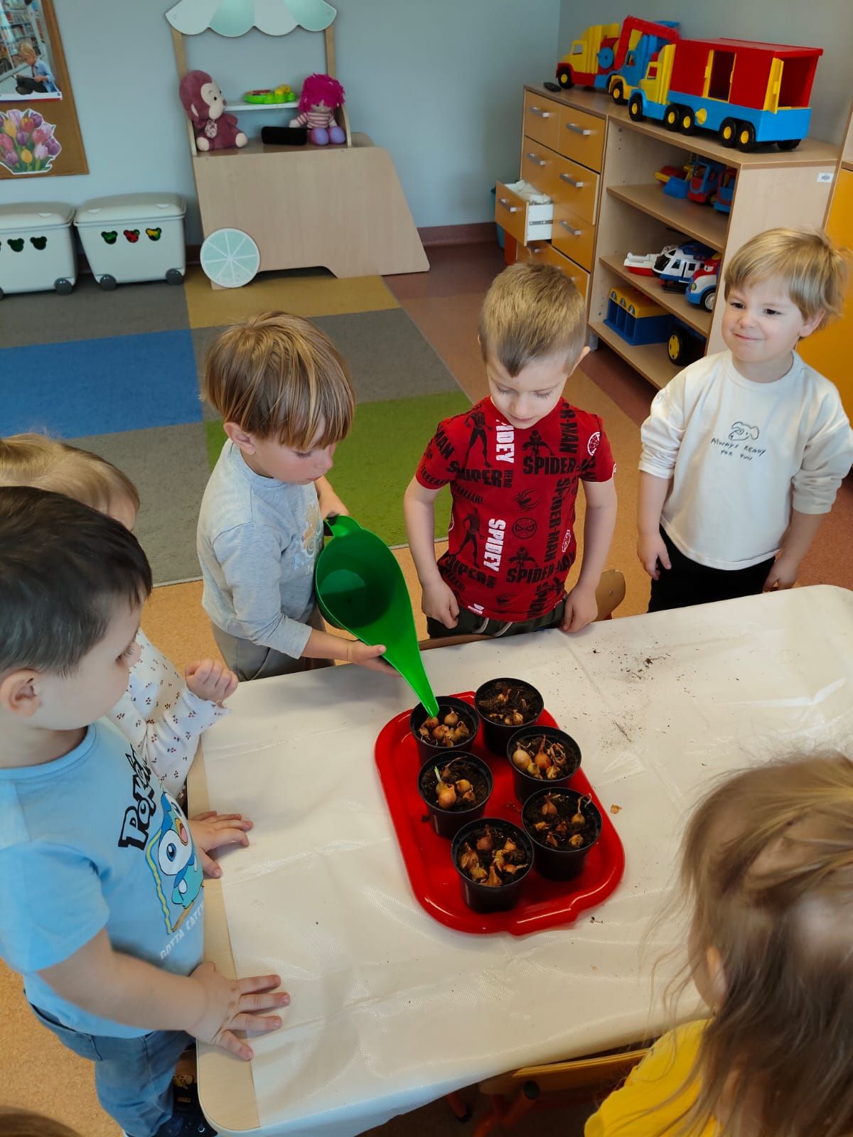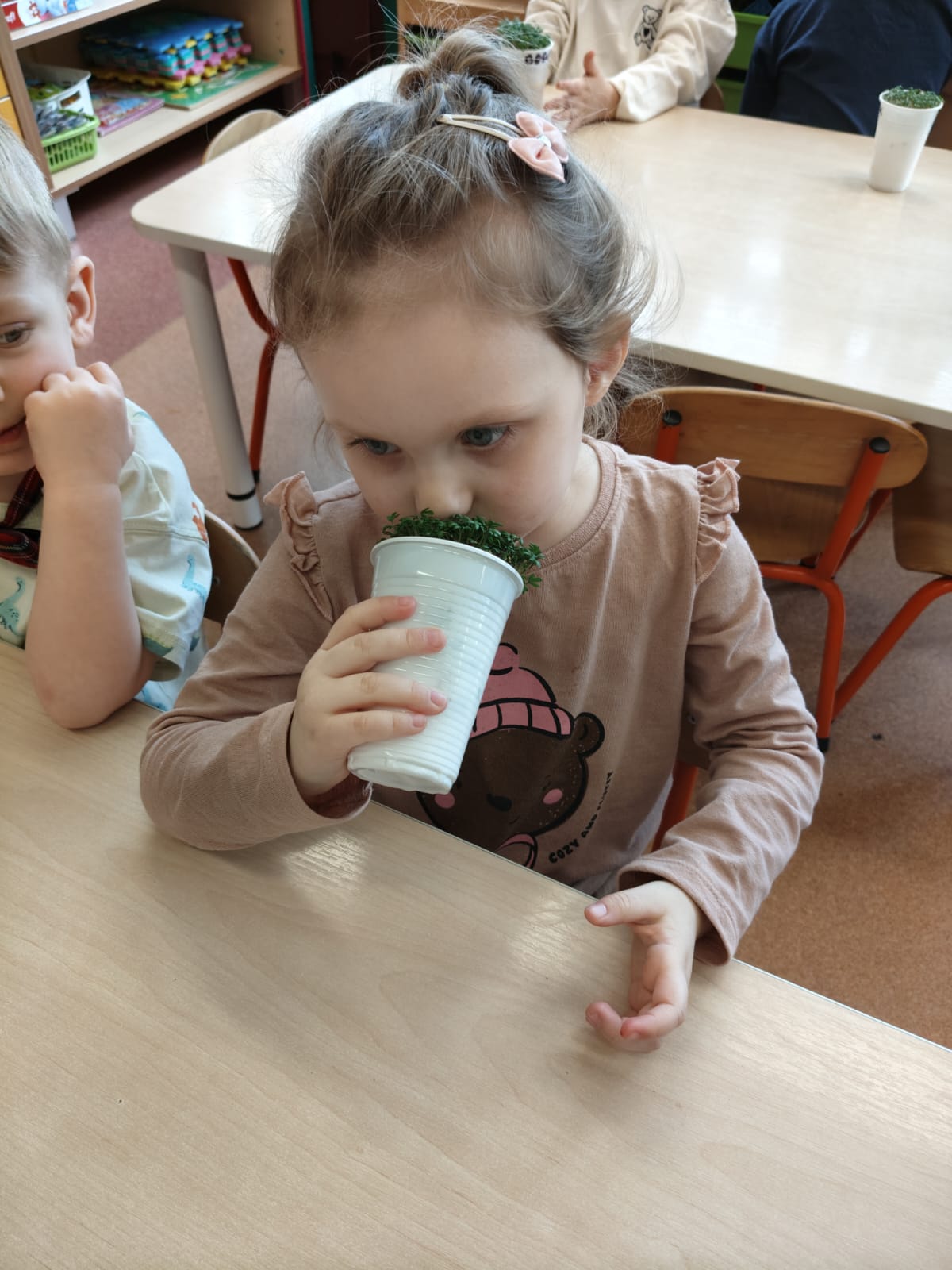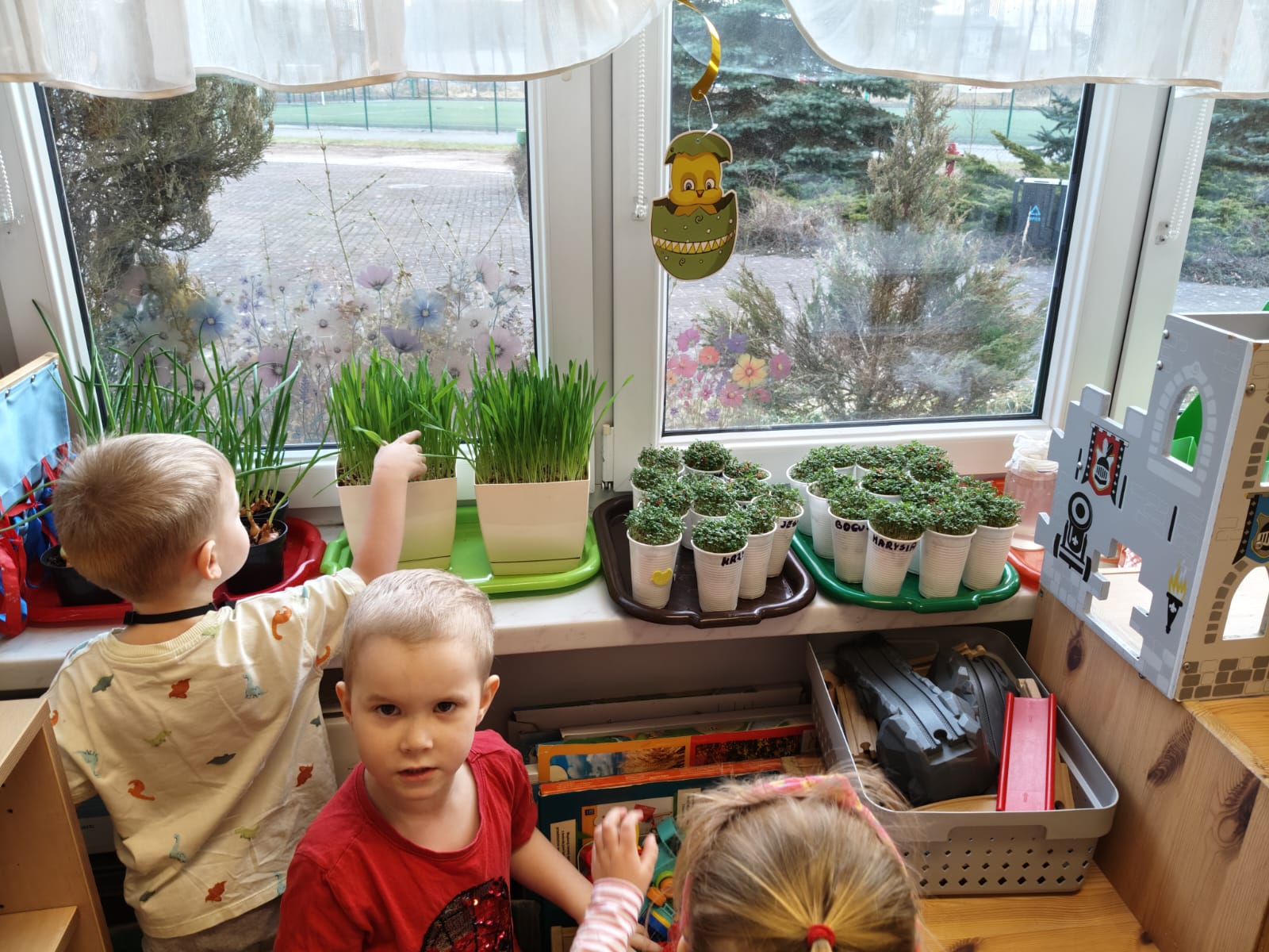 Wraz z nadejściem wiosny z powodzeniem założyliśmy zielony kącik na parapecie okiennym. Dzieci przy niewielkiej pomocy, przygotowały niezbędny warsztat pracy tj.: ziemię, nasiona, cebulki, wodę. Następnie samodzielnie zasiały nasiona rzeżuchy w pojemniczkach z namoczoną watą, w słoiczkach z wodą na gazie ziarenka fasoli, a w pojemniczkach z ziemią zasadziły cebulki i kolorowe bratki. Założone uprawy dzieci pielęgnowały, podlewał oraz każdego dnia obserwowały zmiany zachodzące w roślinach, zauważały kiełkowanie, wzrost łodyg, liści, dowiedziały się, co jest potrzebne roślinom do wzrostu. Miały możliwość zapoznania się z różnymi rodzajami nasion oraz dowiedziały jakie są sposoby uprawy roślin i ich pielęgnacji. Od momentu zakładania zielonego ogródka, doświadczały wielu wrażeń zmysłowych. Przygotowanie podłoża, dotykanie różnych części roślin, czynności pielęgnacyjne – to stymulacja zmysłu dotyku. Przy sprawdzaniu twardości nasion, przy sadzenie aktywowały czucie głębokie. Przyglądanie się efektom hodowli, wyszukiwanie zmian i innych ciekawostek pobudzało do pracy zmysł wzroku, nie zapominaliśmy także o zmysłach powonienia i smaku. Uprawa ogródka ziołowego była również naturalną okazją do rozmów z dziećmi o zasadach zdrowego żywienia. Udział w projekcie był dla dzieci wyzwaniem, które stawiało je w roli aktywnych i czujnych obserwatorów otaczającego świata. Rozbudzało zainteresowania, mobilizowało do poszukiwania odpowiedzi na różne pytania, uczyło twórczego myślenia i zaspokajało potrzeby poznawcze. Dzieci uczyły się planowania i organizacji pracy, współpracy, pozytywnej komunikacji. Doświadczały radości, satysfakcji, oraz wzmacniały poczucie własnej wartości.